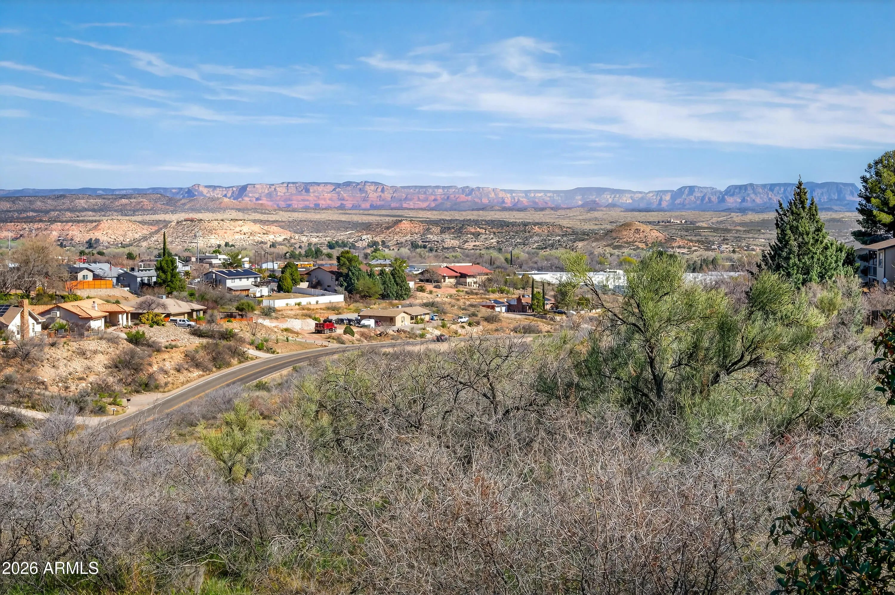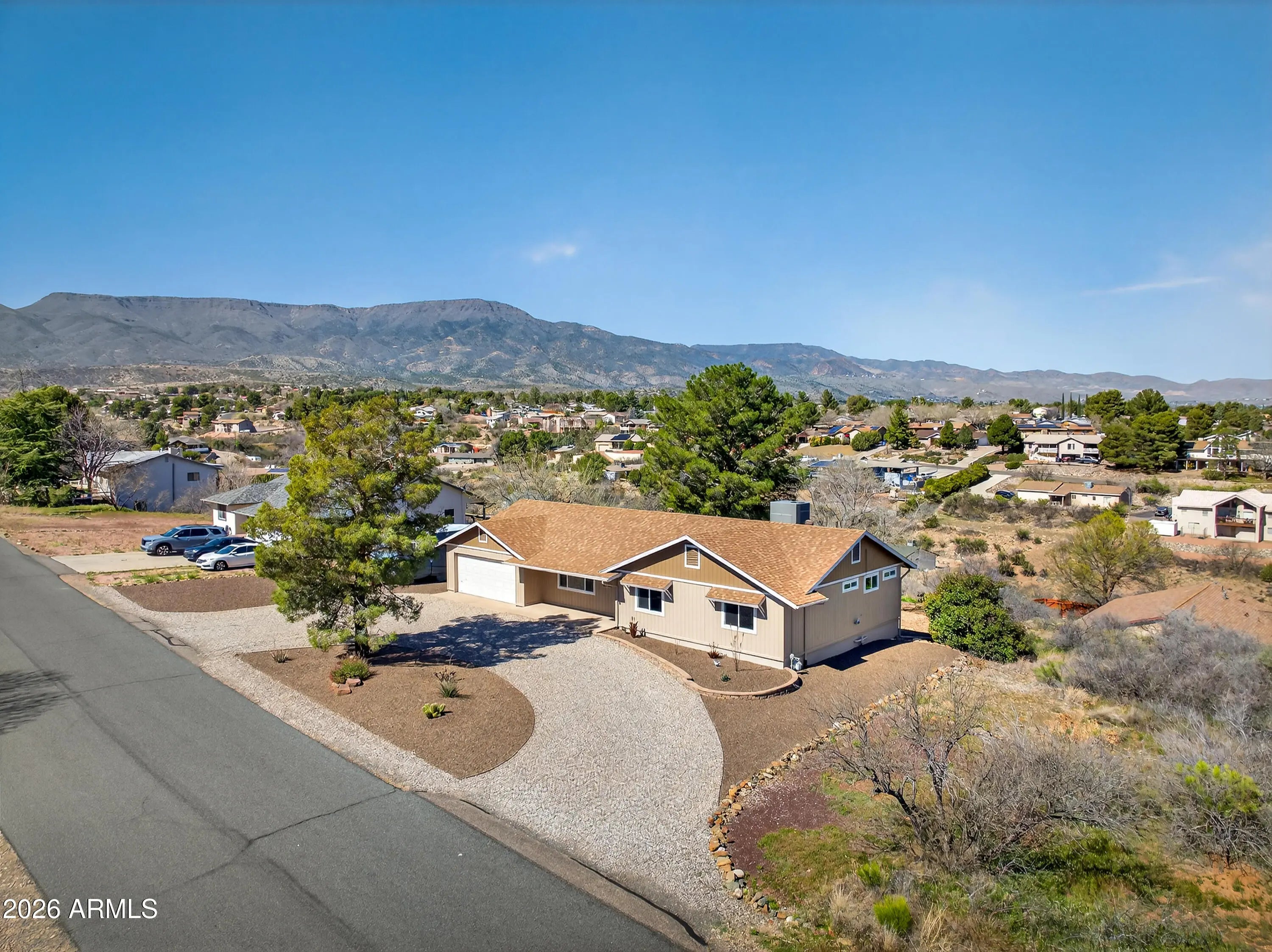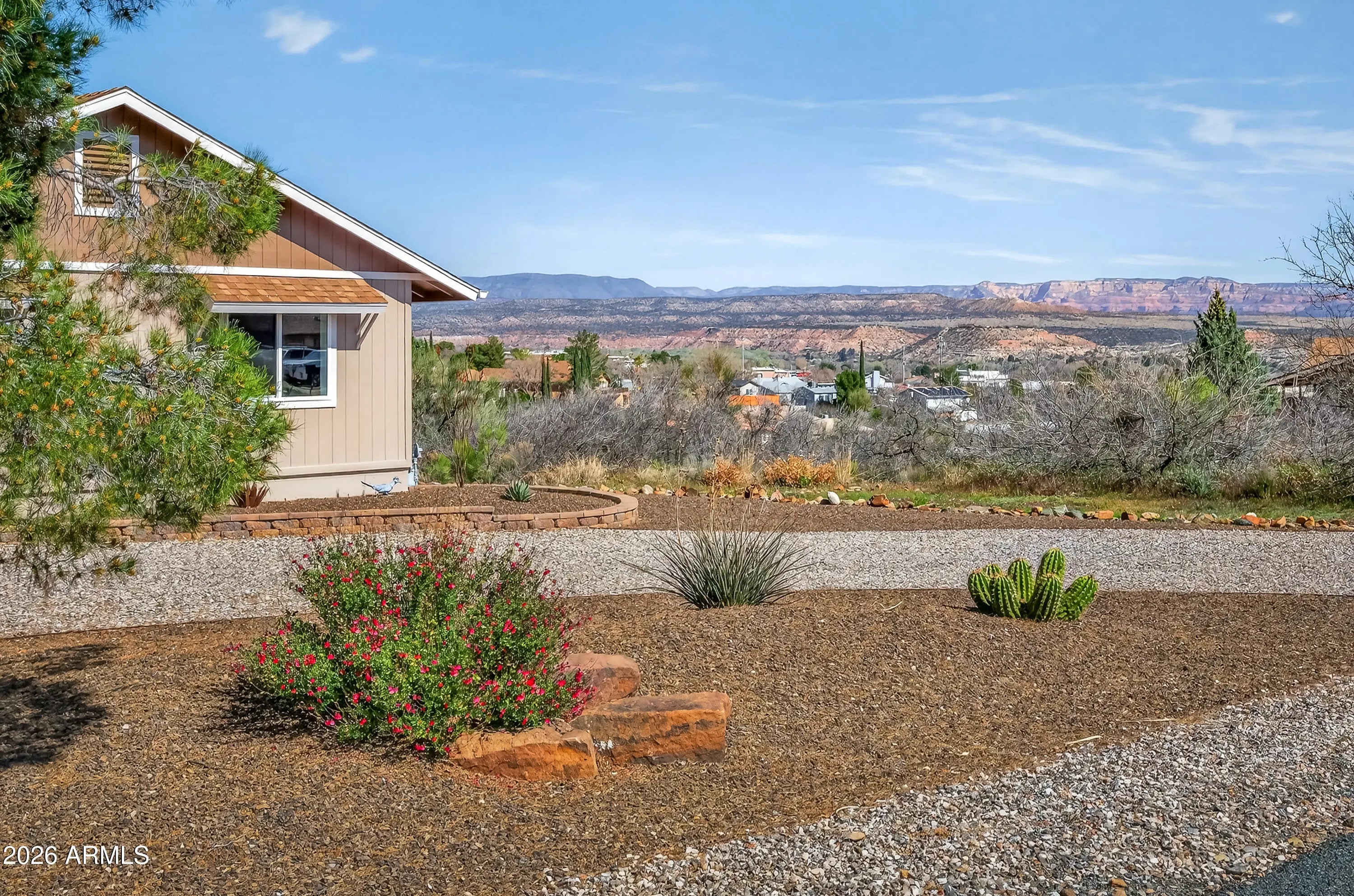 Panoramic views of Sedona's iconic red rocks and Mingus Mountain set the stage for this beautifully reimagined Cottonwood home. Pre-inspected and meticulously remodeled from top to bottom, it offers the feel of a brand-new home while retaining the solid construction and character of an established property. Inside, you'll find luxury rigid vinyl flooring, crown molding, fresh paint, updated windows and doors and stunning attention to detail. The elegant kitchen features solid wood Wellborn cabinets, granite countertops, subway tile backsplash, modern lighting, and high-end appliances. Bathrooms are tastefully updated, including a tiled walk-in shower with teak bench in the primary suite. The new deck is perfectly positioned to soak in breathtaking sunsets and sweeping Arizona views.