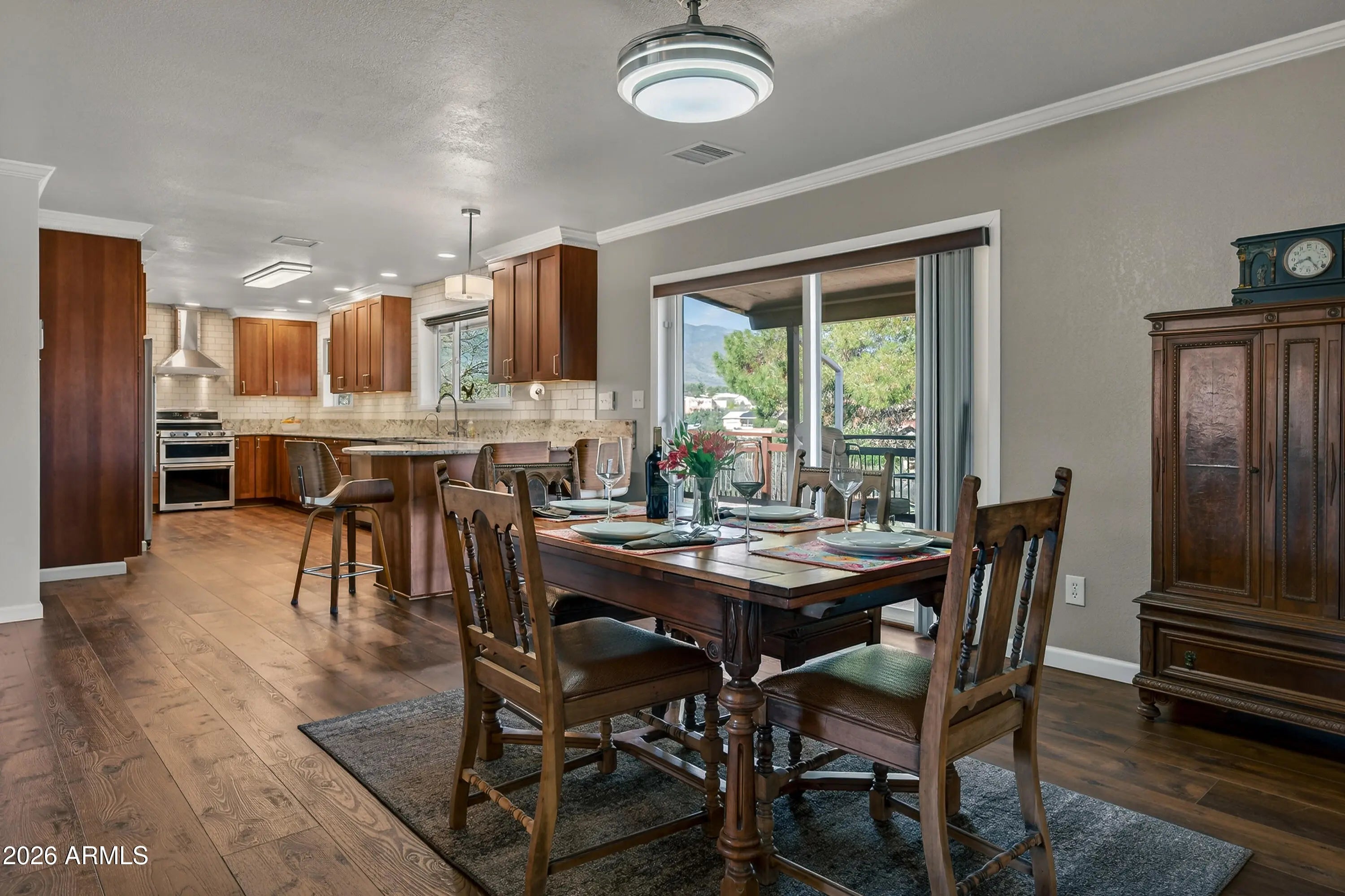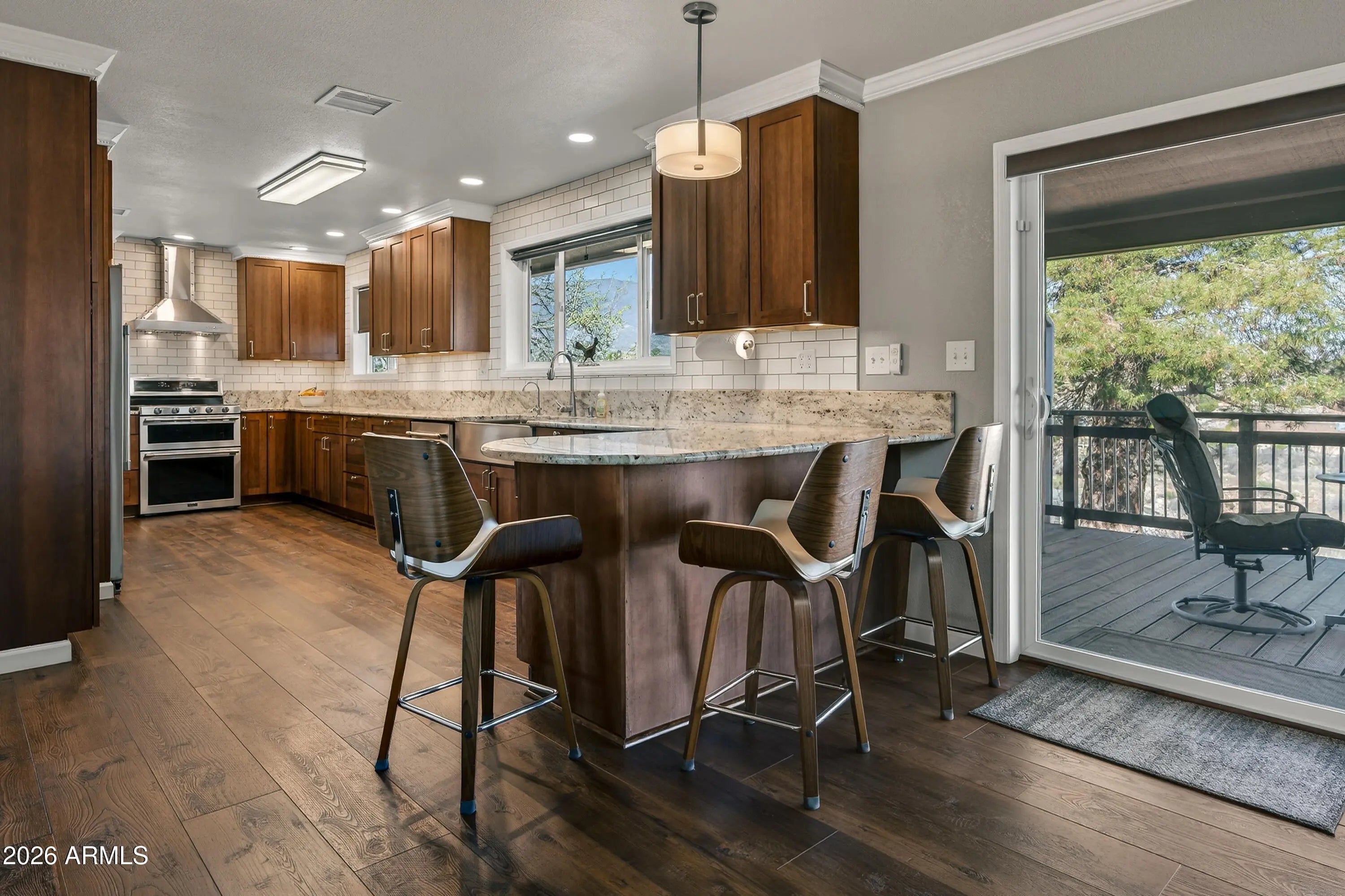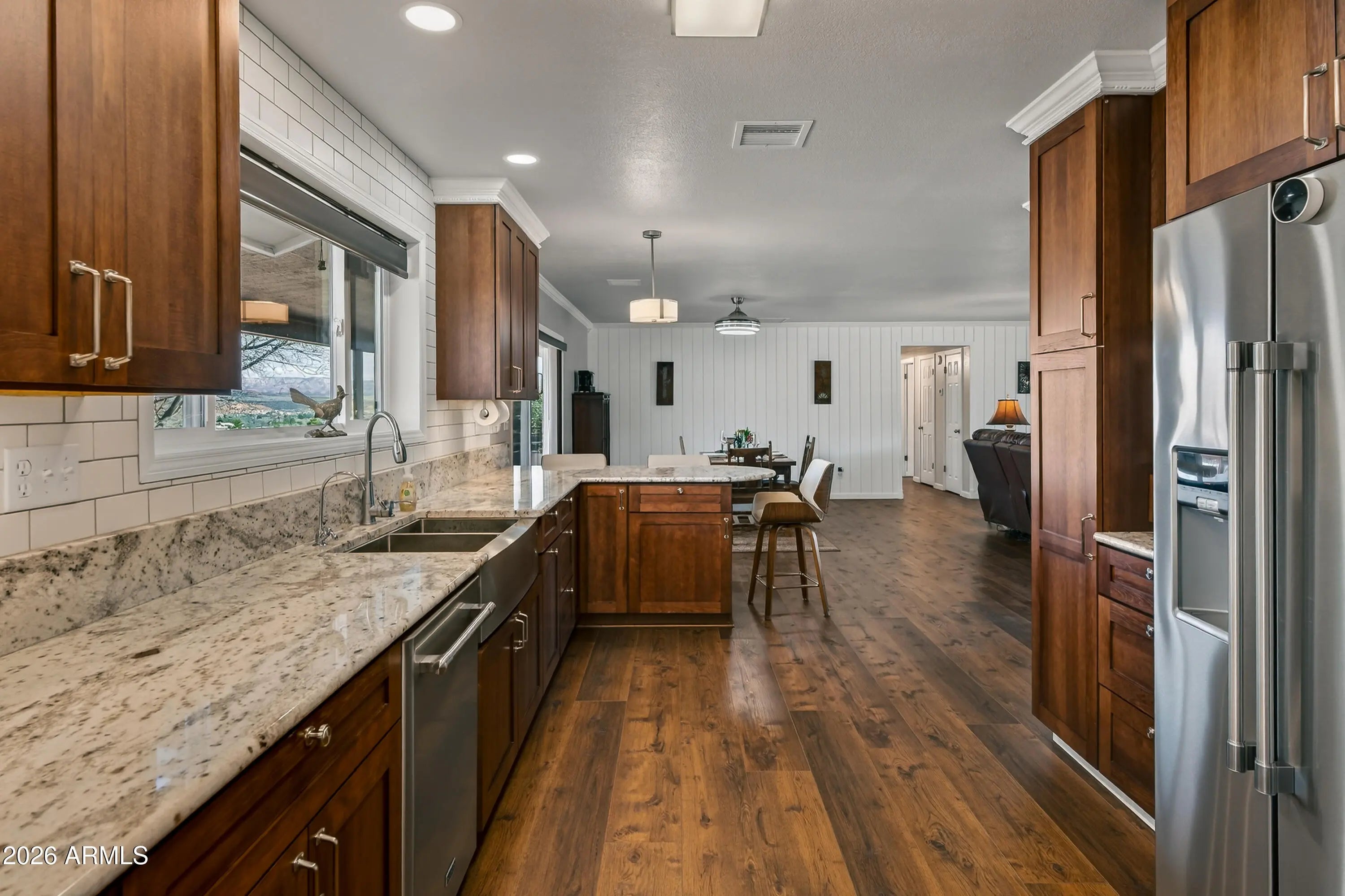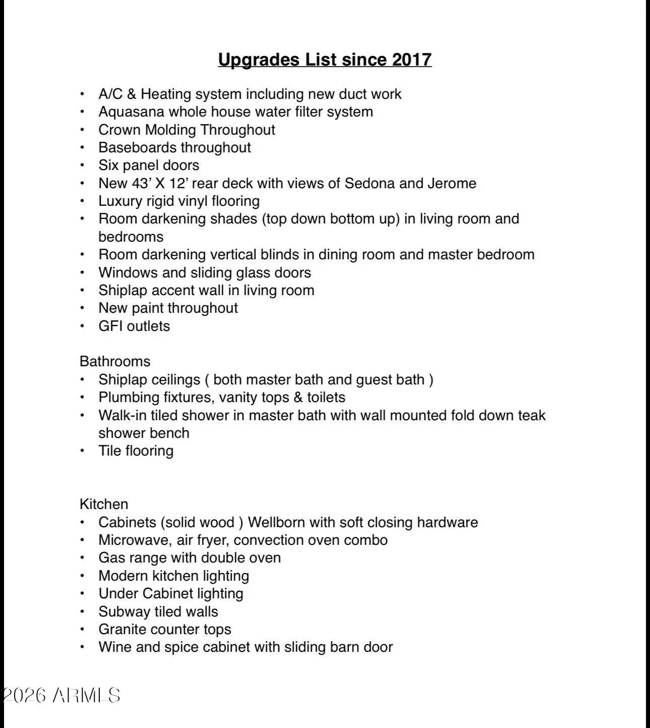 Panoramic views of Sedona's iconic red rocks and Mingus Mountain set the stage for this beautifully reimagined Cottonwood home. Pre-inspected and meticulously remodeled from top to bottom, it offers the feel of a brand-new home while retaining the solid construction and character of an established property. Inside, you'll find luxury rigid vinyl flooring, crown molding, fresh paint, updated windows and doors and stunning attention to detail. The elegant kitchen features solid wood Wellborn cabinets, granite countertops, subway tile backsplash, modern lighting, and high-end appliances. Bathrooms are tastefully updated, including a tiled walk-in shower with teak bench in the primary suite. The new deck is perfectly positioned to soak in breathtaking sunsets and sweeping Arizona views.