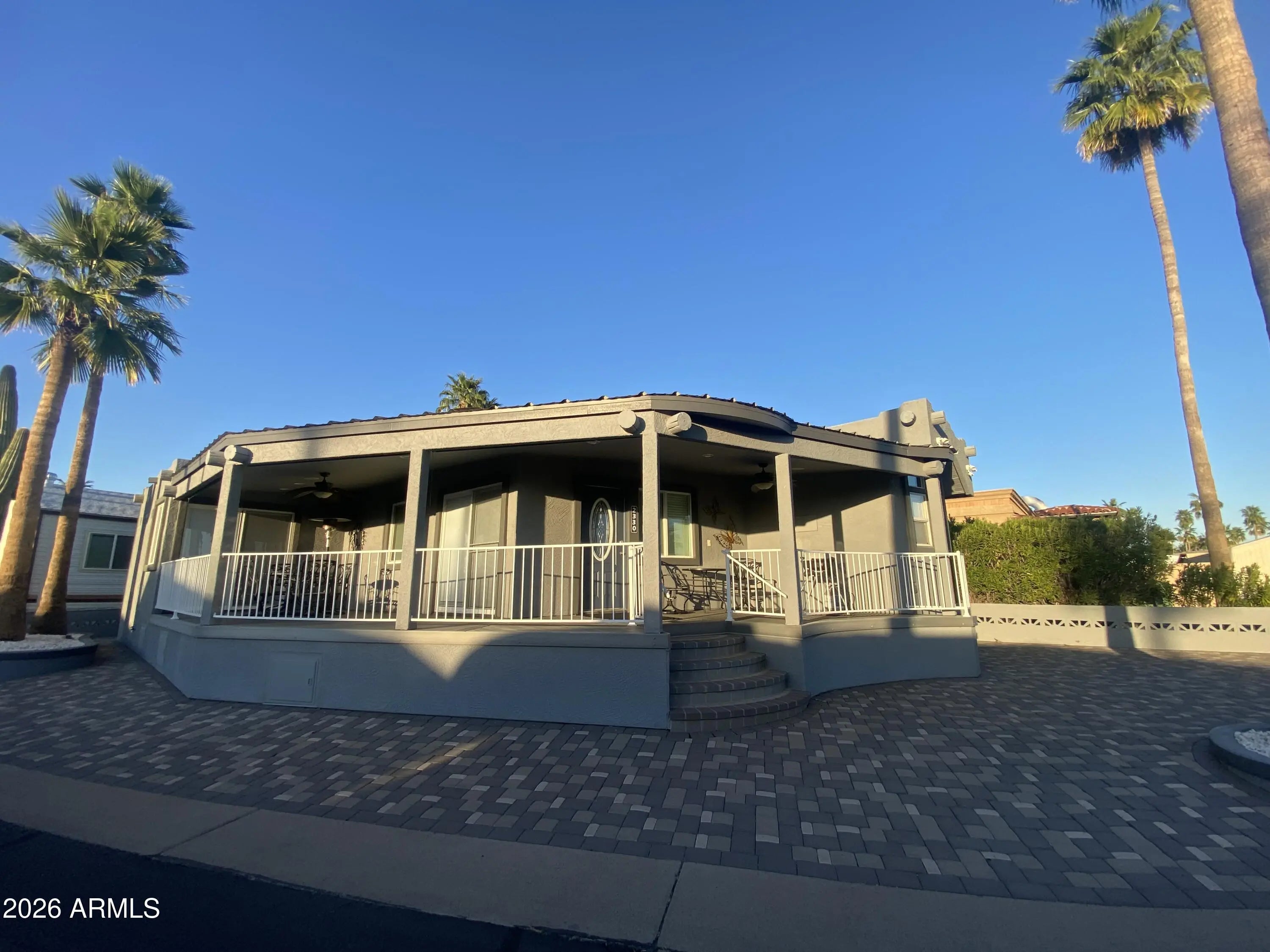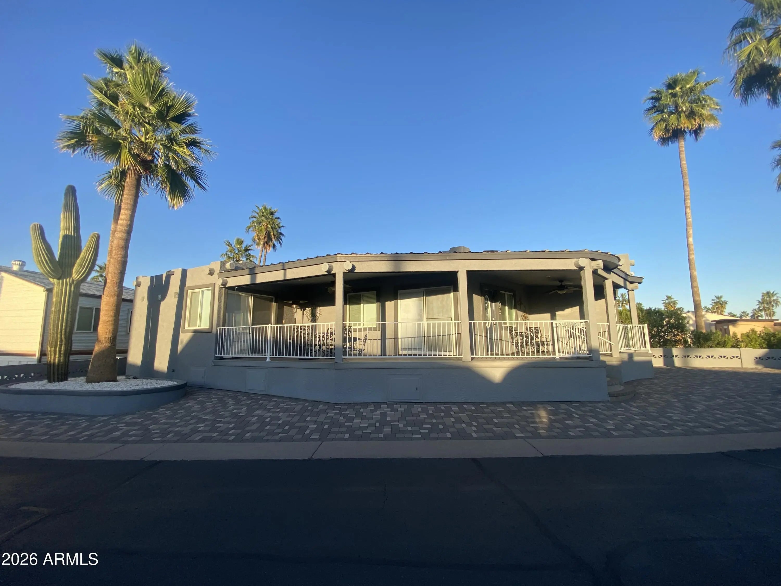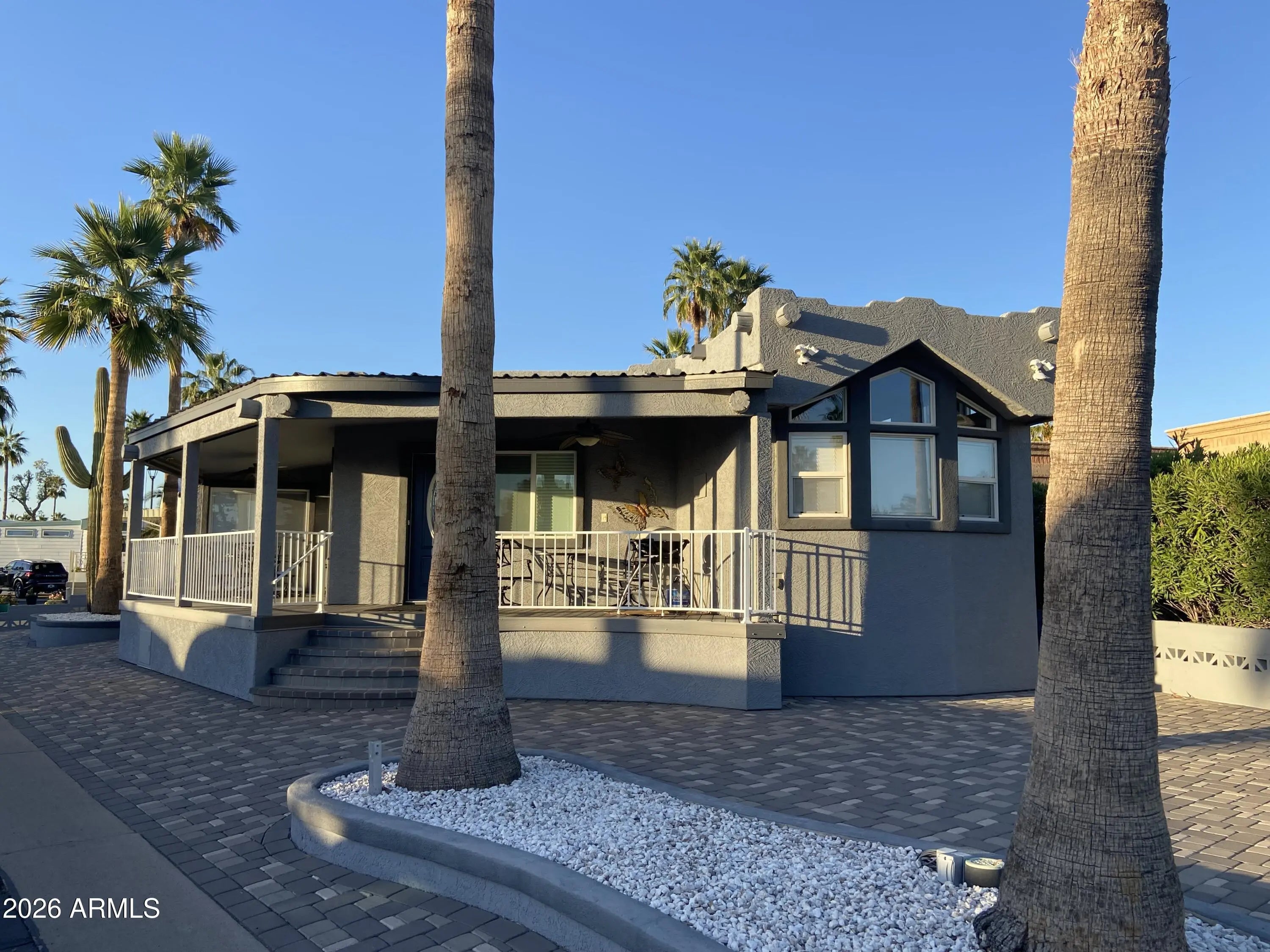 When quality matters! This luxurious winter retreat in a land owned 55+ golf course resort will not disappoint! Spacious open floor plan with full size front kitchen, beautiful flooring, spectacular fireplace, Primary suite with king size bed and double size walk-in shower. The well-appointed master bath has a laundry center and a walk-in closet. The property has a full feature water softening system. The wrap around covered front porch is perfect to view Arizona's colorful sunsets. Retired life doesn't get any better than this! The lot is covered end to end in color matched pavers, endless parking, golf cart garage with private entrance. Exterior is fully stucco in a Santa Fe style and beautifully painted. Attention to detail is evident in this one-of-a-kind custom home! Shown by request.