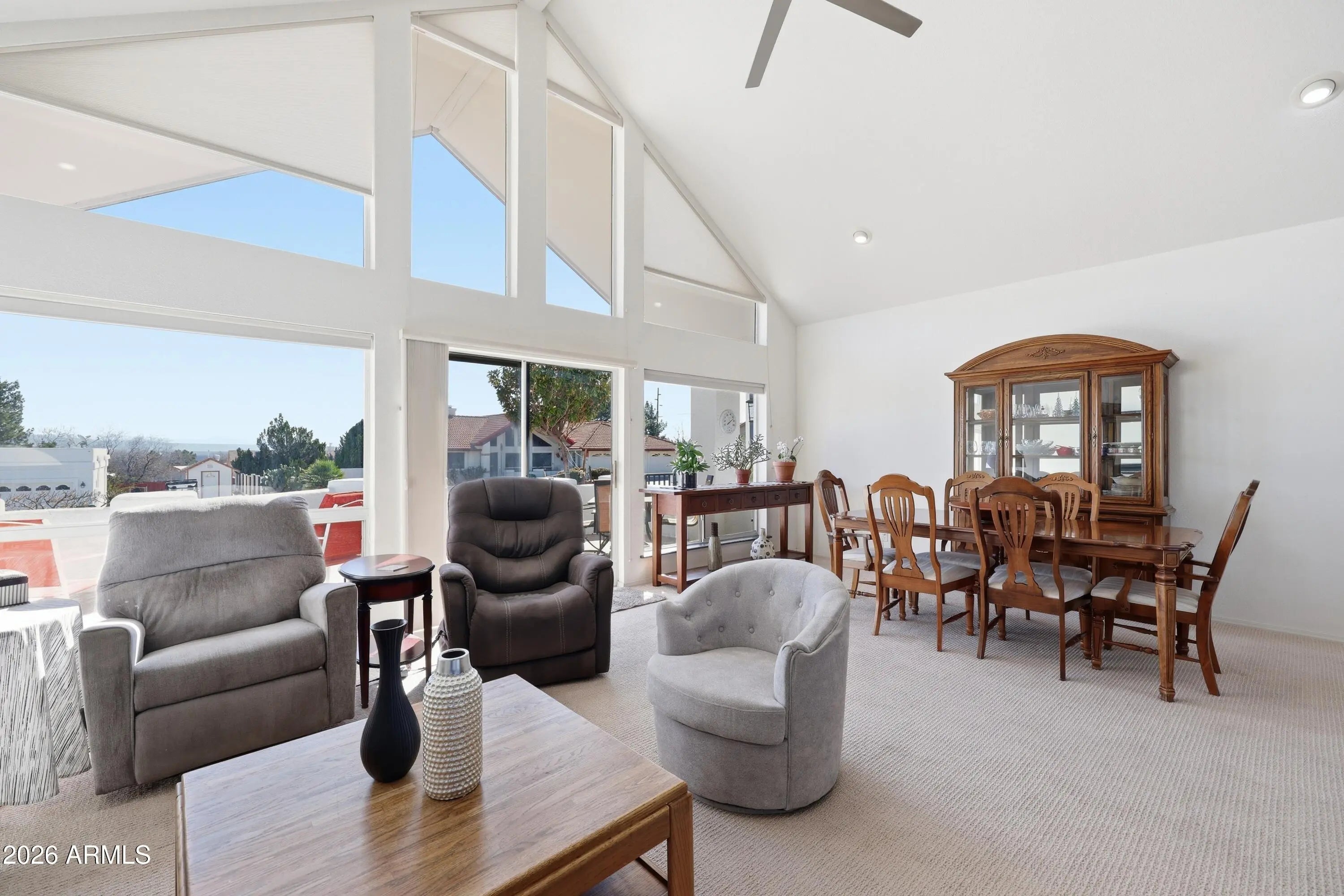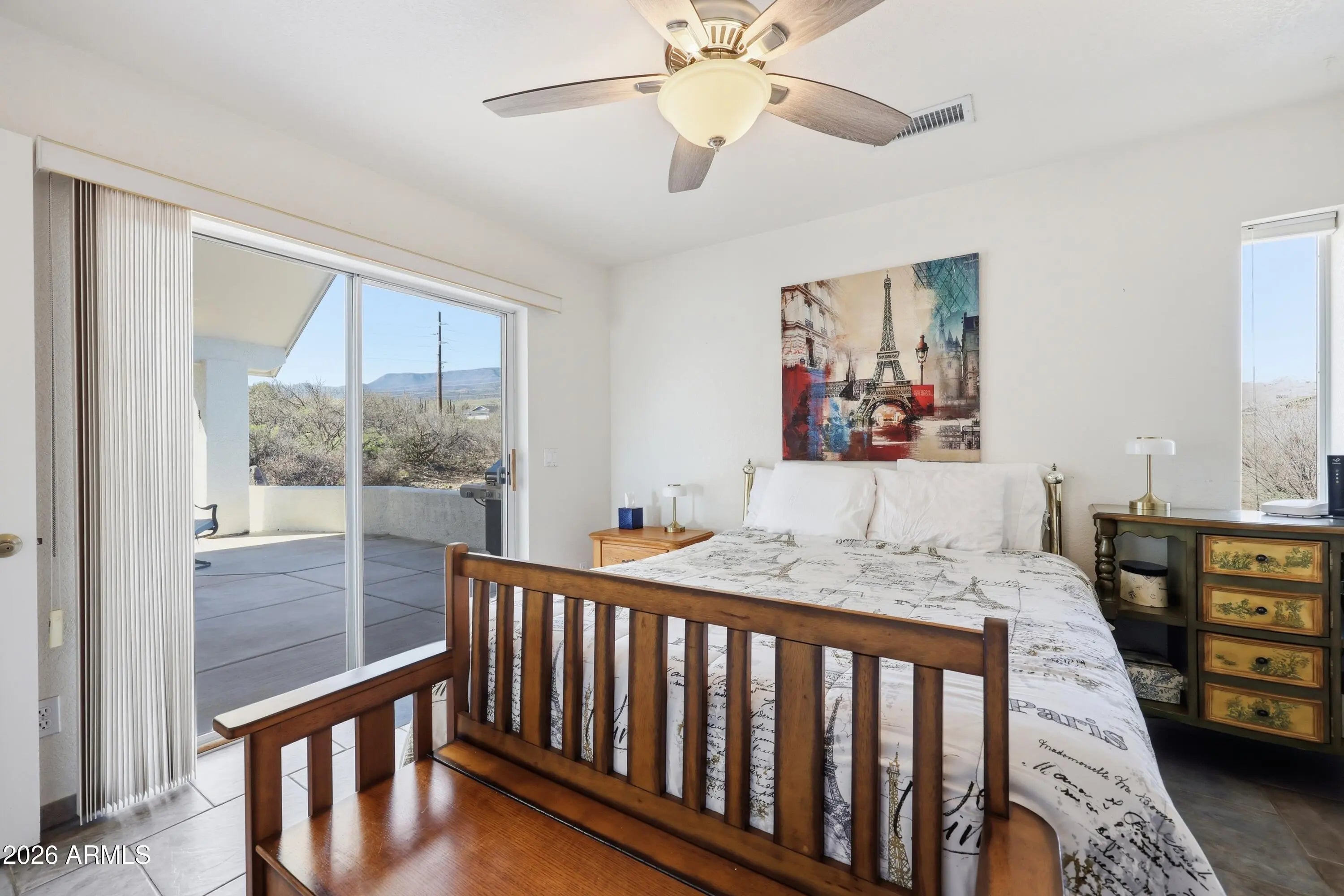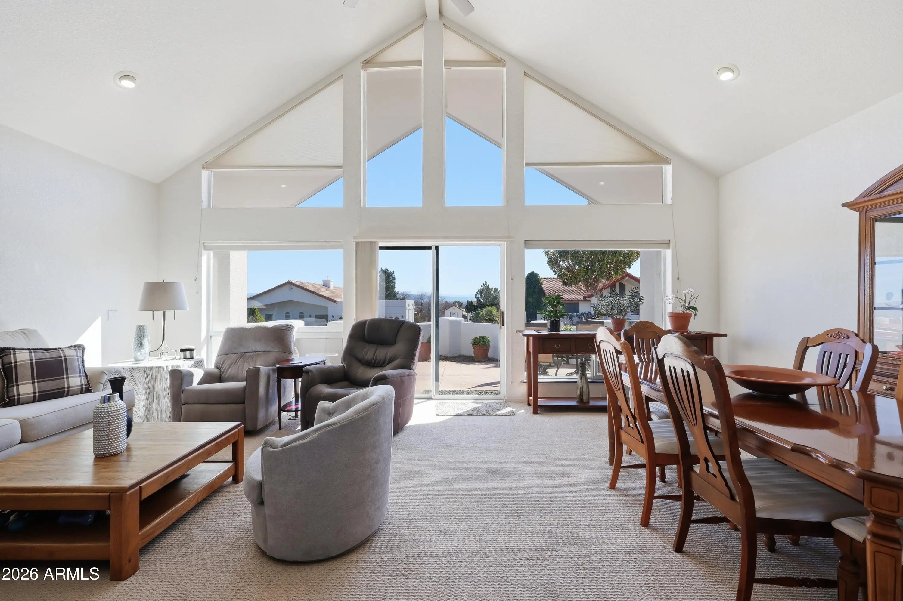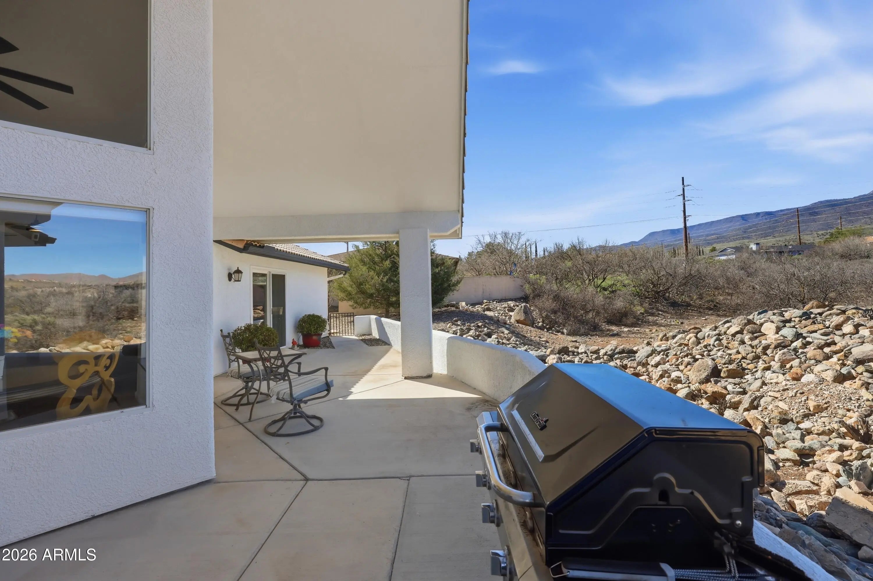 Updated Southwest home in desirable Mingus Views Estates, tucked at the end of a quiet cul-de-sac with big views. Light-filled living and formal dining feature vaulted ceilings and walls of windows framing Red Rock sunsets from the living room and front porch. In-kitchen dining and rear patio capture Mingus Mountain views. Split floor plan with 3 spacious bedrooms, each with its own sliding door to the patio, and 2 baths. Updated kitchen with granite counters, added pantry, newer lighting, stainless appliances, and extra storage. 2-car garage. New HVAC and water heater (2023-24). Bonus observation deck with 360° views of Red Rocks, Mingus Mountain, and on clear days the San Francisco Peaks. Close to shopping, dining, medical, and Verde Valley events.