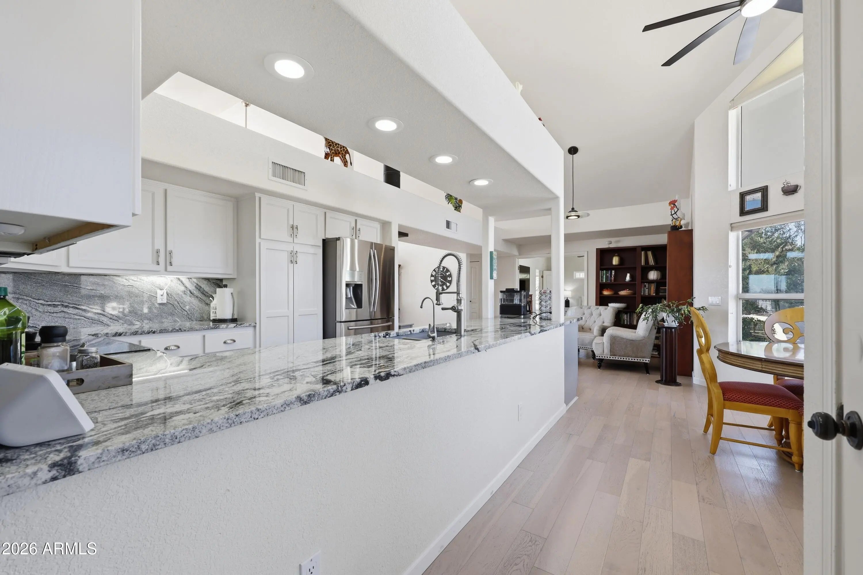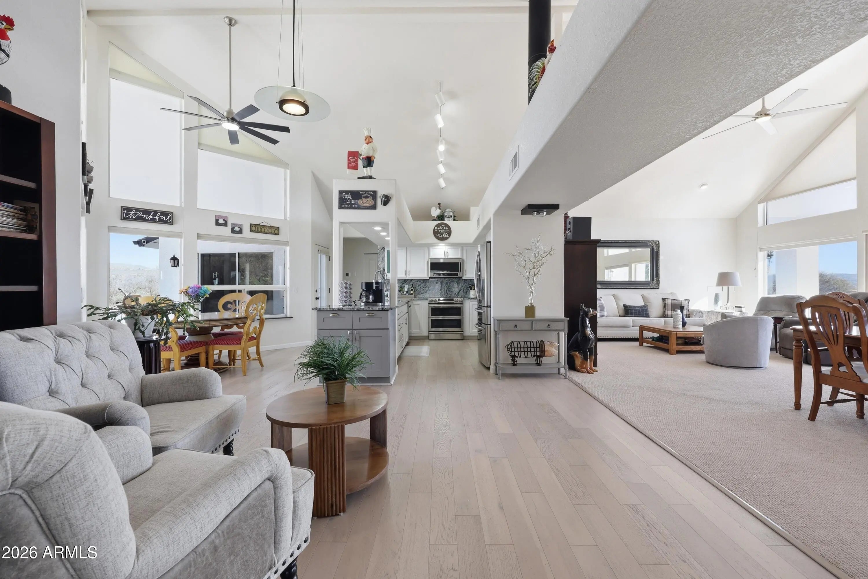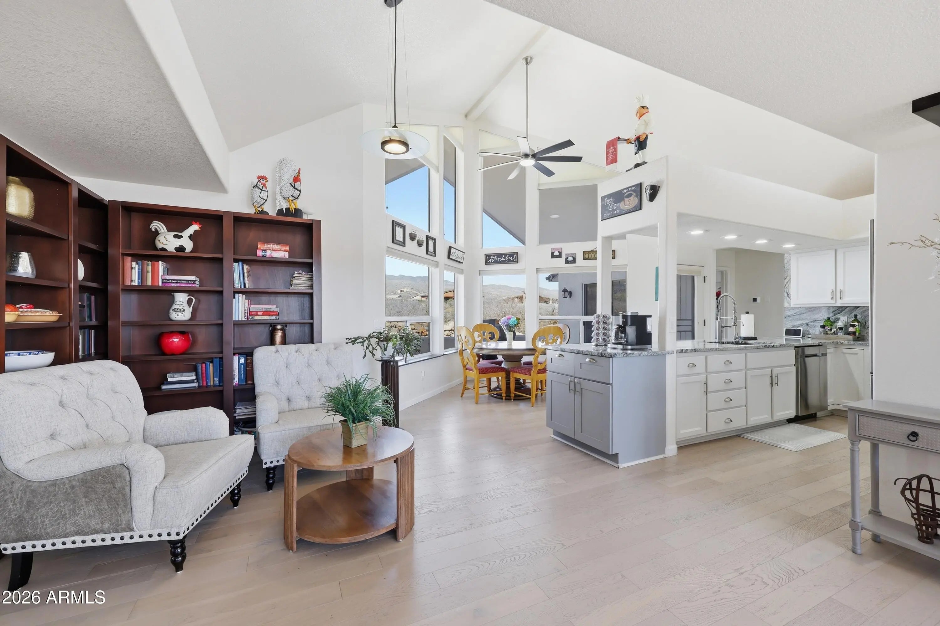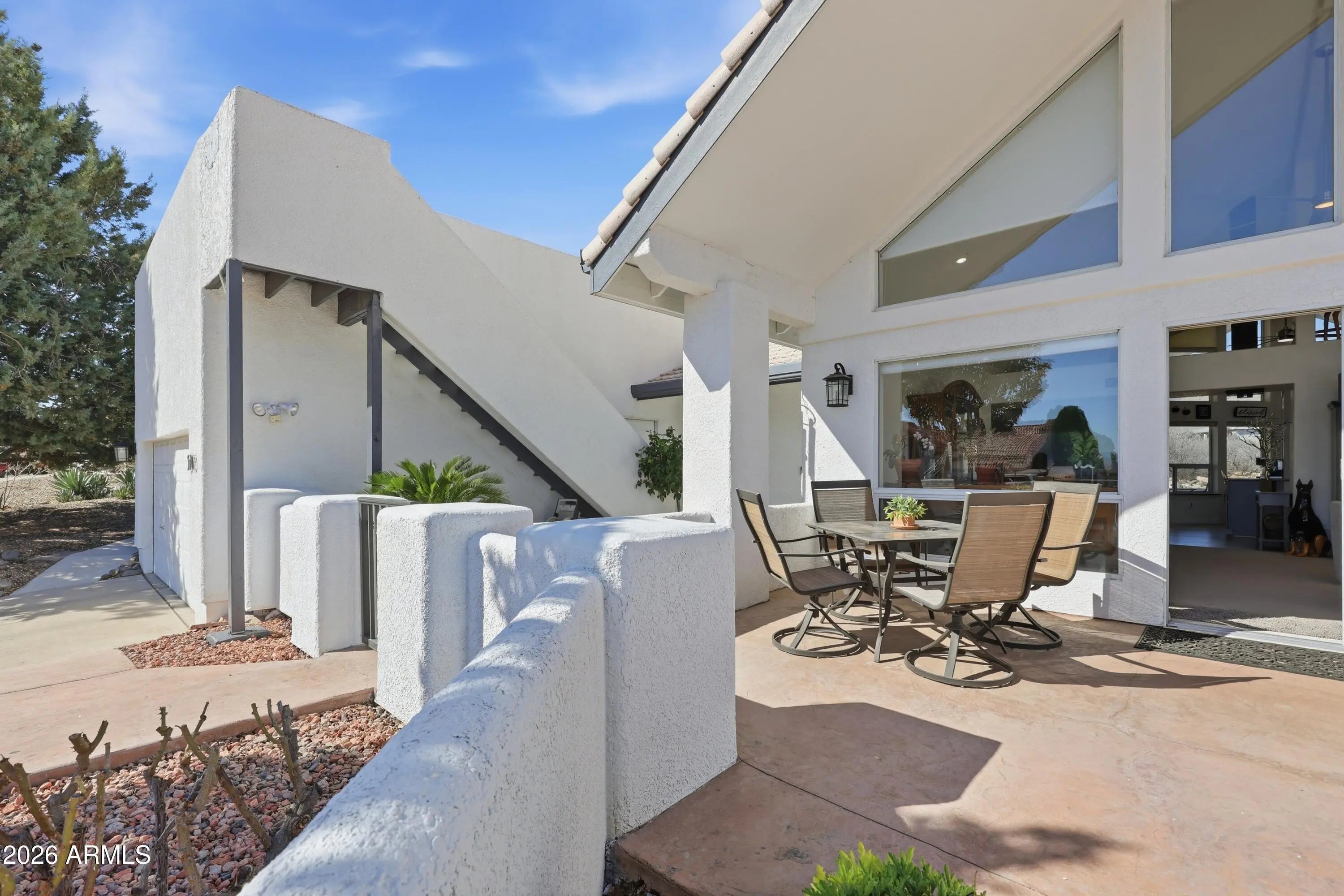 Updated Southwest home in desirable Mingus Views Estates, tucked at the end of a quiet cul-de-sac with big views. Light-filled living and formal dining feature vaulted ceilings and walls of windows framing Red Rock sunsets from the living room and front porch. In-kitchen dining and rear patio capture Mingus Mountain views. Split floor plan with 3 spacious bedrooms, each with its own sliding door to the patio, and 2 baths. Updated kitchen with granite counters, added pantry, newer lighting, stainless appliances, and extra storage. 2-car garage. New HVAC and water heater (2023-24). Bonus observation deck with 360° views of Red Rocks, Mingus Mountain, and on clear days the San Francisco Peaks. Close to shopping, dining, medical, and Verde Valley events.