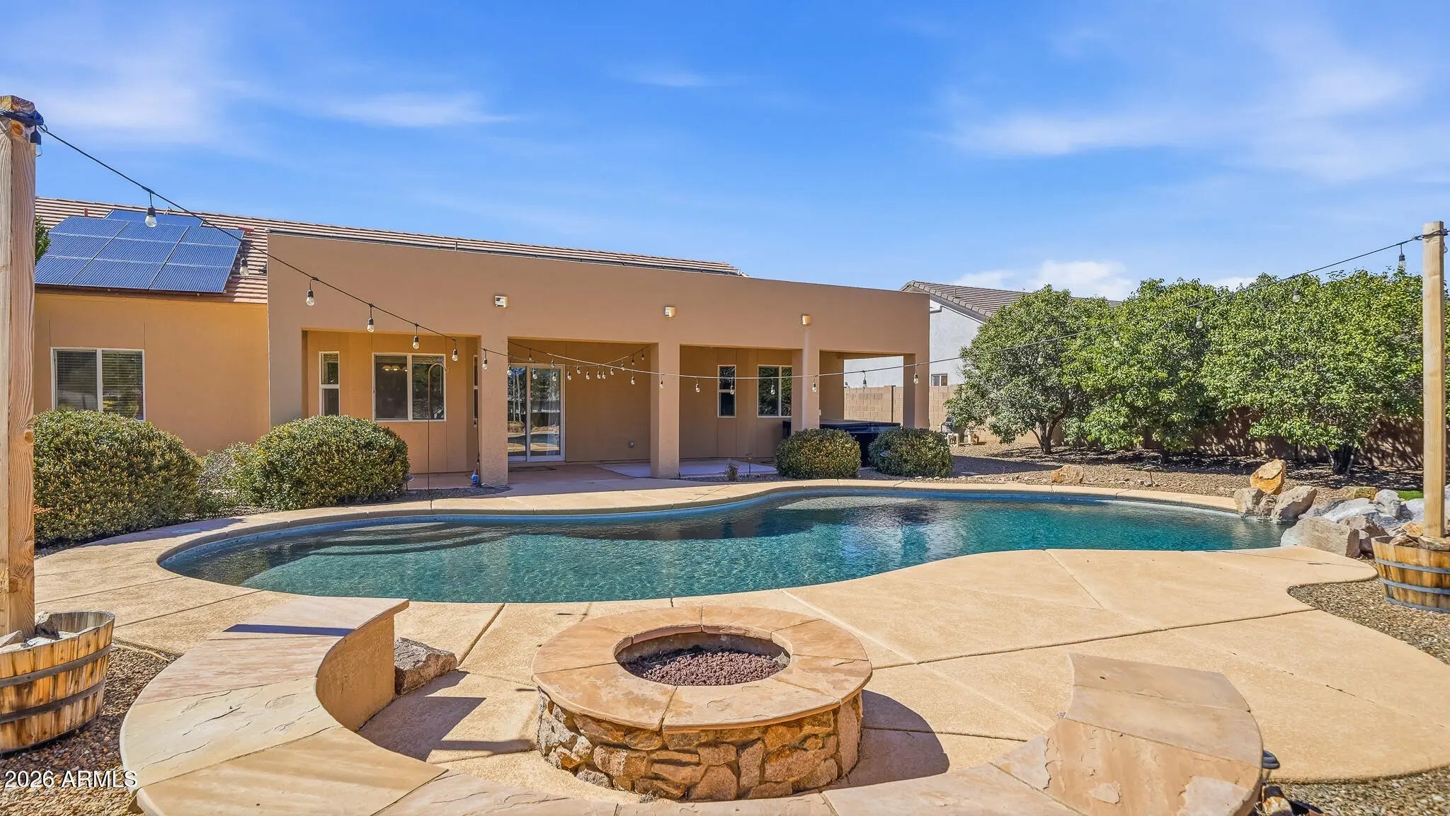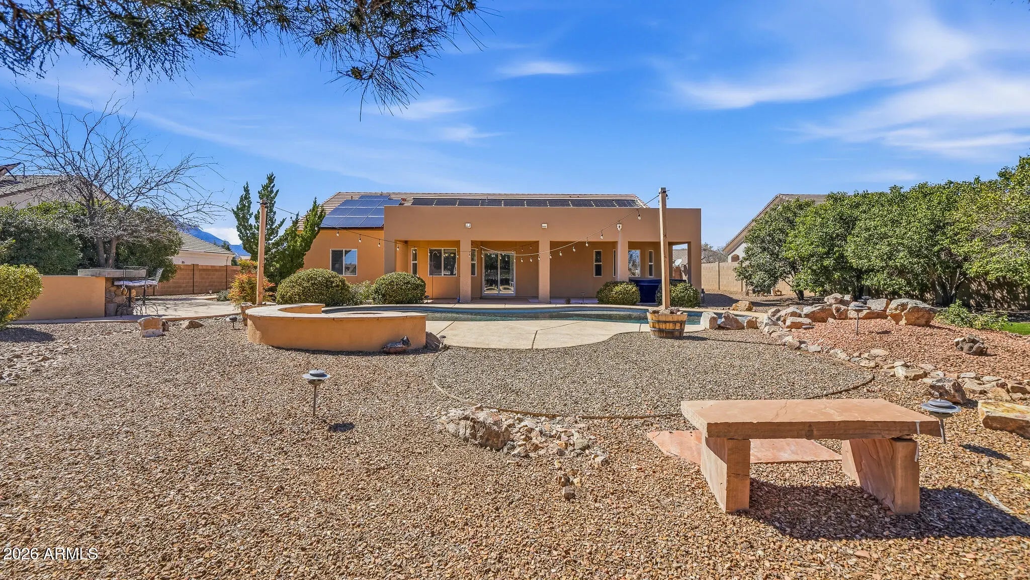 Located in the gated La Terraza community, this stunning 4-bedroom, 2-bath home sits on nearly ½ acre and is designed for exceptional indoor and outdoor living. The backyard is an entertainer's dream with a sparkling pool and fountain feature, covered patio, outdoor kitchen, firepit seating area, and breathtaking mountain views--perfect for enjoying Arizona sunsets. Inside, the kitchen features granite countertops, gas range, two pantries, breakfast nook, and abundant cabinetry. Enjoy both a formal dining room and two spacious living areas. The primary suite offers a bay window, dual sinks, garden tub, walk-in shower, and walk-in closet. Additional upgrades include owned solar, smart thermostat, and a salt-free water purification system.