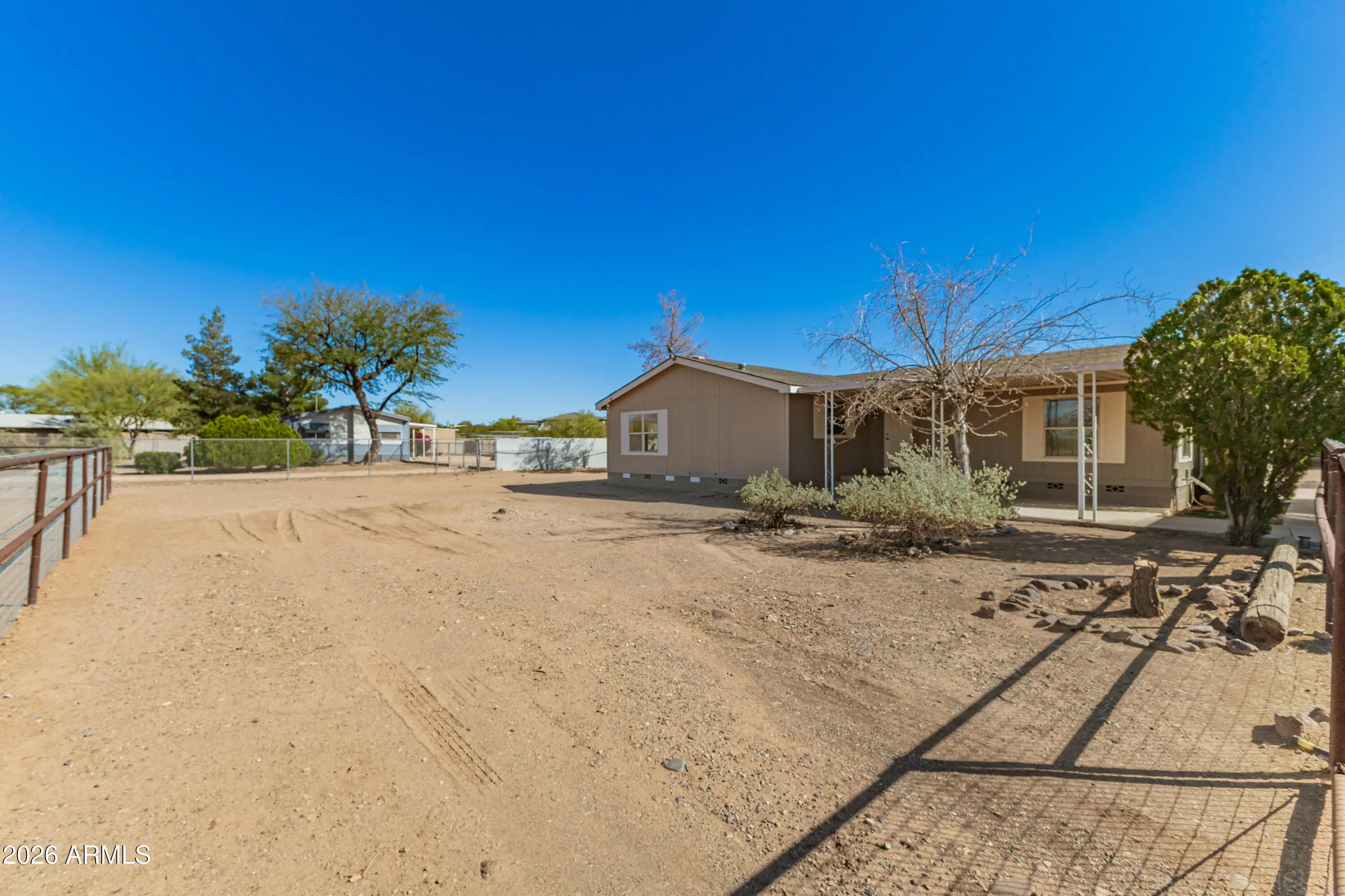 Room to Roam, Room to Ride! This charming 3-bedroom, 2-bath home sits on just over an acre and offers excellent equestrian amenities, including a horse facility with three stalls, riding arena, turnout area, wash rack, feed shed, and a tack shed with electricity. The property also features a two-car insulated garage equipped with a mini-split system. Inside, you'll find an open and inviting floor plan, with a spacious primary bedroom that could easily double as a home office or flex space. Enjoy relaxing or entertaining on the fully covered patios located in both the front and backyard. For added peace of mind, the home's AC unit was replaced in 2023. This property offers space, functionality, and the opportunity to make it your own.