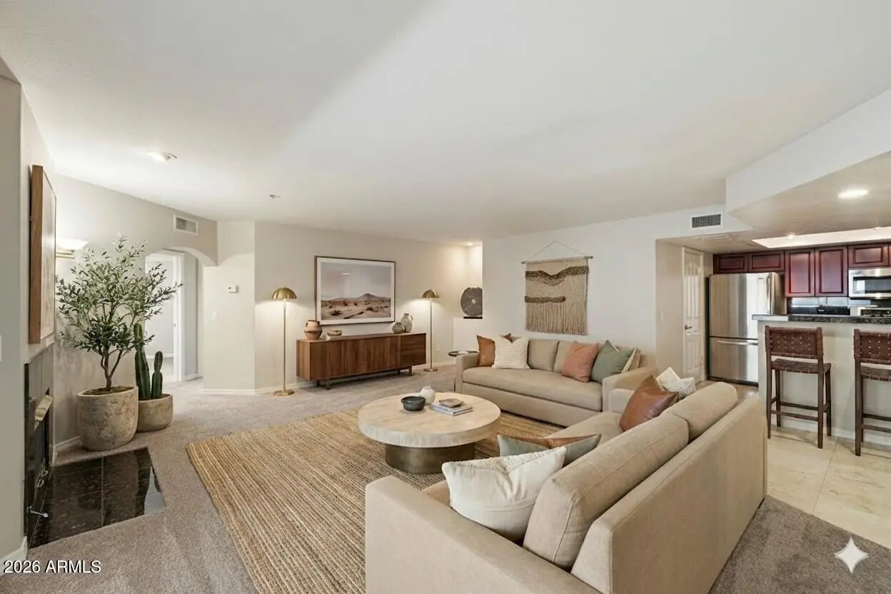 Seller Offering 2% Credit for Rate Buydown, Closing Costs, or HOA Pre-Payment! Rare 2BR ''former model'' end unit steps from the heated pool. Walk to Biltmore Resort, world-class golf, and luxury dining. This light and bright home features recent updates: fresh paint, premium carpet, and updated electrical/plumbing. Both bedrooms boast walk-in closets and spacious layouts. Enjoy a remodeled bath with quartz counters and an oversized walk-in shower with a bench. All-inclusive HOA covers gas, water, sewer, trash, pest control, roof, and exterior maintenance. Gated community with assigned underground parking right across from the elevator. Resort living with total peace of mind! INTERIOR UPDATES New paint - all walls - 2025 New carpet with upgraded padding - 2025 Updated electrical outlets and switches - 2025 Blackout curtains in bedrooms Newer mirrored closet doors Updated fans and lighting throughout PLUMBING & MECHANICAL New water shutoff valves on every water line - 2025 Water Heater - 2024 Gently-used A/C - most of my summers gone KITCHEN Stainless appliances - refrigerator, microwave, stove, dishwasher Tile granite counters in kitchen Newer kitchen faucet Matching cabinets throughout including laundry room BATHROOM Quartz bath counter Newer Pfister bathroom faucets Upgraded over-sized walk-in shower with glass doors, seat, cutout Newer elongated toilet - height FLOORING New carpet with upgraded padding - 2025 Newer Travertine tile flooring LAUNDRY Matching washer and dryer FIREPLACE Gas fireplace (HOA pays gas) OUTDOOR FEATURES Slate tiled patio Overlooks pool and barbeque PARKING & LOCATION Great garage parking spot directly across from elevator Great end unit with no neighbors on west side Convenient to mailbox and fitness center