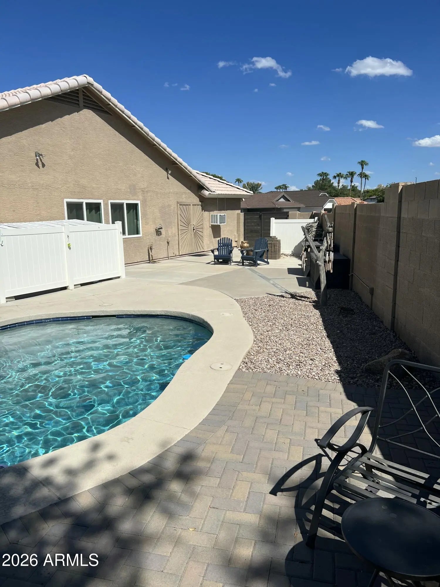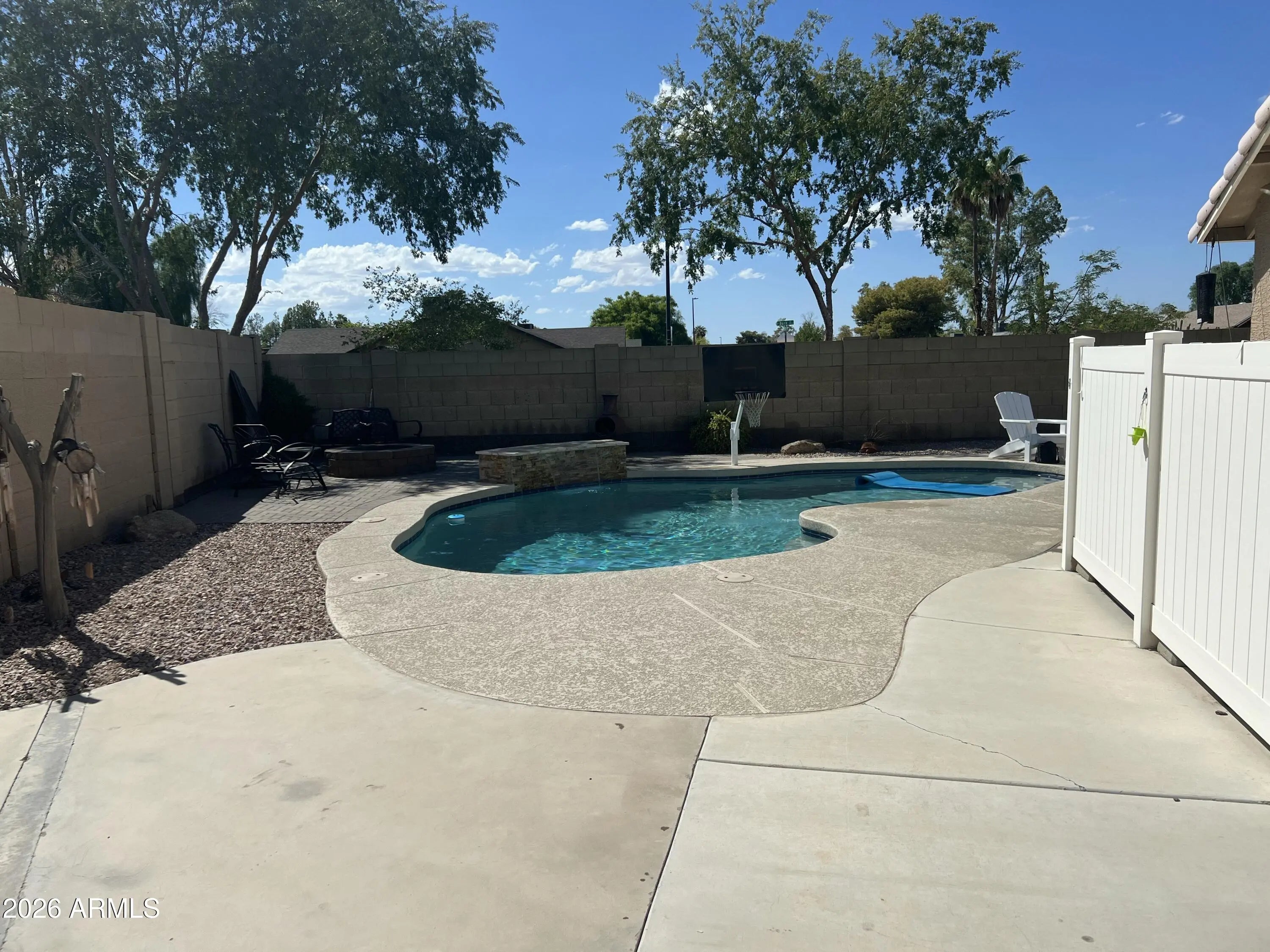 Welcome to your desert oasis. This private sanctuary is anchored by a sparkling pool with new pebble-tech and equipment, a dedicated fire pit, and an RV gate. The outdoor living space is a standout, featuring premium decking and an expansive patio finished with custom tile, a cooling mister system, and integrated lighting. Pristine synthetic turf stretches across the yard, while elegant white fencing discreetly tucks away trash bins and a private dog run. The interior reflects modern sophistication with a smart thermostat and tiled floors throughout. The kitchen boasts Samsung appliances and a filtered drinking water system connected to the refrigerator. The primary retreat offers vaulted ceilings, ensuite, walk-in closet, and direct pool access. A large front bedroom serves as a perfect flex space for an office or guest suite, while two additional versatile bedrooms offer plenty of room for family or hobbies. The garage is a hobbyist's dream, featuring an insulated door, smart opener, wall AC unit, built-in storage, and enhanced lighting. Thoughtful upgrades abound, including privacy screen doors, a Ring doorbell, and floodlight cameras. Located at the end of a quiet cul-de-sac with professionally updated landscaping, this home is just a short walk or bike ride from the heart of vibrant downtown Gilbert. Bonus: Current owner is gifting all TVs and curtains to the buyer.
