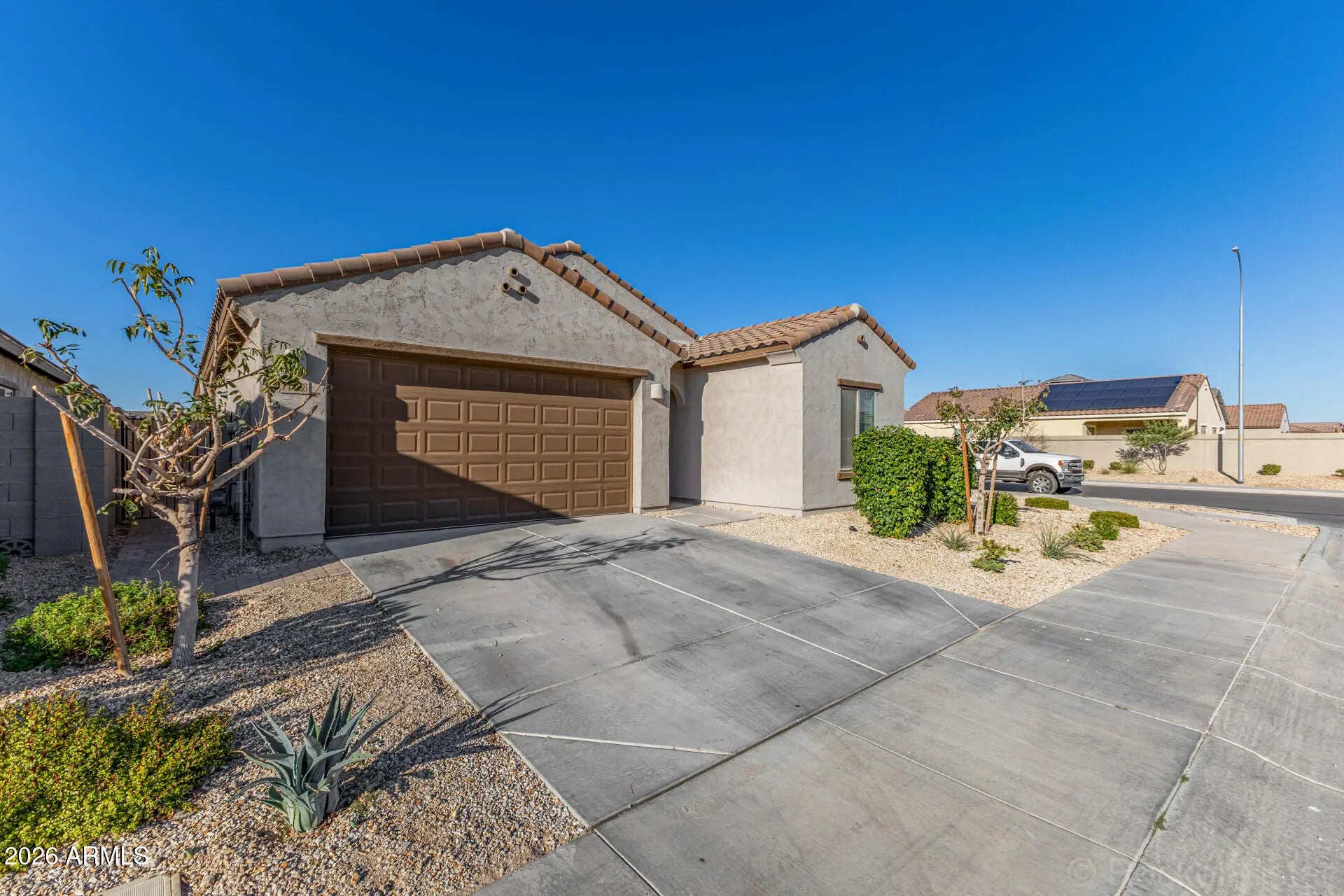 Built in 2023, this beautifully maintained single level home sits on a desirable corner lot with inviting curb appeal, manicured landscaping, and a two car garage. Inside, the bright open layout features tile flooring, abundant natural light, and neutral tones that complement any style. The kitchen offers espresso cabinetry, granite countertops, stainless steel appliances, recessed lighting, and a center island ideal for everyday living and casual dining. The primary suite includes a private bathroom and a spacious walk in closet. Step outside to a backyard ready for your vision, complete with a covered patio perfect for relaxing or entertaining.
