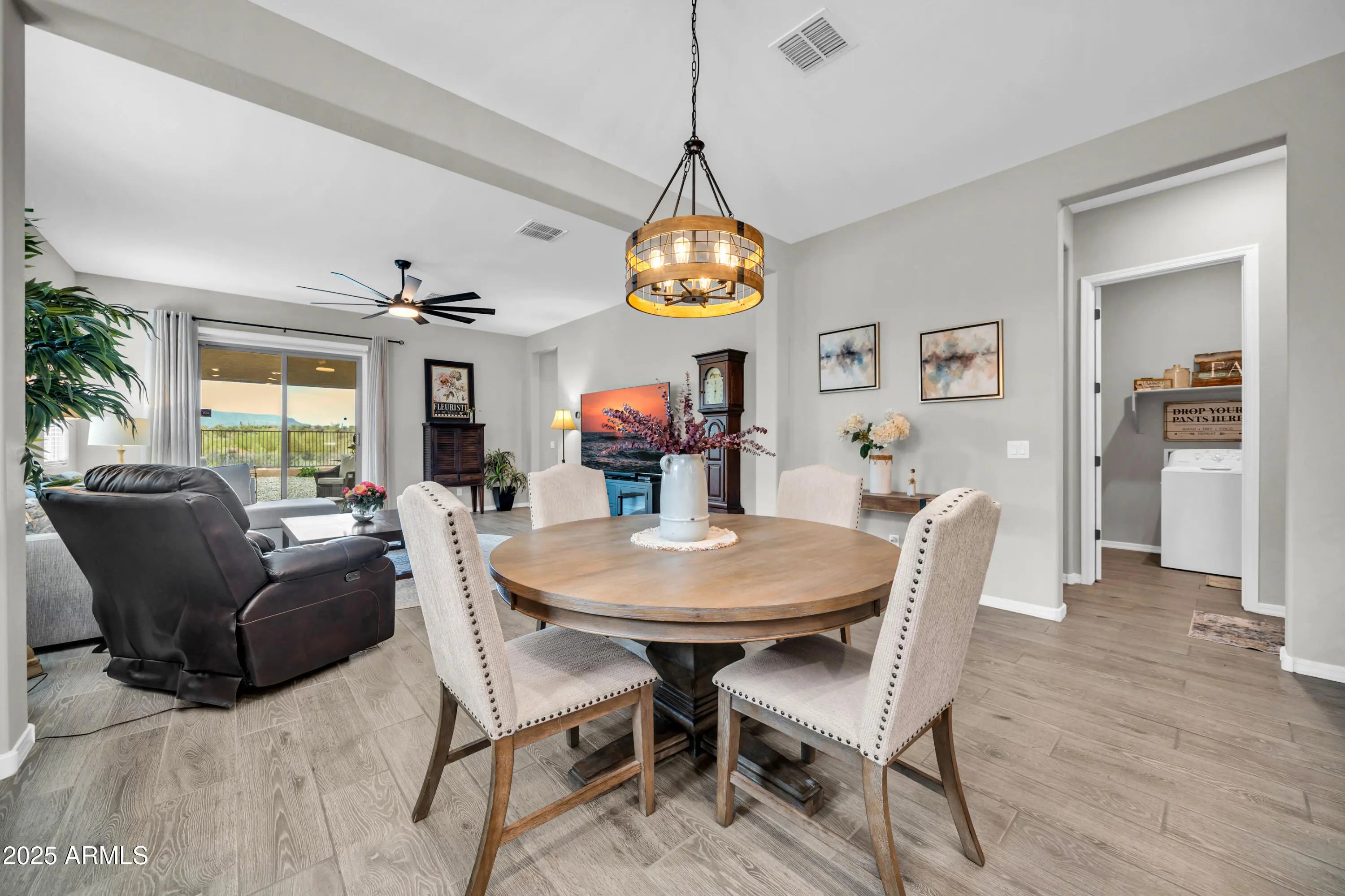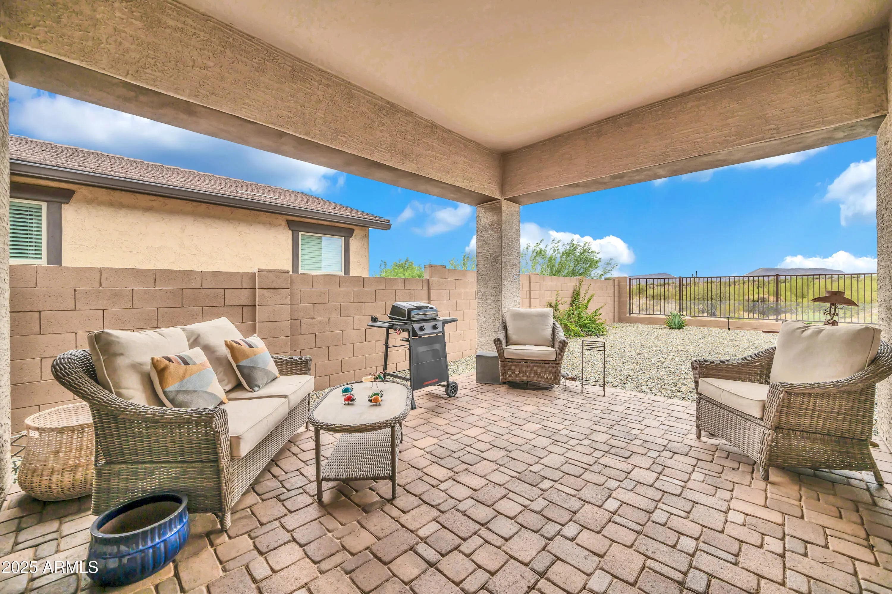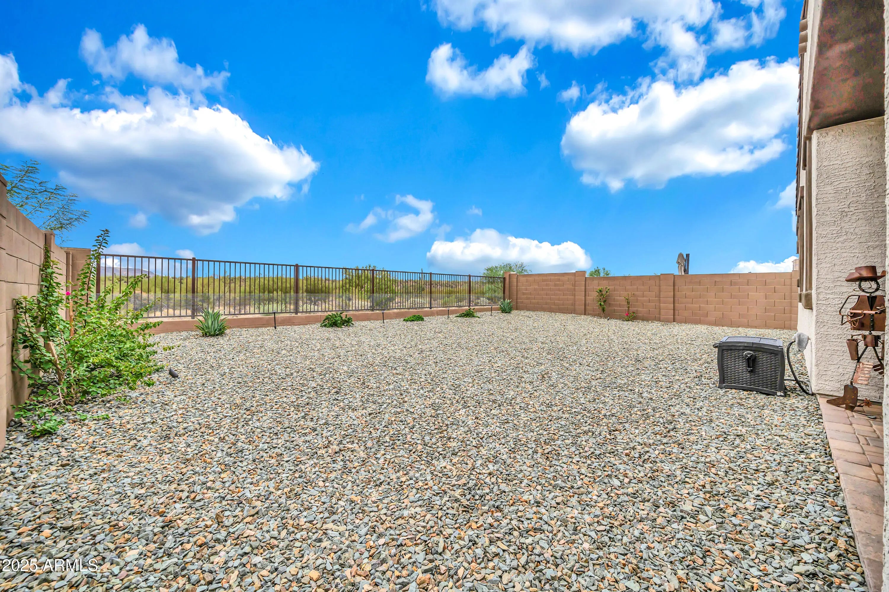 Honey, I'm home! Discover the perfect blend of style, comfort, and modern design in this brand-new 2,000 square foot home, built just 1 year ago by World class builder, Mattamy Homes, ideally situated on a premium view lot. You'll enjoy sweeping panorama's and totally unobstructed sunset views of the giant saguaros against the mountain vistas, complete with wild burros venturing up to your view fencing to say hello. Besides the incredible maintenance free backyard, this residence offers an exceptional living experience inside and out. Step through the front door into an open-concept floor plan filled with natural light. The spacious great room flows seamlessly into the dining area and chef's kitchen, creating an ideal setting for both everyday living and entertaining.