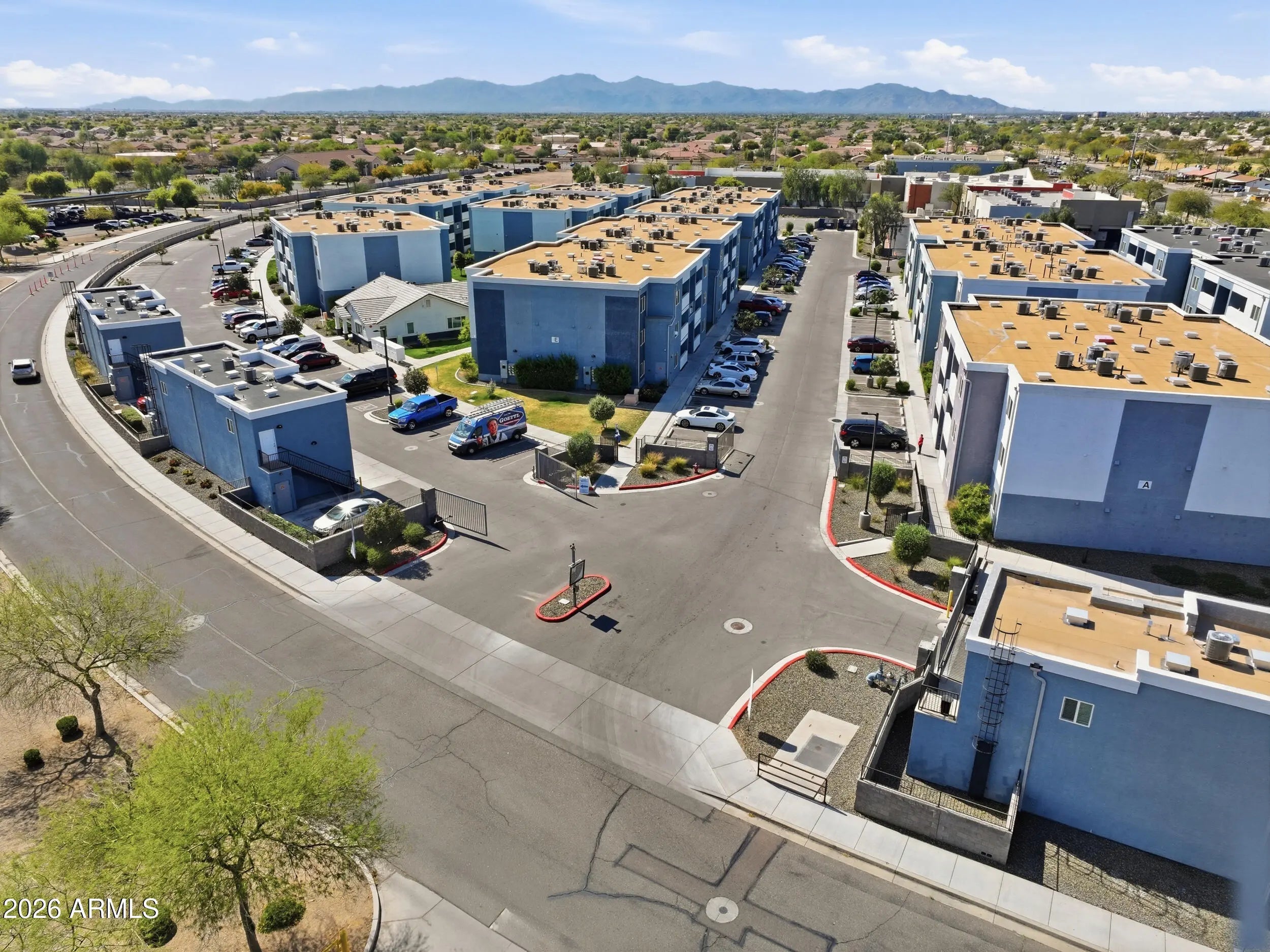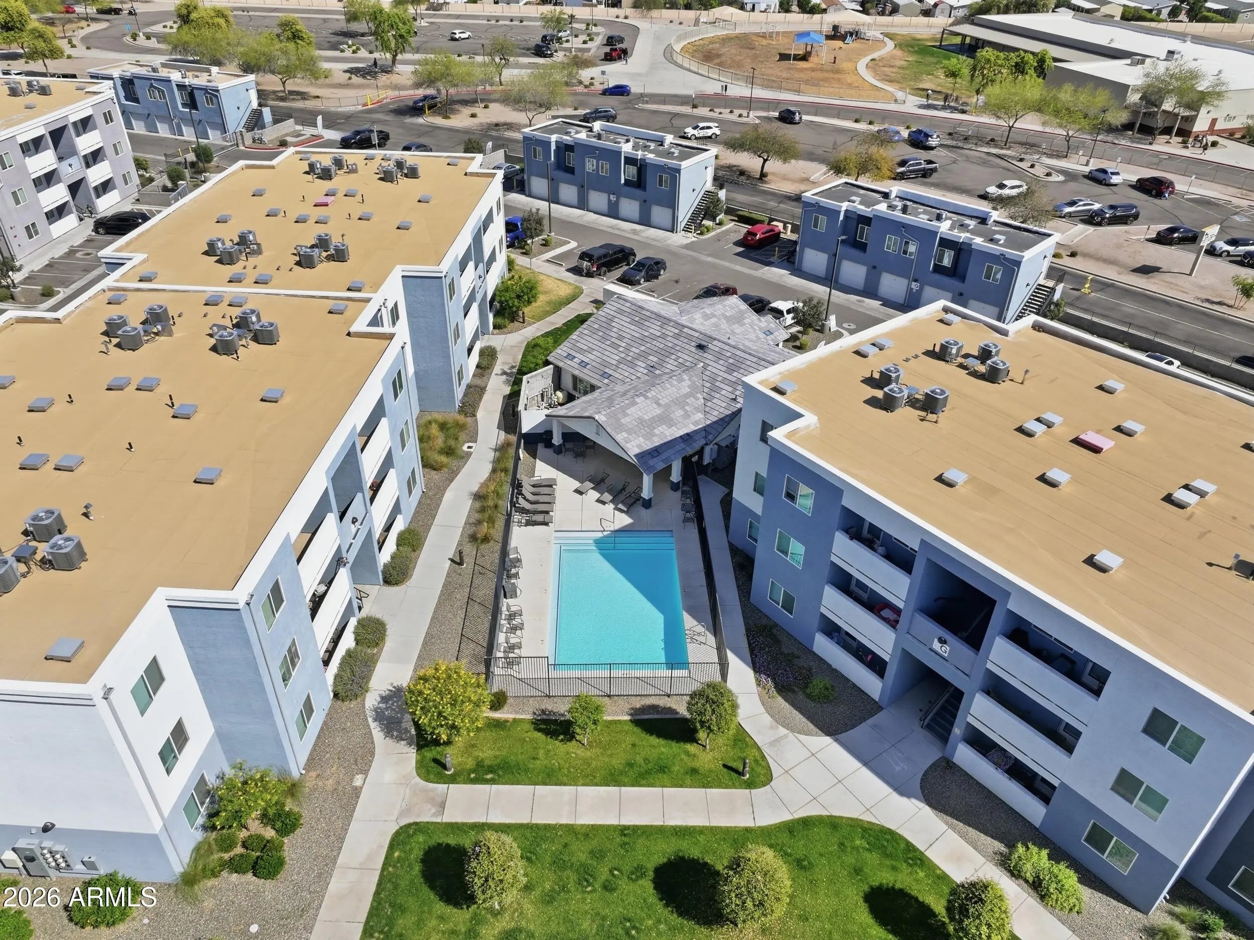 Built in 2023, this duplex offers the advantage of modern construction in the rapidly growing Surprise and El Mirage corridor. Newer construction is highly desirable due to improved building standards, energy efficiency, and the likelihood of reduced maintenance and capital expenses compared to older properties. The property features two one bedroom, one bath units, P101 and P102, each approximately 650 square feet. In addition to the residential units, the property includes five garage units that are rented to independent owners, creating an additional income stream. Combined rental income from the two units and the five garages totals $2,775 per month, providing immediate cash flow. Residents enjoy access to community amenities including a pool, playground, and fitness center.