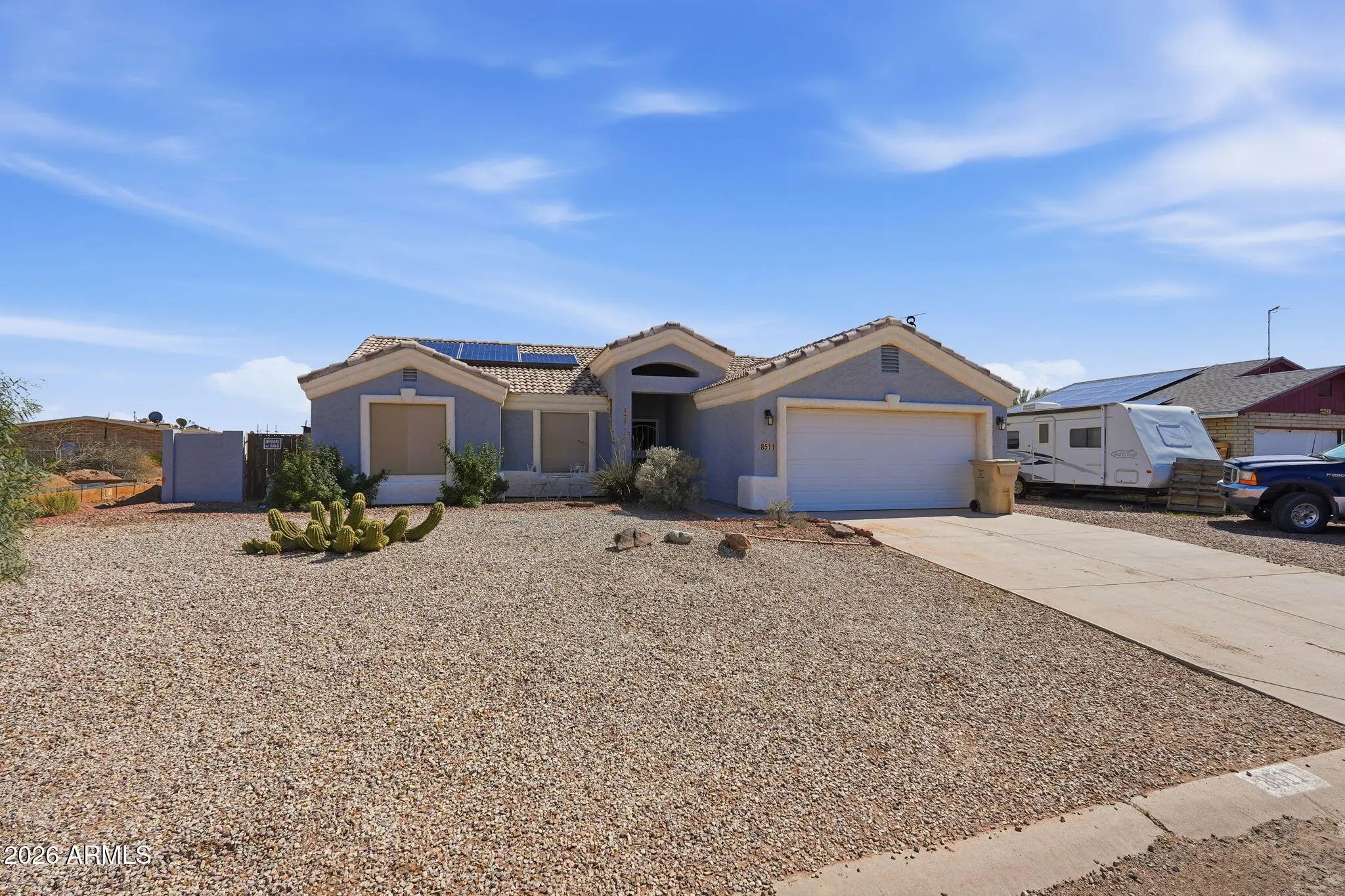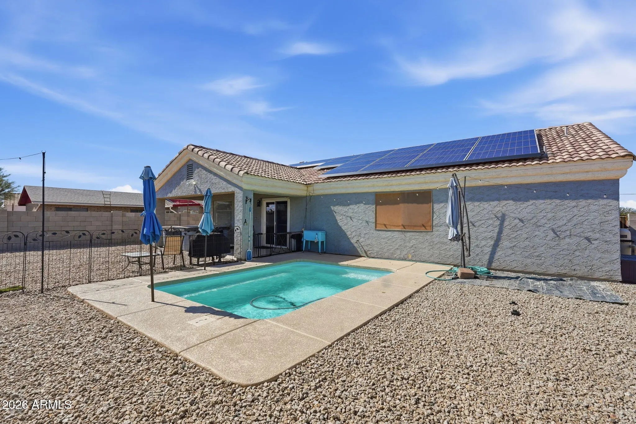 This clean, move-in ready 3-bed, 2-bath home offers a great combination of comfort and outdoor living that is hard to beat. The backyard is truly the standout feature here. A brand-new pool and spa are ready for year-round enjoyment, making those warm Arizona days something to look forward to. A large covered patio provides plenty of shade for evening barbecues or relaxed weekend gatherings, all enclosed by a sturdy block fence for added privacy. An oversized gate provides easy access for parking recreational vehicle right on the property.Inside, the home is clean and ready to be personalized from day one. Three comfortable bedrooms, including a spacious primary bedroom, along with two full bathrooms Low maintenance landscaping keeps weekend upkeep to a minimum. Leased solar panels.