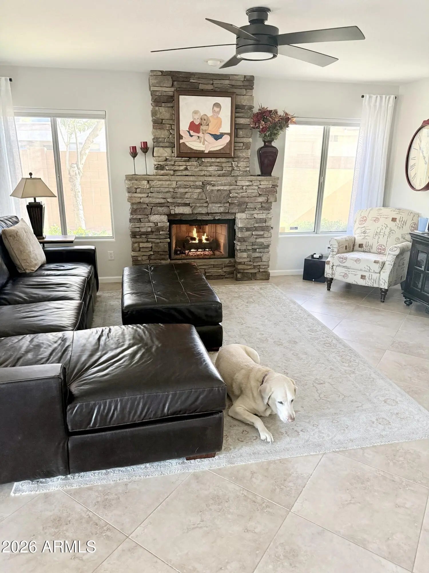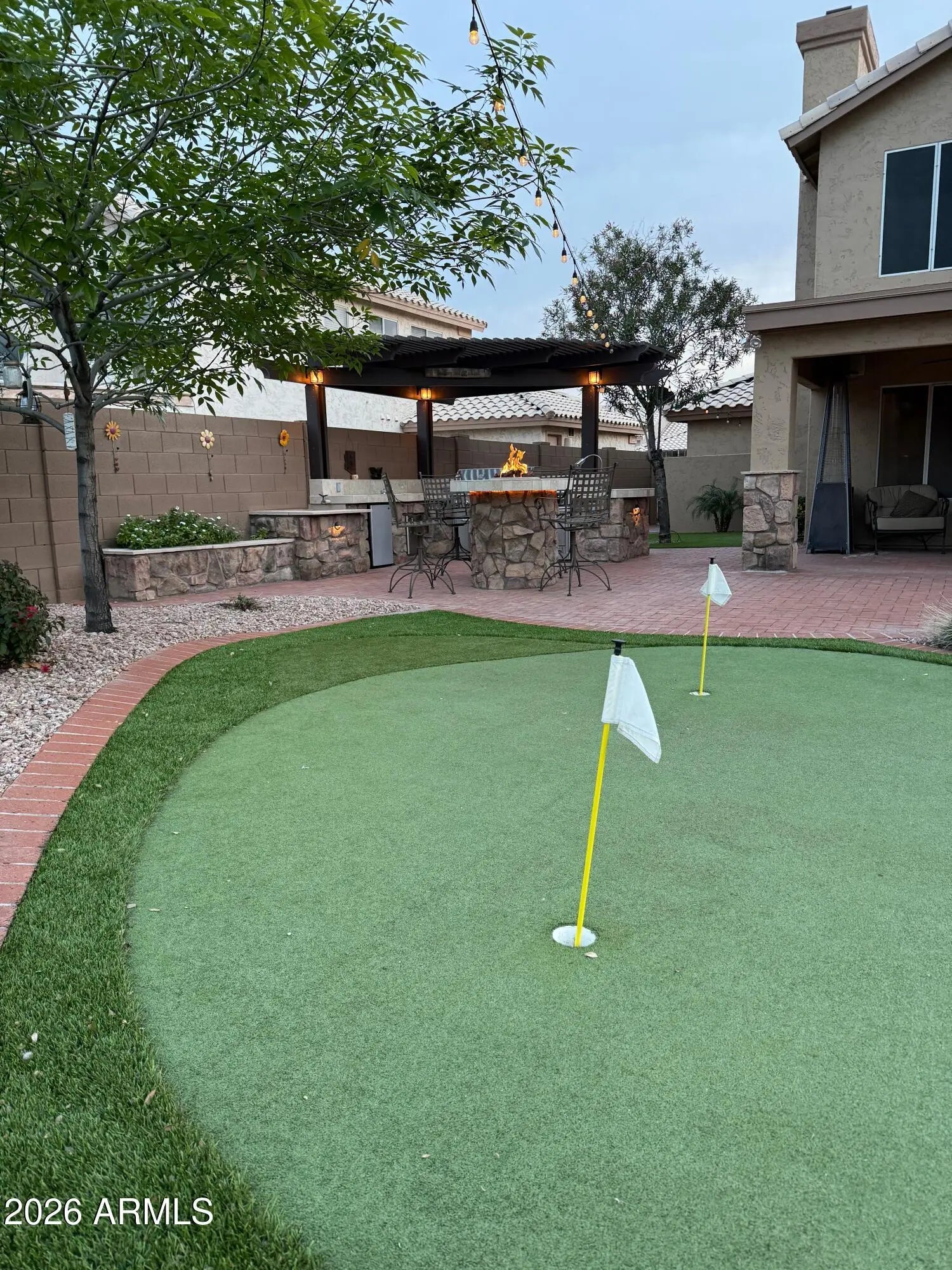 Rare find on private park is the Perfect home for family living! This beautifully updated home offers a resort-style backyard, with view fencing to a private park with gate, custom pergola with lighting, bistro lights thru the trees, built-in outdoor kitchen with oven, gas fire-pit table, water fountain, sinks & and blend of golf green, turf, pavers and mature beautiful landscape--ideal for everyday fun & entertaining. Inside, enjoy a bright, welcoming atmosphere with three updated bathrooms and kitchen and fresh interior paint. The remodeled kitchen features quartz countertops & tile backsplash, while updated bathrooms add modern comfort. Conveniently located near Desert Ridge, Scottsdale, and award-winning PV Schools. Original owners have meticulously maintained and updated this beauty.