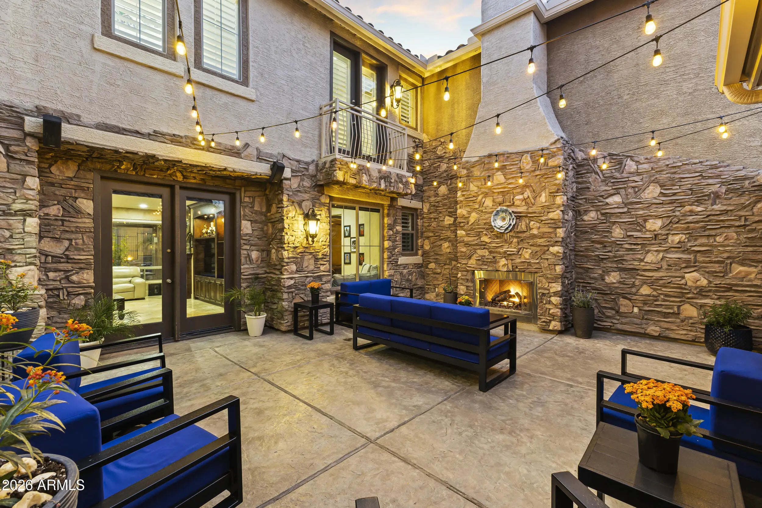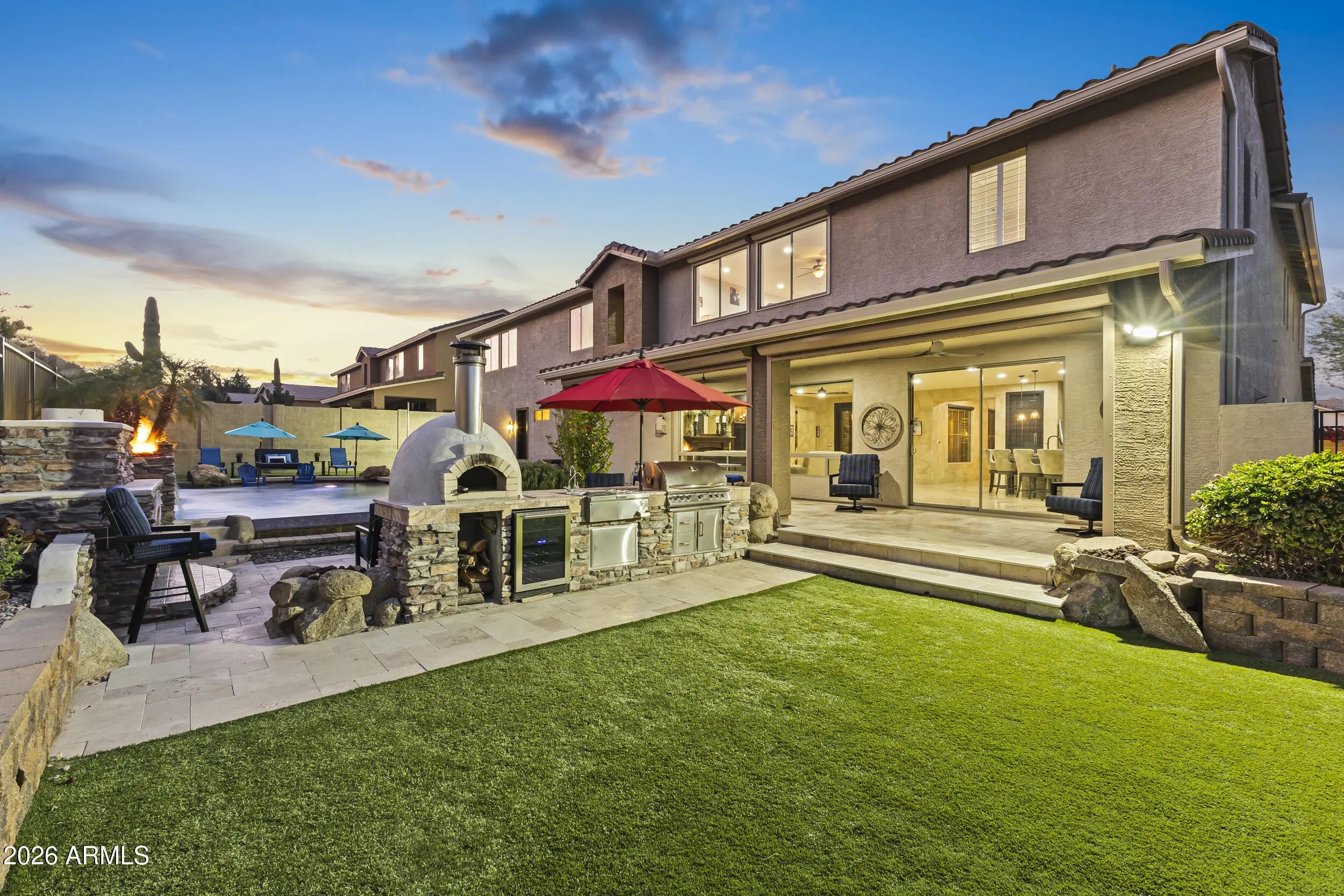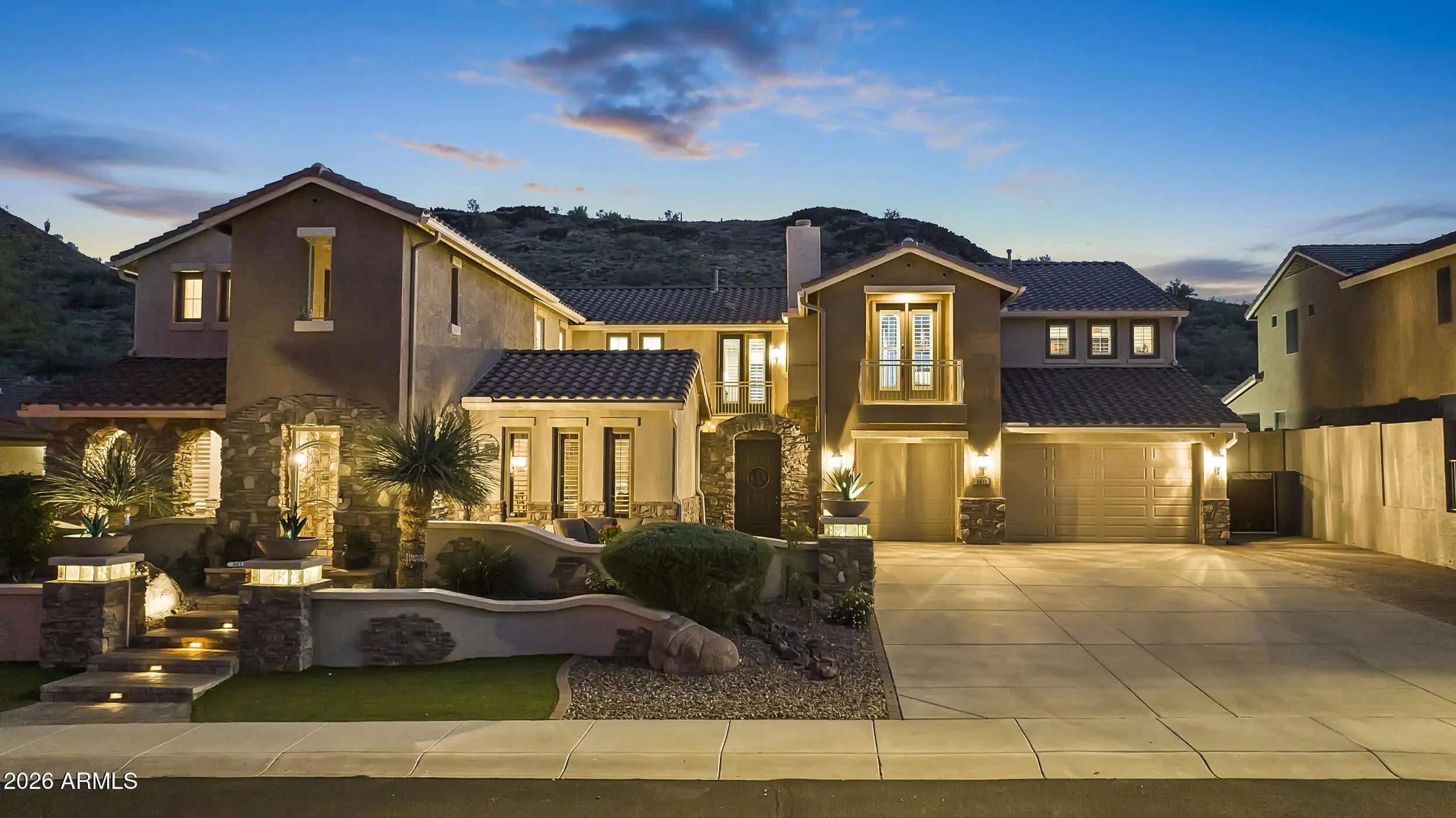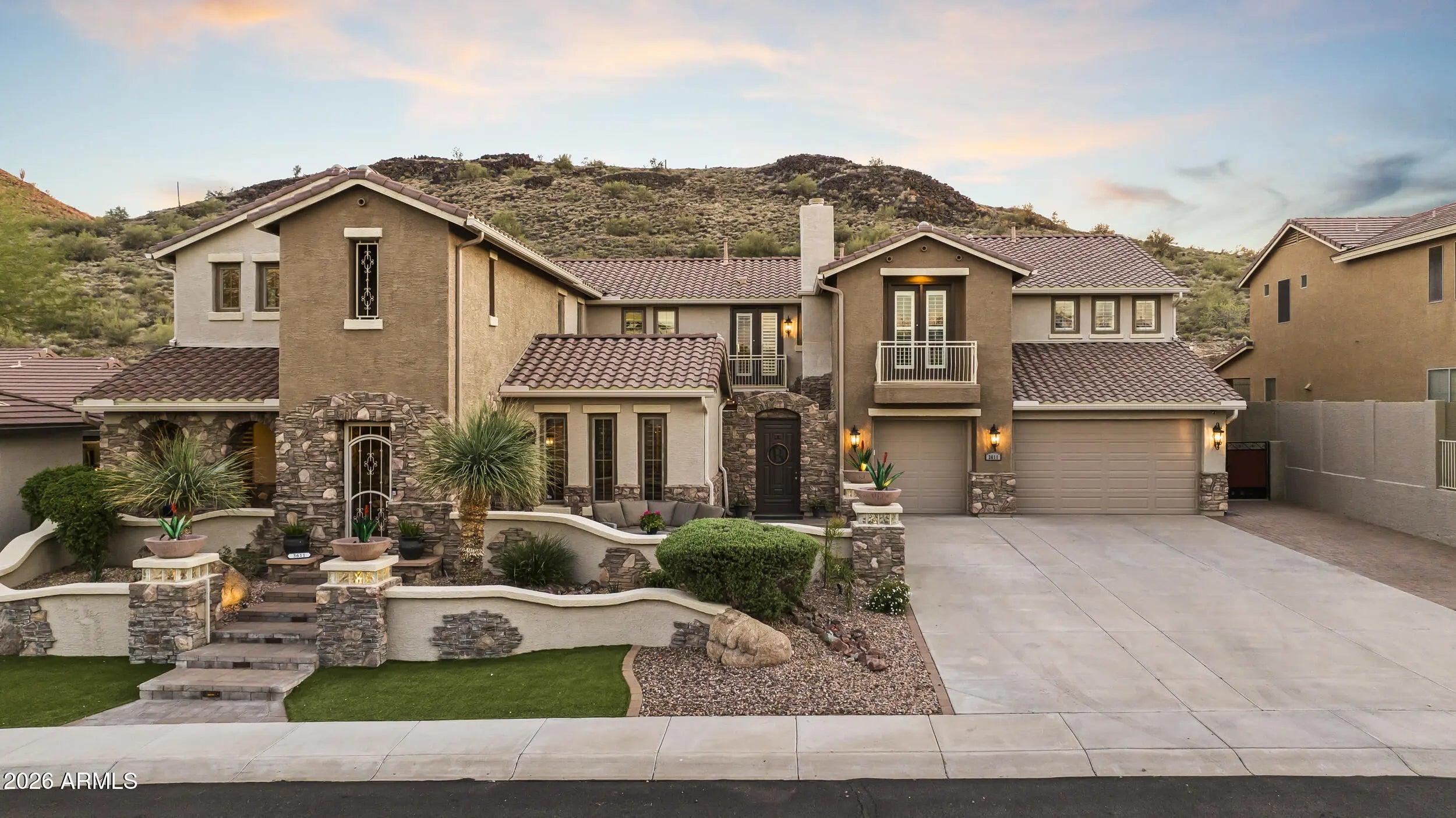 Introducing an exceptional Italian villa-inspired estate designed for elevated desert living, where timeless architecture meets modern next-generation functionality. Perfectly positioned to capture sweeping views of the Sonoran Desert, this residence offers privacy, elegance, and seamless indoor-outdoor living. From the moment you arrive, a dramatic stacked-stone entry sets the tone for the craftsmanship found throughout the home. Inside, rich textures and refined finishes frame expansive living spaces anchored by statement stacked-stone fireplaces, creating a warm yet sophisticated ambiance ideal for both intimate gatherings and grand entertaining. Designed with next-generation living in mind, the floor plan offers a main floor bedroom with en-suite bathroom perfect for multigenerationa living or executive work-from-home environments--blending independence with connection. Step outside to a true resort-style backyard retreat, the private setting includes artificial turf, stacked stone fireplace & the resort-inspired pool & spa invite relaxation under Arizona skies, while the custom outdoor kitchen elevates entertaining with a handcrafted pizza oven, perfect for unforgettable evenings with family and friends.Car enthusiasts will appreciate the generous parking for up to eight vehicles, offering both practicality & prestige. Recent improvements inside include: new kitchen appliances, new hot water heater & new plank flooring in downstairs bedroom; primary shower & closet remodeled. Exterior improvements include converting the pool to a salt water system, new pool pumps, new heat pump & self cleaning system. Outdoor roller shades provide another opportunity for a private space outside while also providing shade & security.