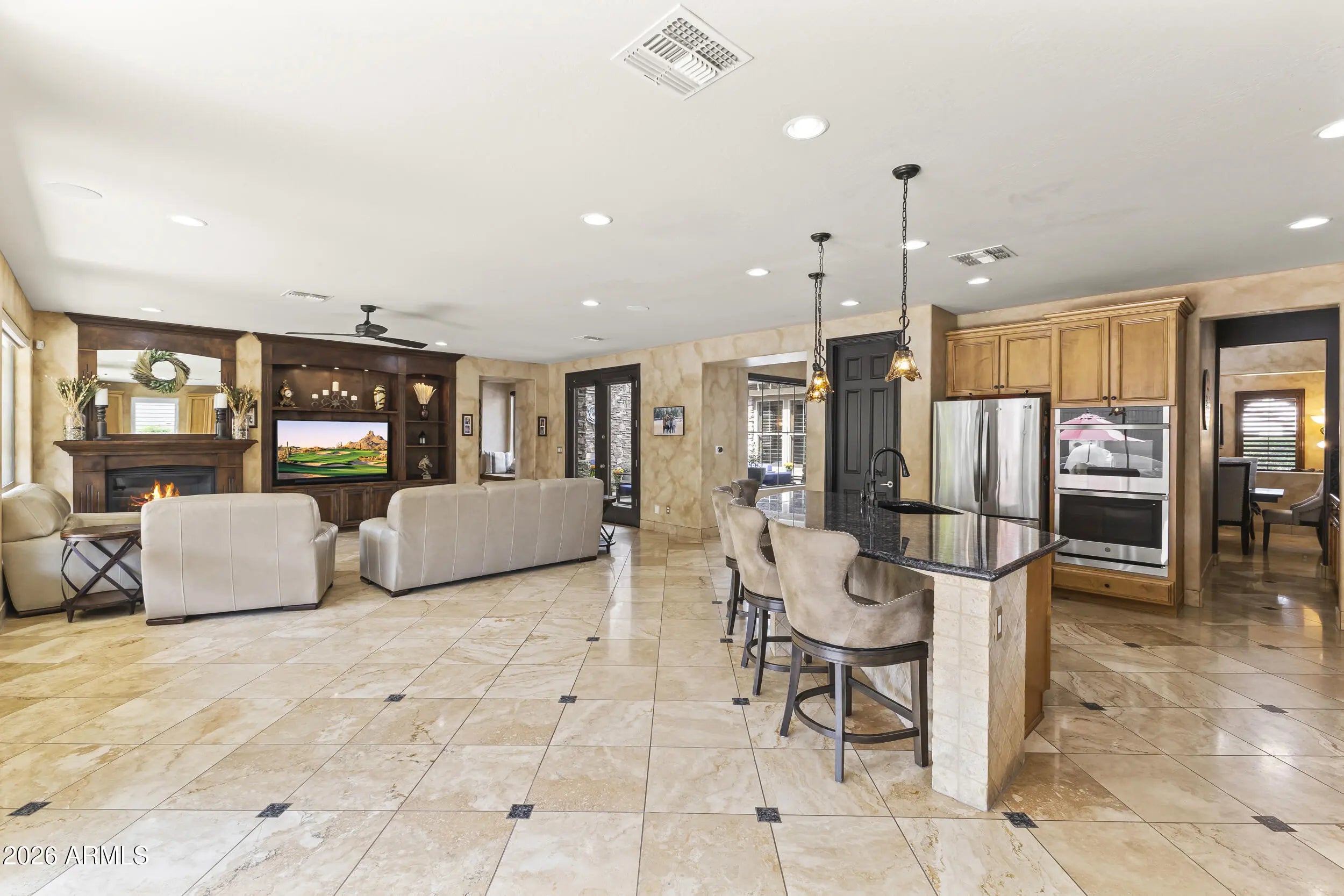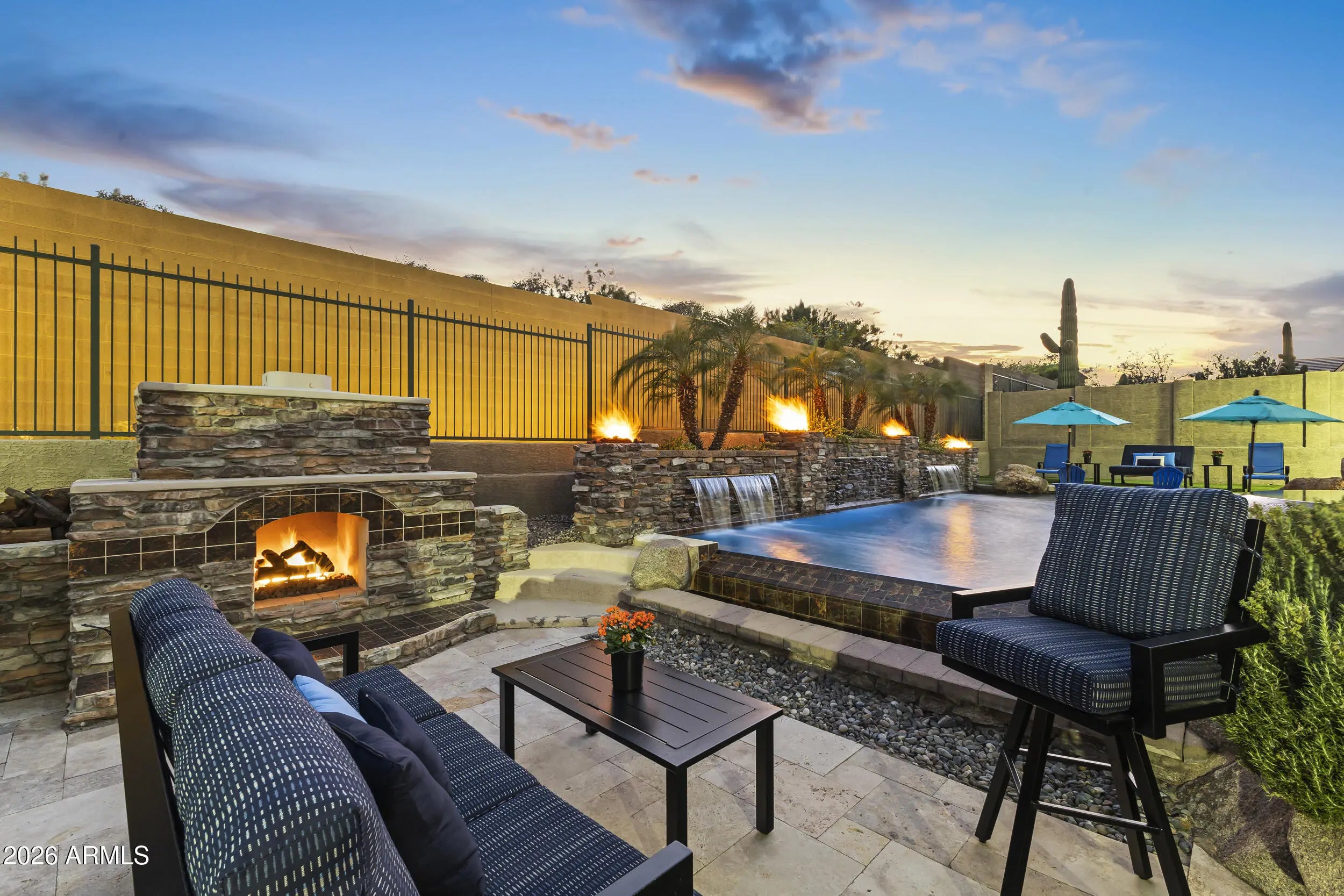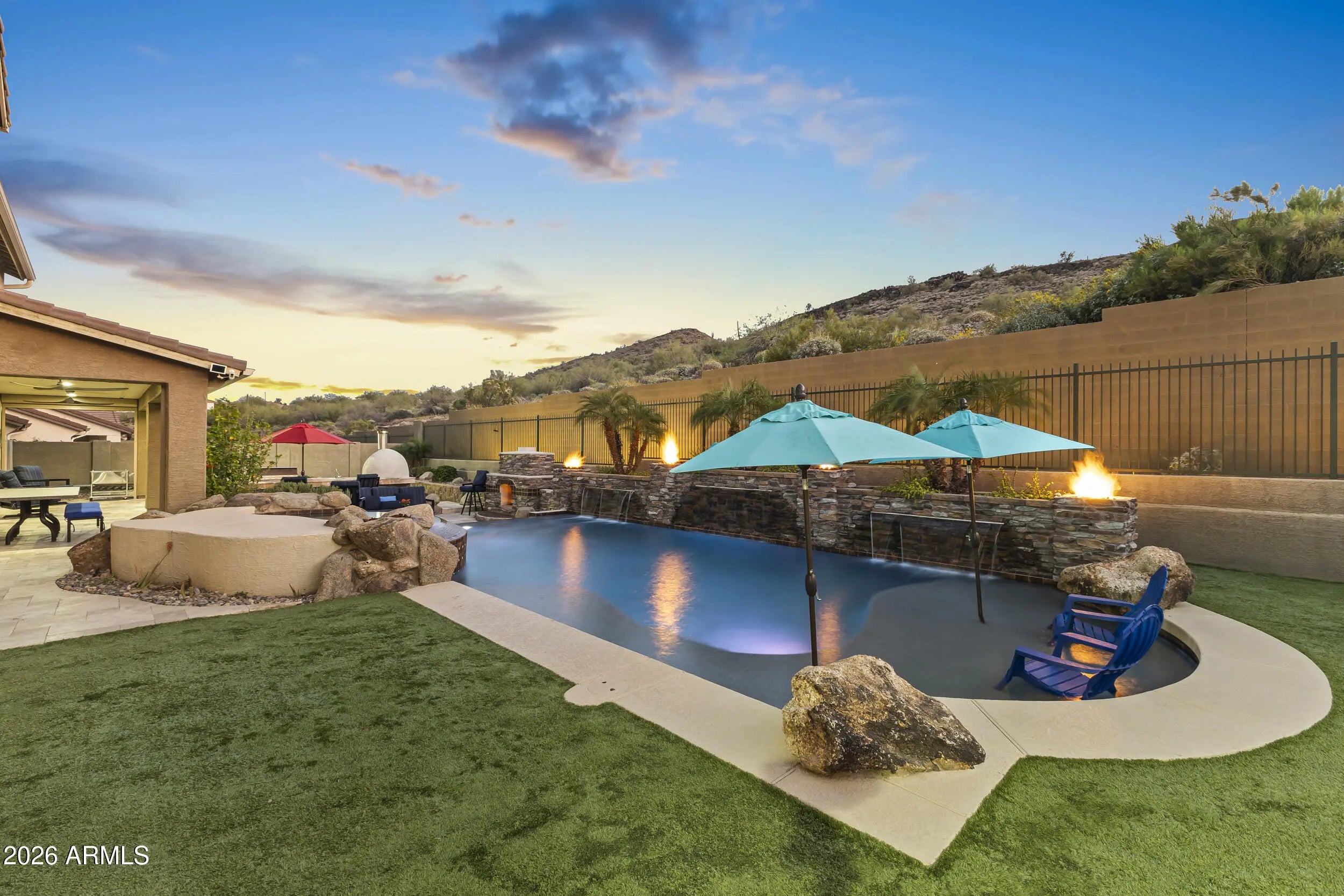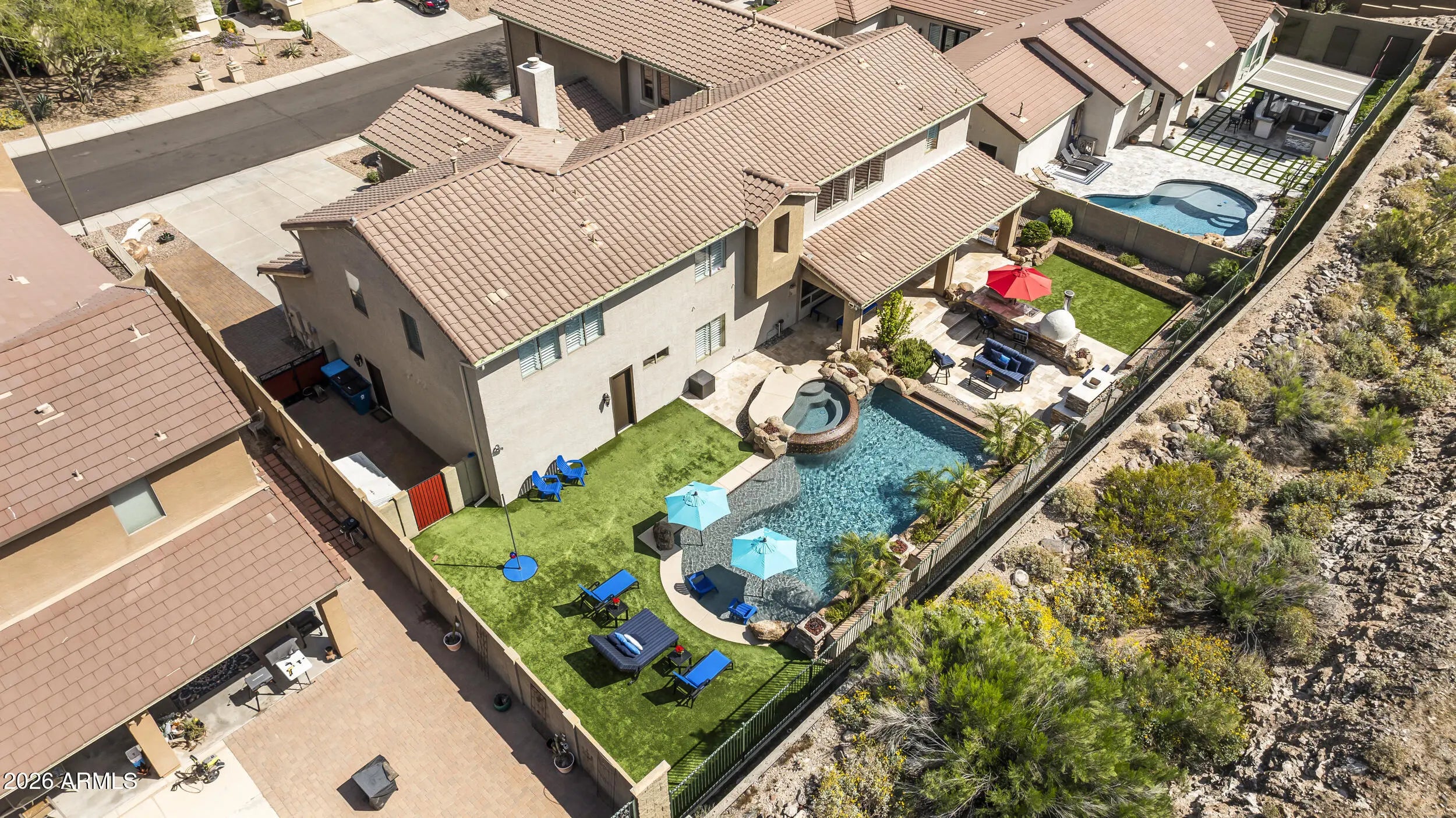 Introducing an exceptional Italian villa-inspired estate designed for elevated desert living, where timeless architecture meets modern next-generation functionality. Perfectly positioned to capture sweeping views of the Sonoran Desert, this residence offers privacy, elegance, and seamless indoor-outdoor living. From the moment you arrive, a dramatic stacked-stone entry sets the tone for the craftsmanship found throughout the home. Inside, rich textures and refined finishes frame expansive living spaces anchored by statement stacked-stone fireplaces, creating a warm yet sophisticated ambiance ideal for both intimate gatherings and grand entertaining. Designed with next-generation living in mind, the floor plan offers a main floor bedroom with en-suite bathroom perfect for multigenerationa living or executive work-from-home environments--blending independence with connection. Step outside to a true resort-style backyard retreat, the private setting includes artificial turf, stacked stone fireplace & the resort-inspired pool & spa invite relaxation under Arizona skies, while the custom outdoor kitchen elevates entertaining with a handcrafted pizza oven, perfect for unforgettable evenings with family and friends.Car enthusiasts will appreciate the generous parking for up to eight vehicles, offering both practicality & prestige. Recent improvements inside include: new kitchen appliances, new hot water heater & new plank flooring in downstairs bedroom; primary shower & closet remodeled. Exterior improvements include converting the pool to a salt water system, new pool pumps, new heat pump & self cleaning system. Outdoor roller shades provide another opportunity for a private space outside while also providing shade & security.