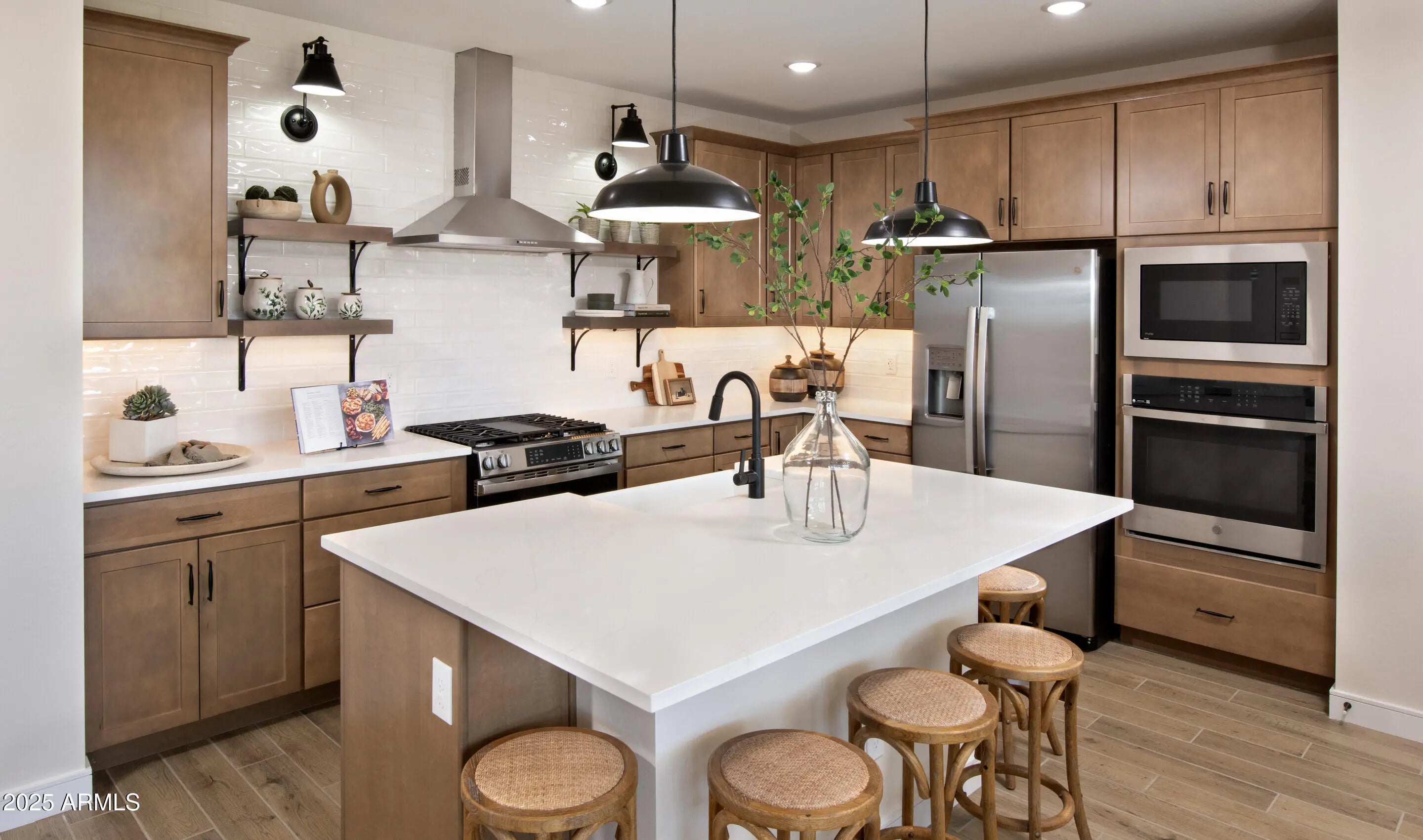 Welcome to Manor at Legacy Place, ideally located near Loop 101, Westgate Entertainment District, and popular shopping and dining. This beautifully designed Prairie Willow plan offers 5 bedrooms and 3 baths with modern Loft-inspired finishes throughout. The gourmet kitchen shines with Quill-stained cabinetry, marble-look quartz counters, and stainless-steel appliances, including the refrigerator, all opening to a spacious great room ideal for gatherings. Step outside to the large, covered patio perfect for indoor-outdoor living. A first-floor bedroom adds flexibility for guests or multigenerational living. Upstairs, a generous loft provides additional living space, while the private primary suite is a relaxing retreat with a spa-style bath, dual vanities, and a large shower.