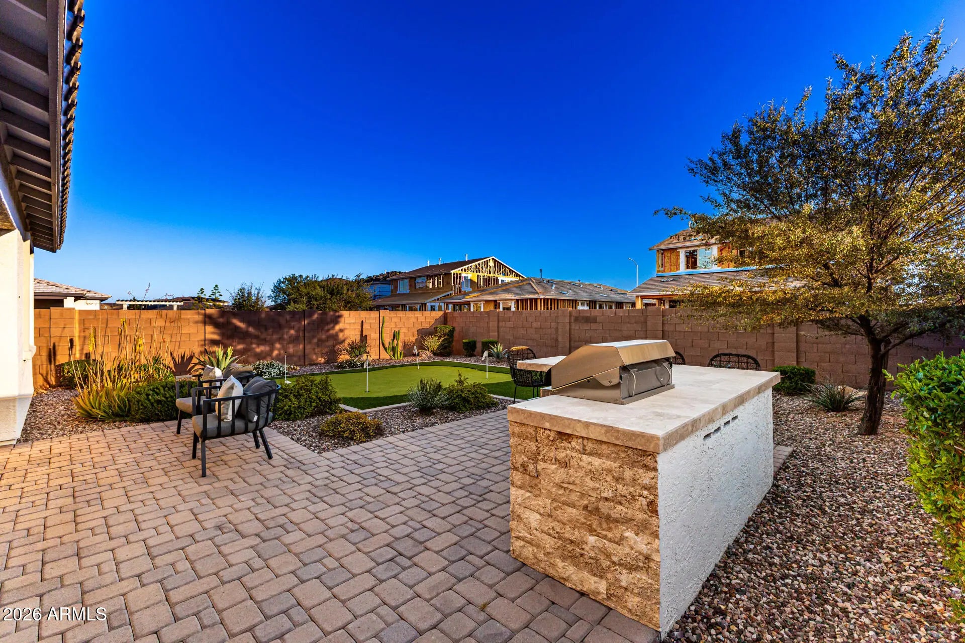 Welcome to this beautifully designed 5-bedroom, 3-bathroom home offering a flexible layout perfect for modern living. A bedroom and full bathroom on the main floor provide ideal space for guests or multi-generational living. The home welcomes you with a charming covered front porch and paver patio, driveway, and walkway, creating wonderful curb appeal. Inside, the open layout flows into a spacious kitchen and dining area, featuring stainless steel appliances, a range hood, gas cooktop, Quartz countertops, tiled backsplash, a large island with seating, and a generous walk-in pantry. The family room with built-ins provides a comfortable gathering space for relaxing or entertaining. Upstairs, you'll find a versatile loft study space and spacious secondary bedrooms, each with walk-in... closets. The primary suite offers a private retreat with an elegant ensuite bathroom featuring stylish tiled flooring, a separate soaking tub, glass-enclosed shower, dual-sink vanity, and a huge walk-in closet. A secondary bathroom with dual sinks and a dedicated laundry room with sink and storage add convenience for everyday living. Step outside to a backyard designed for fun and relaxation with a covered patio, extended paver patio, artificial turf, a built-in BBQ with seating for entertaining, and even a putting green. With its spacious design, thoughtful upgrades, and fantastic indoor-outdoor living spaces, this home is perfect for both comfortable living and memorable gatherings.