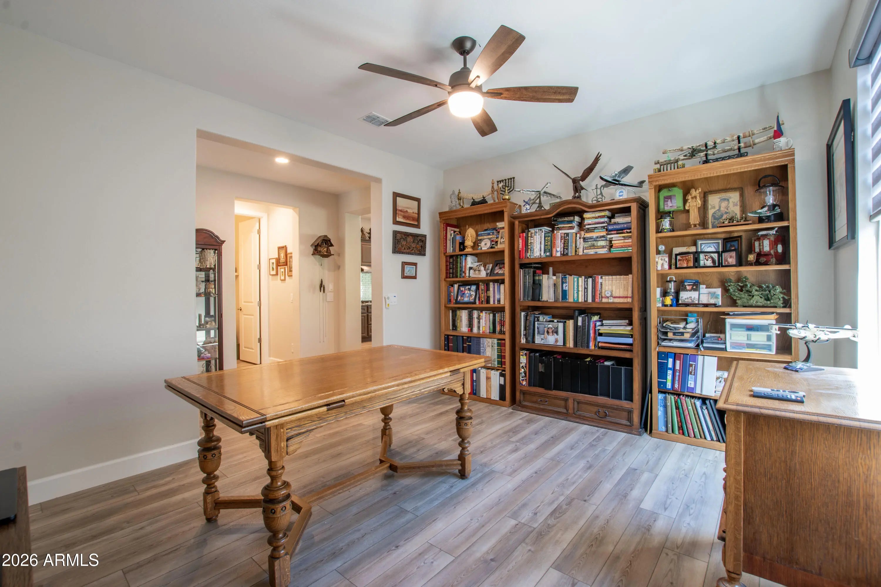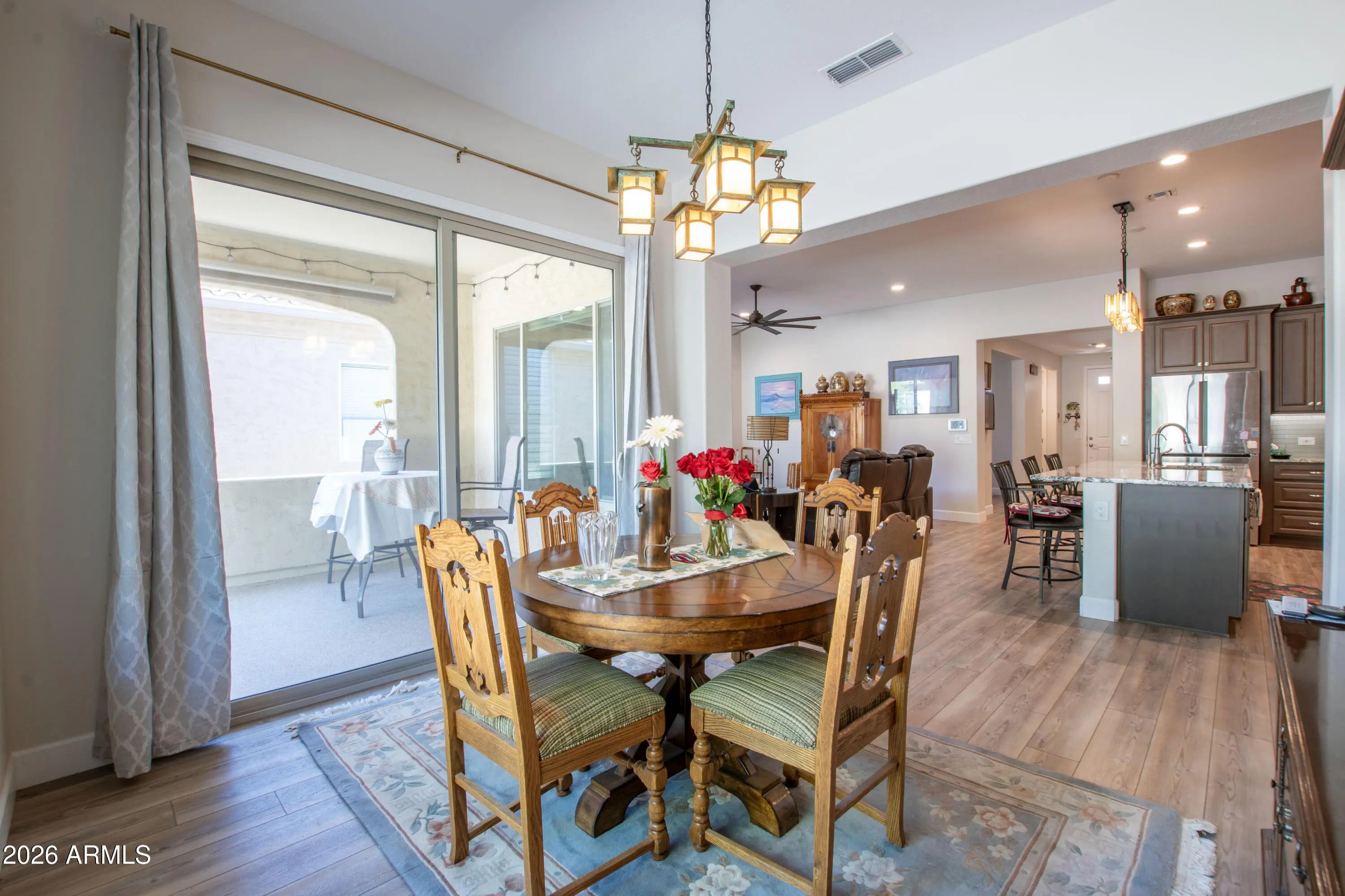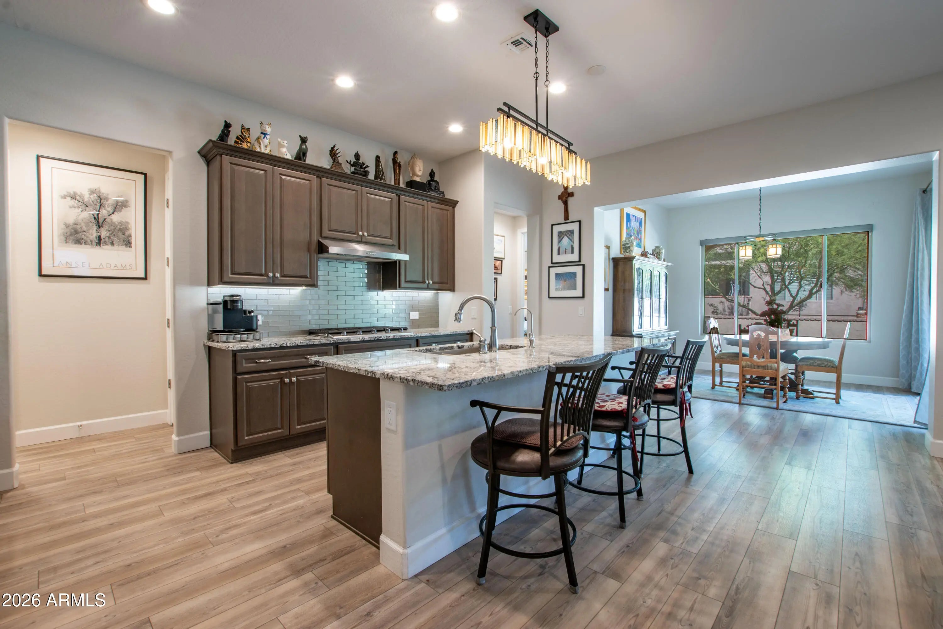 Upgraded Prado model offers 2 bedrooms and 2.5 baths with both bedrooms featuring private ensuite bathrooms. The open kitchen showcases granite countertops, kitchen island with bar seating, stainless steel appliances, gas stove, convection oven, backsplash, under-cabinet lighting, and soft-close cabinets with pull-out drawers. Hardwood flooring runs throughout the home along with taller baseboards, ceiling fans in every room, dimmer switches, and automatic window shades. The primary suite features a walk-in shower and custom closet. Additional highlights include a den/office, spacious pantry, generous laundry room, epoxy garage floor, and elevated elongated toilets. The patio offers epoxy flooring, remote privacy shades, and a gas stub for a grill. Roof has pigeon wire protection. Light Fixture in Dining Room & over Kitchen Island do not convey