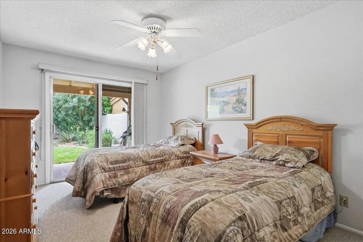 Welcome to this charming single-level patio home located in the desirable Sunridge Patio Homes community in Mesa. This well-designed floorplan features 2 bedrooms and 1.75 bathrooms across approximately 1,124 square feet, including a split layout with two master-style bedrooms, offering excellent privacy for owners or guests. The spacious living room and both bedrooms feature Arcadia doors that open to the backyard, creating great natural light and seamless indoor-outdoor living. Step outside to enjoy a covered patio and private backyard that backs to a peaceful greenbelt, providing additional space and privacy. Additional highlights include a 2-car garage with a small office workspace, a storage shed, and security roller shields on doors for added peace of mind.