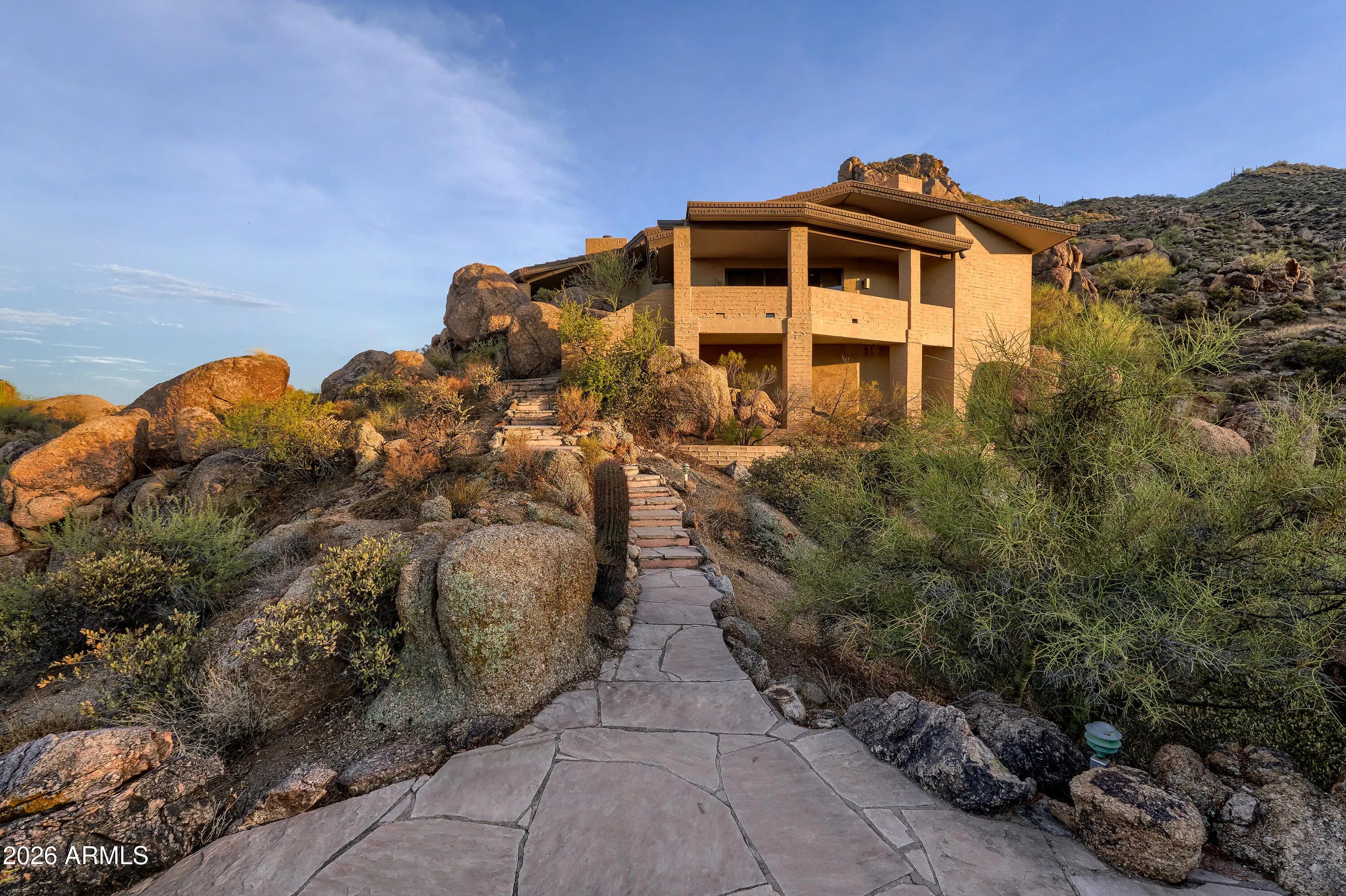 Spectacular in Carefree! Located near the TOP on the NE slope of Black Mountain on 5 acres in gated Hawksnest adjacent to Black Mountain Preserve and set amongst massive boulders. This 3370 SF, 2 Bed 2.5 Bath home with private studio (could be 3rd BR) plus separate detached office provides the ULTIMATE in function and privacy. Experience the History and Legacy of Gerry Jones in the home that he designed, built and lived in with his family for over 42 years! Imagine Gerry's mindset as he designed over 250 homes in his studio. An abundance of windows, cabinets, drawers and storage requires minimal furniture & decor. Serenity abounds inside and out! Breathtaking views with timeless design and modern amenities. Take in the beauty of nature and the stars from this one of a kind residence Ask about the Burning Bush in the crevice of one of the boulders in the living room!