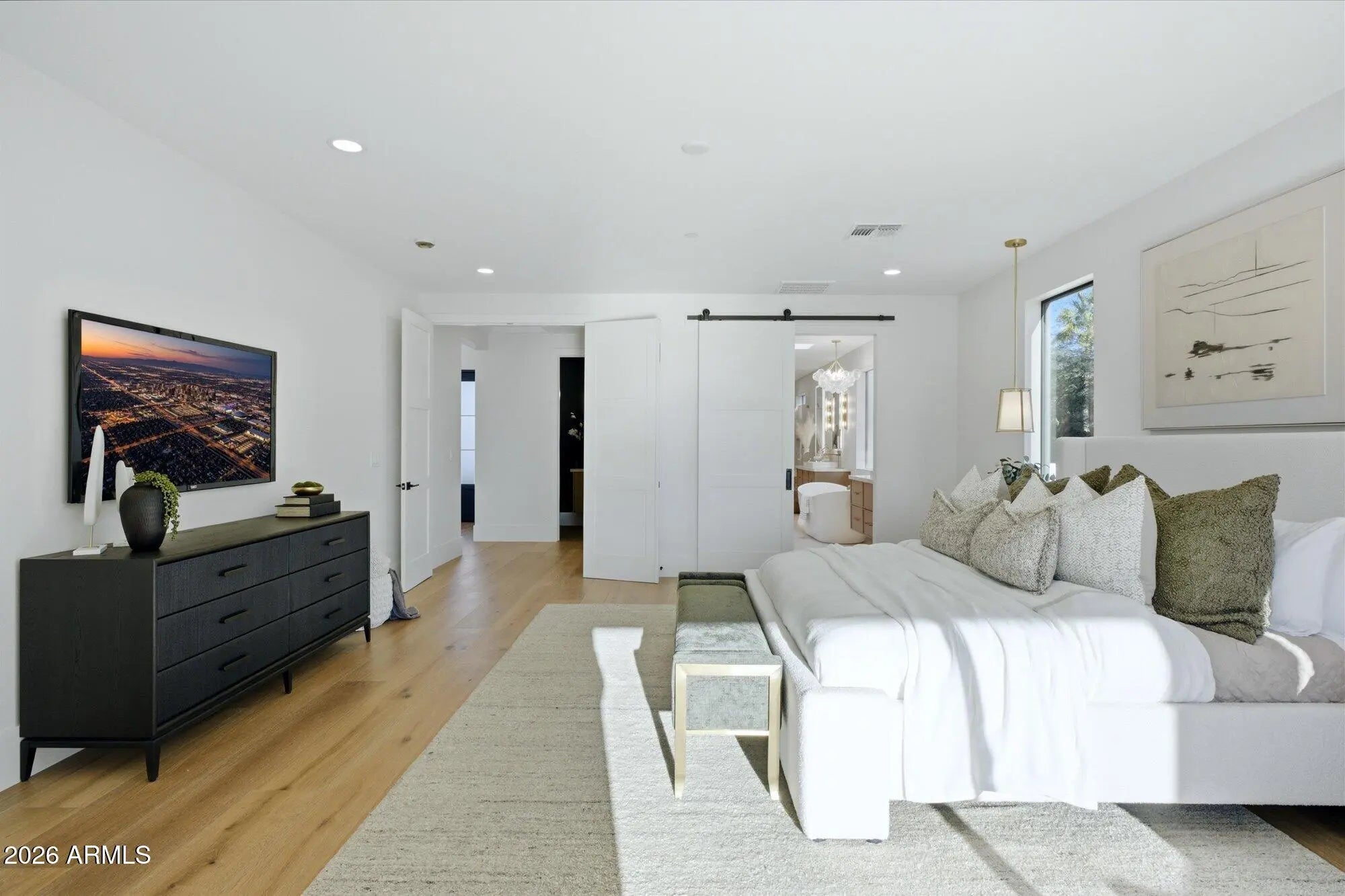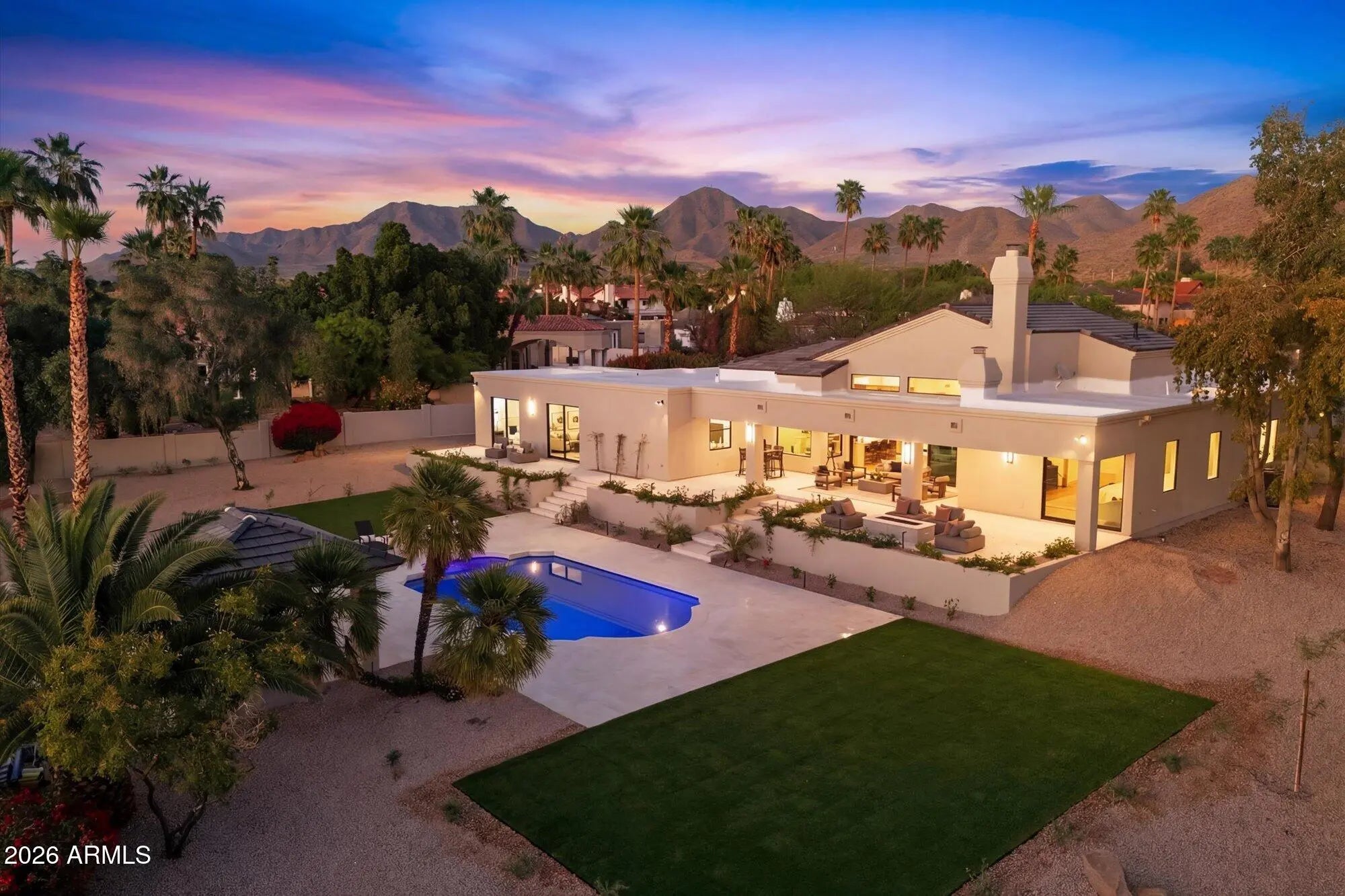 Completely reimagined custom estate in the highly desirable Buena Mira subdivision of the Cactus Corridor. Situated on a private ¾-acre lot with distant views of Camelback and Mummy Mountain, this 5-bedroom, 5.5-bath residence offers refined transitional design and elevated indoor-outdoor living. Four bedrooms feature ensuite baths. A circular drive and limestone walkway lead through a charming courtyard entry into a vaulted great room with exposed wood ceilings and a natural wood-burning fireplace finished in Venetian plaster and designer tile. Expansive sliding glass doors create seamless connection to the outdoors. The chef's kitchen showcases custom White Rift Oak cabinetry, Taj Mahal Quartzite countertops, Thermador appliances, dual islands, slab backsplash detailing, and designer plumbing fixtures. Large-format Rift Oak wood flooring runs throughout the home. The primary suite offers patio access and a spa-inspired bath with freestanding soaking tub, quartzite counters, custom tile work, and warm brass fixtures. Secondary baths feature consistent cabinetry and quartzite surfaces with individually curated tile selections. Extensive low-voltage pre-wire infrastructure supports a fully integrated smart home, including surround sound, whole-home audio, motorized shading, security and surveillance, and enterprise-grade WiFi coverage. Centralized AV and structured wiring systems provide a turnkey foundation for advanced home automation. The professionally designed backyard includes mature palms and olive trees, limestone hardscape, lush grass and turf areas, heated PebbleTec pool and spa, built-in BBQ ramada, and expansive covered patio space. Additional features include a three-car garage with built-in cabinetry and epoxy flooring, soft water system, tankless water heaters, and RV gate access.