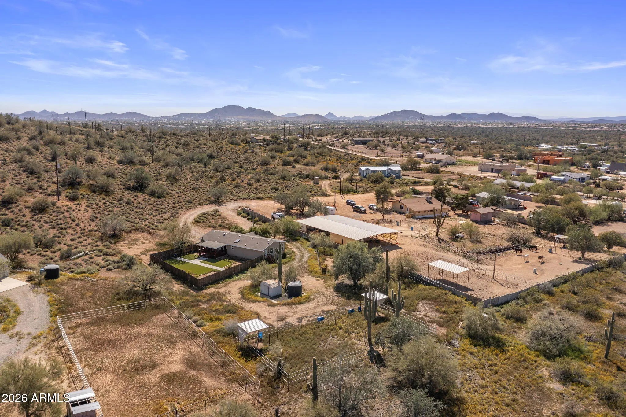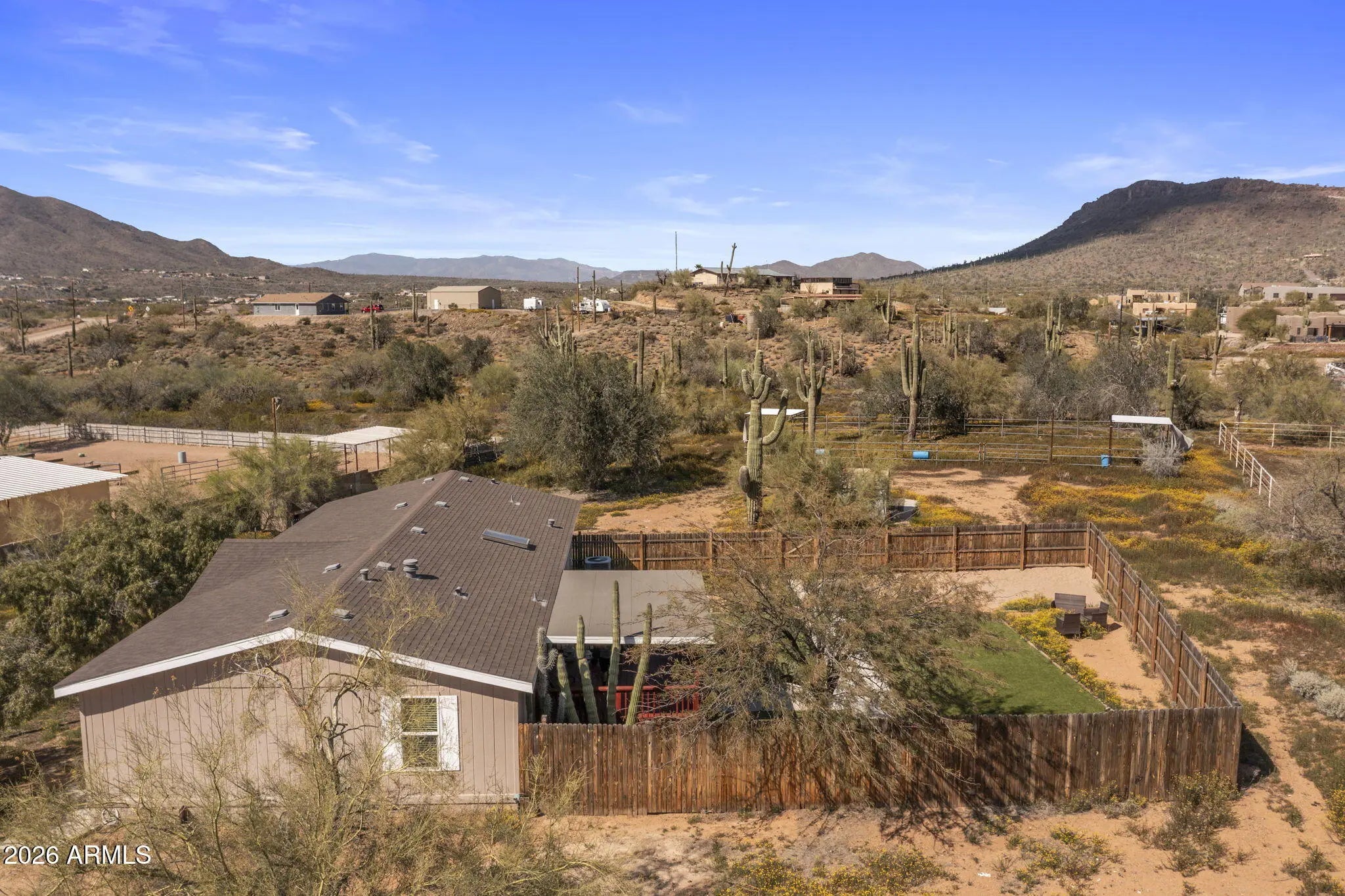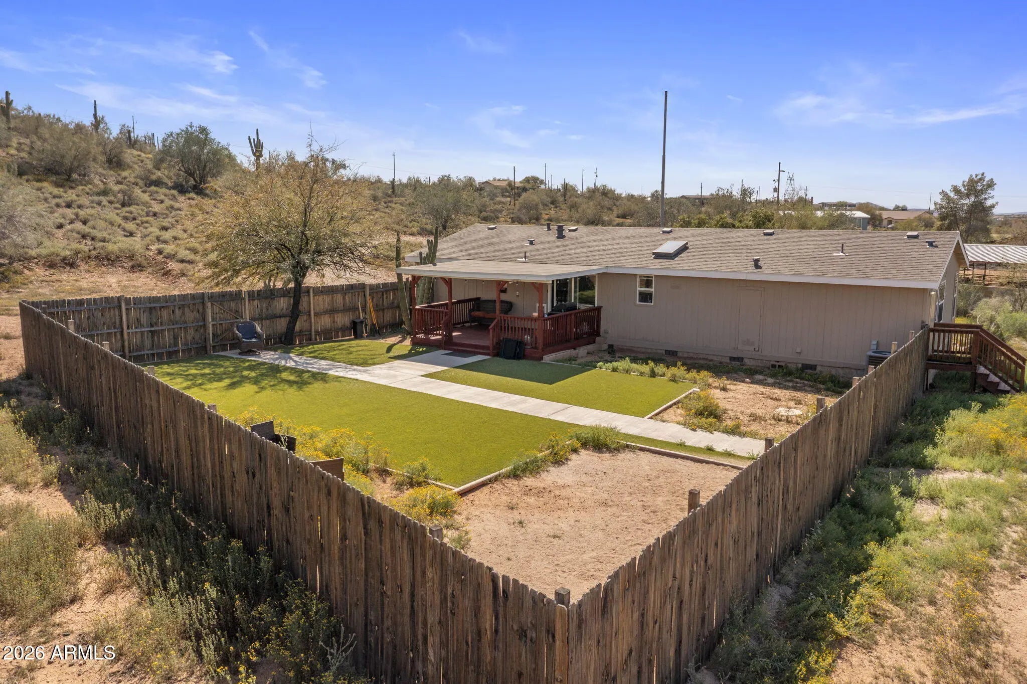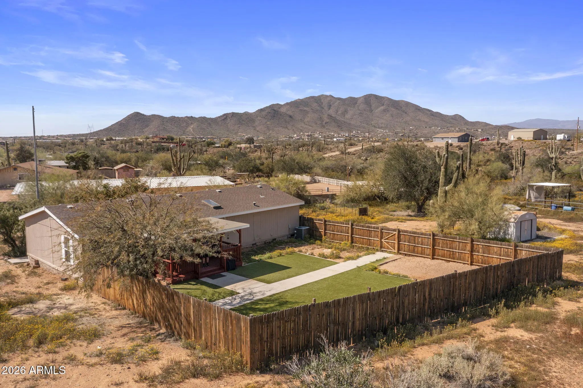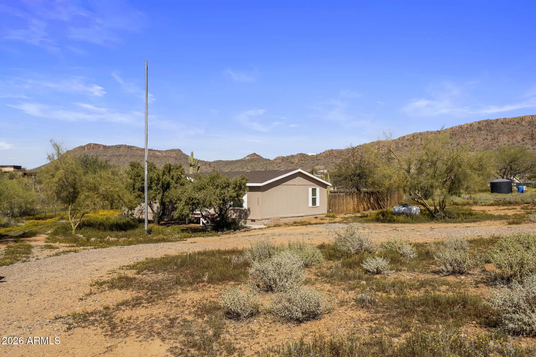 Beautiful one-acre property featuring a modular home and offering privacy and space to enjoy the Arizona lifestyle. The home welcomes you with a spacious back porch, perfect for relaxing and taking in the peaceful desert surroundings. Just beyond the porch, the enclosed backyard has been enhanced with added greenery and turf, creating a comfortable outdoor space to relax or entertain. This property is ideal for horse lovers or anyone needing room for RVs, trailers, toys, or future additions. Enjoy wide open desert surroundings with endless possibilities while still being conveniently located in North Phoenix with easy access to I-17, shopping, dining, and nearby amenities.