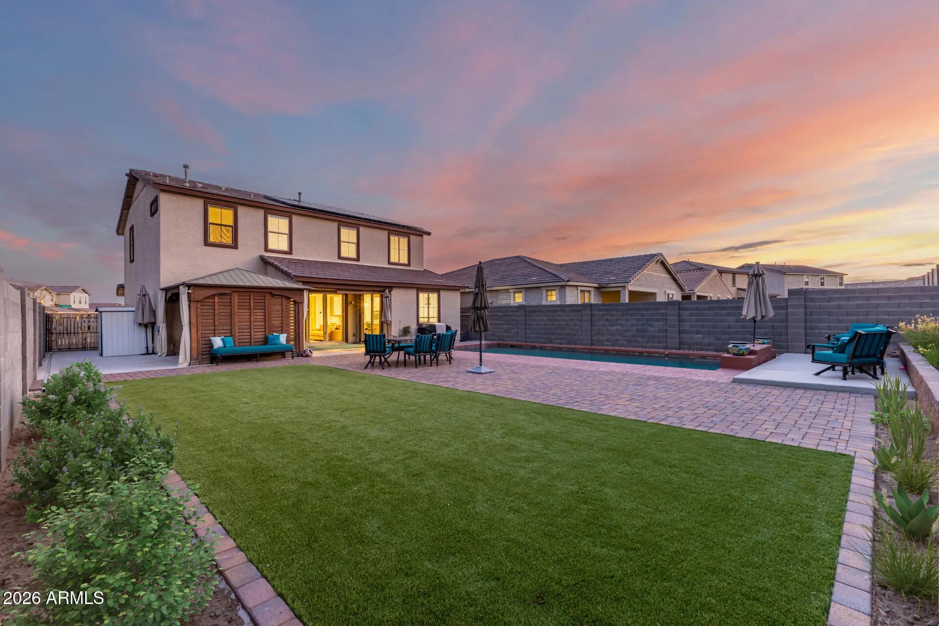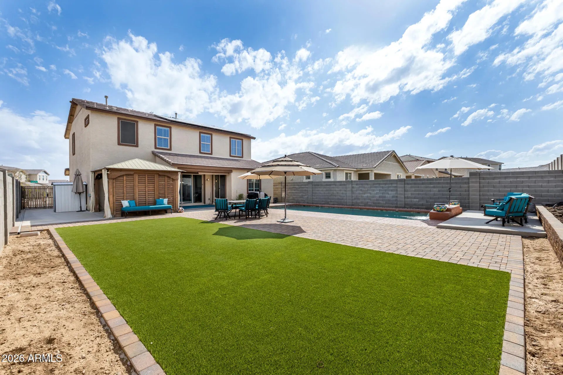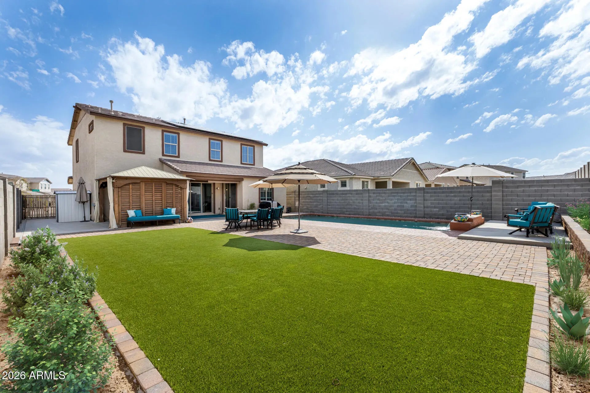 Step into a home where indoor comfort meets resort-style outdoor living. This Craftsman-inspired home sits on an oversized nearly 7,000 square foot lot and immediately stands out with its beautifully enhanced backyard designed for both relaxation and entertaining. The current owner has invested in significant backyard improvements, creating a private retreat featuring a sparkling pebble-finish pool with tranquil water feature, expansive paver patio, low-maintenance artificial turf, and a raised brick planter ideal for gardening or custom landscaping. An above-ground hot tub sits beneath a pergola complete with a pull-down projector screen and projector, setting the stage for unforgettable movie nights under the stars. Even better, the home features owned solar with no loan to assume, allowing the new owner to immediately enjoy lower utility costs, along with a spacious three-car tandem garage that offers exceptional parking and storage flexibility. Inside, the versatile floor plan offers three bedrooms plus a dedicated office and an expansive loft, providing incredible flexibility for today's evolving lifestyles. The office, located just off the entry, can easily function as a formal living room, executive workspace, playroom, library, music room, hobby or craft space, or quiet study area. Upstairs, the generous loft creates the perfect setting for a media room, homeschool space, fitness or yoga studio, game room, teen retreat, or second family room. Wood-look tile flooring in a modern neutral gray tone runs throughout the entire first floor, creating both visual continuity and everyday durability. The main living area is designed for seamless indoor-outdoor living, featuring a triple sliding glass door that opens to the covered patio, while the dining area offers a second double slider. When both are open, the home transforms into an entertainer's dream, blending indoor comfort with outdoor enjoyment. The living room also features built-in surround sound with installed speakers, along with custom ceiling fans and upgraded lighting throughout, including stylish pendant lighting in the kitchen and a statement chandelier anchoring the dining space. The gourmet kitchen is both beautiful and highly functional, showcasing granite countertops, white cabinetry with custom hardware, white tile backsplash, a gas cooktop with stainless steel range hood, built-in double electric ovens, and a separate built-in microwave and convection combo. Reverse osmosis, a large walk-in pantry, and abundant prep and storage space make this kitchen ideal for both everyday living and hosting. A convenient downstairs powder room and built-in shelving nook add thoughtful touches of practicality and storage. Upstairs, the spacious primary suite offers a true retreat, complete with a luxurious bath featuring two separate vanities and a walk-in shower. Secondary bedrooms each include custom ceiling fans, and the secondary bath offers a dual-sink vanity with a tub-shower combination. The oversized upstairs laundry room provides excellent potential for future cabinetry or additional storage solutions. The three-car tandem garage is a standout feature, complete with built-in storage cabinetry, a functional workbench area, and a 30-amp 240-volt power outlet that is ideal for EV charging, workshop equipment, or other heavy-duty uses. There is also a dedicated 30-amp 240-volt RV electric outlet located on the exterior of the home. Conveniently located just north of Interstate 10 and minutes from Loop 303, this home provides easy access to all parts of the Valley while remaining close to shopping, dining, and everyday amenities in both Buckeye and Goodyear. This is a rare opportunity to own a thoughtfully upgraded home that combines energy efficiency, flexible living spaces, and an exceptional backyard designed to truly enjoy Arizona living.