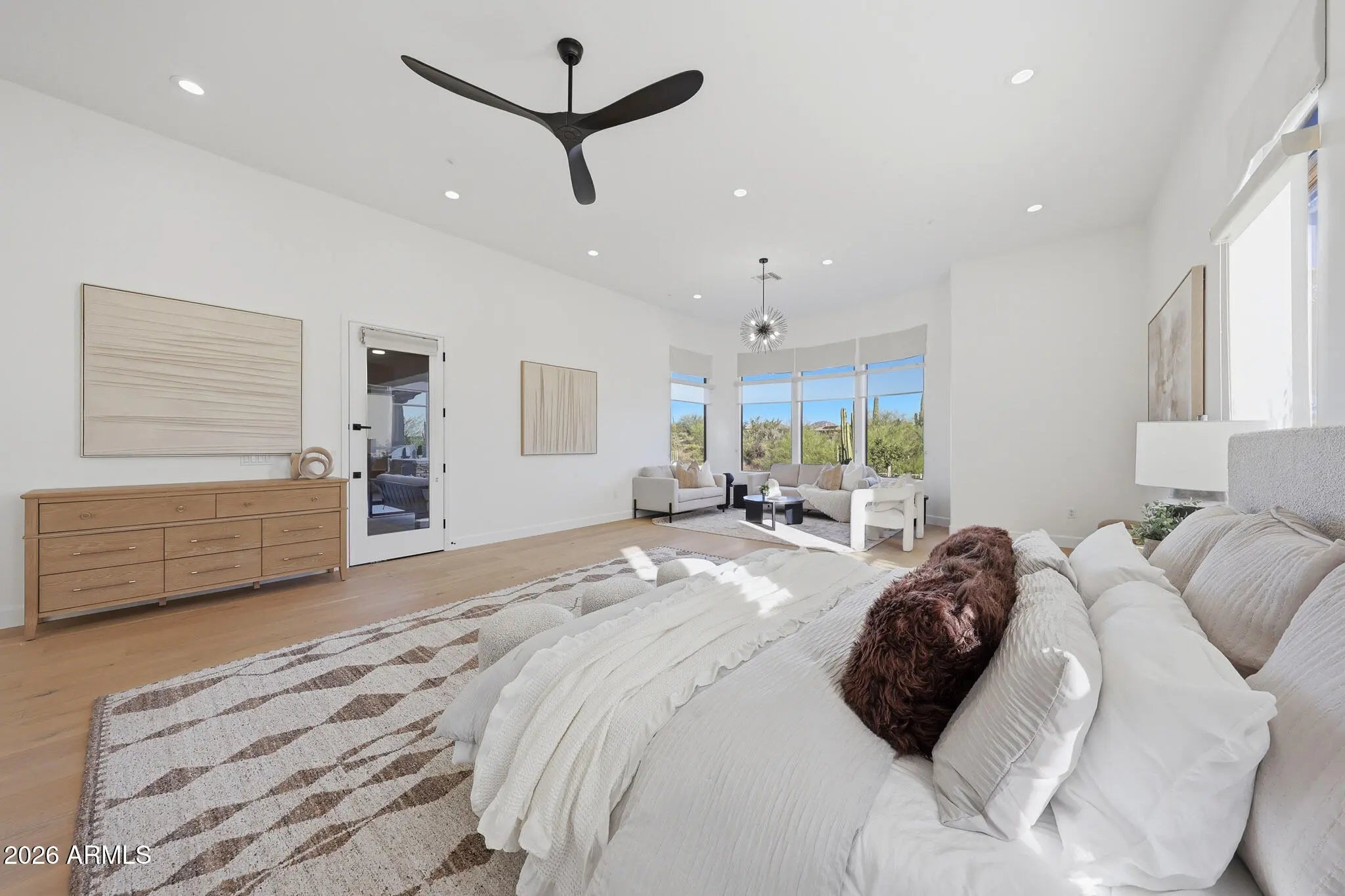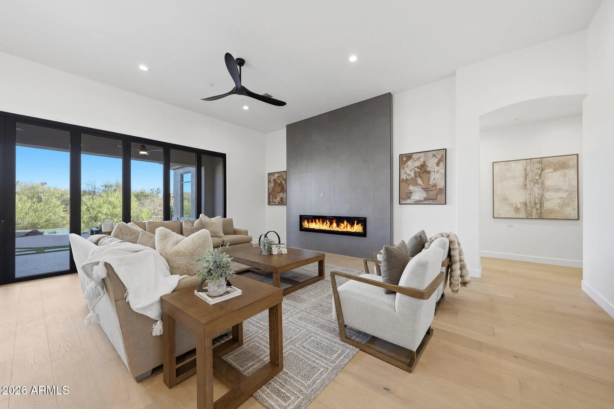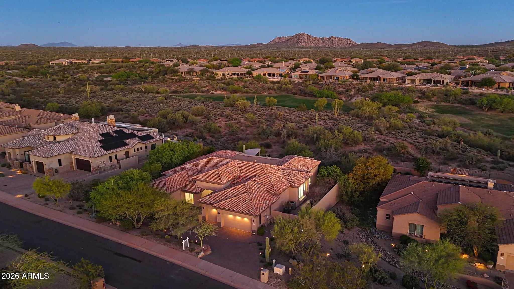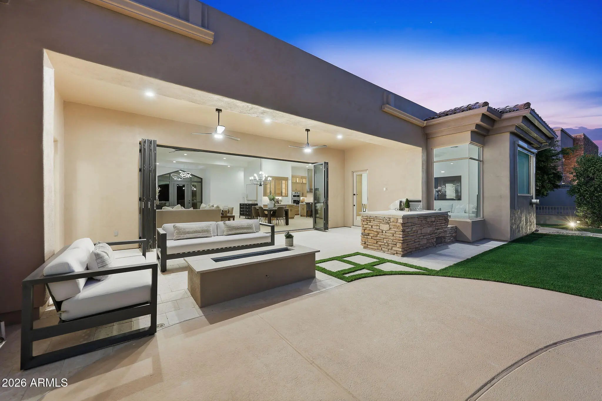 2026 Stunning full luxury remodel that shows NEW on the Legend Trail Golf Course! This gorgeous 3,929 sq ft home offers a split-floorplan with 4 br & 3 ba on a premium, private ¾-acre south-facing lot, sweeping Sonoran Desert views. The open floor plan features 12-ft ceilings, 8-ft doors, European oak flooring, and two modern fireplaces. Chef's kitchen includes high-end stainless appliances, waterfall quartz countertops, two convection ovens, spacious pantry, built-in bar with wine fridge. New cabinetry throughout. Climate-controlled 3-car garage with 220V charging perfect for a collector! The private primary suite offers a sitting area, desert views and a spa-inspired dual shower with massaging jets as well as a large walk-in closet. Upgrades include LED and cabinet lighting, 20-ft door, ... limestone hardscape, luxury turf, linear outdoor fireplace, updated BBQ with pergola--perfect for indoor/outdoor entertaining. Enjoy resort-style amenities including pool, spa, fitness center, tennis, pickleball, and miles of hiking and biking trails in the desirable Legend Trail Golf Club community.