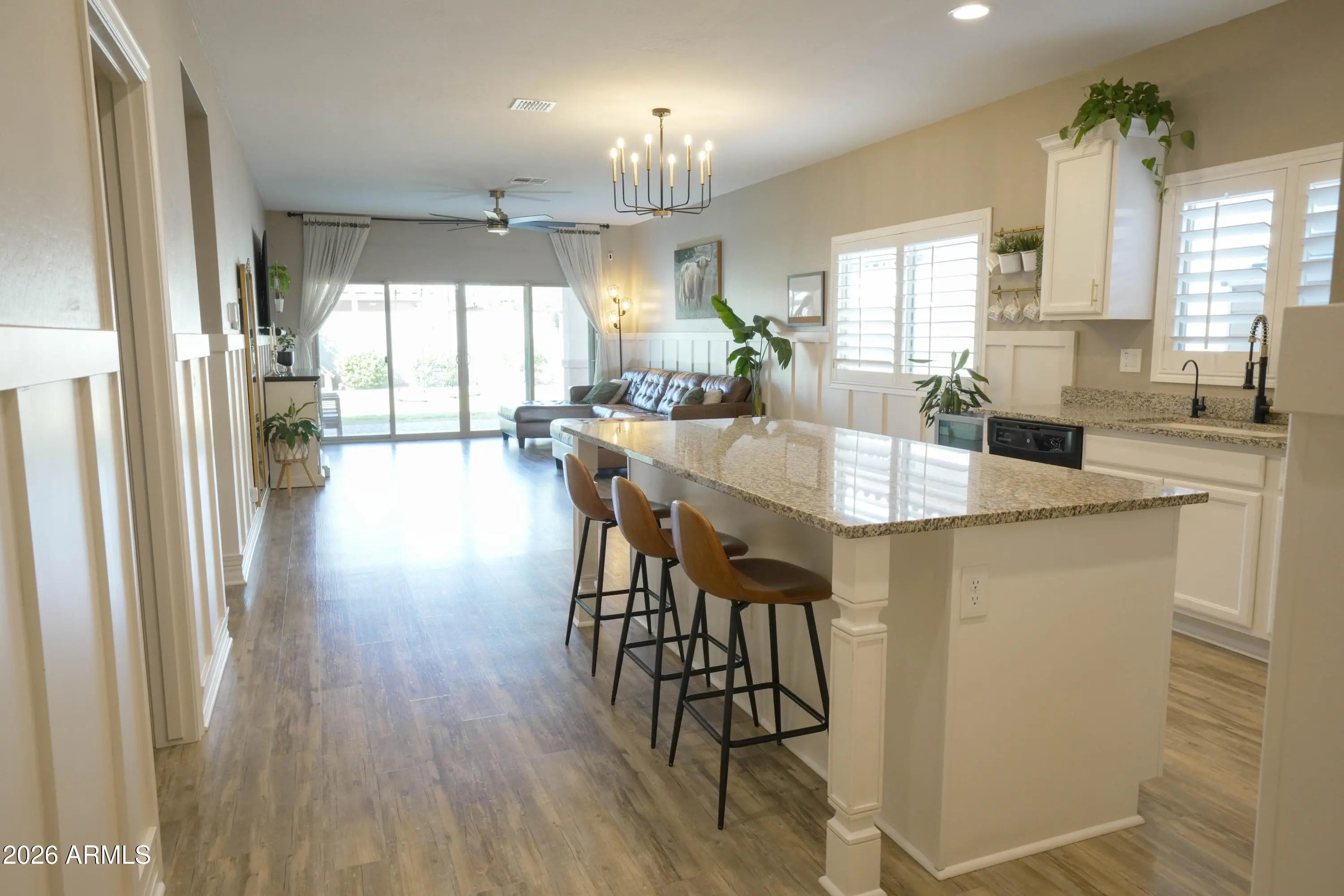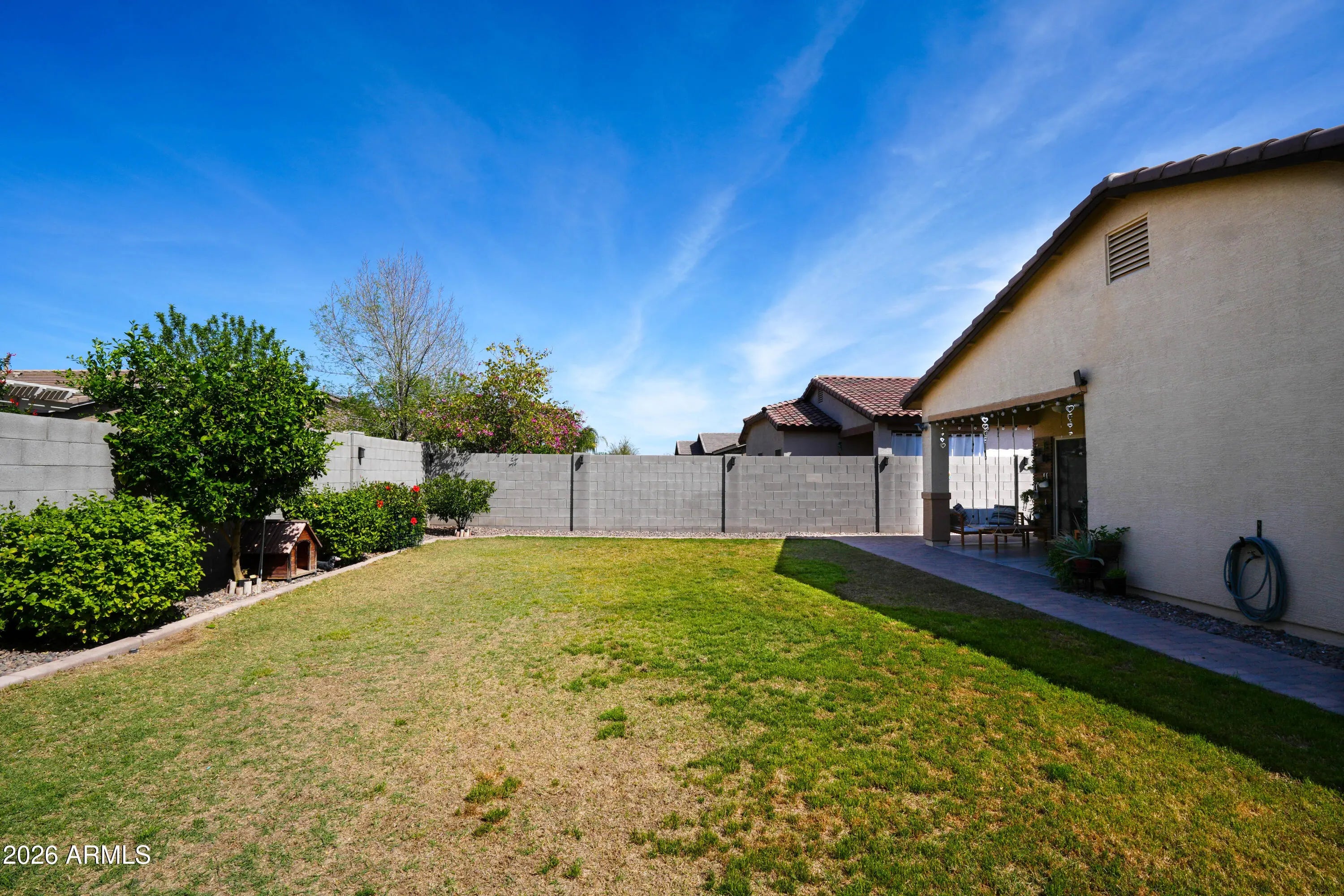 Move-in-ready home in Queen Creek! This 3-bedroom, 2-bath home features an enclosed den, perfect for a home office, flex room or additional living space. Great curb appeal with a paved driveway and low-maintenance turf front yard. Inside you'll find no carpet anywhere, along with wainscoting accents, plantation shutters, granite countertops, large kitchen island, and ceiling fans throughout. The home also includes a reverse osmosis system and water softener. Step outside to an aesthetically pleasing backyard oasis, featuring paver walkways, real grass, and three fruitful citrus trees, ideal for hosting in a peaceful ambience. Conveniently located just minutes from the Queen Creek Recreation & Aquatic Center and the Queen Creek Marketplace for shopping, dining, and entertainment.