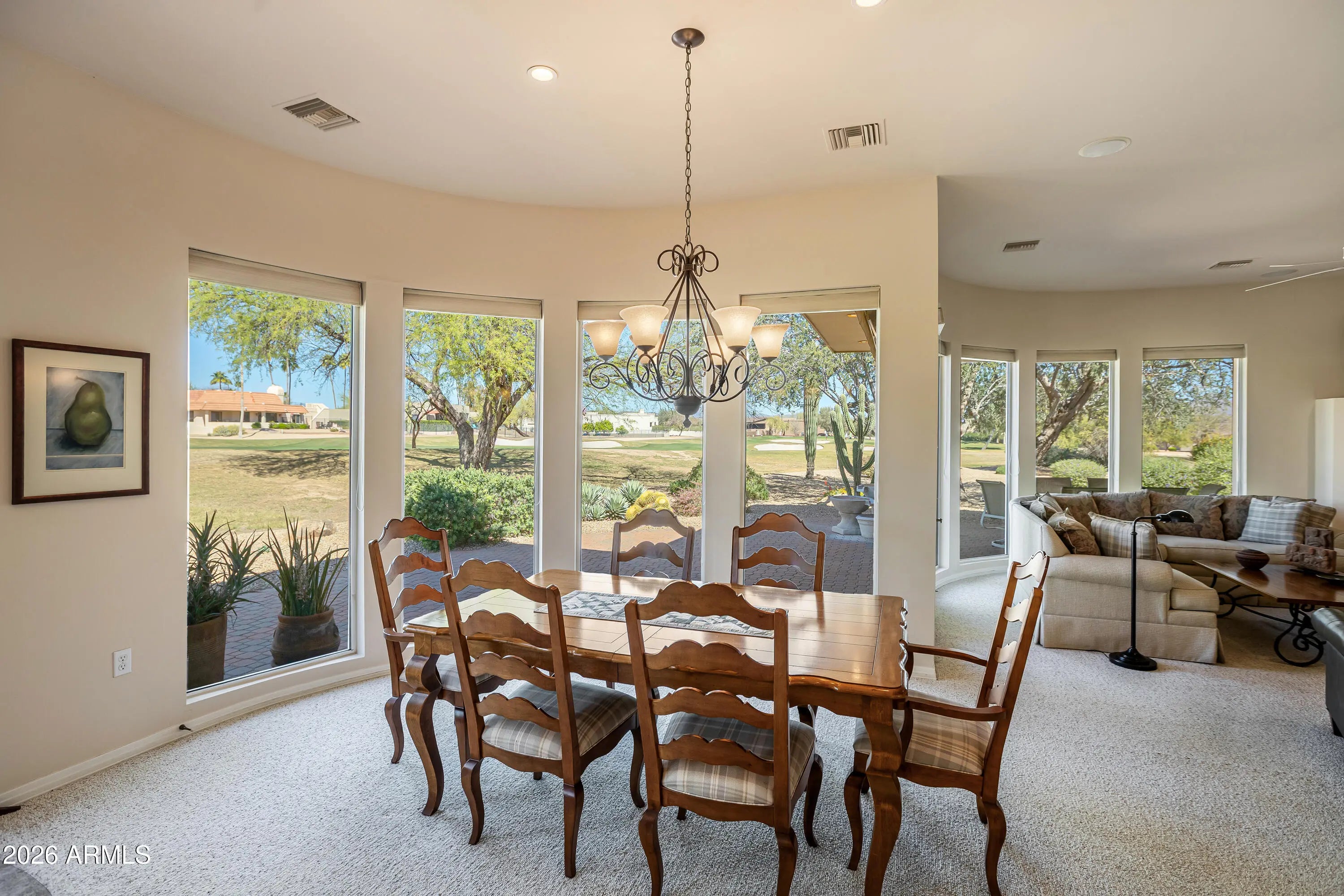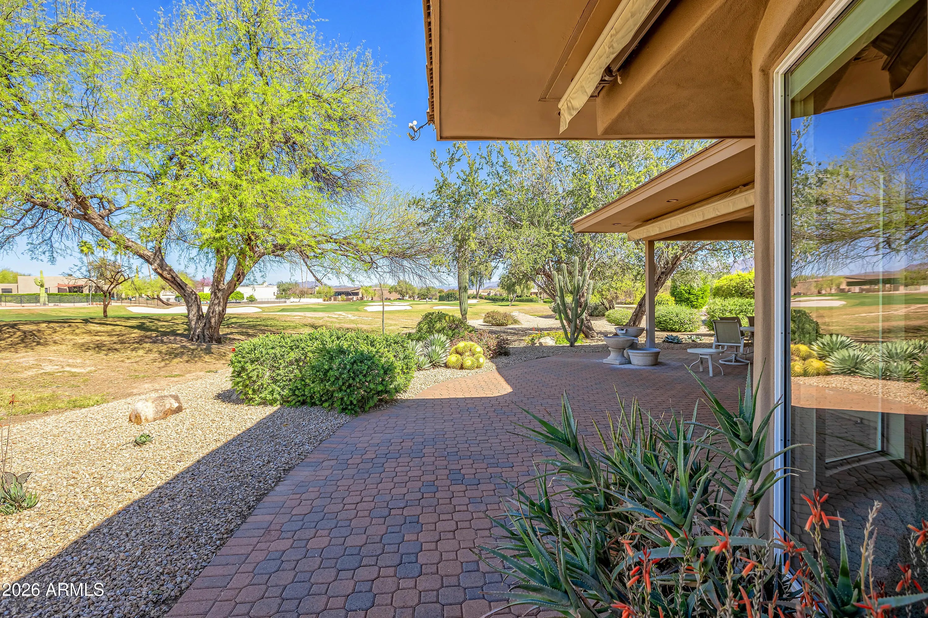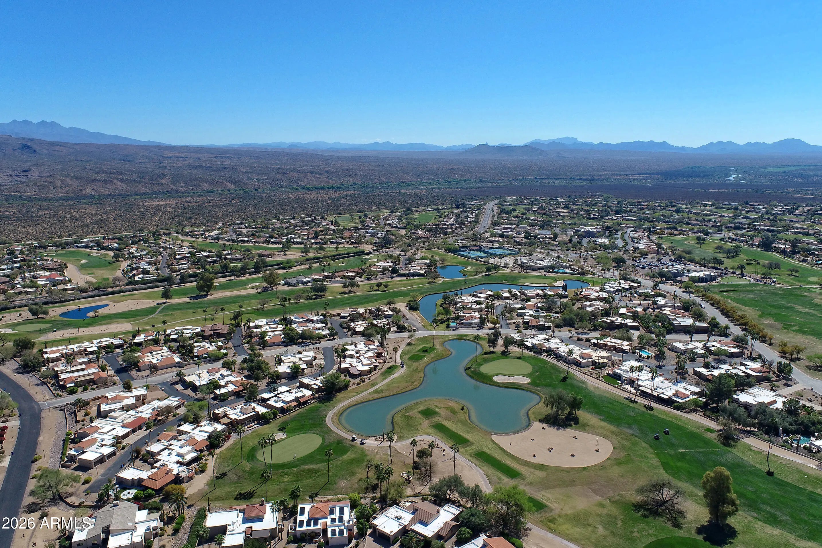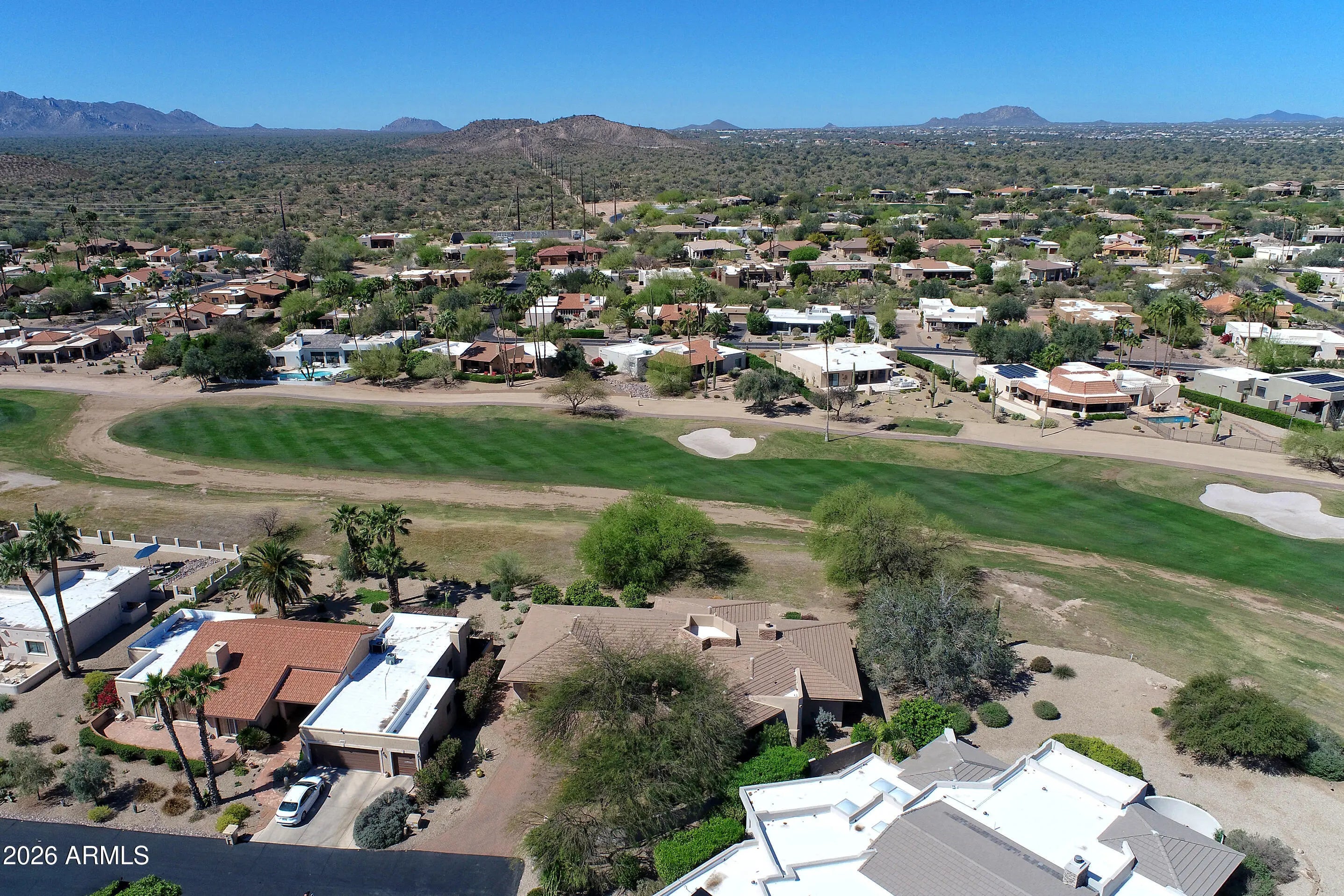 Turn-key fully furnished golf course custom home in Rio Verde, perfectly positioned on a private cul-de-sac lot overlooking one of the community's premier courses with sweeping fairway views and stunning vistas of the Four Peaks. Floor-to-ceiling windows capture the breathtaking panoramic scenery. This spacious single-level home features 2 bedrooms with en-suite baths, a den/office, and 2 baths. The kitchen offers granite counters, a built-in oven, and stainless steel appliances, opening to a bright great room with a built-in entertainment center and fireplace. Relax on the covered patio with custom retractable shades for seamless indoor-outdoor living. A 2.5-car extended garage plus golf cart garage with epoxy floors and storage adds convenience. Residents enjoy golf, clubhouse activities
