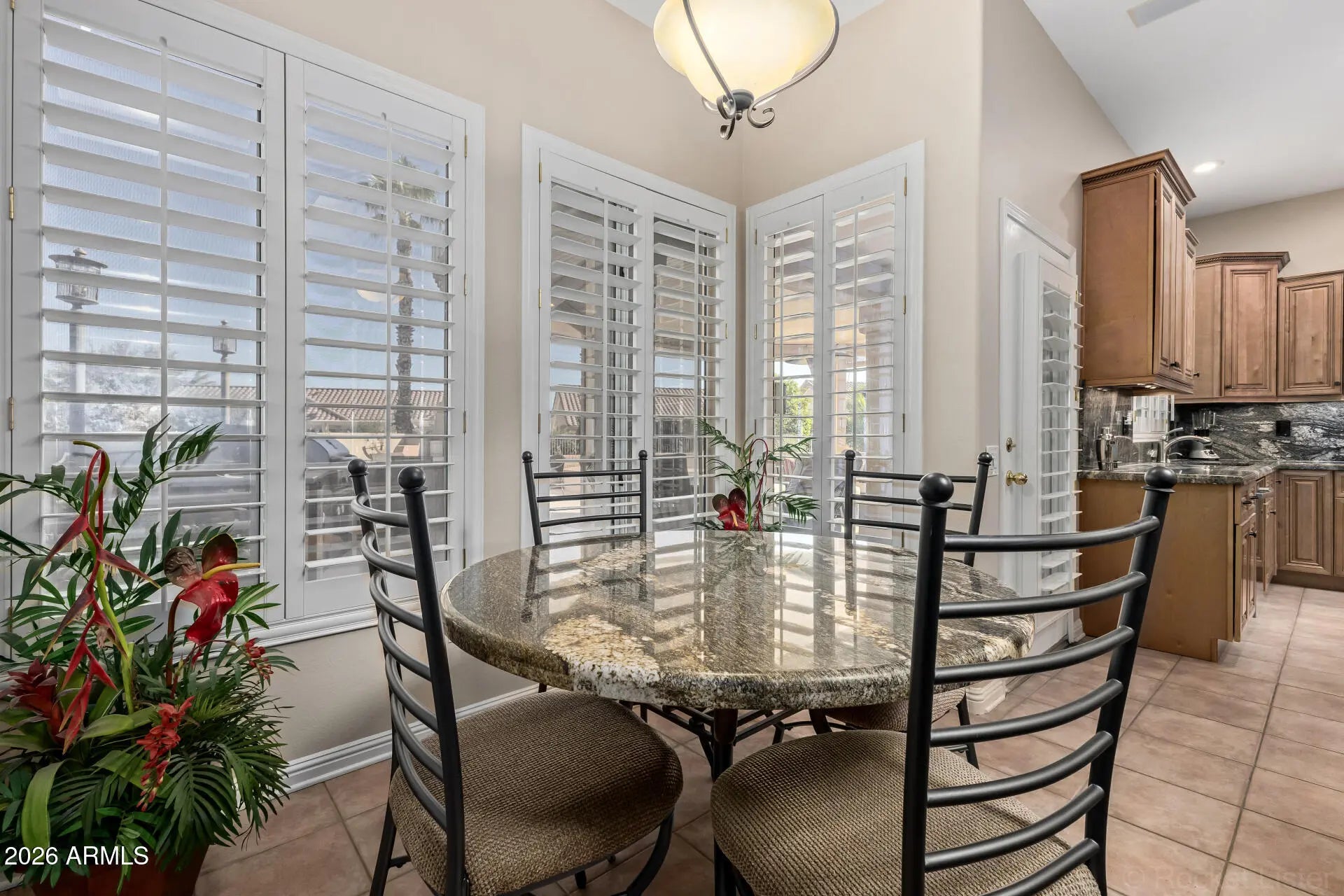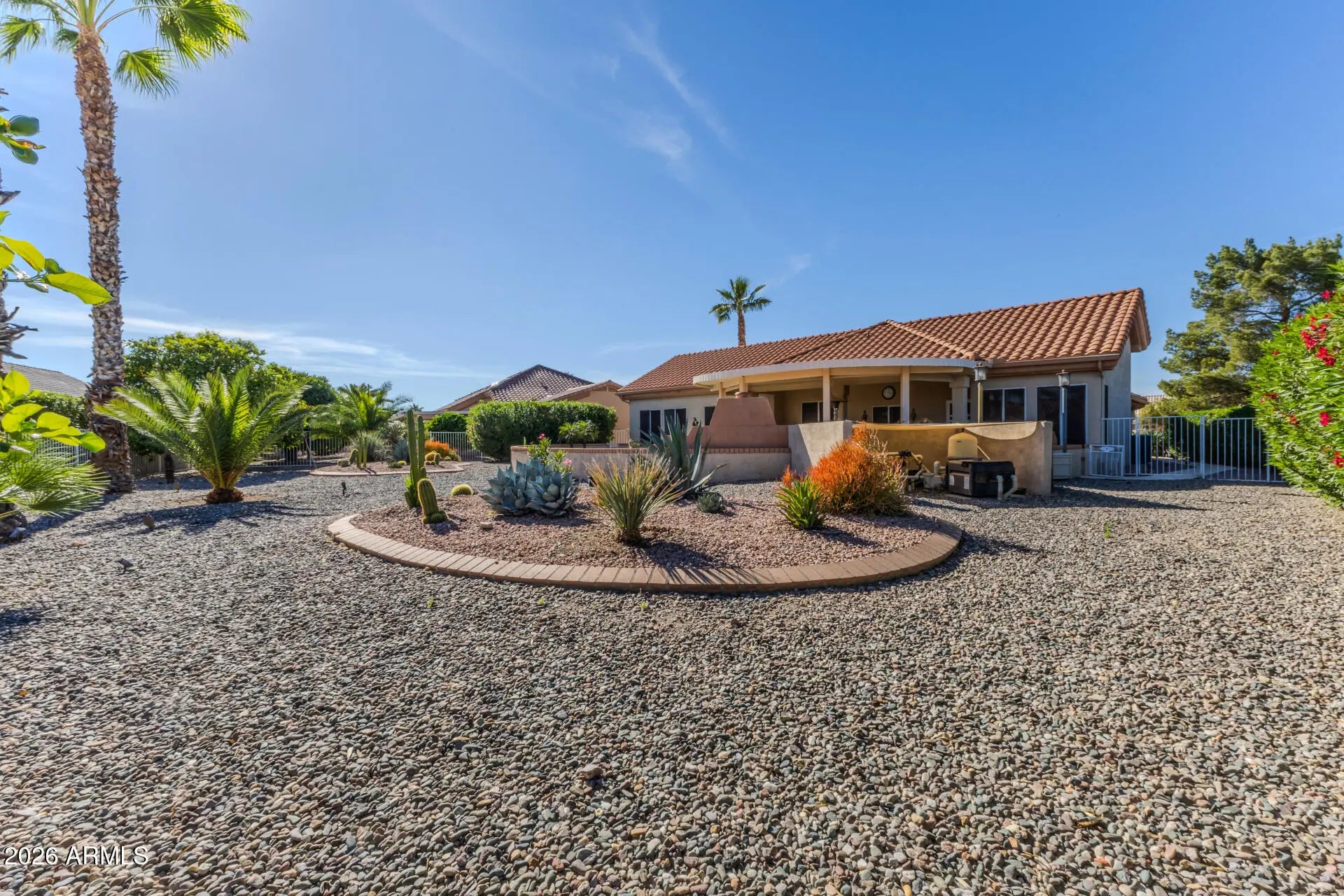 LOVELY VENTANA MODEL ON AN EXTRA LARGE LOT WITH A HEATED POOL & SPA, EXTENSIVE COVERED PATIO WITH A GAS OUTDOOR FIRPLACE AND MANY UPGRADES. An attractive curb appeal greets you as you enter inside to this elegant home with tile & plantation shutters throughout. Traditional floorplan with a Great Room & a formal Living Room/Dining Room. The Kitchen features upgraded upscale cabinetry with under-cabinet lighting, crown moldings & imported granite counters. PRIMARY BEDROOM & BEDROOM #2 BOTH HAVE REMODELED BATHROOMS. NEWER HVAC SYSTEM & WATER SOFTENER. The huge yard is an entertainer's paradise THAT BACKS SE with an extended covered patio, huge built-in BBQ island that wraps around to the gas Kiva fireplace and a HEATED POOL & SPA. There is gorgeous mature landscaping including a tangelo tree.