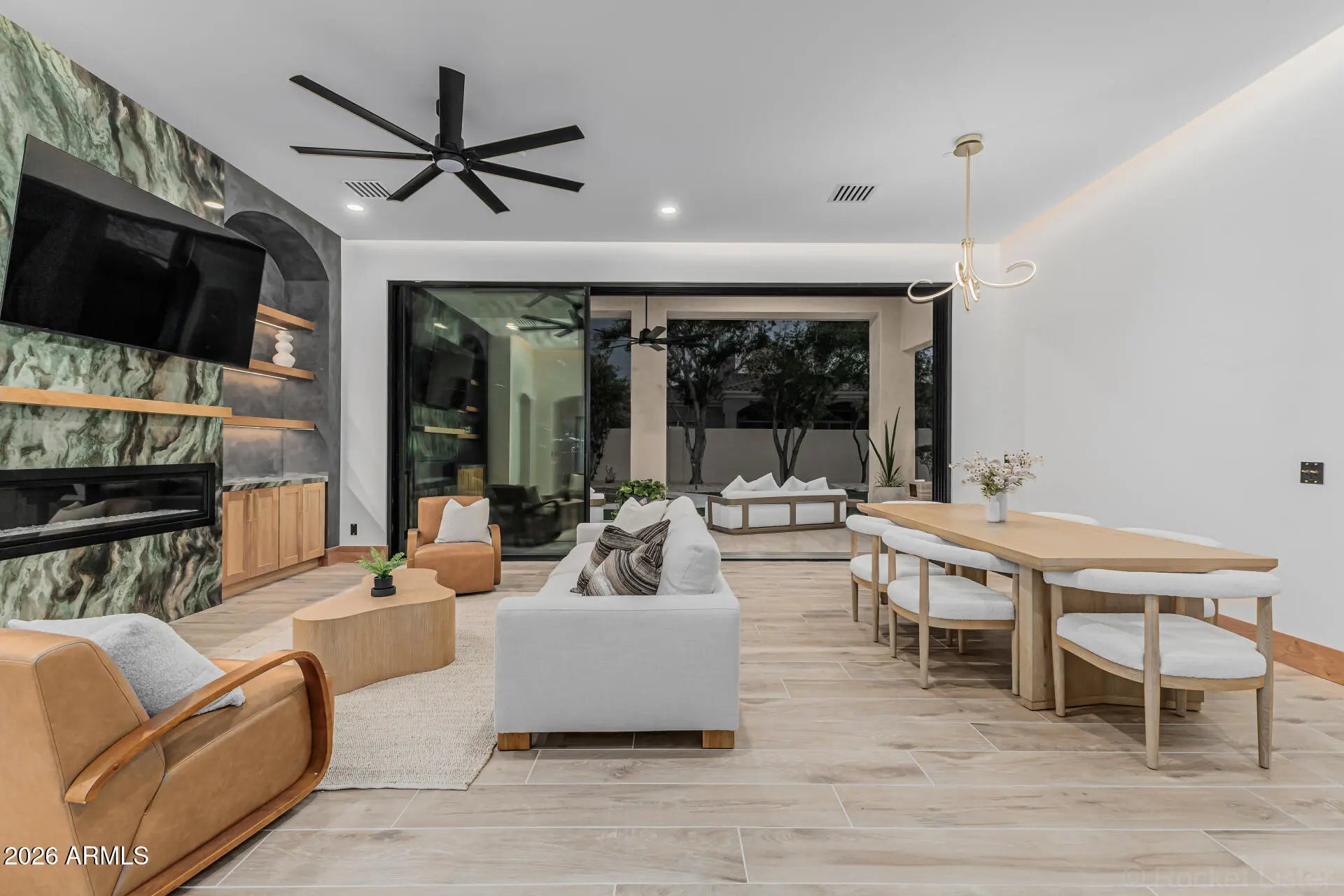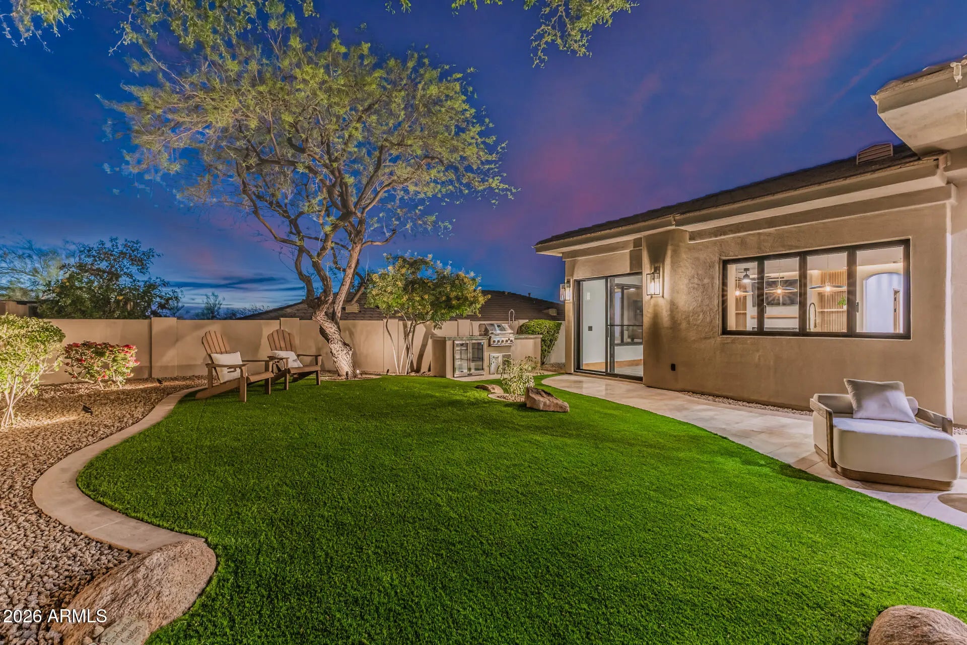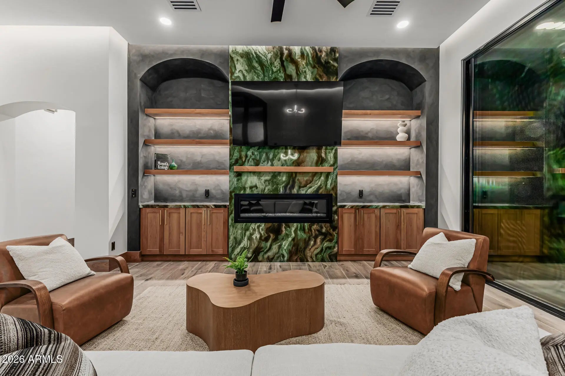 Introducing a true showpiece by Dardini Designs in the prestigious, guard-gated community of Cimarron Hills in McDowell Mountain Ranch, this extraordinary luxury remodel is a one-of-a-kind masterpiece. Every inch of the home has been thoughtfully transformed with elevated design and rare materials sourced from around the world. Over $100,000 in precious stone slabs sourced from around the world anchors the home's breathtaking aesthetic, highlighted by three dramatic floor to ceiling fireplaces that serve as stunning focal points throughout the property. Rich Alder doors and trim imported from New Zealand add warmth and sophistication to every space, while the backlit drop ceilings & custom switch glass front door set the tone for the remarkable craftsmanship within. Upon entry, the grand living room immediately captivates with a striking Green Quartzite fireplace sourced from Brazil, soaring ceilings, and a 22 foot triple panel sliding glass wall that seamlessly connects the indoor living space to the backyard. A 160 bottle temperature controlled wine display with custom iron doors adds both function and elegance. The designer kitchen is equally impressive, featuring Cristallo backlit waterfall island countertops and a Green Canyon backsplash, both sourced from Brazil. A Sub Zero refrigerator and a bi-fold serving window create the perfect environment for entertaining while enjoying the Arizona desert breeze. The primary suite continues the home's statement design with a floor to ceiling Magblanc fireplace from Brazil. The spa inspired primary bath is a true work of art featuring mosaic tile flooring, striking Panda slabs from China, a switch glass privacy window by the soaking tub, and a stunning 360 degree glass wardrobe closet that delivers a boutique luxury experience. Step outside to a beautifully redesigned backyard retreat featuring a heated pool and spa, brand new turf, and a custom outdoor kitchen with Green Canyon countertops that perfectly tie the exterior entertaining space to the home's signature stone design. This remarkable residence is more than a home. It is a statement piece and a rare opportunity to own what may be the most stunning property in all of McDowell Mountain Ranch. Welcome to The Emerald!