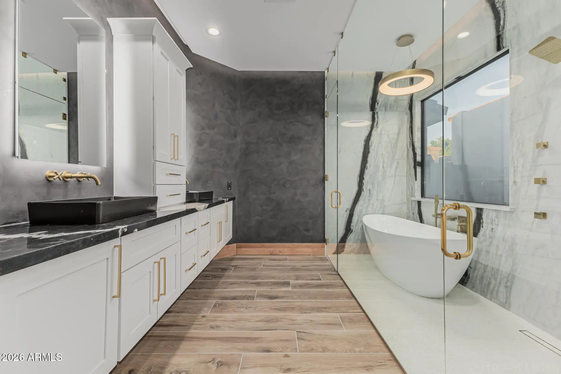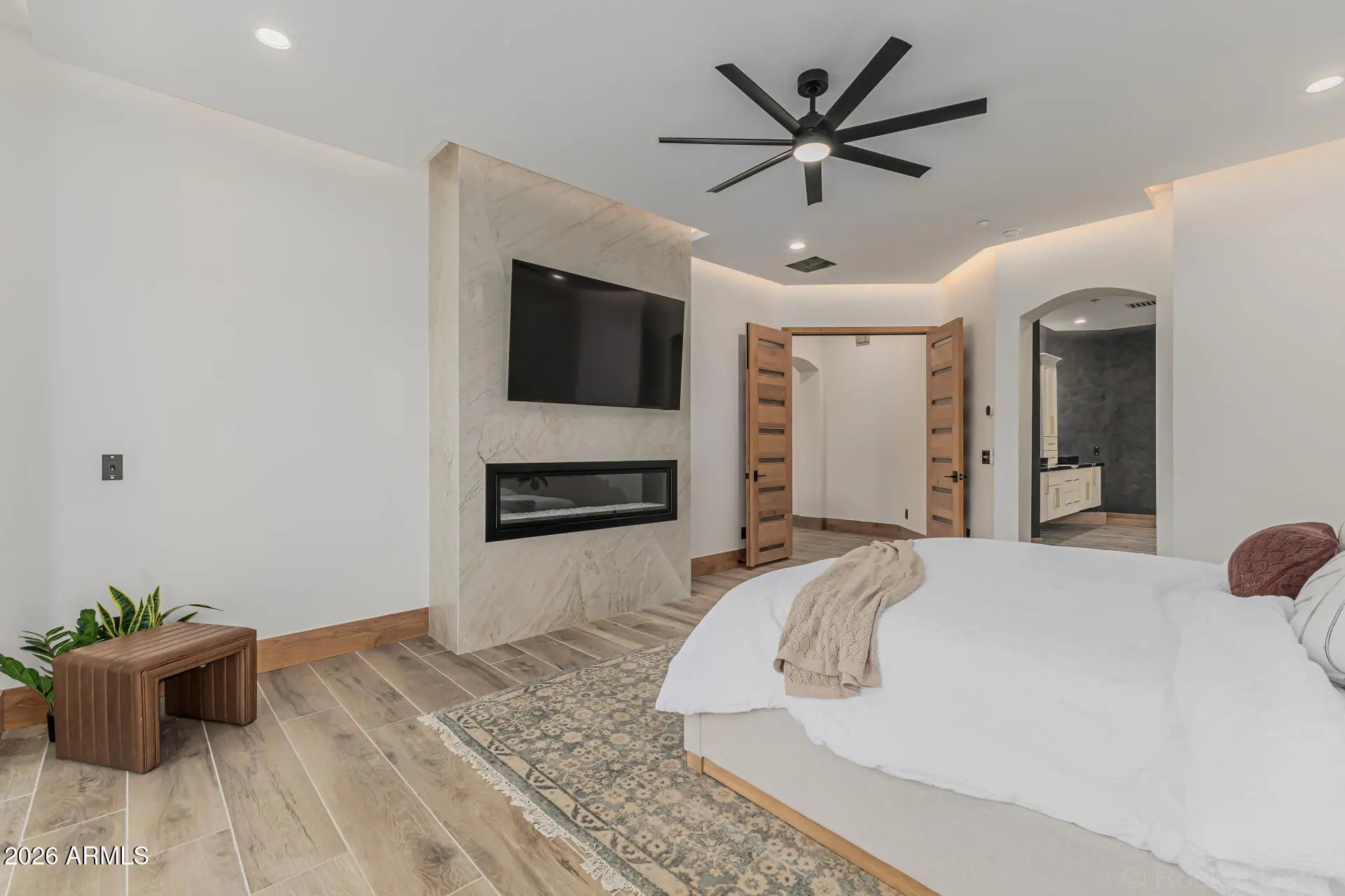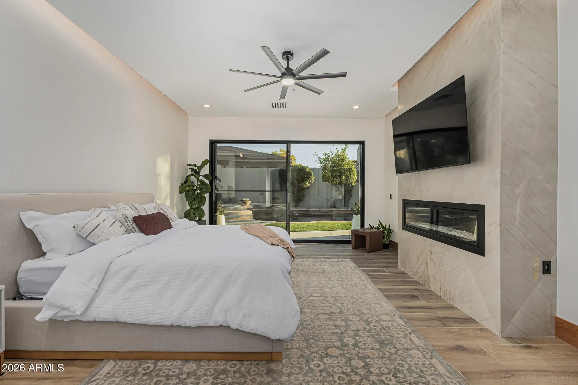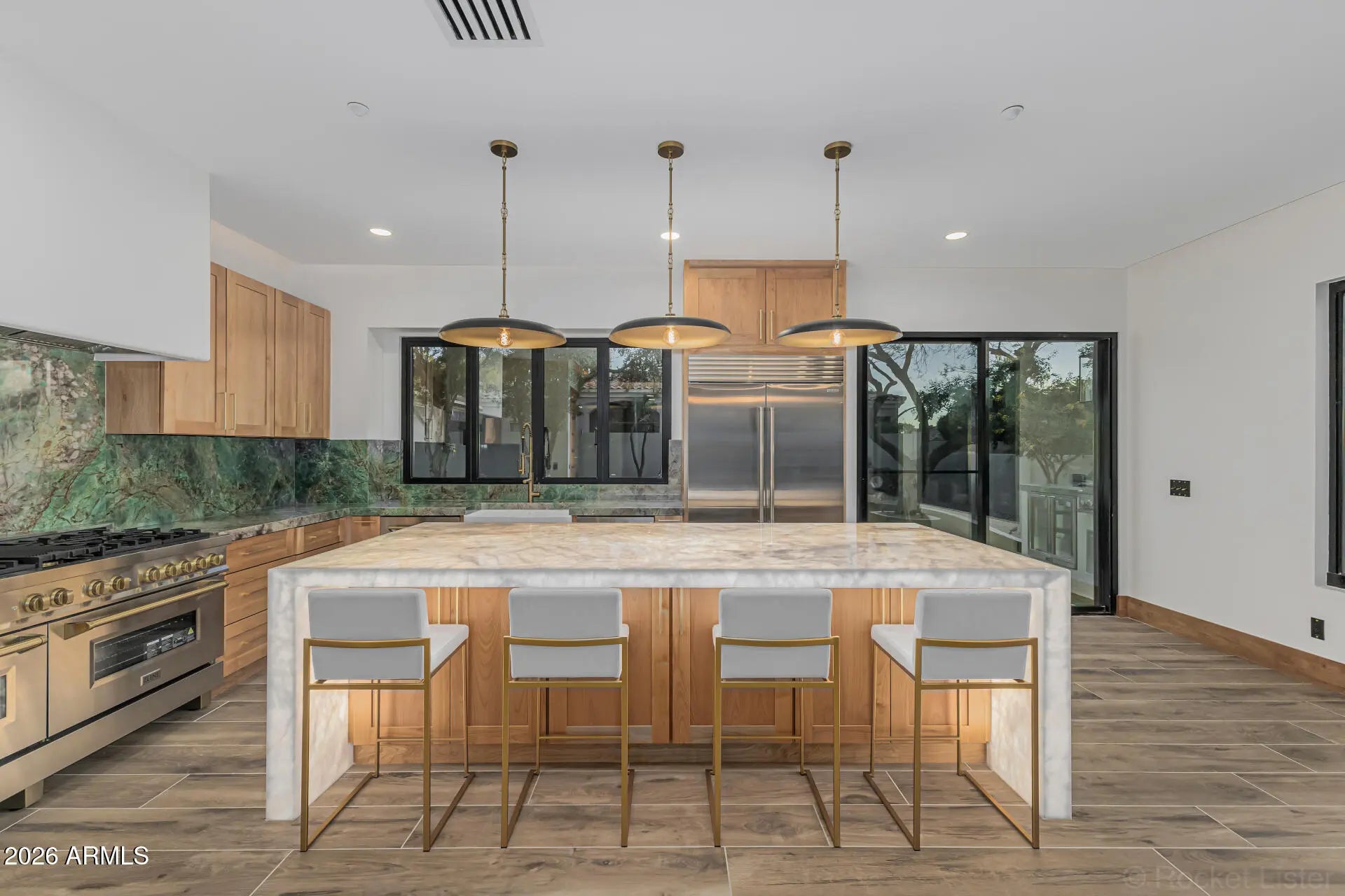 Introducing a true showpiece by Dardini Designs in the prestigious, guard-gated community of Cimarron Hills in McDowell Mountain Ranch, this extraordinary luxury remodel is a one-of-a-kind masterpiece. Every inch of the home has been thoughtfully transformed with elevated design and rare materials sourced from around the world. Over $100,000 in precious stone slabs sourced from around the world anchors the home's breathtaking aesthetic, highlighted by three dramatic floor to ceiling fireplaces that serve as stunning focal points throughout the property. Rich Alder doors and trim imported from New Zealand add warmth and sophistication to every space, while the backlit drop ceilings & custom switch glass front door set the tone for the remarkable craftsmanship within. Upon entry, the grand living room immediately captivates with a striking Green Quartzite fireplace sourced from Brazil, soaring ceilings, and a 22 foot triple panel sliding glass wall that seamlessly connects the indoor living space to the backyard. A 160 bottle temperature controlled wine display with custom iron doors adds both function and elegance. The designer kitchen is equally impressive, featuring Cristallo backlit waterfall island countertops and a Green Canyon backsplash, both sourced from Brazil. A Sub Zero refrigerator and a bi-fold serving window create the perfect environment for entertaining while enjoying the Arizona desert breeze. The primary suite continues the home's statement design with a floor to ceiling Magblanc fireplace from Brazil. The spa inspired primary bath is a true work of art featuring mosaic tile flooring, striking Panda slabs from China, a switch glass privacy window by the soaking tub, and a stunning 360 degree glass wardrobe closet that delivers a boutique luxury experience. Step outside to a beautifully redesigned backyard retreat featuring a heated pool and spa, brand new turf, and a custom outdoor kitchen with Green Canyon countertops that perfectly tie the exterior entertaining space to the home's signature stone design. This remarkable residence is more than a home. It is a statement piece and a rare opportunity to own what may be the most stunning property in all of McDowell Mountain Ranch. Welcome to The Emerald!