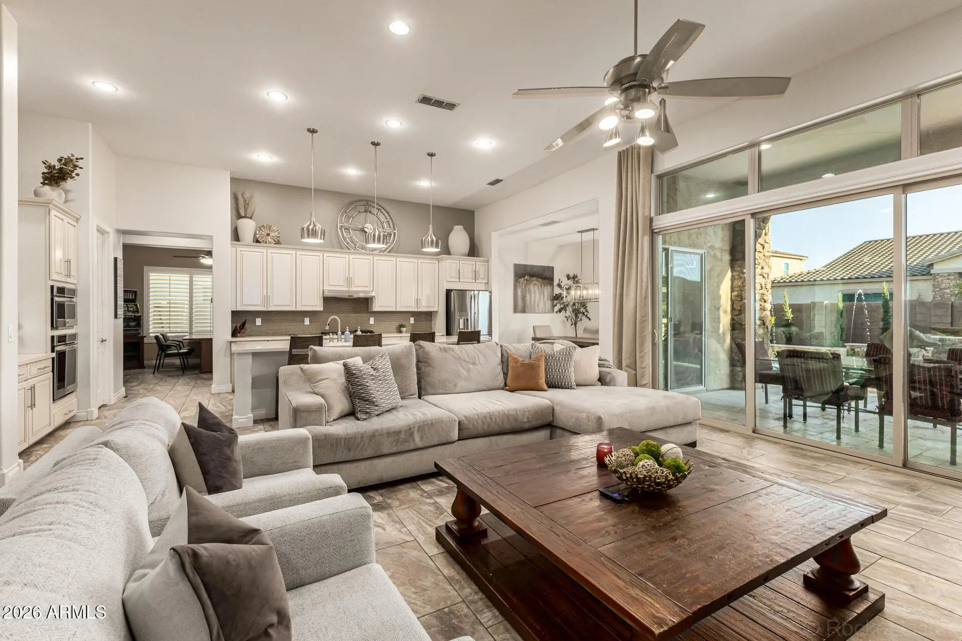Another Bridges at Gilbert gem--this time in the highly sought-after Bridges North section! This stunning Meritage Homes flagship single-level floorplan, The Redwood, offers a thoughtfully designed split layout paired with modern finishes and stylish designer touches throughout. The chef's kitchen is the heart of the home, featuring gas cooking, stainless steel appliances, abundant staggered cabinetry, and a massive oversized island, all opening seamlessly to the spacious great room--perfect for entertaining and everyday living. 8-foot panoramic sliding doors extend the living space outdoors, creating a true indoor-outdoor Arizona lifestyle. Step into the resort-style backyard where every detail has been carefully designed. Enjoy a huge custom ramada complete with an oversized built- BBQ, refrigerator, sink, and ample storage. Stay cool on warm Arizona days with the commercial-grade mister system while relaxing poolside. The expansive yard also features one of the largest pools you can fit on this lot, highlighted by three sheer-descent waterfalls, deck jets, and custom in-pool lighting--an entertainer's dream. Additional upgrades include fresh interior paint and refreshed front and back landscaping, making this home completely move-in ready. The 3-car split garage offers flexibility and functionality, with a pass-through design and the single-car bay featuring a beautiful infrared sauna--a rare and luxurious bonus. A true standout in one of Gilbert's most desirable communities, this home combines thoughtful design, high-end amenities, and an incredible backyard retreat.