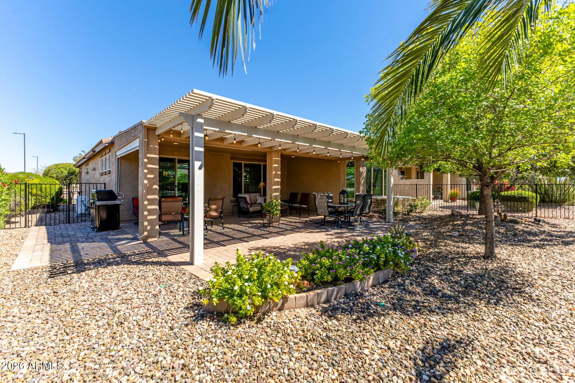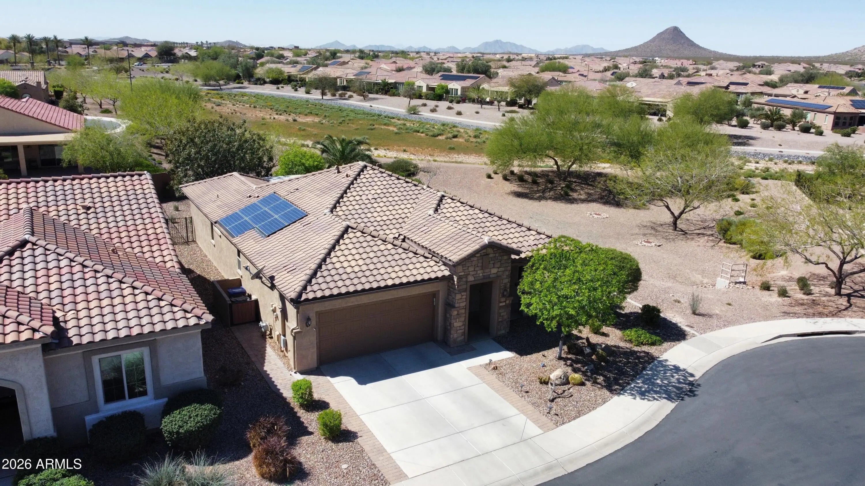 SPECTACULAR ARIZONA WASH VIEWS! This delightful Hideaway w/ Tuscan elevation invites you to relax & unwind while capturing the beauty of the Sonoran Desert from the charming & inviting extended paver back patio w/ Pergola. Inside, the kitchen features granite counters, staggered cabinetry, pendant lighting & a spacious walk-in pantry, making it both stylish and functional. The open living room showcases a built-in entertainment wall, creating a perfect space for relaxing or entertaining. The primary suite offers a beautiful bay window, along w/ Granitex double vanity, walk-in shower & walk-in closet. The extended laundry room adds extra convenience with upper & lower cabinetry for additional storage. + Extended garage, equipped w/ epoxy, built-in cabinets + solar panels (PREPAID LEASE)!! Sun City Anthem at Merrill Ranch offers a 48,000 SF recreation center w/ craft rooms for quilting, pottery, glass works, jewelry & crafts, spacious ballroom w/ stage for dancing, theatrical productions, concerts & more. PLUS full gym, work out rooms, indoor lap pool & spa, walking track, cafe area, card rooms, poker tables, pool table, ping pong table, business center, class room for interesting seminars! Troon Poston Butte Golf Course is one of the nicest in the area. Sun City offers Pickleball, Tennis, Bocce Ball, Horseshoes, Shuffleboard, clubs for all activities.......LIVE WHERE THE SURROUNDINGS DELIGHT, INSPIRE & CHALLENGE YOU!
