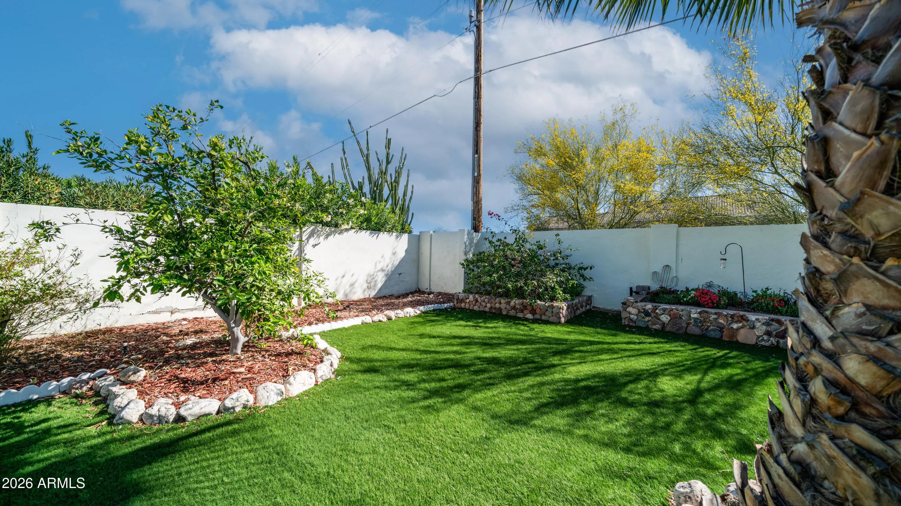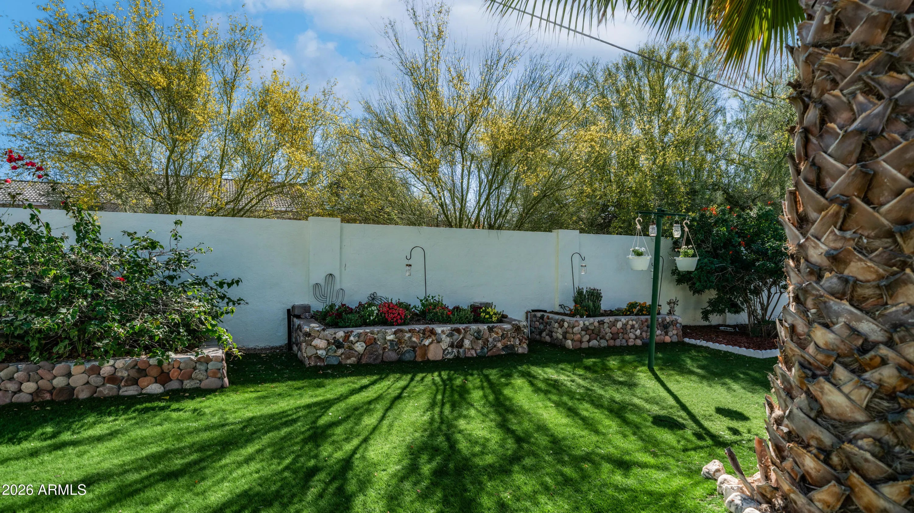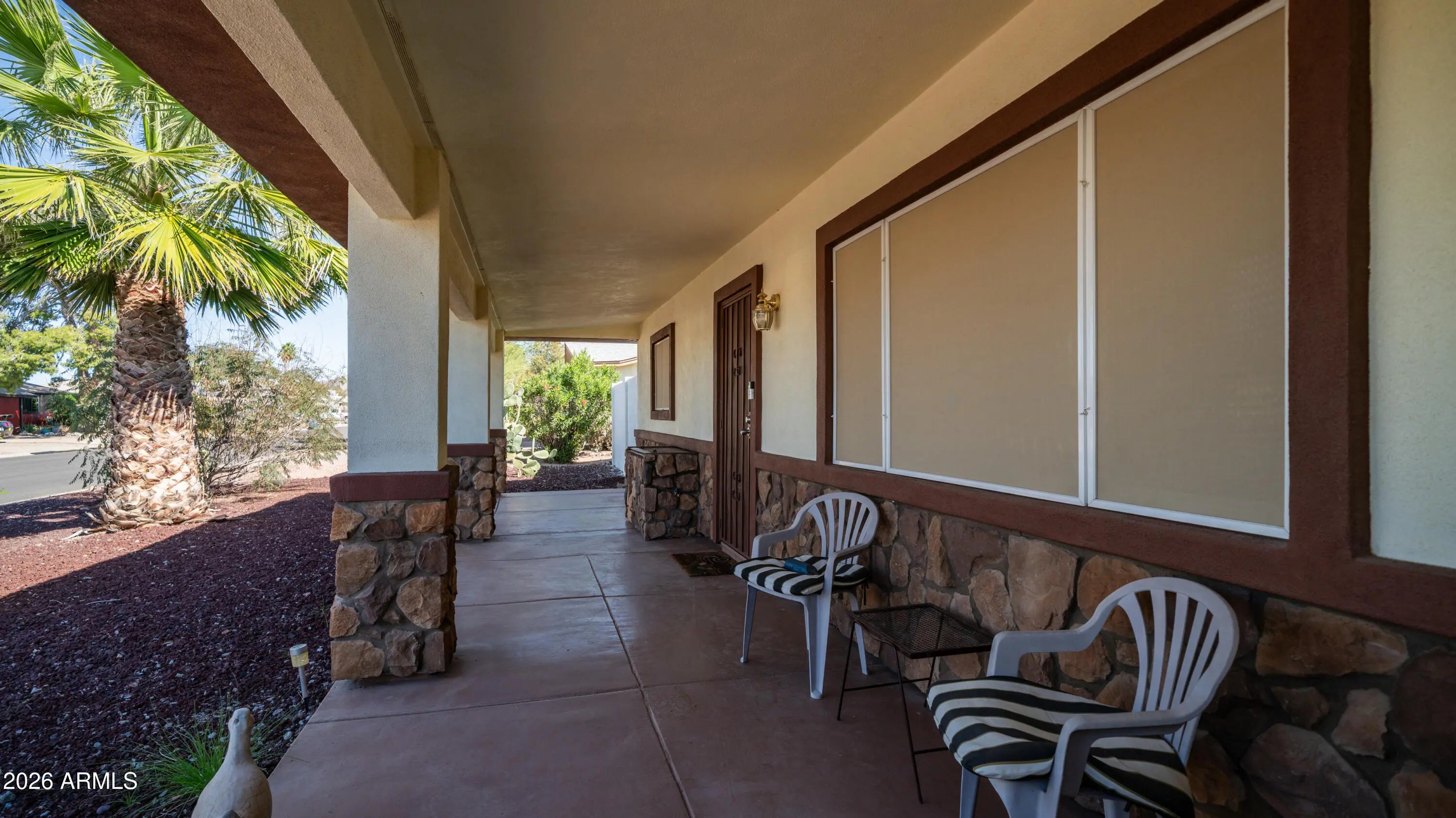 Welcome to a home that truly has it all. With no HOA and located only about fifteen minutes from the airport, this property offers both convenience and freedom. From the moment you arrive you will notice the diligently maintained front yard that provides wonderful curb appeal and sets the tone for the care this home has received. Car enthusiasts and hobbyists alike will appreciate the impressive three car tandem garage that offers ample space for parking, storage, and protection for your vehicles. Step inside to discover stylish tile flooring and a bright open concept living space designed for comfortable everyday living and easy entertaining. Energy efficiency is a standout feature thanks to added insulation in the attic, double paned windows, and a newer AC system with thermostats that can be conveniently controlled from your phone. The kitchen is both beautiful and functional with real wood cabinets, granite countertops, a modern backsplash, and stainless steel appliances that create an inviting space for cooking and gathering. The bathroom has been tastefully updated with granite countertops and a stunning walk in shower surrounded by elegant tile and finished with a luxurious glass door. Spacious bedrooms provide comfortable retreats with plenty of room to relax and unwind. The thoughtfully added Arizona room blends seamlessly with the rest of the home and offers flexible space that can be used for relaxing, entertaining guests, or even a home office. Just off the Arizona room and garage you will find a convenient second half bathroom also finished with granite, making it perfect for guests. This home also features an upgraded tankless water heater and two water filtration systems that add both comfort and peace of mind. Step outside to discover the true highlight of the property, a beautifully manicured backyard oasis designed for enjoying the Arizona lifestyle. The space features lush turf grass, a tall block wall for privacy, and a covered patio ideal for relaxing or entertaining. A variety of plants add charm and character, including a mulberry bush and citrus trees that enhance the tranquil setting. This backyard is truly a perfect place to relax and enjoy peaceful outdoor living. With NO HOA you have the freedom to park what you want & use your property the way you prefer, making this an excellent home for a full time residence, seasonal getaway, or investment opportunity that truly checks all the boxes.