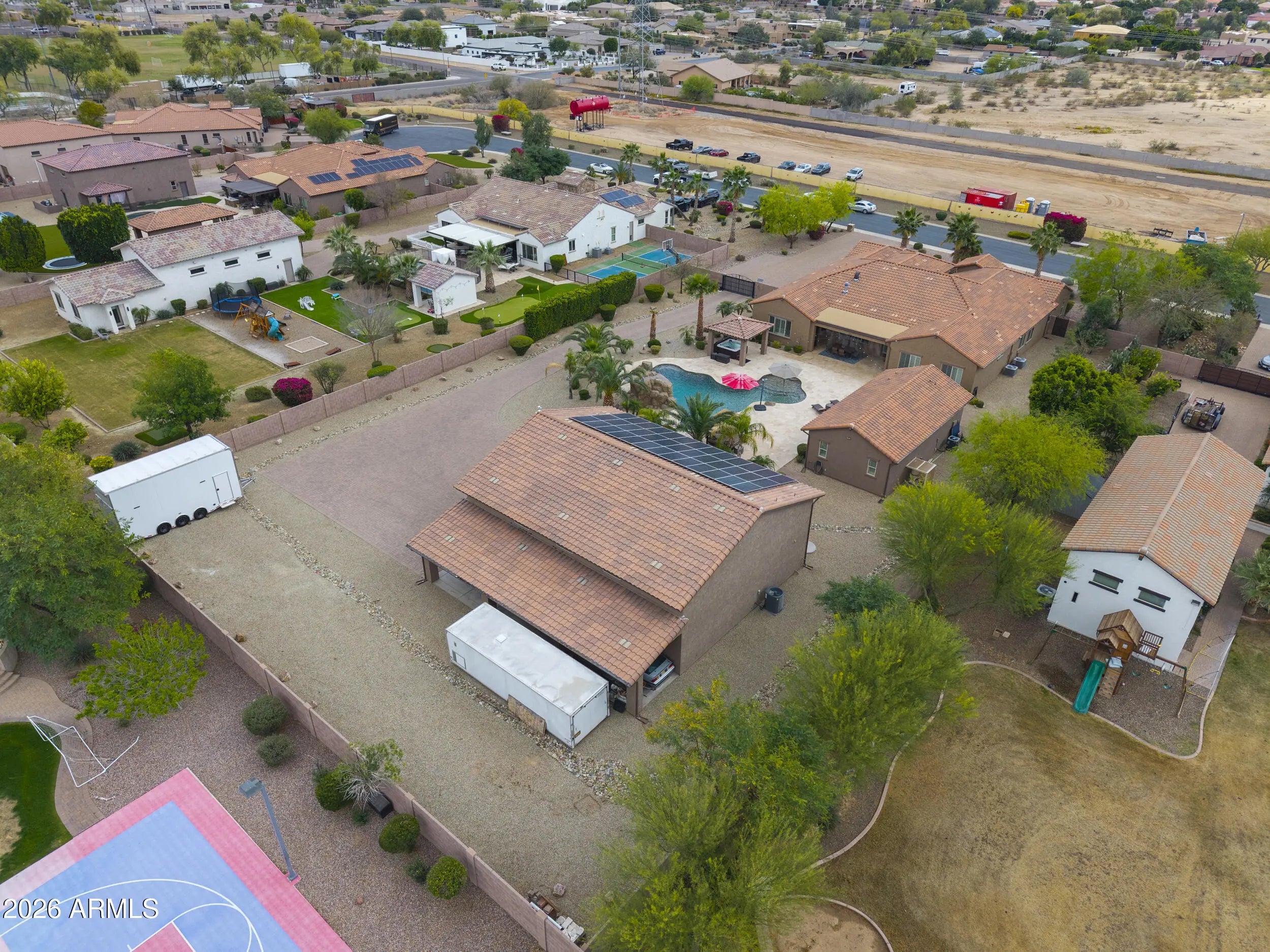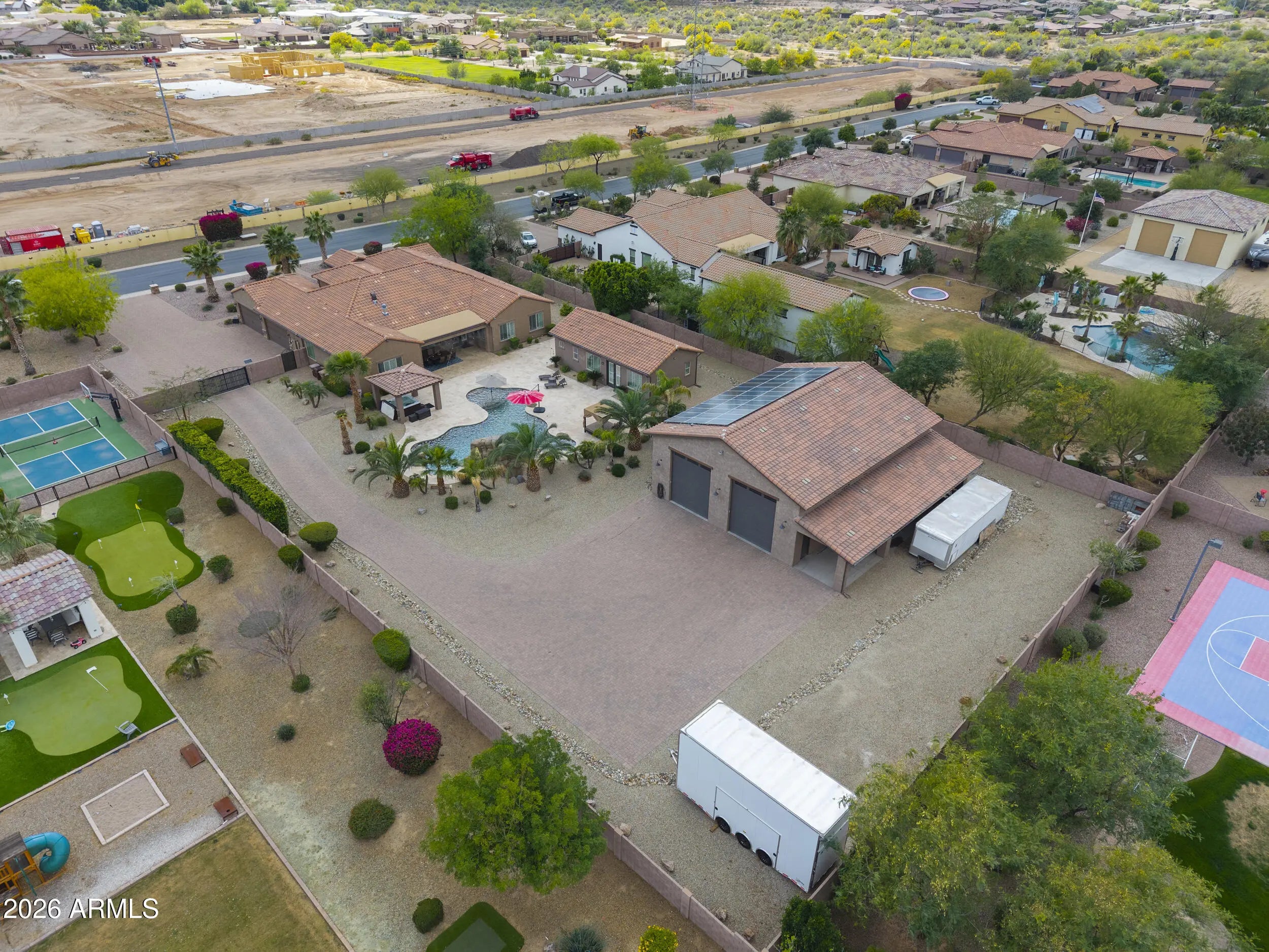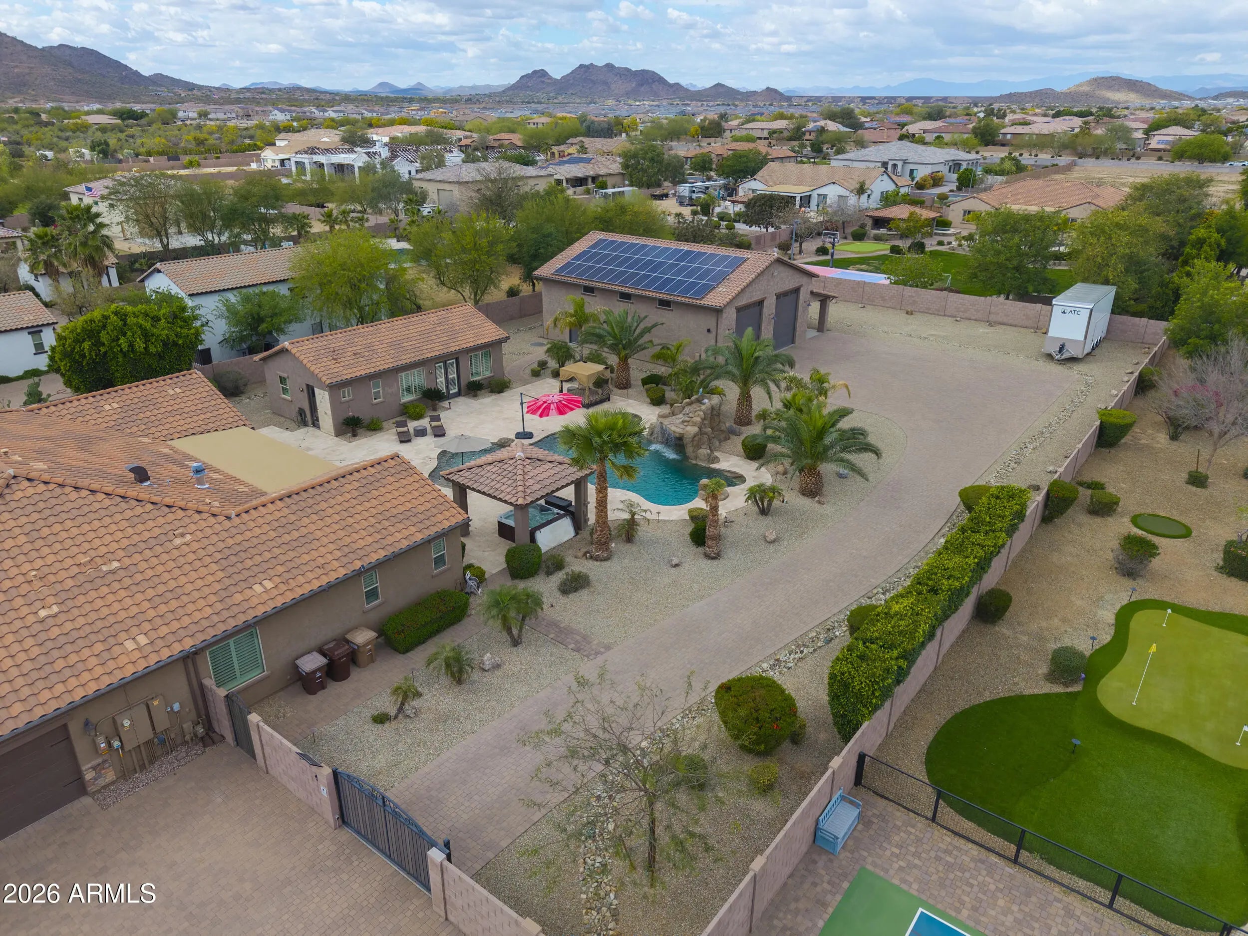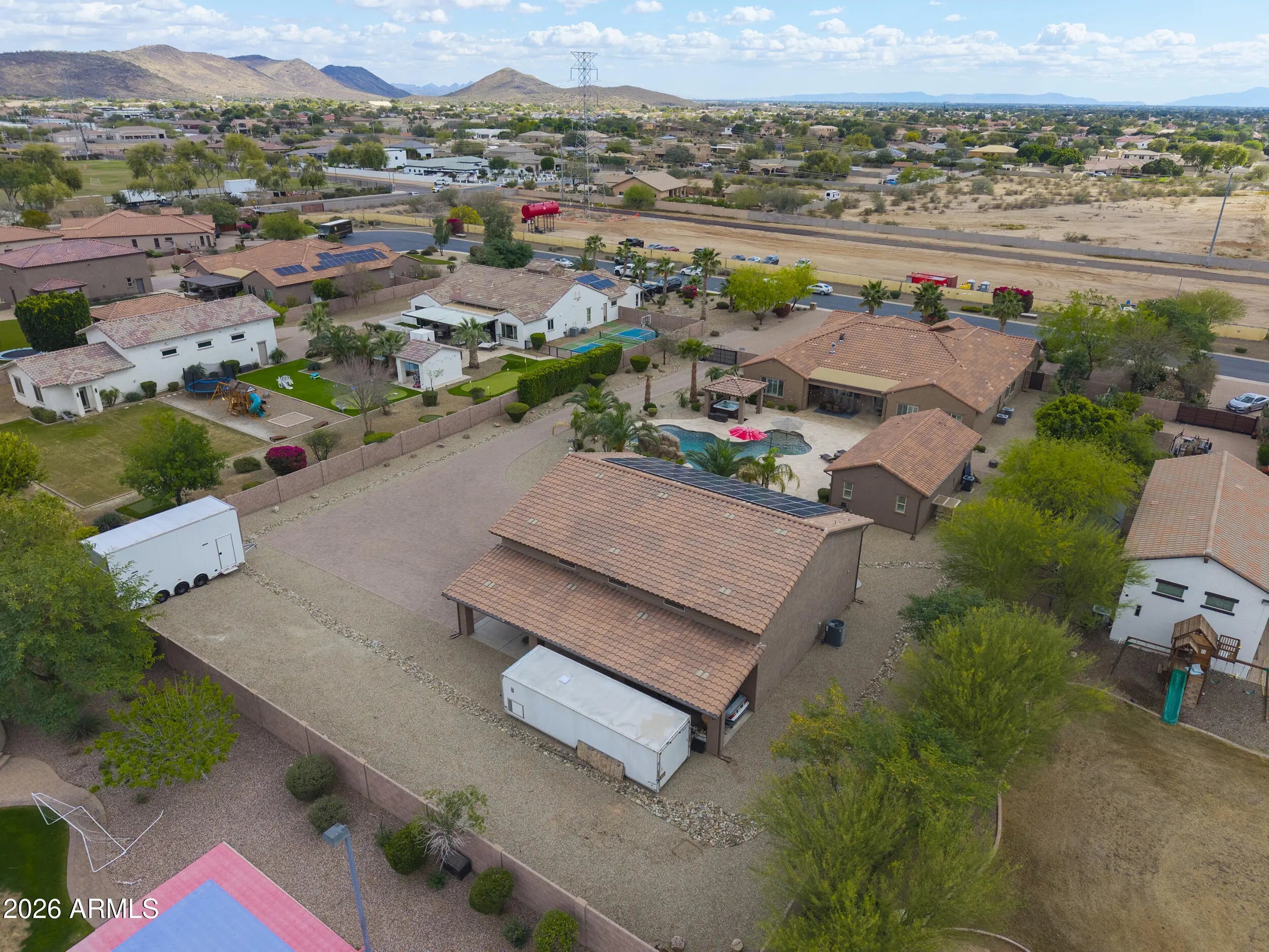 This home has it all! On over 1-acre in Highly desirable Estates At Happy Valley. This meticulously maintained home has space for all of your toys & entertaining needs. 3,796sqft Main House has an attached oversized 4-car garage, 5-Bedrooms, 4.5-Baths, Plus a Bonus/Game Room, Plus an Office/Den. Detached Casita is 800sqft, with it's own private bath. Massive 52' x 50' RV Garage has everything you can think of including it's own 1/2-bath, Wash Bay, epoxy flooring, 16'-ceilings, two 12'x14' Garage doors, RV dump station, 30A - 120v RV hookup, Hot & Cold water supply, Compressor Room w/copper plumbing to front & rear of shop, & even a floor drain to wash your cars inside! Additional features include inside gas fireplace, huge play pool w/grotto, Hot Tub, Massive 15-KW owned Solar & more!