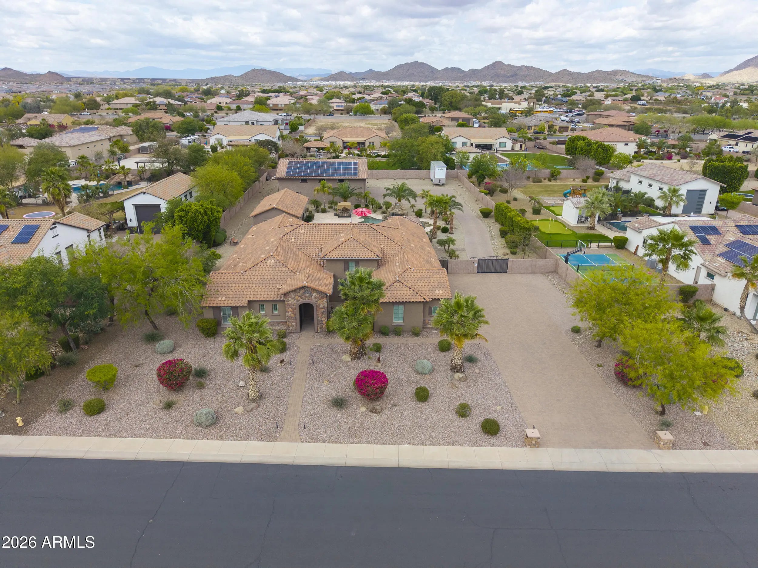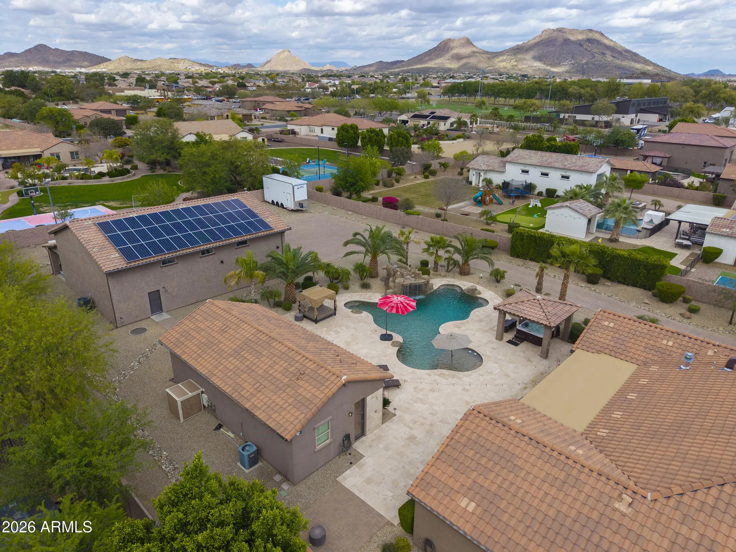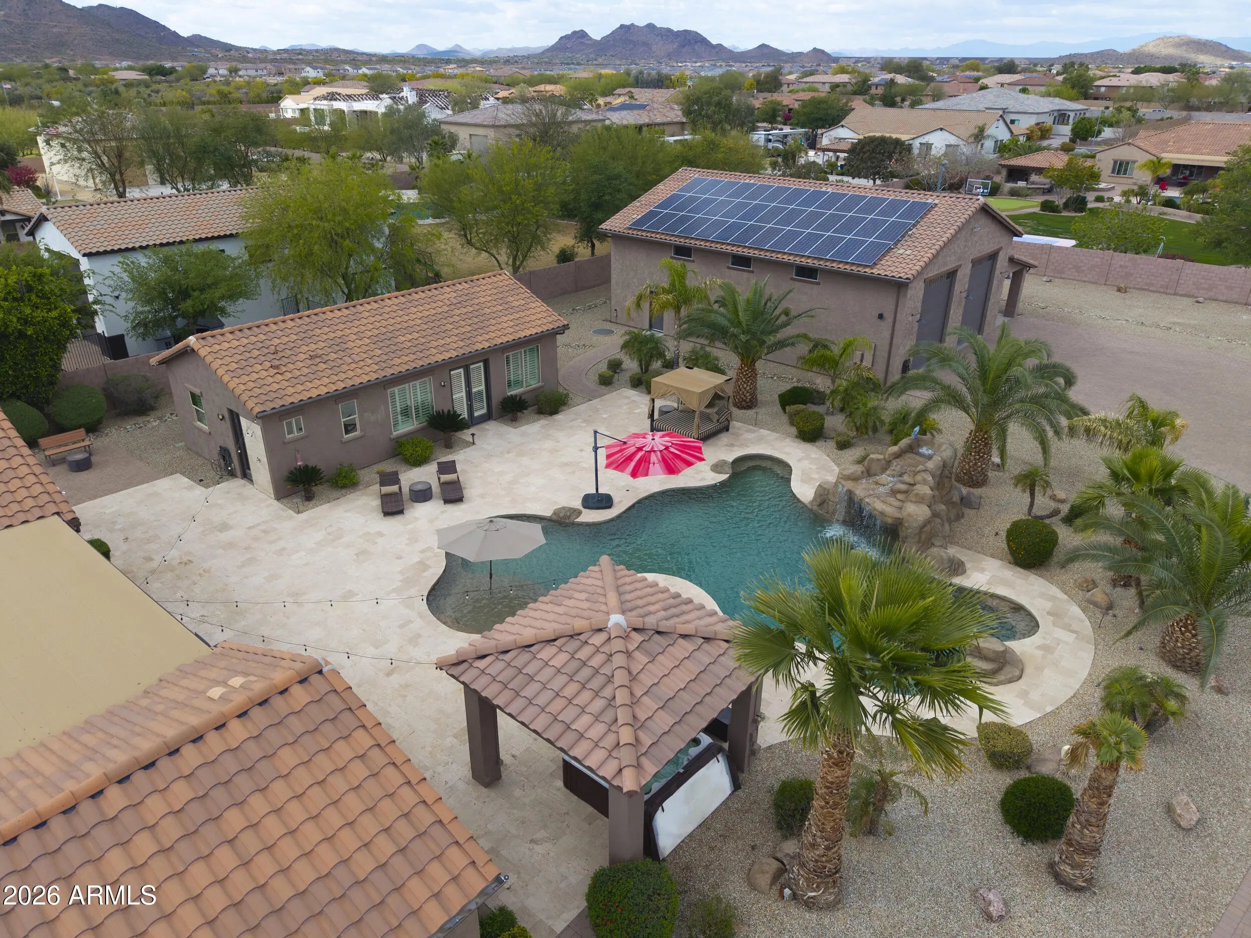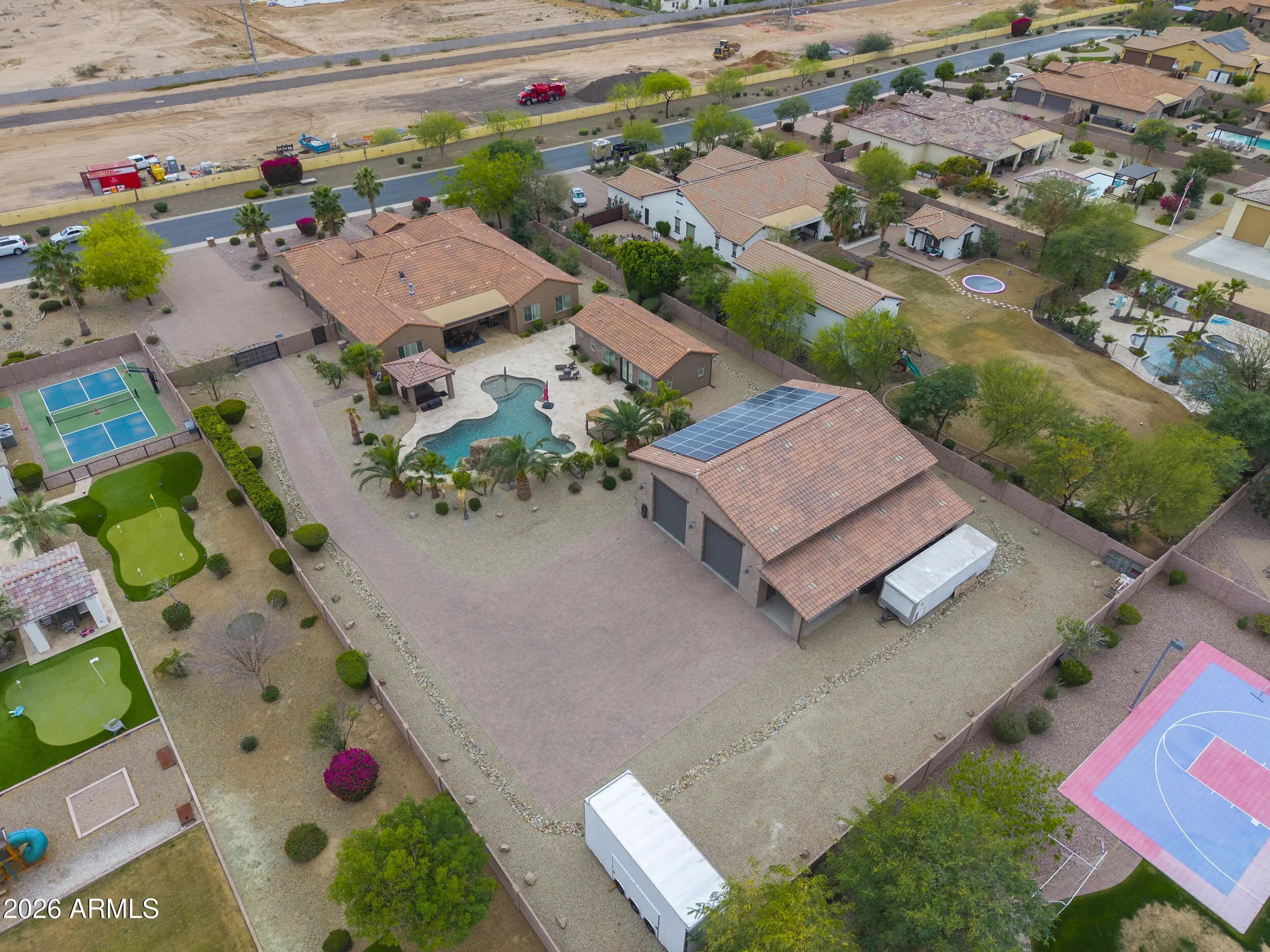 This home has it all! On over 1-acre in Highly desirable Estates At Happy Valley. This meticulously maintained home has space for all of your toys & entertaining needs. 3,796sqft Main House has an attached oversized 4-car garage, 5-Bedrooms, 4.5-Baths, Plus a Bonus/Game Room, Plus an Office/Den. Detached Casita is 800sqft, with it's own private bath. Massive 52' x 50' RV Garage has everything you can think of including it's own 1/2-bath, Wash Bay, epoxy flooring, 16'-ceilings, two 12'x14' Garage doors, RV dump station, 30A - 120v RV hookup, Hot & Cold water supply, Compressor Room w/copper plumbing to front & rear of shop, & even a floor drain to wash your cars inside! Additional features include inside gas fireplace, huge play pool w/grotto, Hot Tub, Massive 15-KW owned Solar & more!