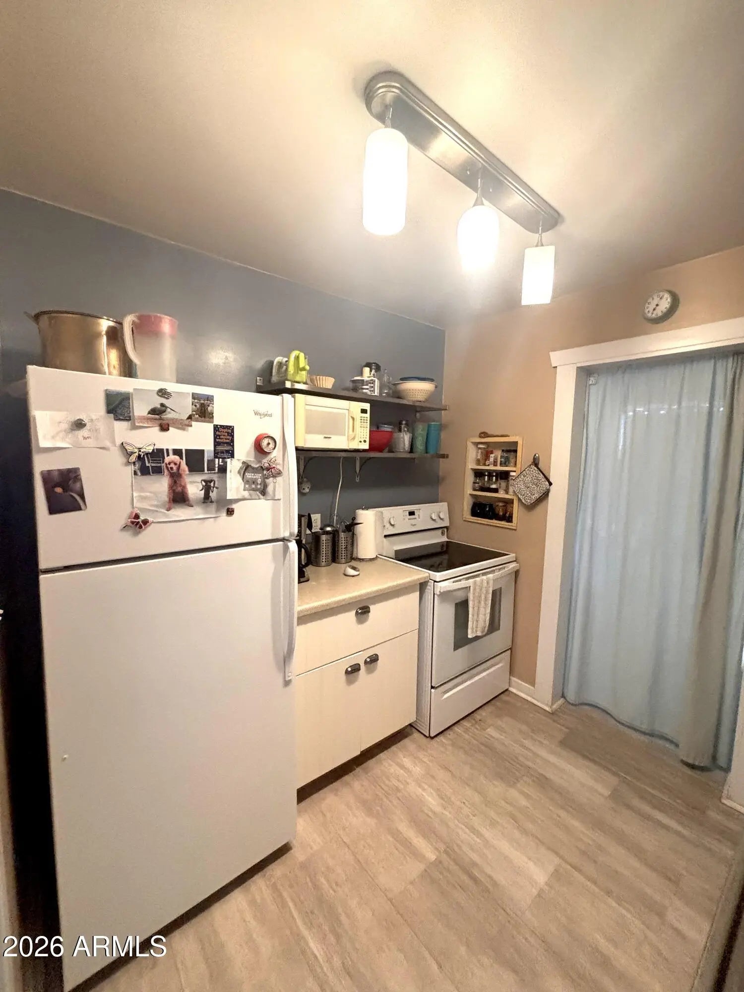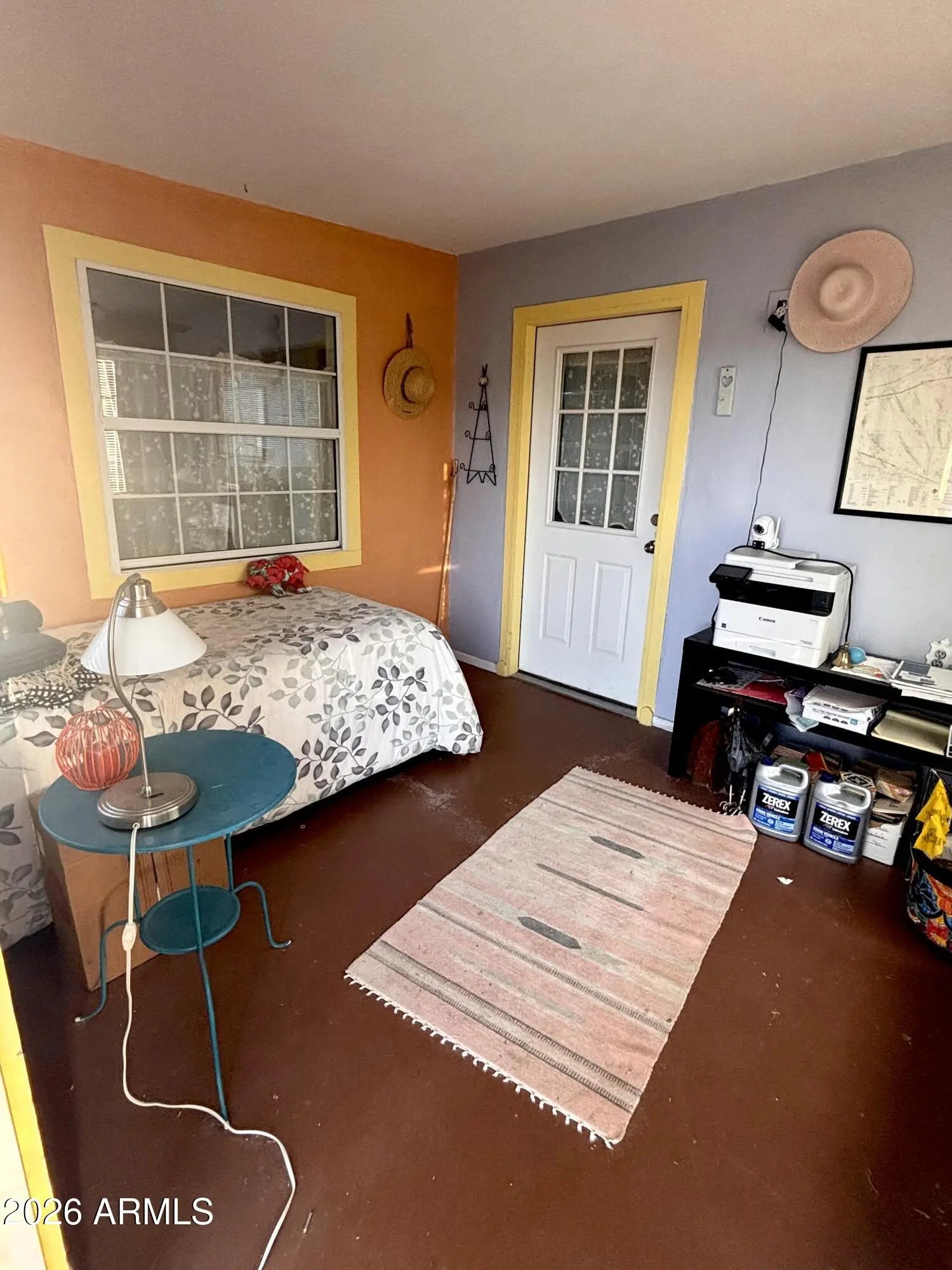 A true desert gem just moments from the heart of Ajo. Enter through a striking decorative metal gate into a private courtyard setting framed by stucco walls and beautifully designed desert landscaping with drip irrigation for easy care. This charming 863 sq ft Santa Fe-inspired home features soft pastel tones, laminate flooring, separate living and dining areas, and a cozy galley kitchen with decorative tile accents. A finished entry nook currently serves as a daybed retreat for guests or quiet relaxation. Interior utility room plus exterior laundry area with stackable washer/dryer. Located within walking distance to the historic Ajo Plaza and the Sonoran Desert Conference Center for dining, art, and community events. Ideal for snowbirds