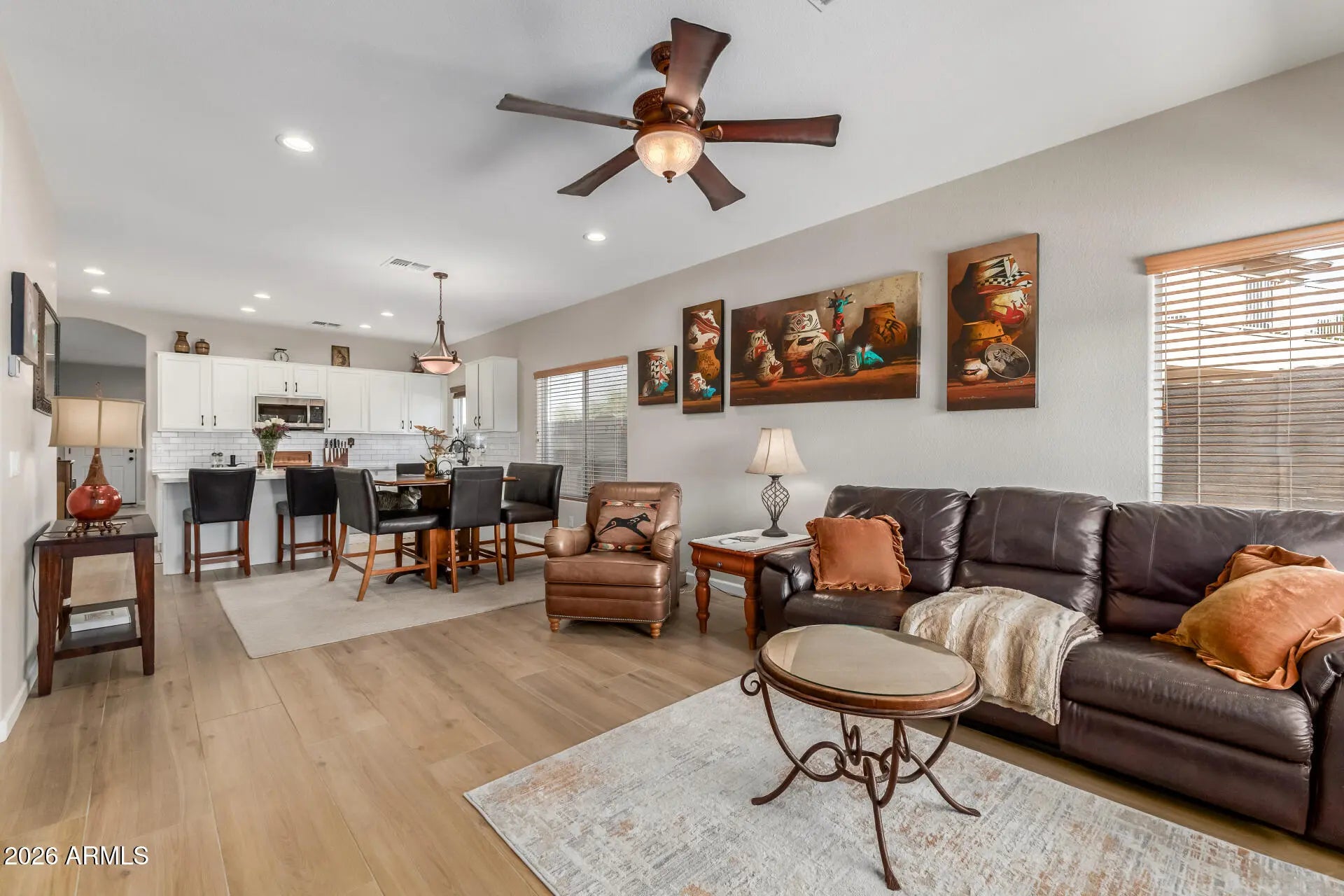 This stunning home has been thoughtfully updated with chic wide-plank light wood flooring, fresh interior paint, and elegant white cabinetry throughout. The kitchen shines with quartz countertops and a stylish subway tile backsplash, creating a bright and modern centerpiece for the home. Both bathrooms have been remodeled in a similar style, giving the home a clean, cohesive design. Step outside to a spacious backyard with a covered patio overlooking Coldwater Springs Golf Course, positioned two fairways wide for expansive views and added privacy. The home also features a pool with paid-off solar heating, allowing you to enjoy the water comfortably throughout more of the year. Conveniently located with easy access to I-10 and positioned between the 101 and 303 loops, this home offers the perfect combination of style, views, and accessibility.
