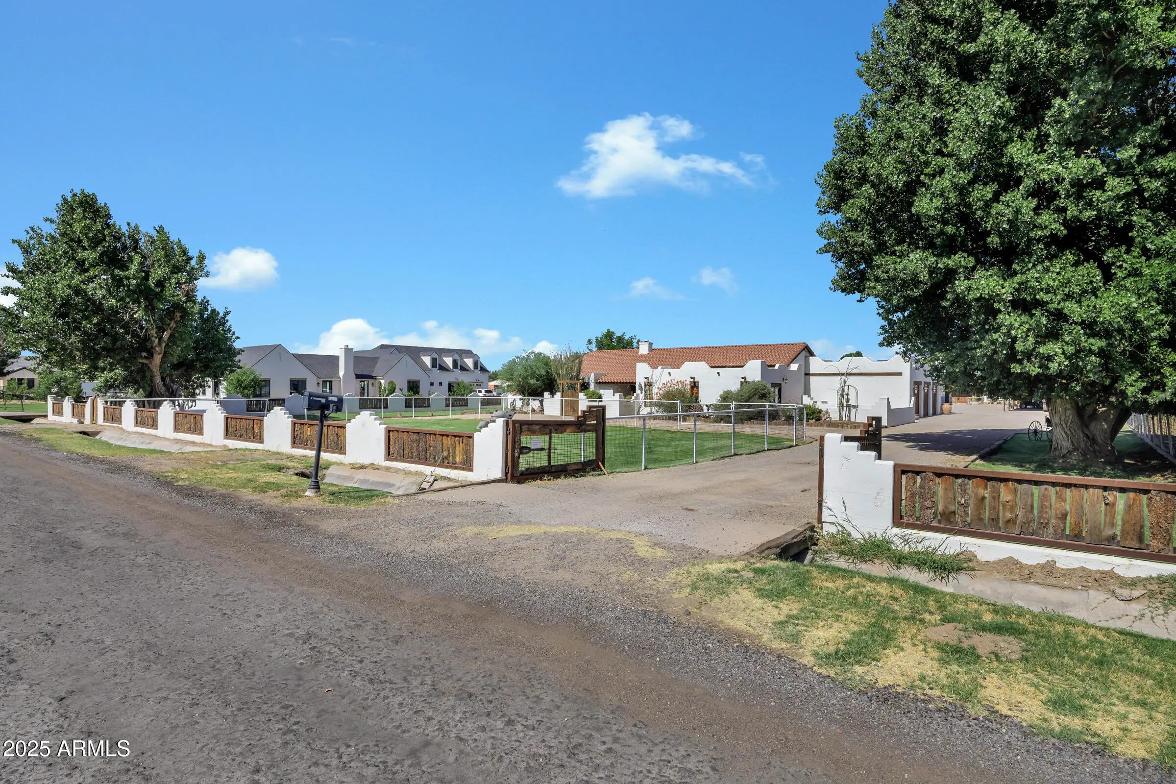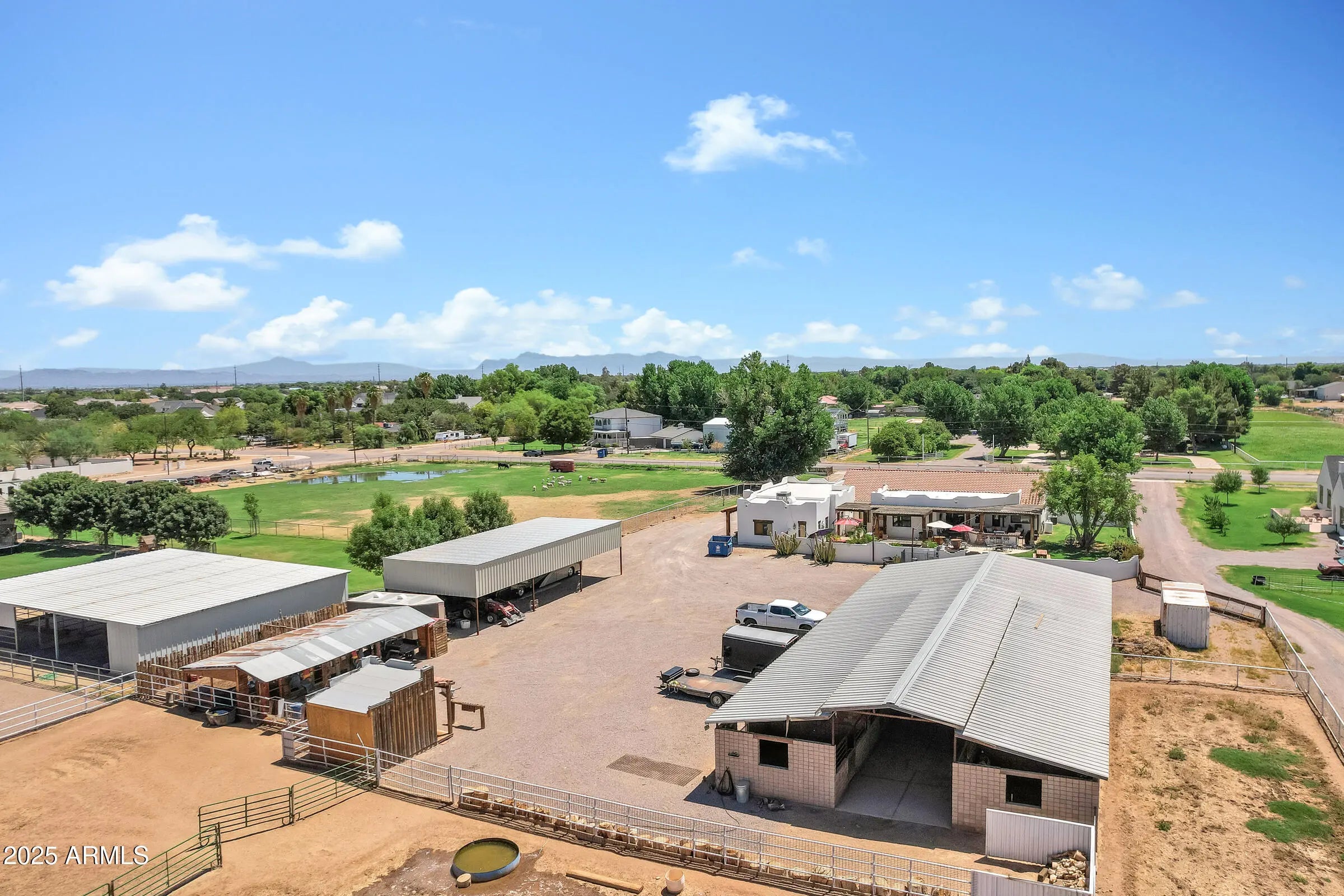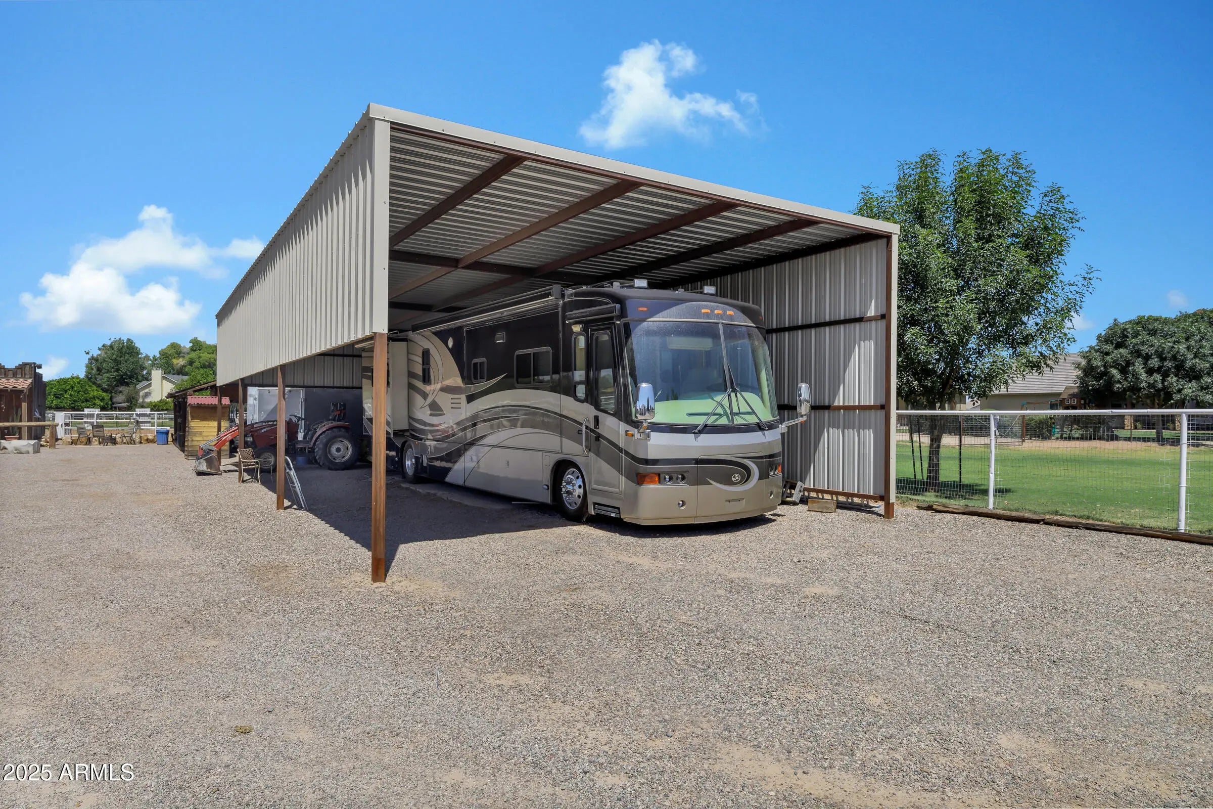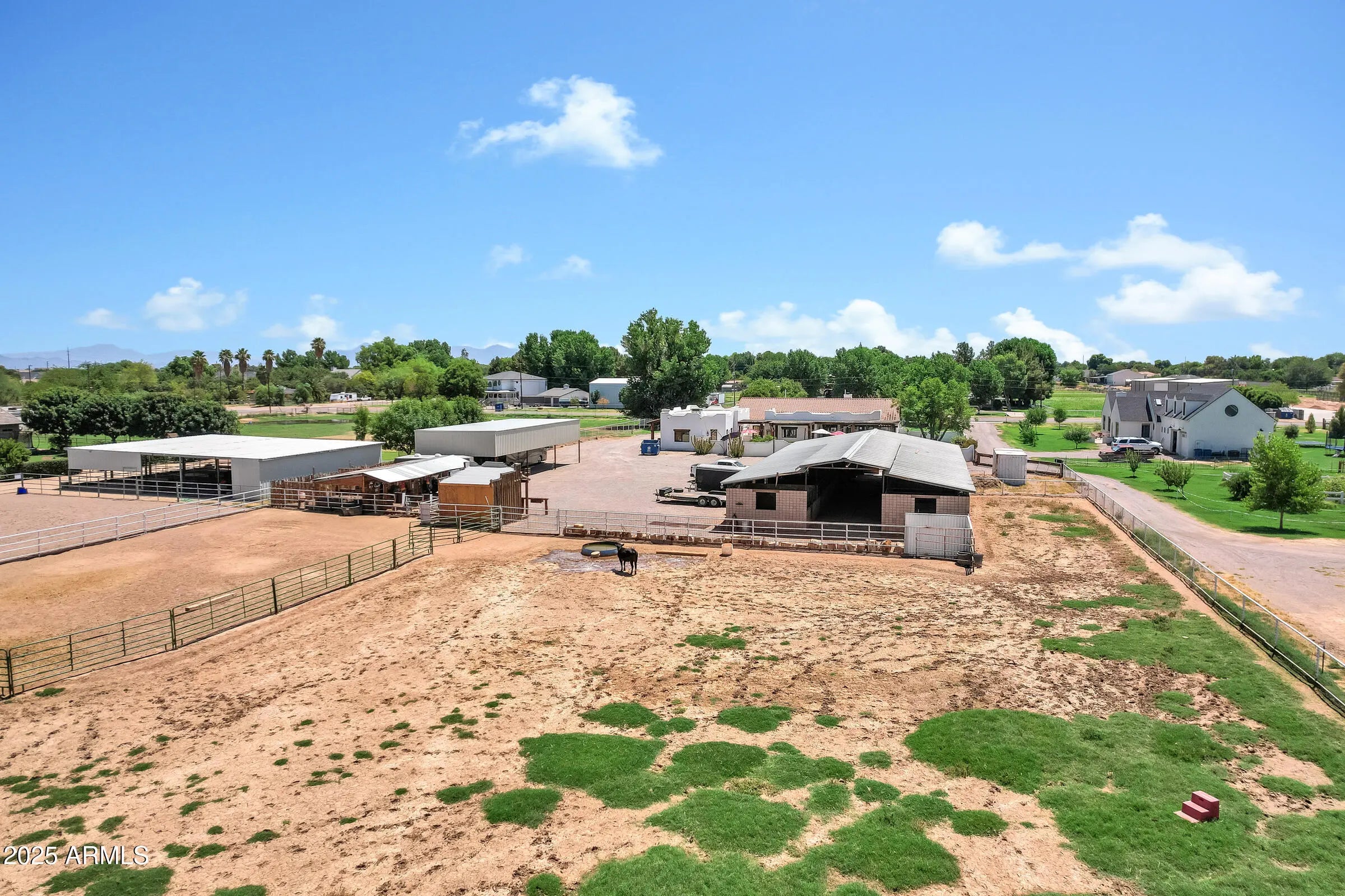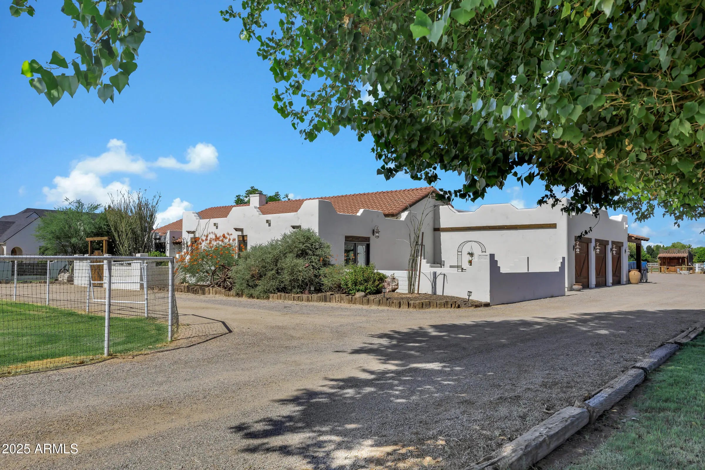Custom Santa Fe home - No HOA! - Front property with house only -- 1.6 irrigated acres on a County Island. Entire 2.76 available per MLS #6982091 at $2,225,000. This beautifully custom home offers the perfect blend of luxury, comfort, and functionality. A charming courtyard entry welcomes you to this spacious property, featuring a 4-bedroom, 4-bathroom main house plus a detached casita with private entrance--ideal for hosting guests or operating a home business. Designed with the chef in mind, the gourmet kitchen boasts a large island with prep sink, high-end natural gas stove, Cafe refrigerator, built-in microwave, under-counter refrigerator drawers, and exquisite two-toned custom wood cabinetry. Granite countertops, a farmhouse sink, travertine backsplash, and a generous walk-in pantry complete this culinary masterpiece with beamed ceilings. The great room stuns with vaulted ceilings, stone fireplace, offering an open yet cozy ambiance. Enjoy both an eat-in nook and a formal dining area for gatherings. Travertine flooring flows throughout the home, adding elegance and durability. Retreat to the guest suite with its own full bath and private entrance for added convenience. Step outside to an entertainer's backyard complete with a diving pool featuring a water feature and in-pool seating with a table, an extended covered patio, and a built-in bar with grill and sink, all shaded under a beautiful pergola. Just beyond the main home lies a fully equipped 8-stall brick barn with automatic waterers, grooming bay, tack room with bathroom, and additional storage room. Toward the back of the property, you'll also find a second tack room, 60 x 25 foot covered RV parking with hookups. This unique property offers the ultimate in luxury, privacy, and space with all the amenities needed for horses, hobbies, and hosting. Come experience the best of living in this one-of-a-kind estate.