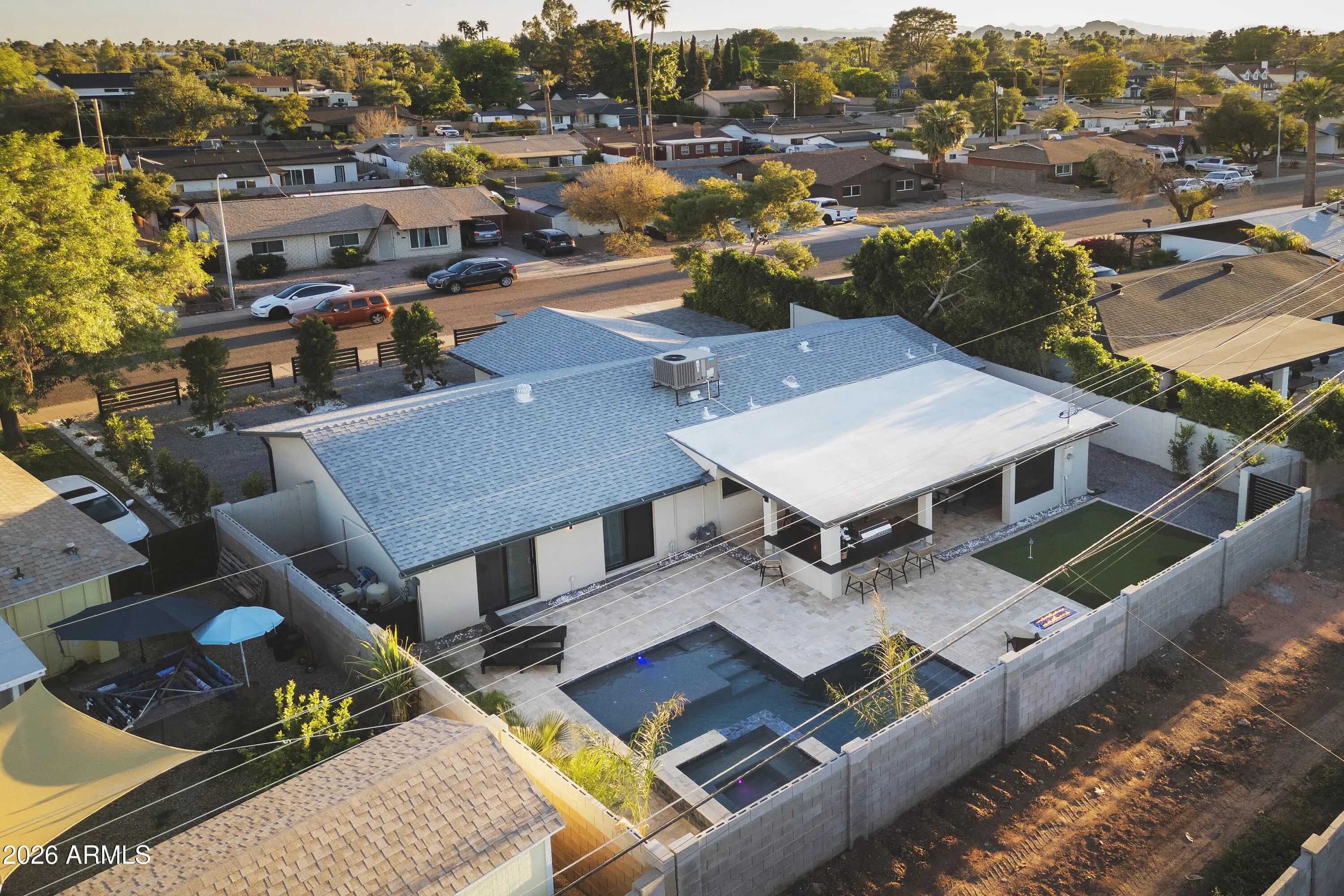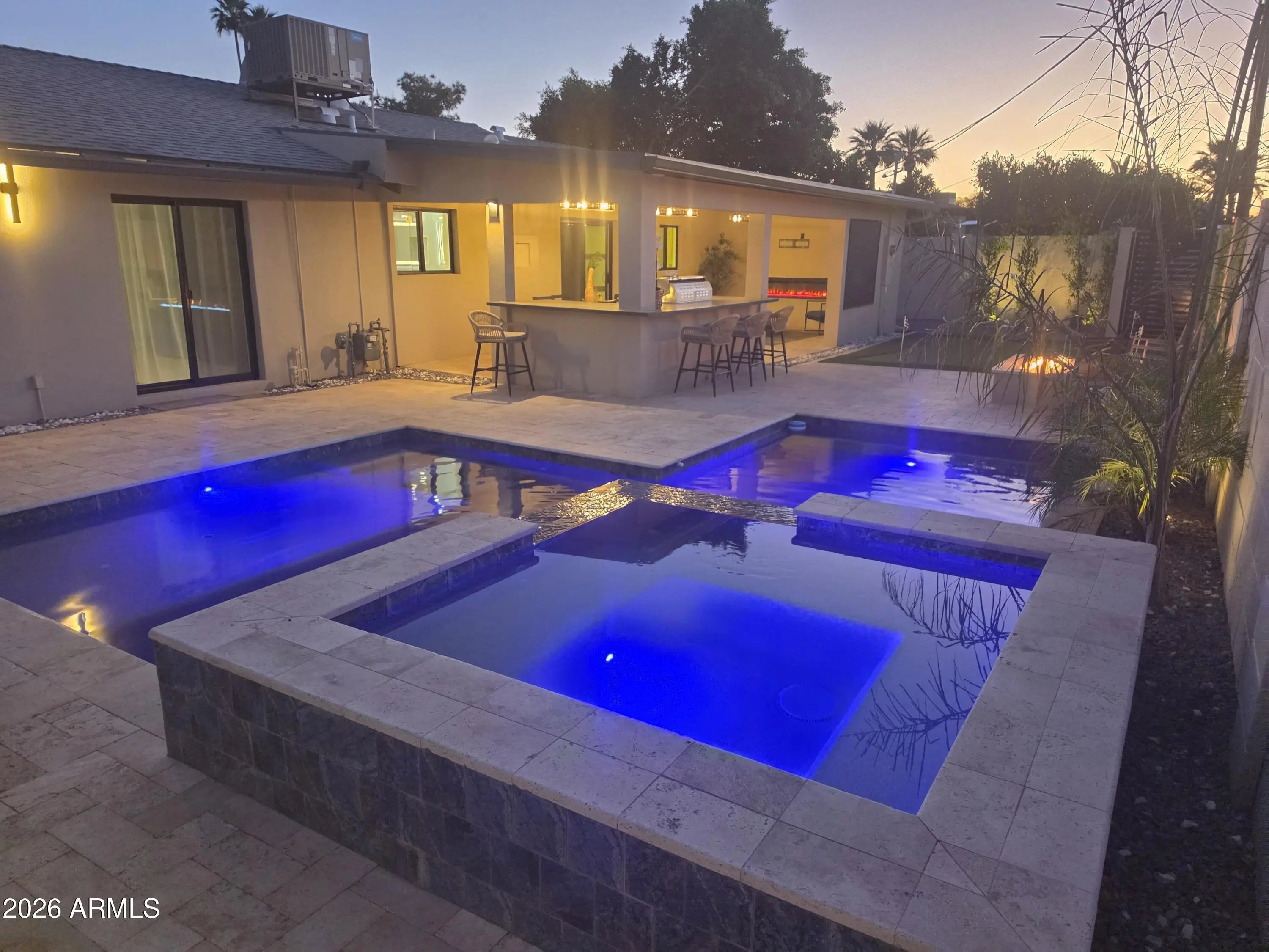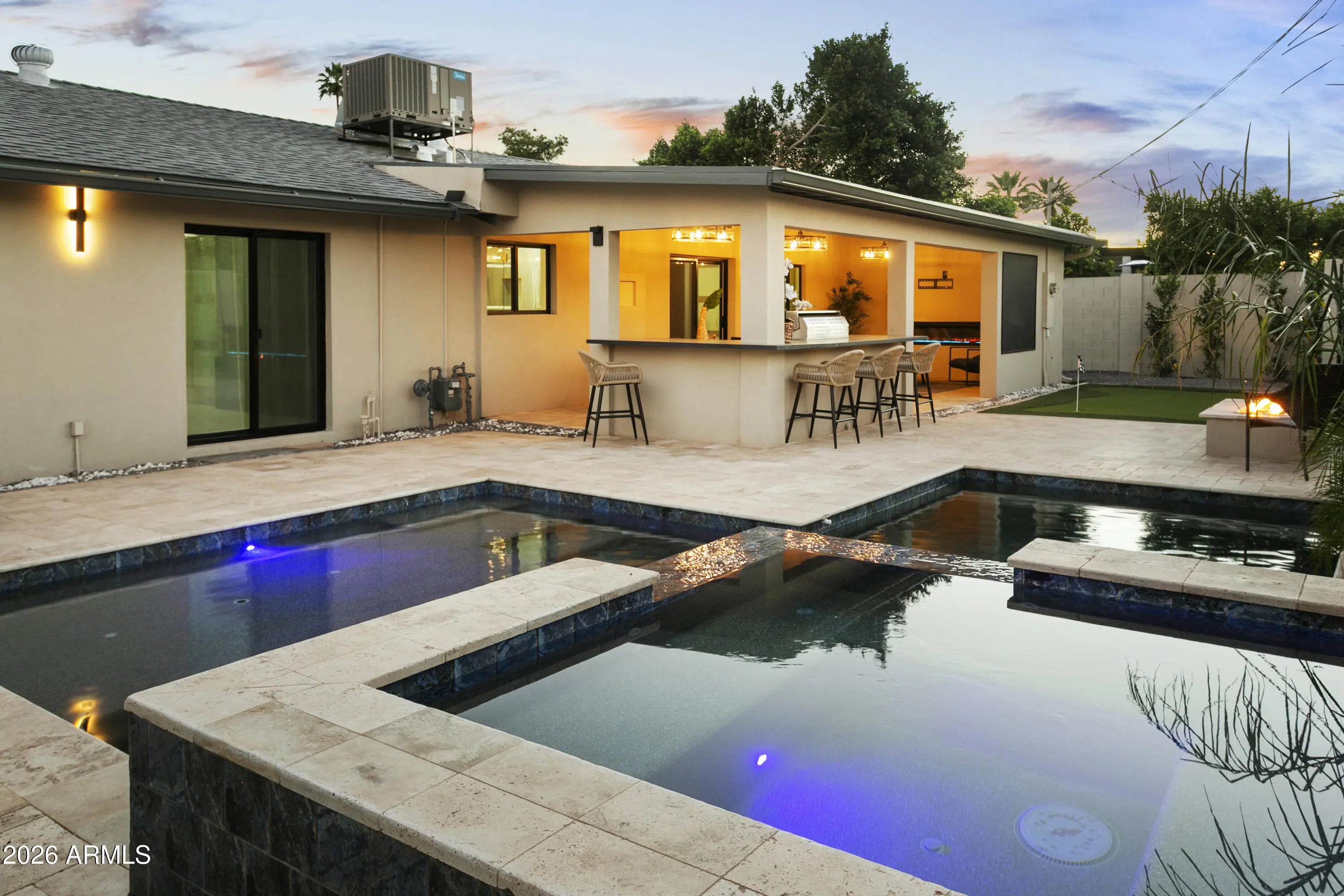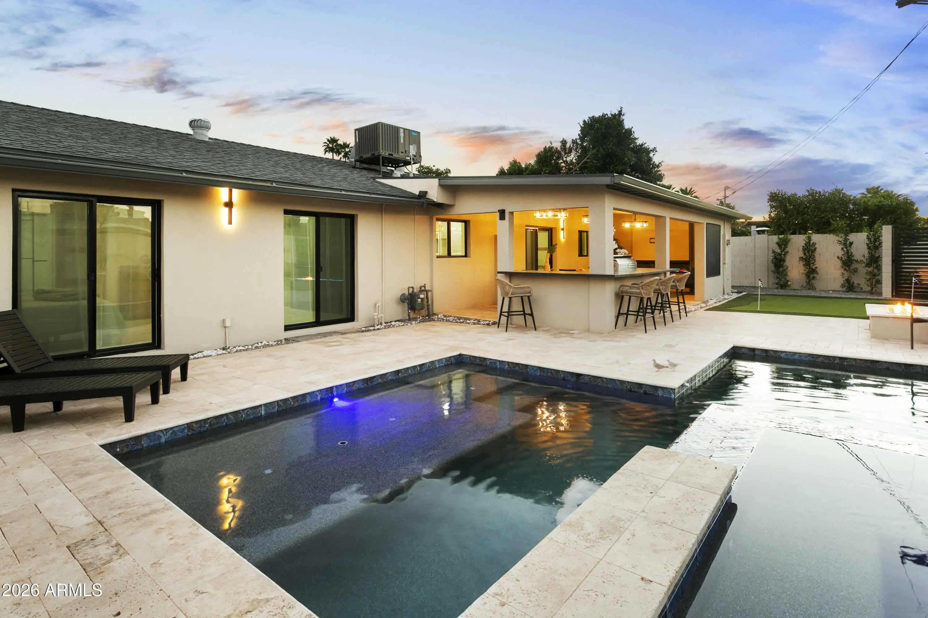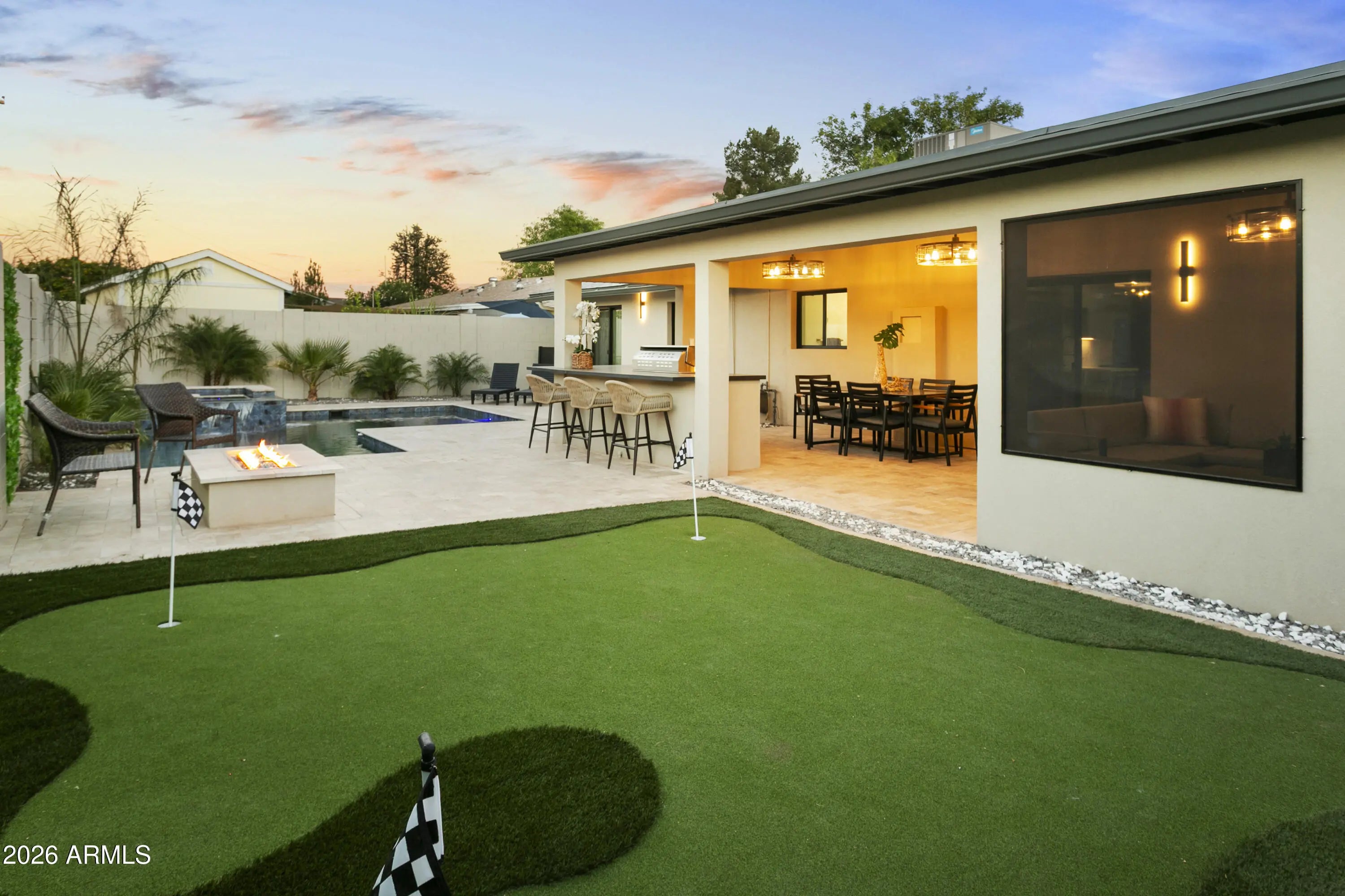 Reimagined, Replumbed, Rewired full scale designer Modern 2026 Remodel interior & exterior nothing left untouched. Designed for seamless flow throughout, this open spacious Great Room home has 3 bedrooms + office plus a 400sf indoor-outdoor feel Arizona Room including a TV-fireplace lounge area, dining or game area & built-in BBQ seated bar open to the resort backyard. Private & Quiet backyard has a heated pool & waterfall spa with multi color lights, in floor cleaning & lounge baja step, firepit and a putt-putt golf extended travertine patio backyard. Inside features a spacious Gourmet Frigidaire Kitchen including double ovens, drawer microwave, 36'' gas cooktop with built-in overhead vent, pot filler, apron sink, Quartz waterfall peninsula island and Quartz backsplash. Built-In Beverage center includes a full-size wine refrigerator and a counter height beverage cooler. Large Fireplace Great Room includes floor to ceiling ledgestone tile and acoustic wall paneling. Oversized Primary Suite also includes a Fireplace with floor to ceiling tile, walk-in closet, double sliders to pool/spa and a spacious sitting area. Step into the primary bath comprised of a dual rain shower & dual handheld faucet shower, a handheld faucet soaking tub, a multi color LED mirror, and a Bluetooth speaker remote heating with multi color exhaust fan. Two spacious secondary bedrooms share the guest bath containing rain & handheld shower faucets, a double vanity, a LED multi color mirror and a Bluetooth speaker heated exhaust fan. Off the kitchen is an office - pantry - laundry room. Luxury fans, dimmer switches, custom wall trim decor and custom tile throughout - no carpet. Epoxy garage includes a modern glass garage door with a side mount smart opener, a multi color wall design light fixture, a tankless water heater, a dedicated 220V for EV or workshop and extends to a new driveway finish & pavers. New landscape, irrigation and lighting. Top to bottom side to side inside and out everything has been updated and nothing left untouched. All new PEX plumbing & entire home rewire. Private & Quiet internal location not close to any high traffic streets - no two stories in the area with rear alley access. See MLS Documents for full detailed list of improvements and floorplan.