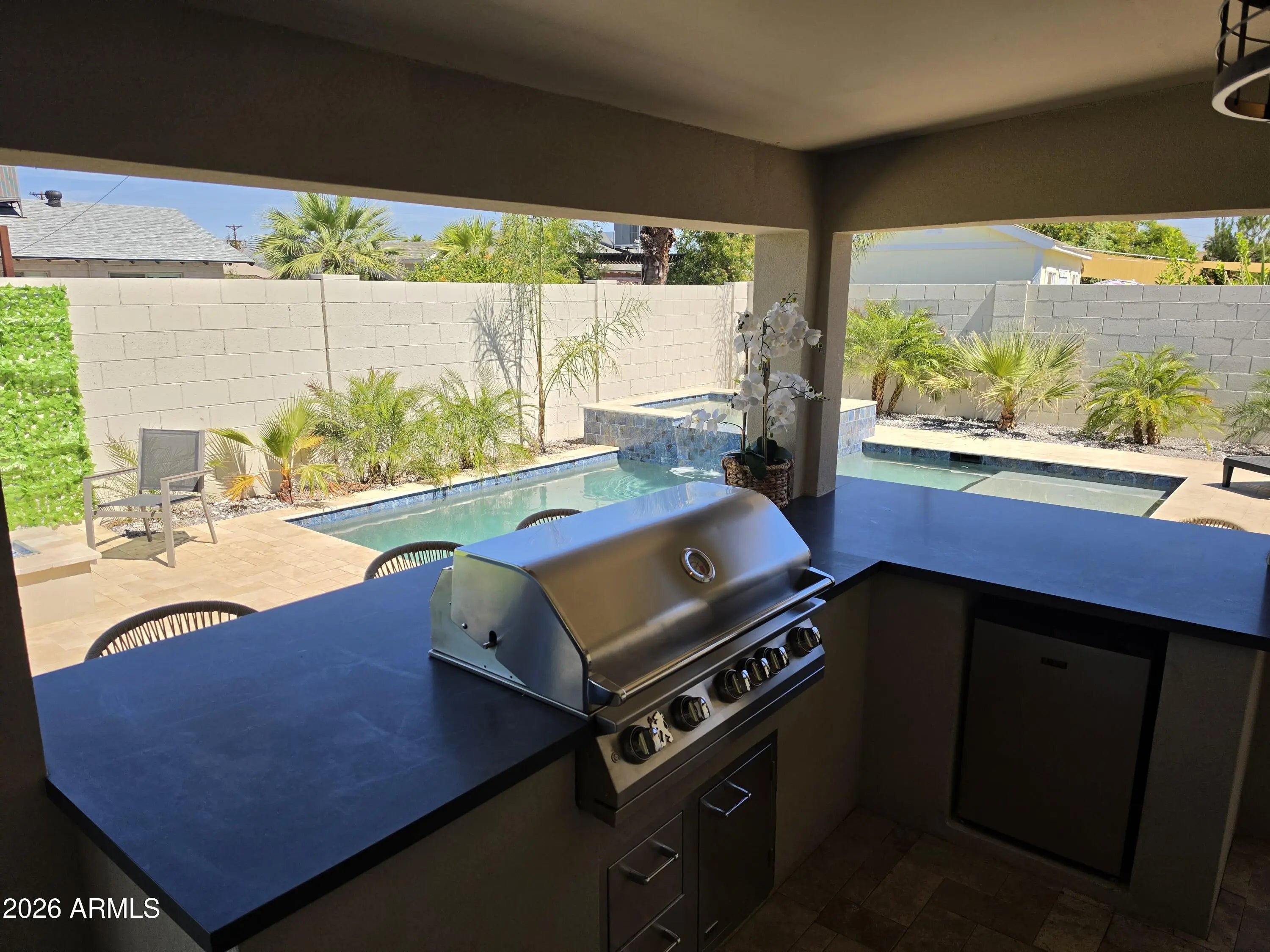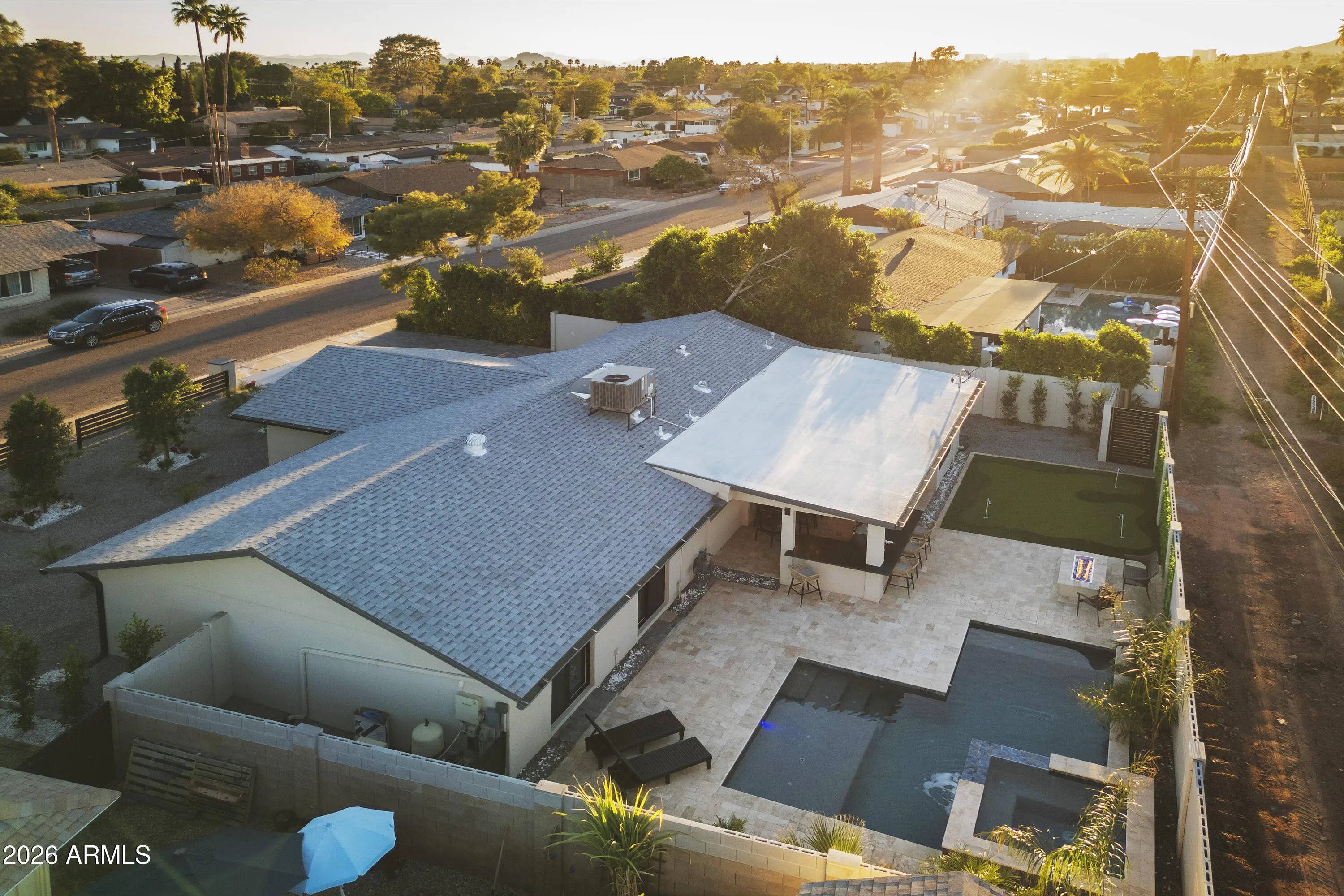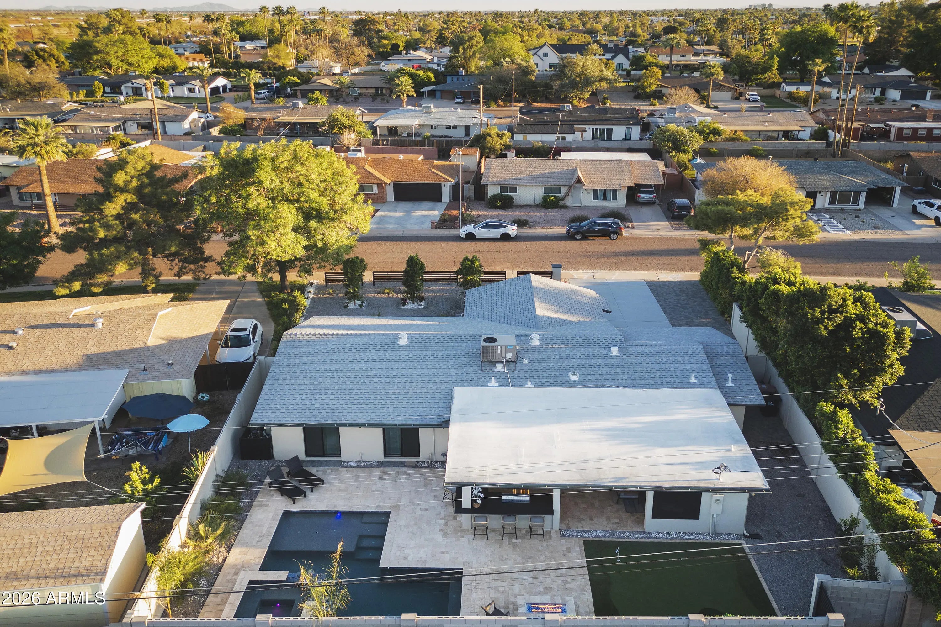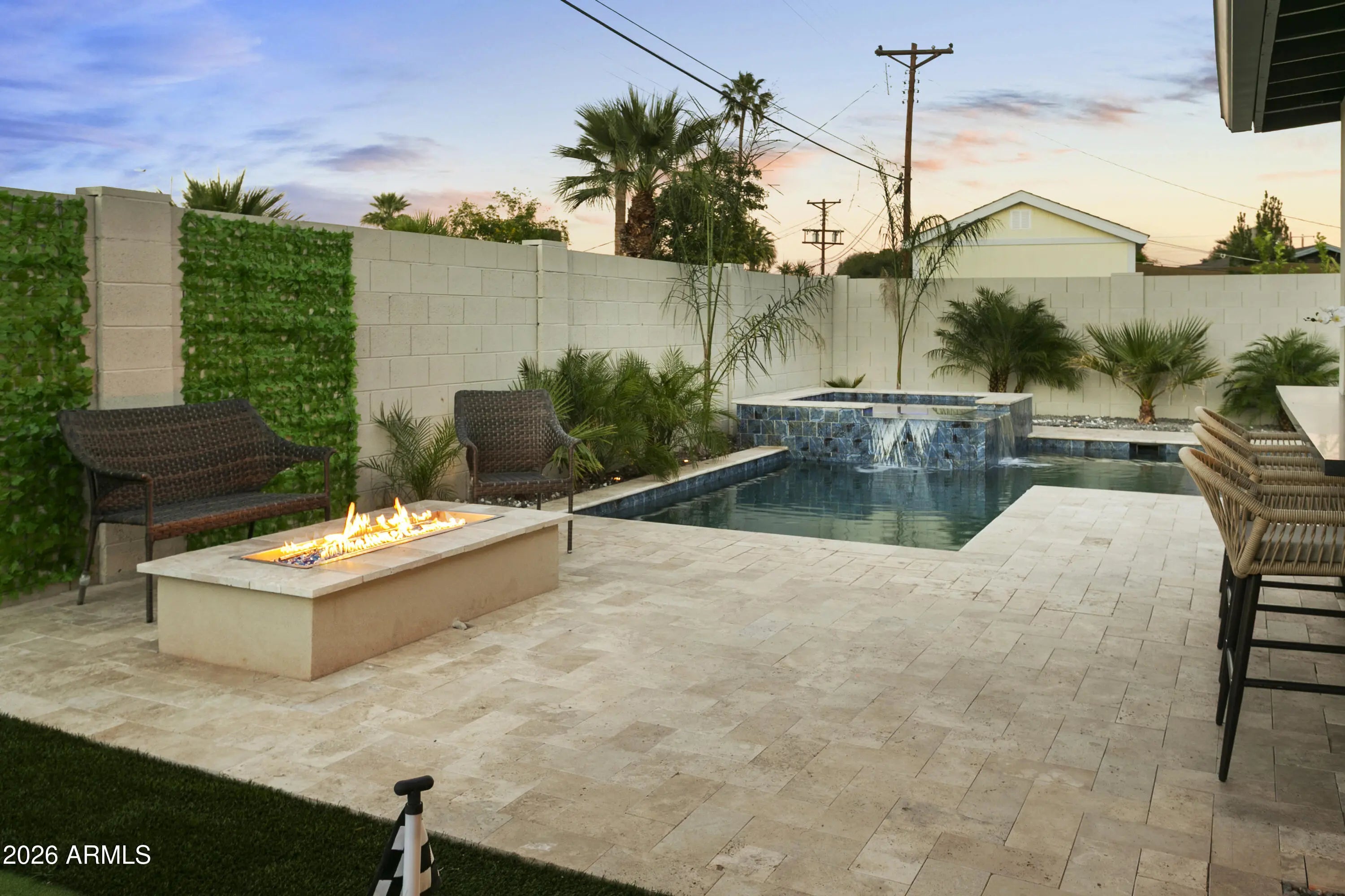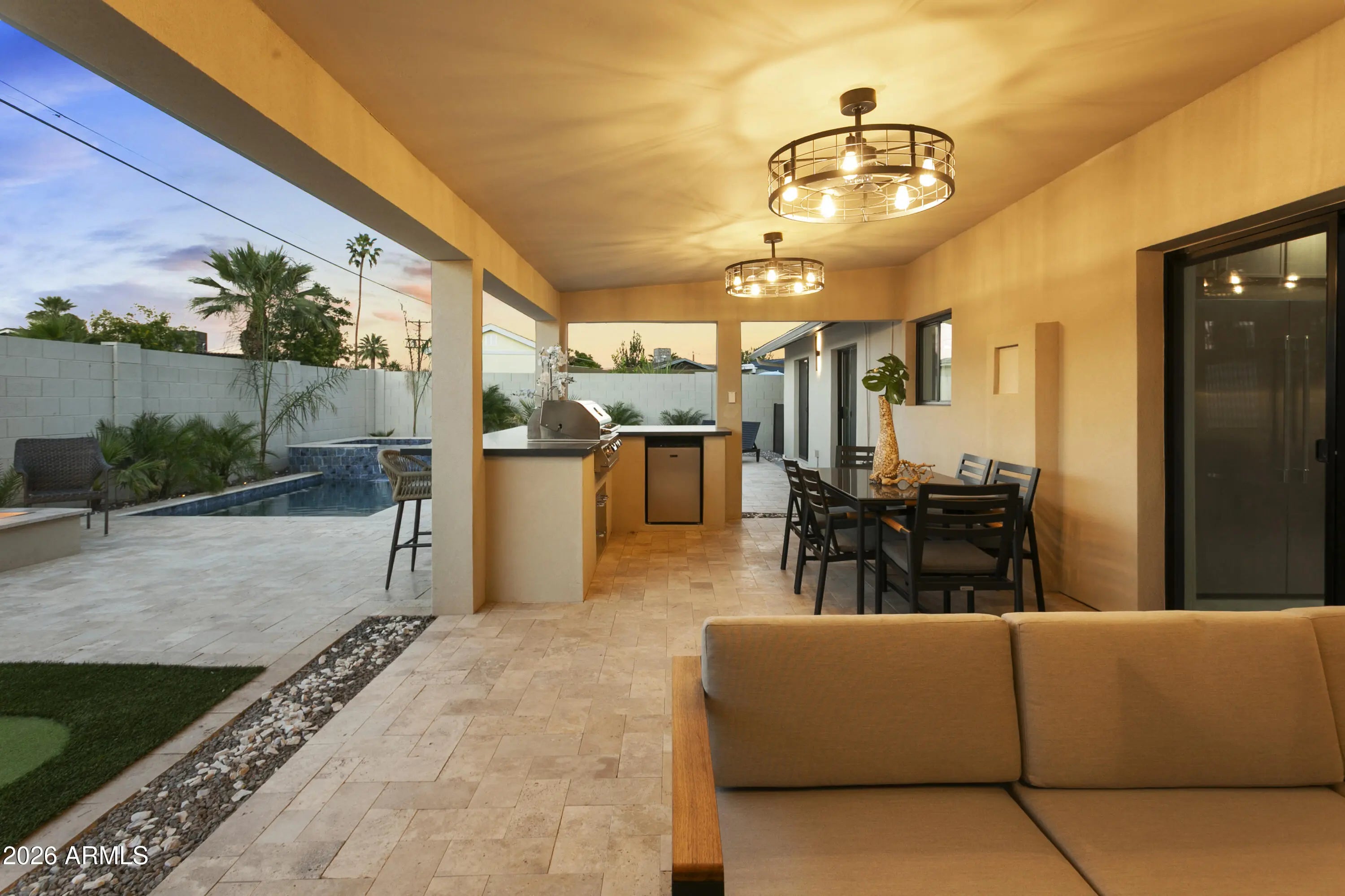 Reimagined, Replumbed, Rewired full scale designer Modern 2026 Remodel interior & exterior nothing left untouched. Designed for seamless flow throughout, this open spacious Great Room home has 3 bedrooms + office plus a 400sf indoor-outdoor feel Arizona Room including a TV-fireplace lounge area, dining or game area & built-in BBQ seated bar open to the resort backyard. Private & Quiet backyard has a heated pool & waterfall spa with multi color lights, in floor cleaning & lounge baja step, firepit and a putt-putt golf extended travertine patio backyard. Inside features a spacious Gourmet Frigidaire Kitchen including double ovens, drawer microwave, 36'' gas cooktop with built-in overhead vent, pot filler, apron sink, Quartz waterfall peninsula island and Quartz backsplash. Built-In Beverage center includes a full-size wine refrigerator and a counter height beverage cooler. Large Fireplace Great Room includes floor to ceiling ledgestone tile and acoustic wall paneling. Oversized Primary Suite also includes a Fireplace with floor to ceiling tile, walk-in closet, double sliders to pool/spa and a spacious sitting area. Step into the primary bath comprised of a dual rain shower & dual handheld faucet shower, a handheld faucet soaking tub, a multi color LED mirror, and a Bluetooth speaker remote heating with multi color exhaust fan. Two spacious secondary bedrooms share the guest bath containing rain & handheld shower faucets, a double vanity, a LED multi color mirror and a Bluetooth speaker heated exhaust fan. Off the kitchen is an office - pantry - laundry room. Luxury fans, dimmer switches, custom wall trim decor and custom tile throughout - no carpet. Epoxy garage includes a modern glass garage door with a side mount smart opener, a multi color wall design light fixture, a tankless water heater, a dedicated 220V for EV or workshop and extends to a new driveway finish & pavers. New landscape, irrigation and lighting. Top to bottom side to side inside and out everything has been updated and nothing left untouched. All new PEX plumbing & entire home rewire. Private & Quiet internal location not close to any high traffic streets - no two stories in the area with rear alley access. See MLS Documents for full detailed list of improvements and floorplan.