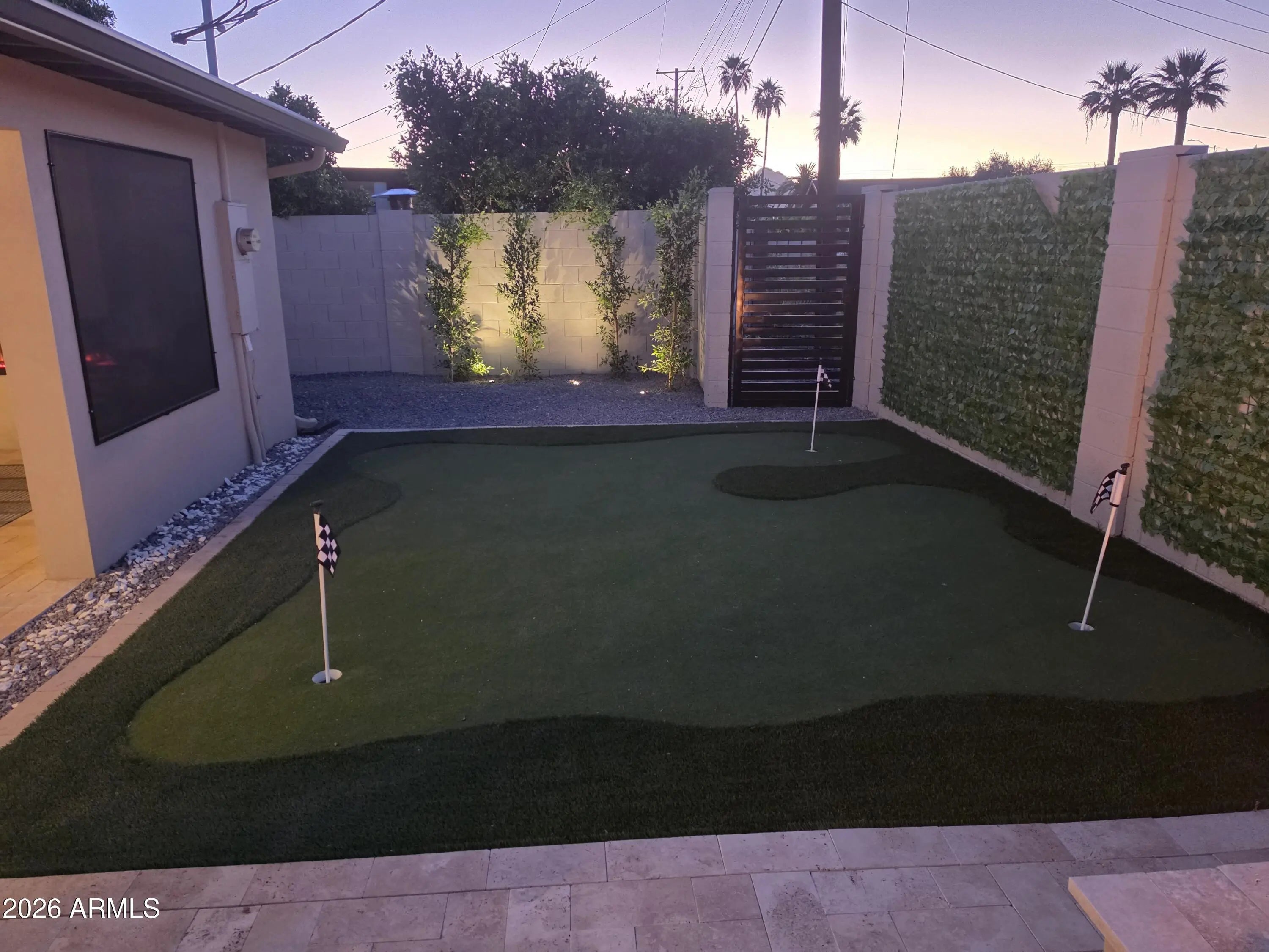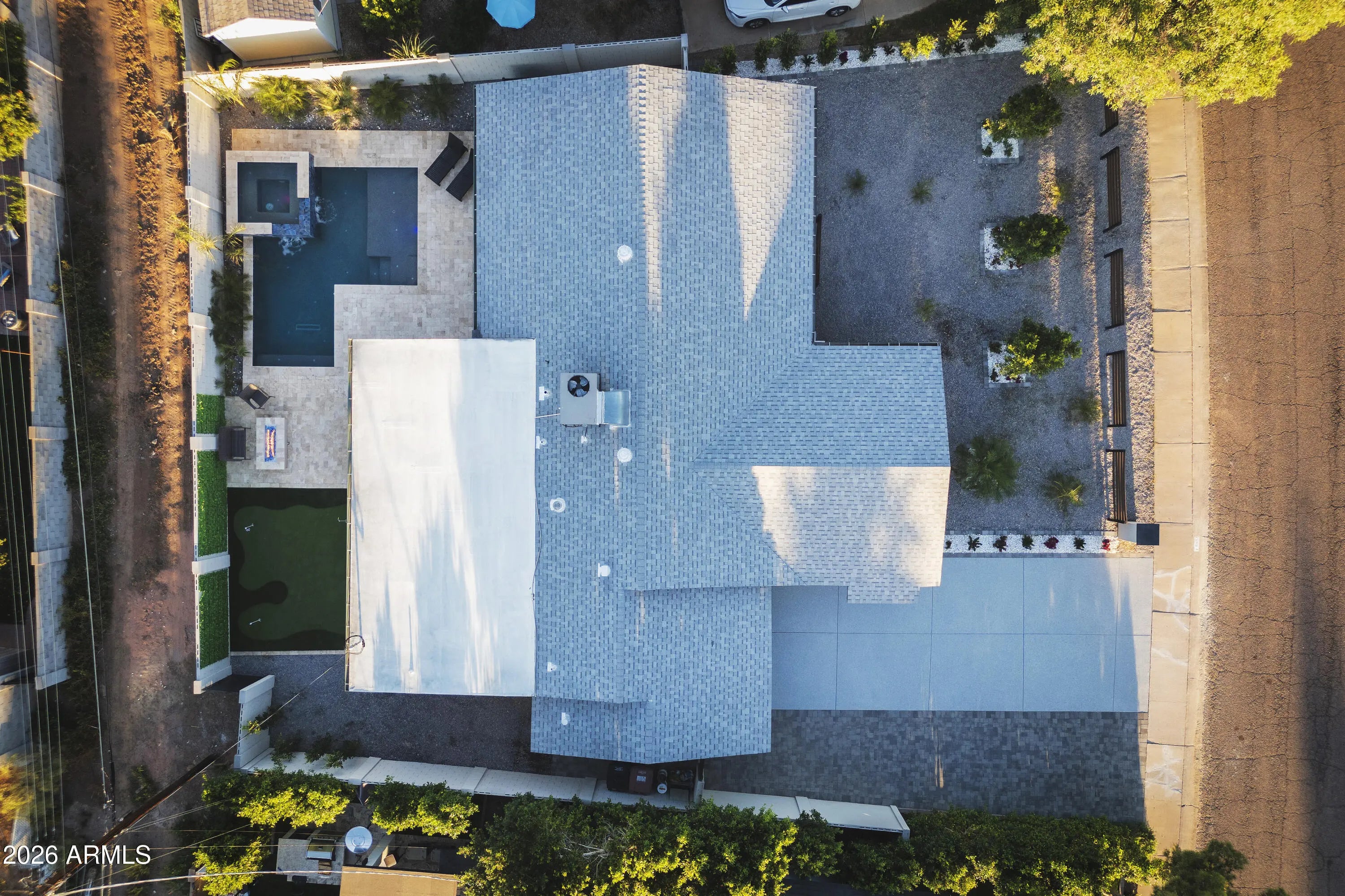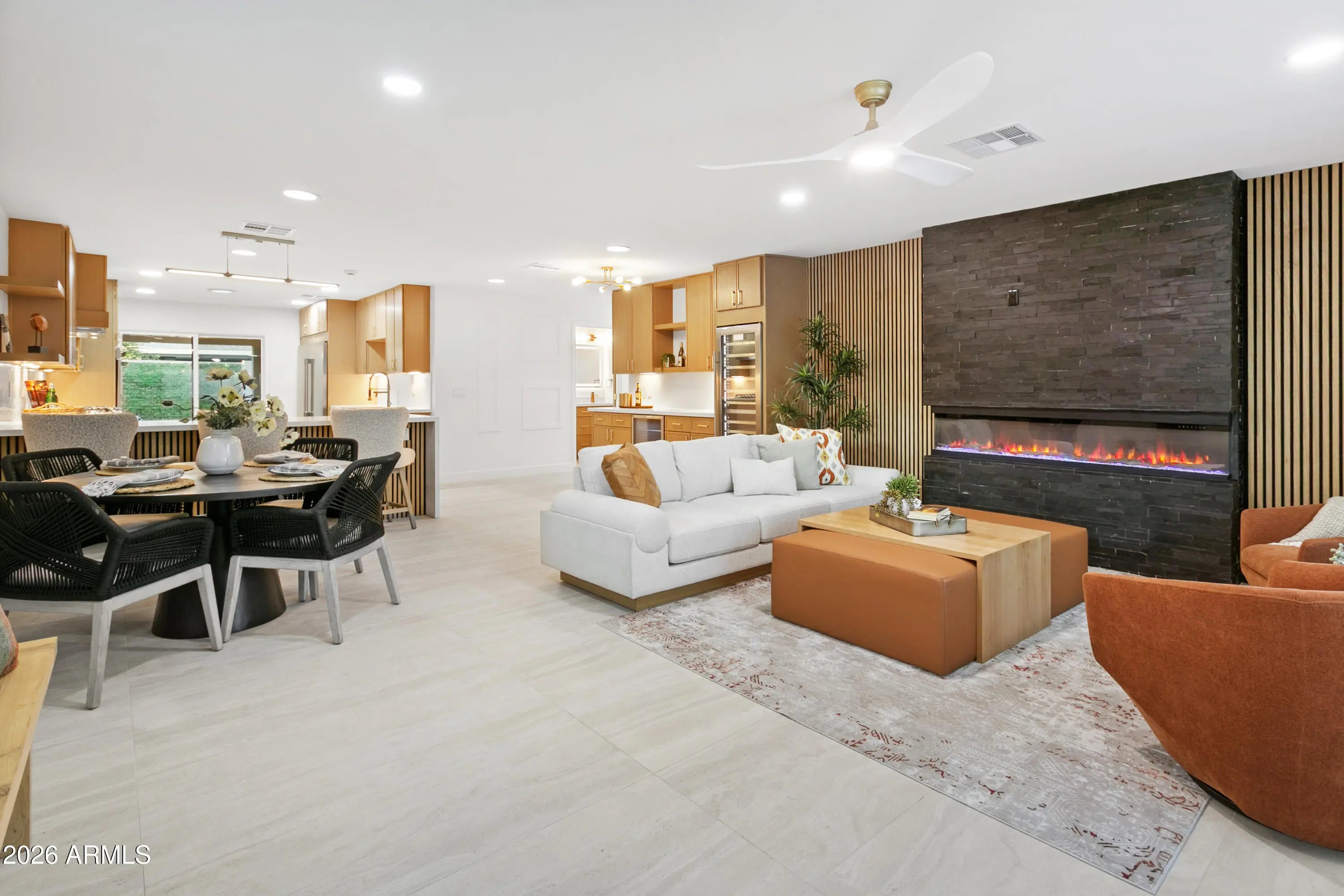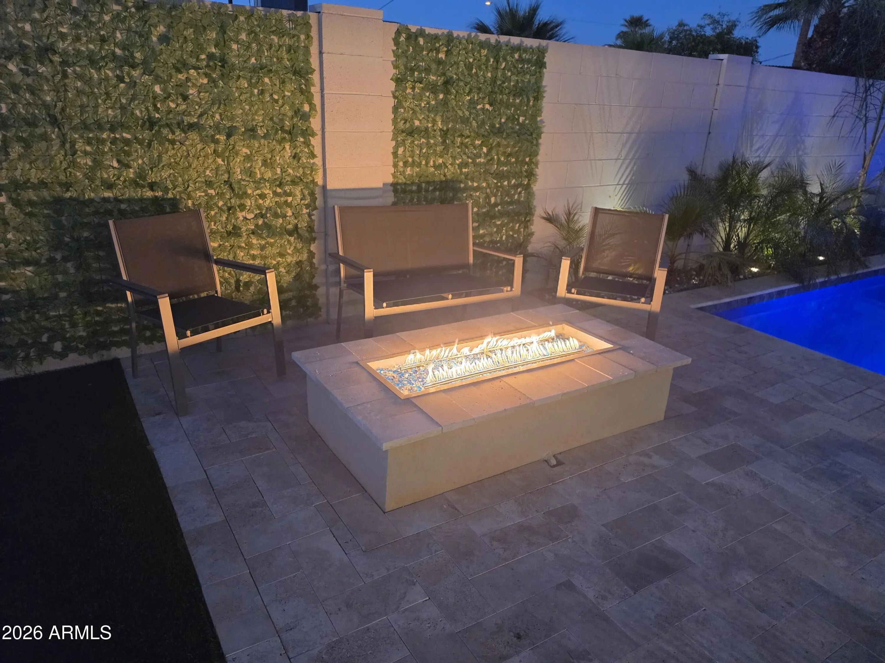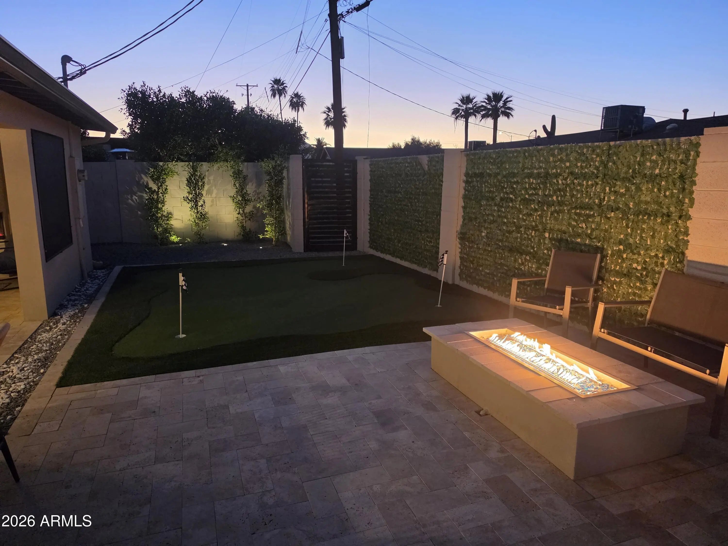 Reimagined, Replumbed, Rewired full scale designer Modern 2026 Remodel interior & exterior nothing left untouched. Designed for seamless flow throughout, this open spacious Great Room home has 3 bedrooms + office plus a 400sf indoor-outdoor feel Arizona Room including a TV-fireplace lounge area, dining or game area & built-in BBQ seated bar open to the resort backyard. Private & Quiet backyard has a heated pool & waterfall spa with multi color lights, in floor cleaning & lounge baja step, firepit and a putt-putt golf extended travertine patio backyard. Inside features a spacious Gourmet Frigidaire Kitchen including double ovens, drawer microwave, 36'' gas cooktop with built-in overhead vent, pot filler, apron sink, Quartz waterfall peninsula island and Quartz backsplash. Built-In Beverage center includes a full-size wine refrigerator and a counter height beverage cooler. Large Fireplace Great Room includes floor to ceiling ledgestone tile and acoustic wall paneling. Oversized Primary Suite also includes a Fireplace with floor to ceiling tile, walk-in closet, double sliders to pool/spa and a spacious sitting area. Step into the primary bath comprised of a dual rain shower & dual handheld faucet shower, a handheld faucet soaking tub, a multi color LED mirror, and a Bluetooth speaker remote heating with multi color exhaust fan. Two spacious secondary bedrooms share the guest bath containing rain & handheld shower faucets, a double vanity, a LED multi color mirror and a Bluetooth speaker heated exhaust fan. Off the kitchen is an office - pantry - laundry room. Luxury fans, dimmer switches, custom wall trim decor and custom tile throughout - no carpet. Epoxy garage includes a modern glass garage door with a side mount smart opener, a multi color wall design light fixture, a tankless water heater, a dedicated 220V for EV or workshop and extends to a new driveway finish & pavers. New landscape, irrigation and lighting. Top to bottom side to side inside and out everything has been updated and nothing left untouched. All new PEX plumbing & entire home rewire. Private & Quiet internal location not close to any high traffic streets - no two stories in the area with rear alley access. See MLS Documents for full detailed list of improvements and floorplan.