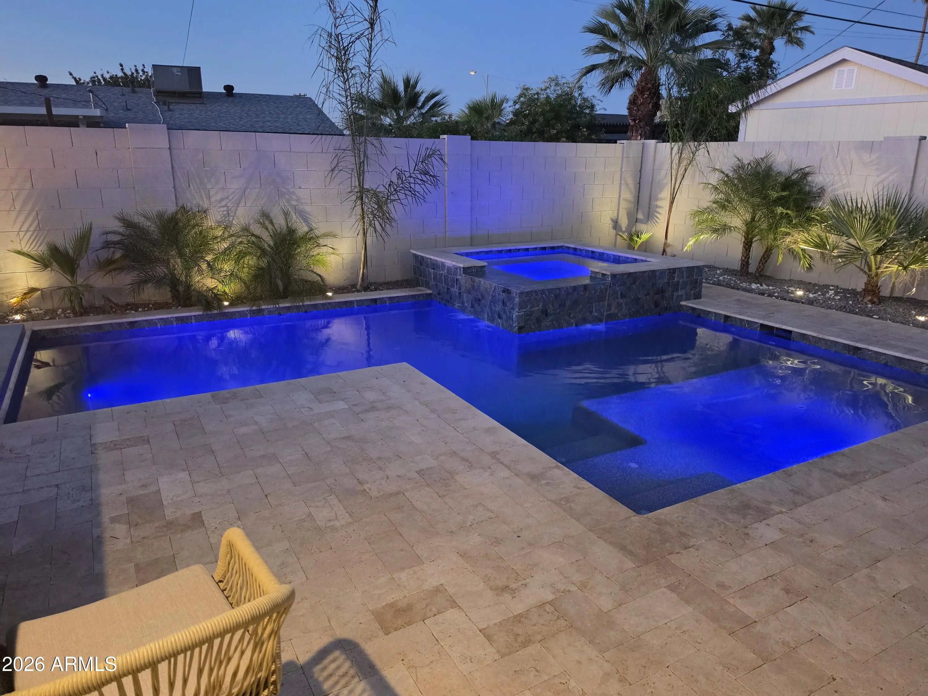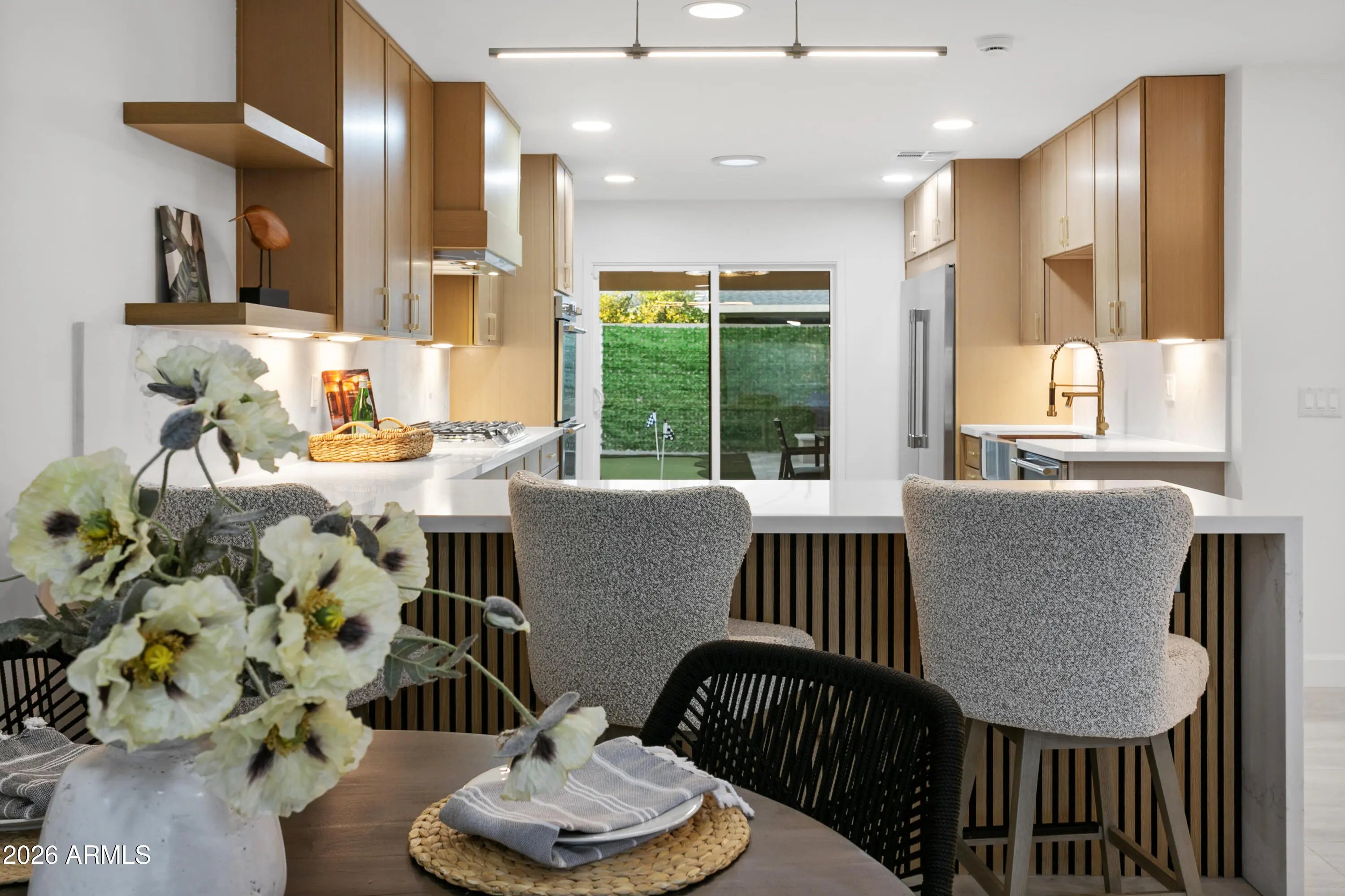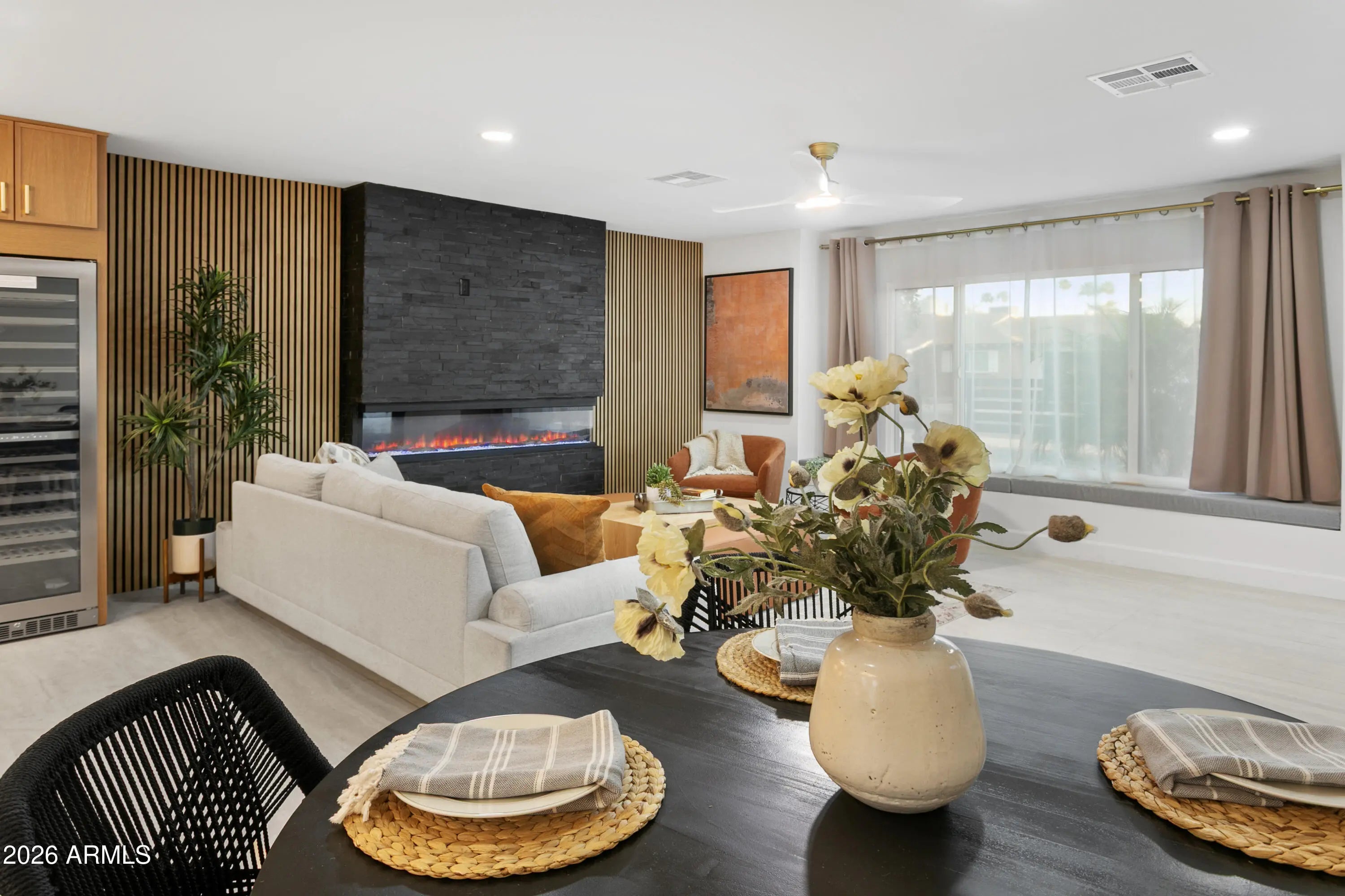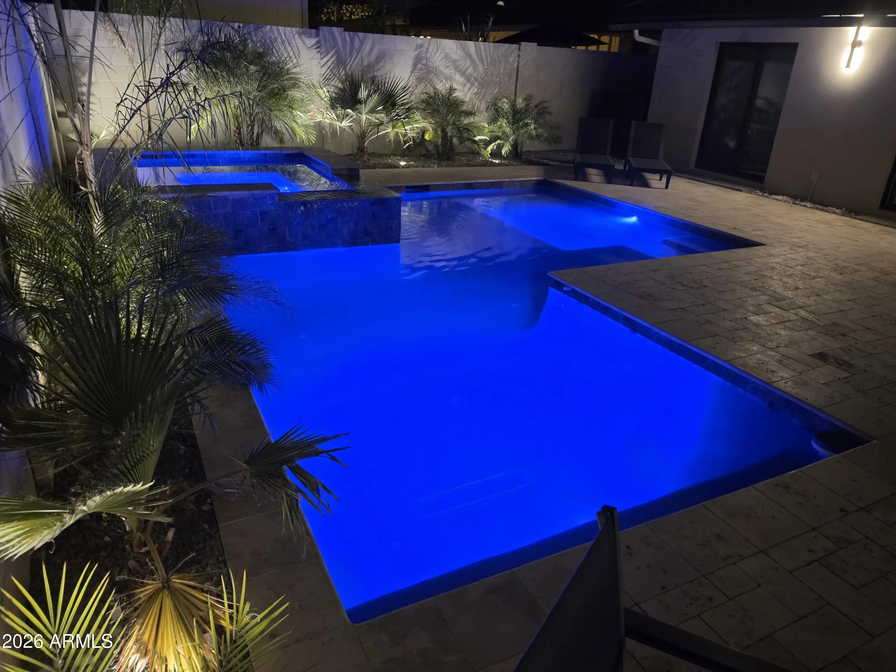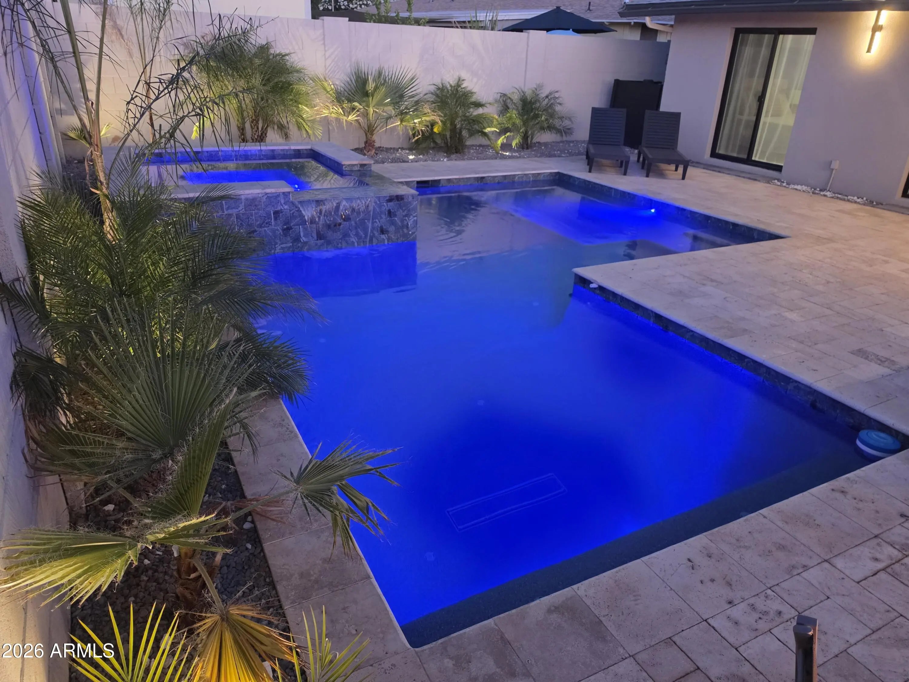 Reimagined, Replumbed, Rewired full scale designer Modern 2026 Remodel interior & exterior nothing left untouched. Designed for seamless flow throughout, this open spacious Great Room home has 3 bedrooms + office plus a 400sf indoor-outdoor feel Arizona Room including a TV-fireplace lounge area, dining or game area & built-in BBQ seated bar open to the resort backyard. Private & Quiet backyard has a heated pool & waterfall spa with multi color lights, in floor cleaning & lounge baja step, firepit and a putt-putt golf extended travertine patio backyard. Inside features a spacious Gourmet Frigidaire Kitchen including double ovens, drawer microwave, 36'' gas cooktop with built-in overhead vent, pot filler, apron sink, Quartz waterfall peninsula island and Quartz backsplash. Built-In Beverage center includes a full-size wine refrigerator and a counter height beverage cooler. Large Fireplace Great Room includes floor to ceiling ledgestone tile and acoustic wall paneling. Oversized Primary Suite also includes a Fireplace with floor to ceiling tile, walk-in closet, double sliders to pool/spa and a spacious sitting area. Step into the primary bath comprised of a dual rain shower & dual handheld faucet shower, a handheld faucet soaking tub, a multi color LED mirror, and a Bluetooth speaker remote heating with multi color exhaust fan. Two spacious secondary bedrooms share the guest bath containing rain & handheld shower faucets, a double vanity, a LED multi color mirror and a Bluetooth speaker heated exhaust fan. Off the kitchen is an office - pantry - laundry room. Luxury fans, dimmer switches, custom wall trim decor and custom tile throughout - no carpet. Epoxy garage includes a modern glass garage door with a side mount smart opener, a multi color wall design light fixture, a tankless water heater, a dedicated 220V for EV or workshop and extends to a new driveway finish & pavers. New landscape, irrigation and lighting. Top to bottom side to side inside and out everything has been updated and nothing left untouched. All new PEX plumbing & entire home rewire. Private & Quiet internal location not close to any high traffic streets - no two stories in the area with rear alley access. See MLS Documents for full detailed list of improvements and floorplan.