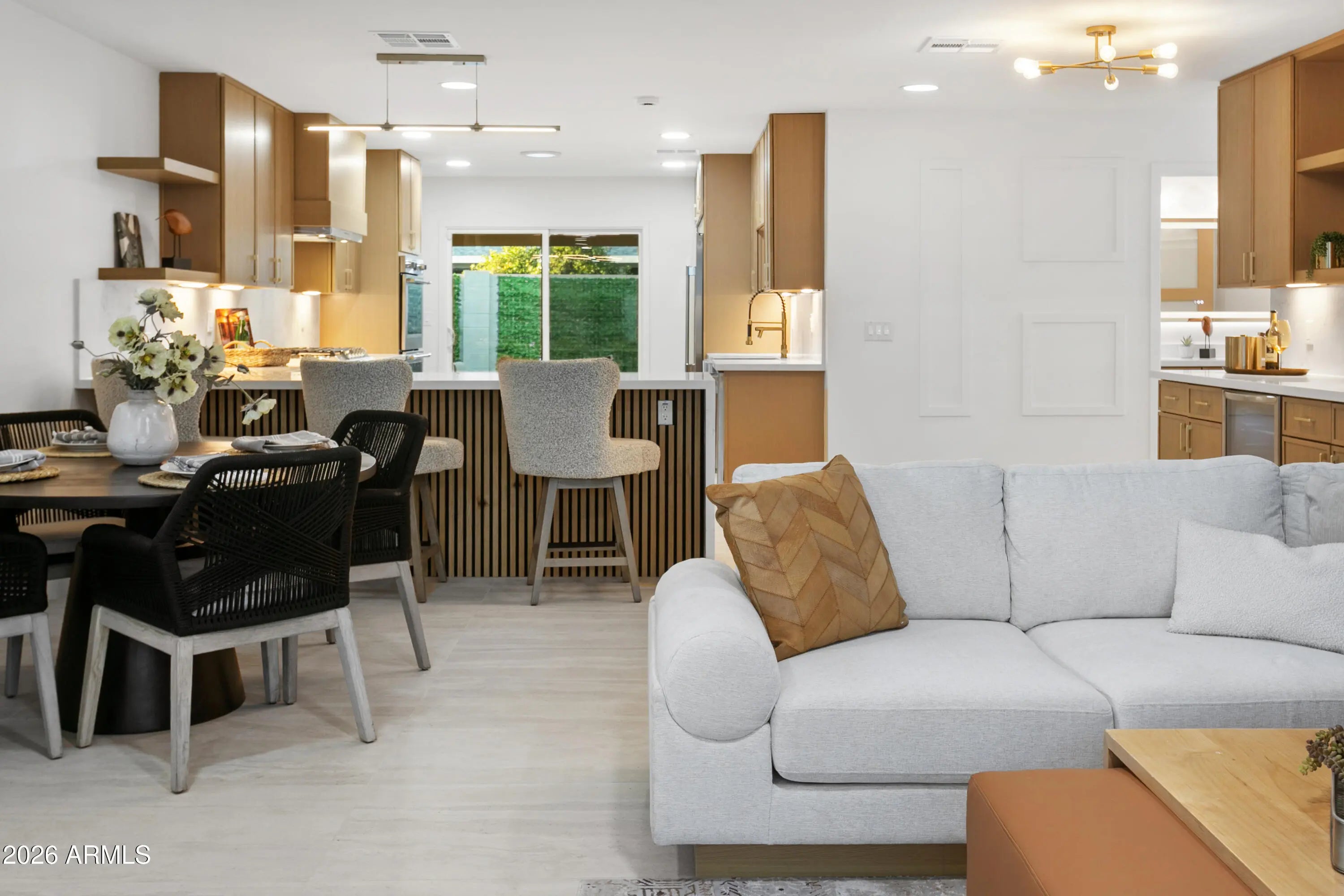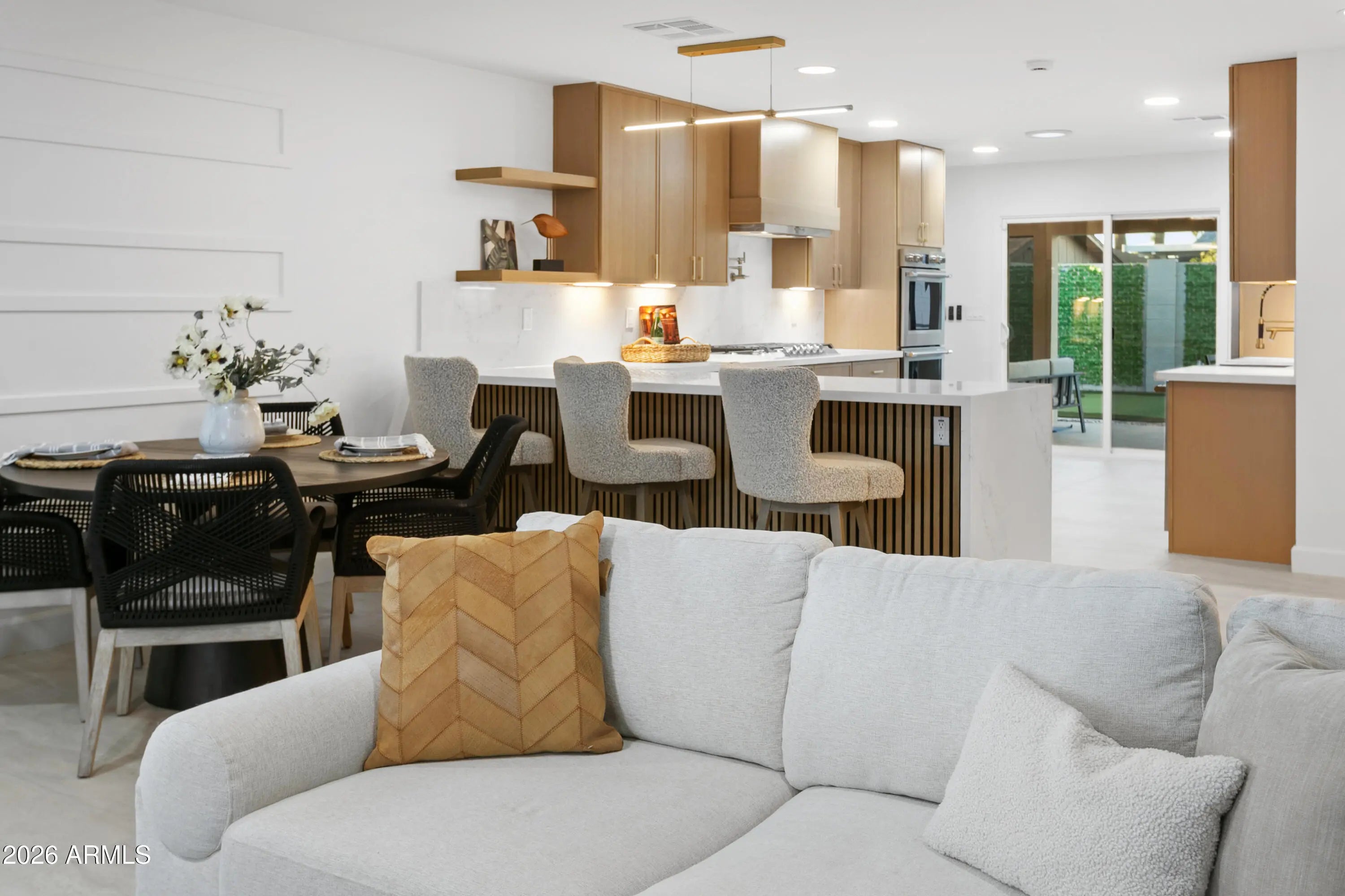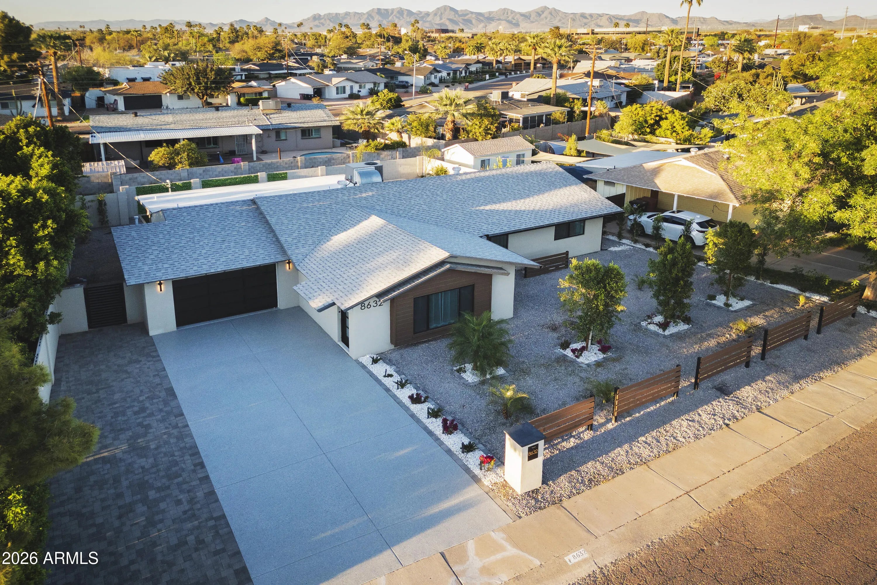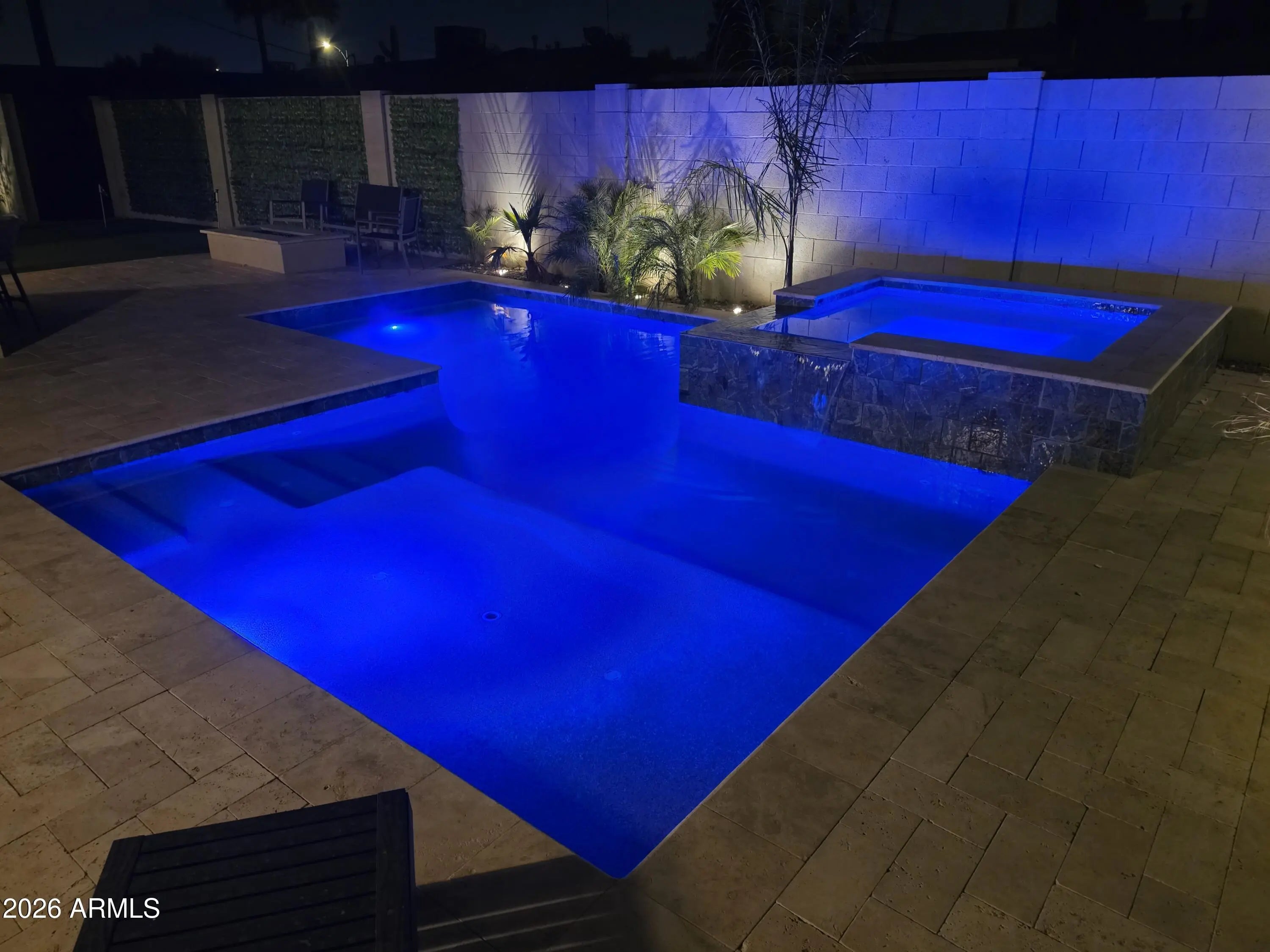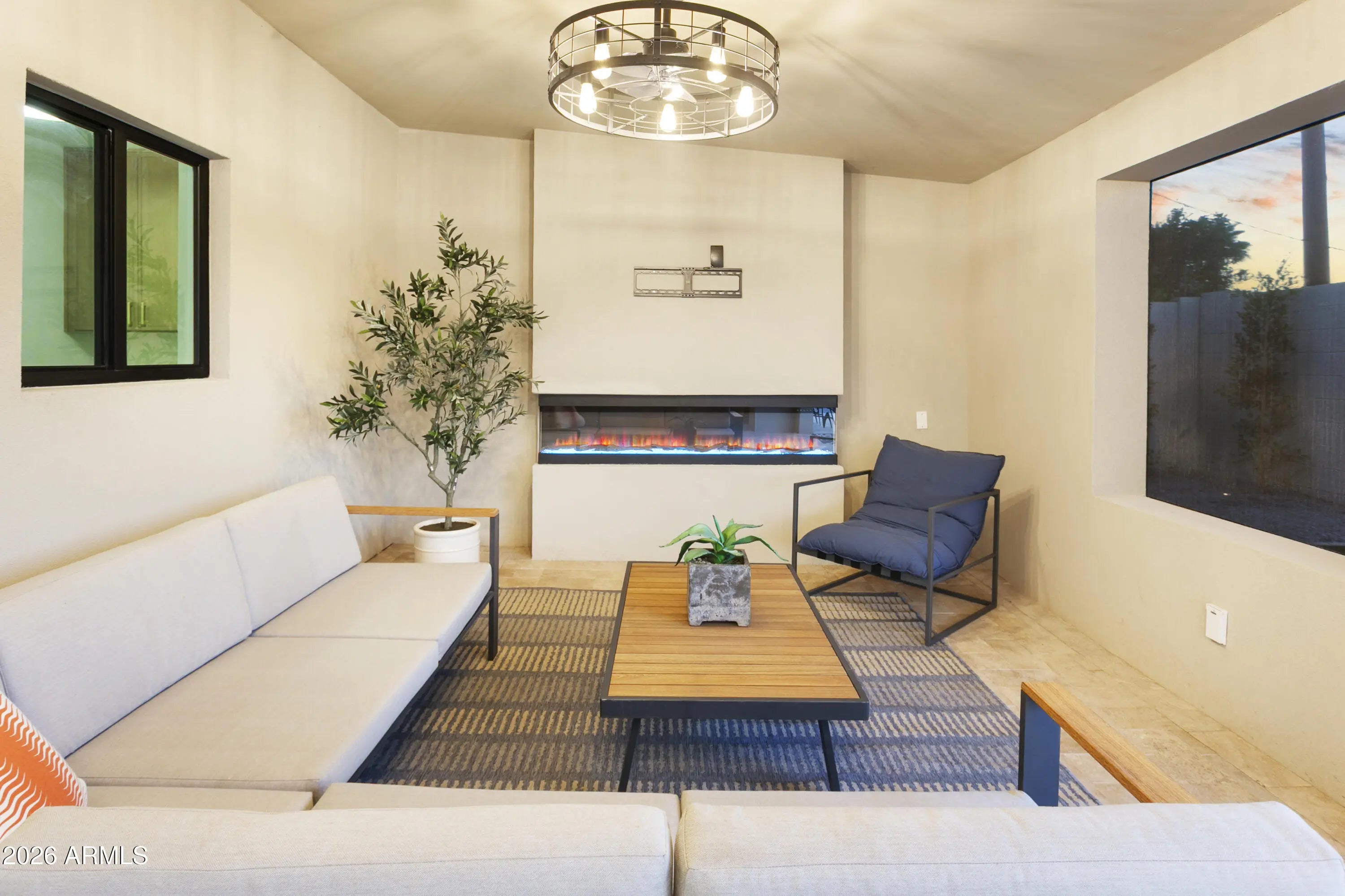 Reimagined, Replumbed, Rewired full scale designer Modern 2026 Remodel interior & exterior nothing left untouched. Designed for seamless flow throughout, this open spacious Great Room home has 3 bedrooms + office plus a 400sf indoor-outdoor feel Arizona Room including a TV-fireplace lounge area, dining or game area & built-in BBQ seated bar open to the resort backyard. Private & Quiet backyard has a heated pool & waterfall spa with multi color lights, in floor cleaning & lounge baja step, firepit and a putt-putt golf extended travertine patio backyard. Inside features a spacious Gourmet Frigidaire Kitchen including double ovens, drawer microwave, 36'' gas cooktop with built-in overhead vent, pot filler, apron sink, Quartz waterfall peninsula island and Quartz backsplash. Built-In Beverage center includes a full-size wine refrigerator and a counter height beverage cooler. Large Fireplace Great Room includes floor to ceiling ledgestone tile and acoustic wall paneling. Oversized Primary Suite also includes a Fireplace with floor to ceiling tile, walk-in closet, double sliders to pool/spa and a spacious sitting area. Step into the primary bath comprised of a dual rain shower & dual handheld faucet shower, a handheld faucet soaking tub, a multi color LED mirror, and a Bluetooth speaker remote heating with multi color exhaust fan. Two spacious secondary bedrooms share the guest bath containing rain & handheld shower faucets, a double vanity, a LED multi color mirror and a Bluetooth speaker heated exhaust fan. Off the kitchen is an office - pantry - laundry room. Luxury fans, dimmer switches, custom wall trim decor and custom tile throughout - no carpet. Epoxy garage includes a modern glass garage door with a side mount smart opener, a multi color wall design light fixture, a tankless water heater, a dedicated 220V for EV or workshop and extends to a new driveway finish & pavers. New landscape, irrigation and lighting. Top to bottom side to side inside and out everything has been updated and nothing left untouched. All new PEX plumbing & entire home rewire. Private & Quiet internal location not close to any high traffic streets - no two stories in the area with rear alley access. See MLS Documents for full detailed list of improvements and floorplan.