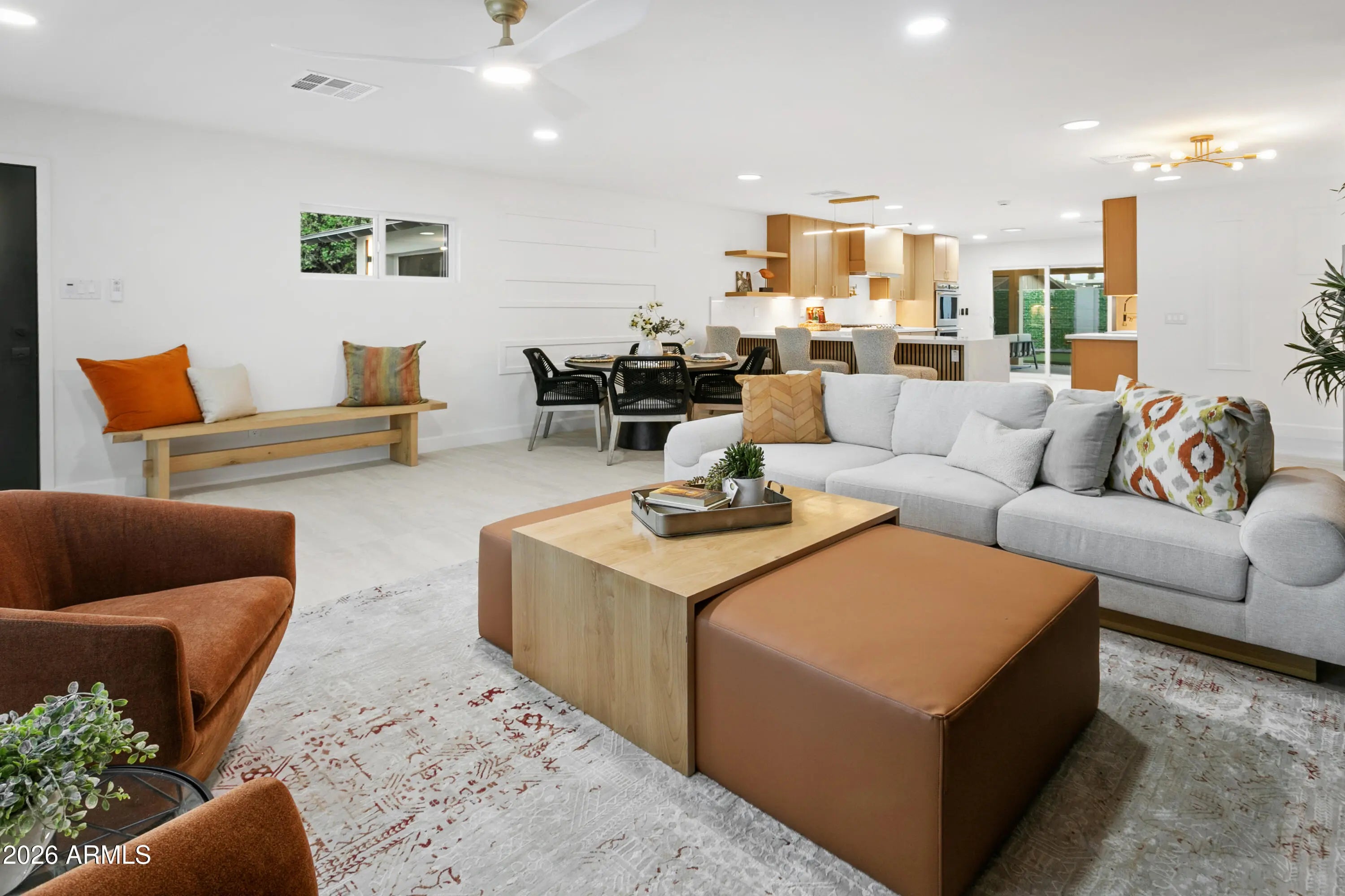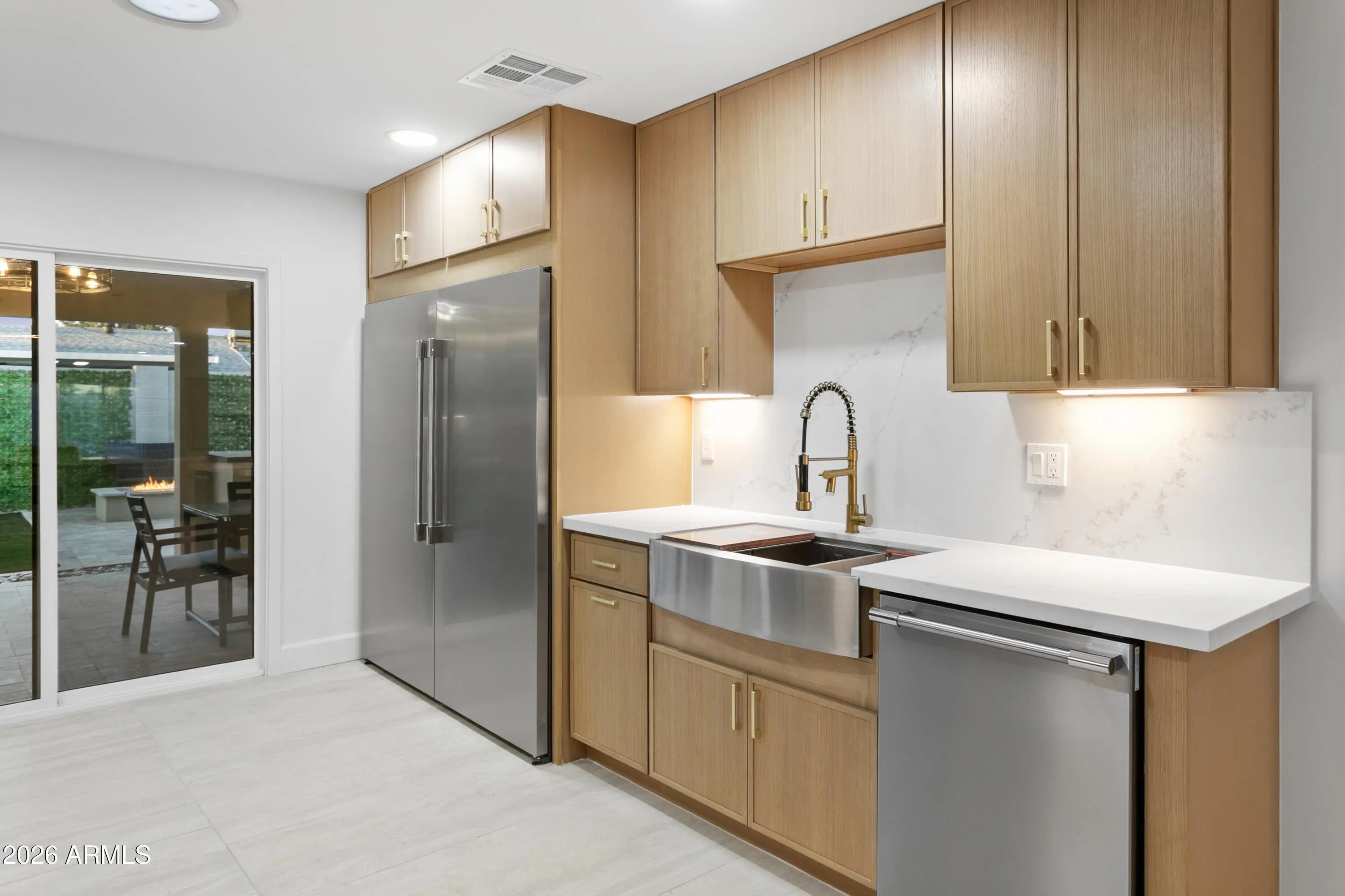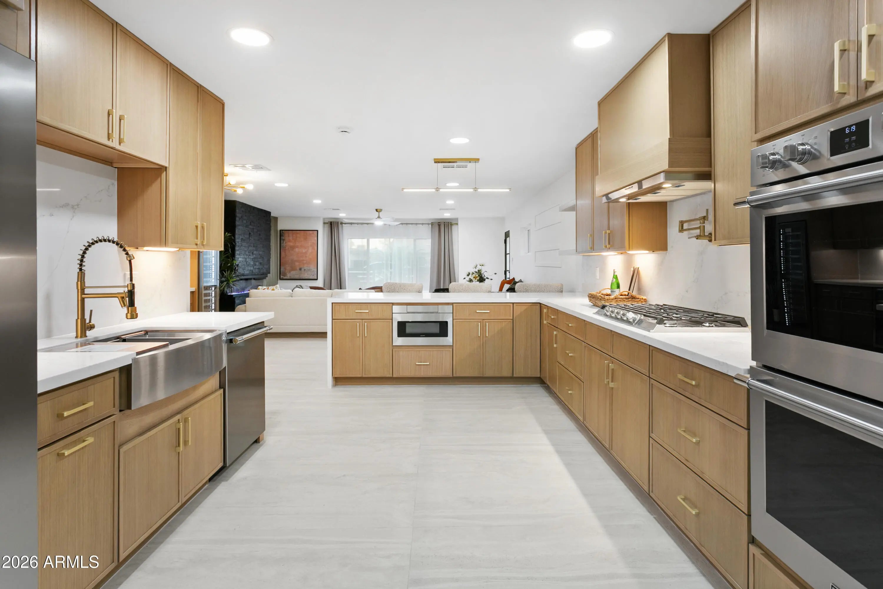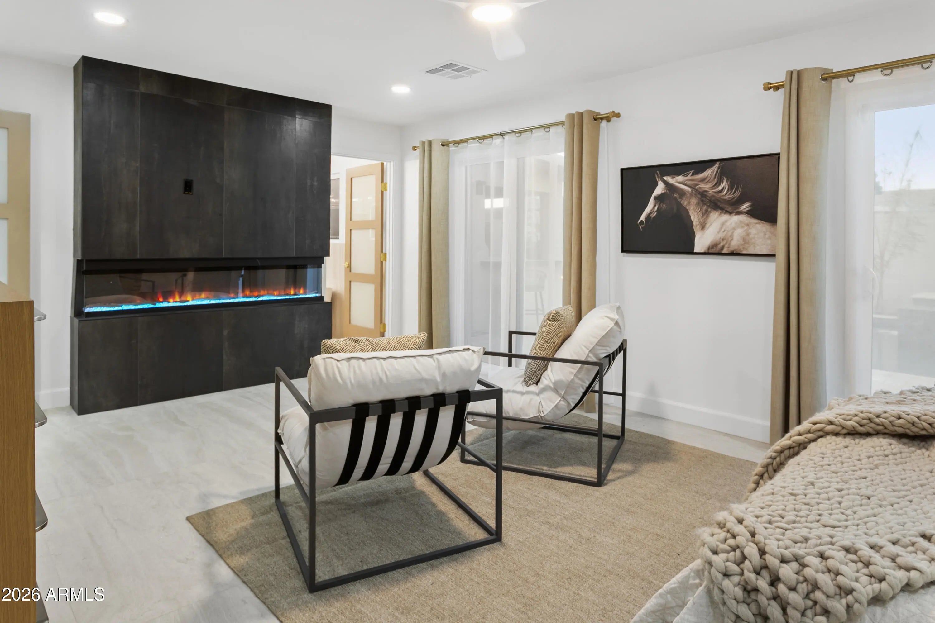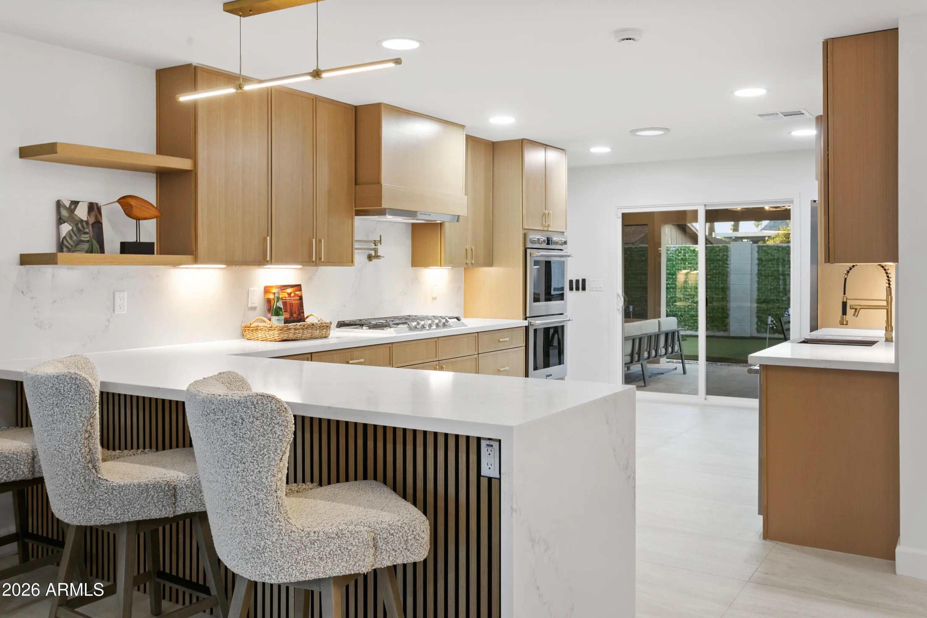 Reimagined, Replumbed, Rewired full scale designer Modern 2026 Remodel interior & exterior nothing left untouched. Designed for seamless flow throughout, this open spacious Great Room home has 3 bedrooms + office plus a 400sf indoor-outdoor feel Arizona Room including a TV-fireplace lounge area, dining or game area & built-in BBQ seated bar open to the resort backyard. Private & Quiet backyard has a heated pool & waterfall spa with multi color lights, in floor cleaning & lounge baja step, firepit and a putt-putt golf extended travertine patio backyard. Inside features a spacious Gourmet Frigidaire Kitchen including double ovens, drawer microwave, 36'' gas cooktop with built-in overhead vent, pot filler, apron sink, Quartz waterfall peninsula island and Quartz backsplash. Built-In Beverage center includes a full-size wine refrigerator and a counter height beverage cooler. Large Fireplace Great Room includes floor to ceiling ledgestone tile and acoustic wall paneling. Oversized Primary Suite also includes a Fireplace with floor to ceiling tile, walk-in closet, double sliders to pool/spa and a spacious sitting area. Step into the primary bath comprised of a dual rain shower & dual handheld faucet shower, a handheld faucet soaking tub, a multi color LED mirror, and a Bluetooth speaker remote heating with multi color exhaust fan. Two spacious secondary bedrooms share the guest bath containing rain & handheld shower faucets, a double vanity, a LED multi color mirror and a Bluetooth speaker heated exhaust fan. Off the kitchen is an office - pantry - laundry room. Luxury fans, dimmer switches, custom wall trim decor and custom tile throughout - no carpet. Epoxy garage includes a modern glass garage door with a side mount smart opener, a multi color wall design light fixture, a tankless water heater, a dedicated 220V for EV or workshop and extends to a new driveway finish & pavers. New landscape, irrigation and lighting. Top to bottom side to side inside and out everything has been updated and nothing left untouched. All new PEX plumbing & entire home rewire. Private & Quiet internal location not close to any high traffic streets - no two stories in the area with rear alley access. See MLS Documents for full detailed list of improvements and floorplan.