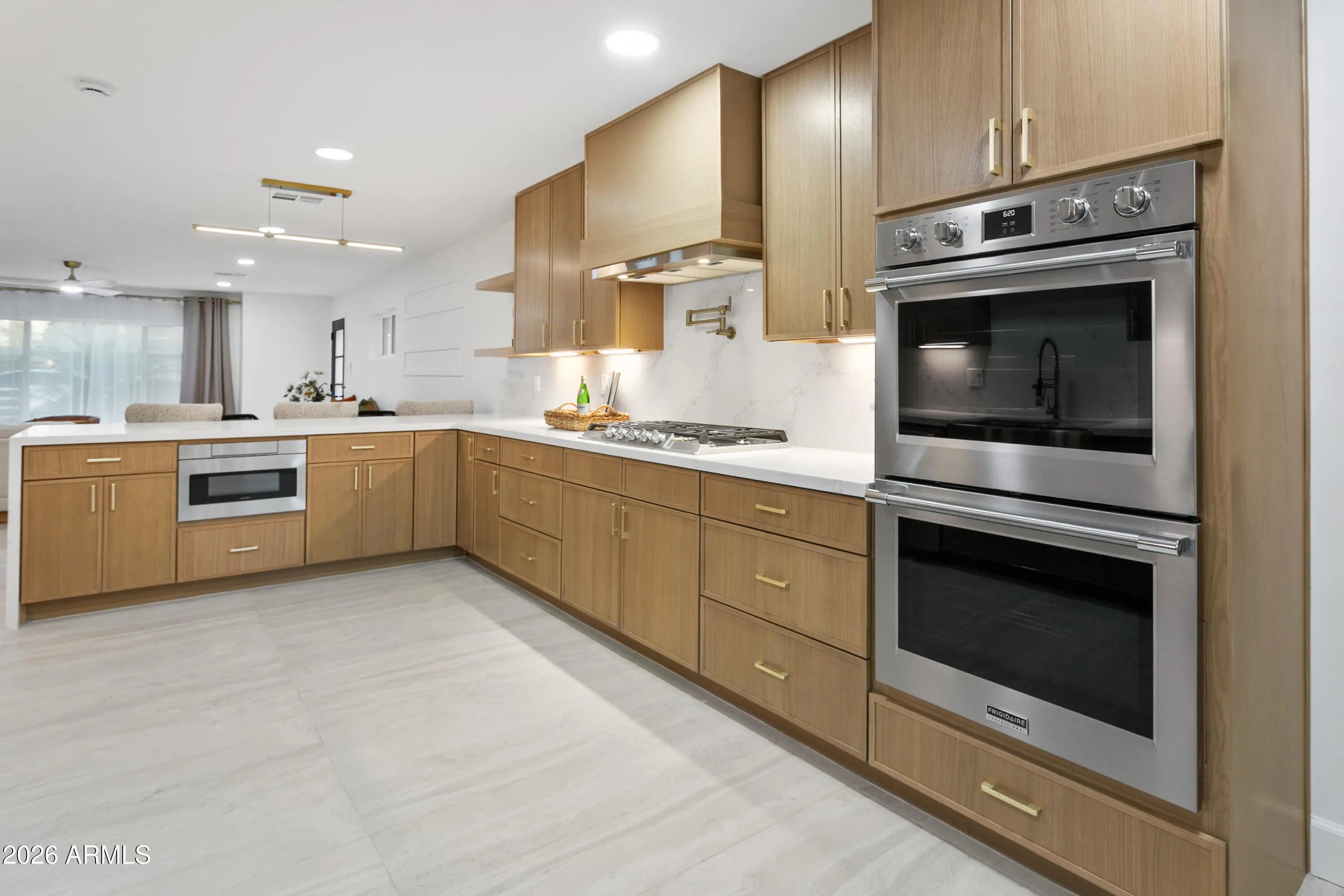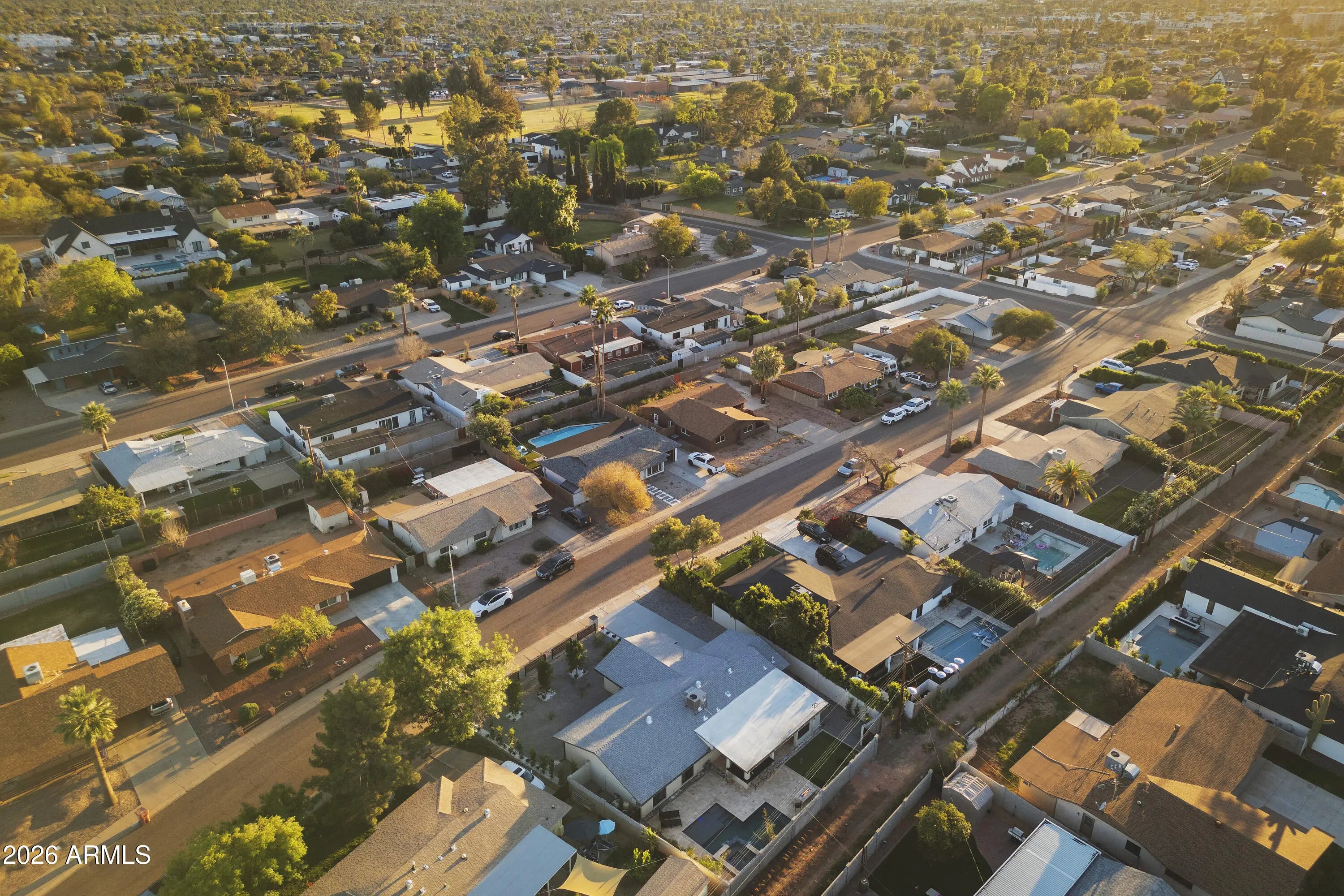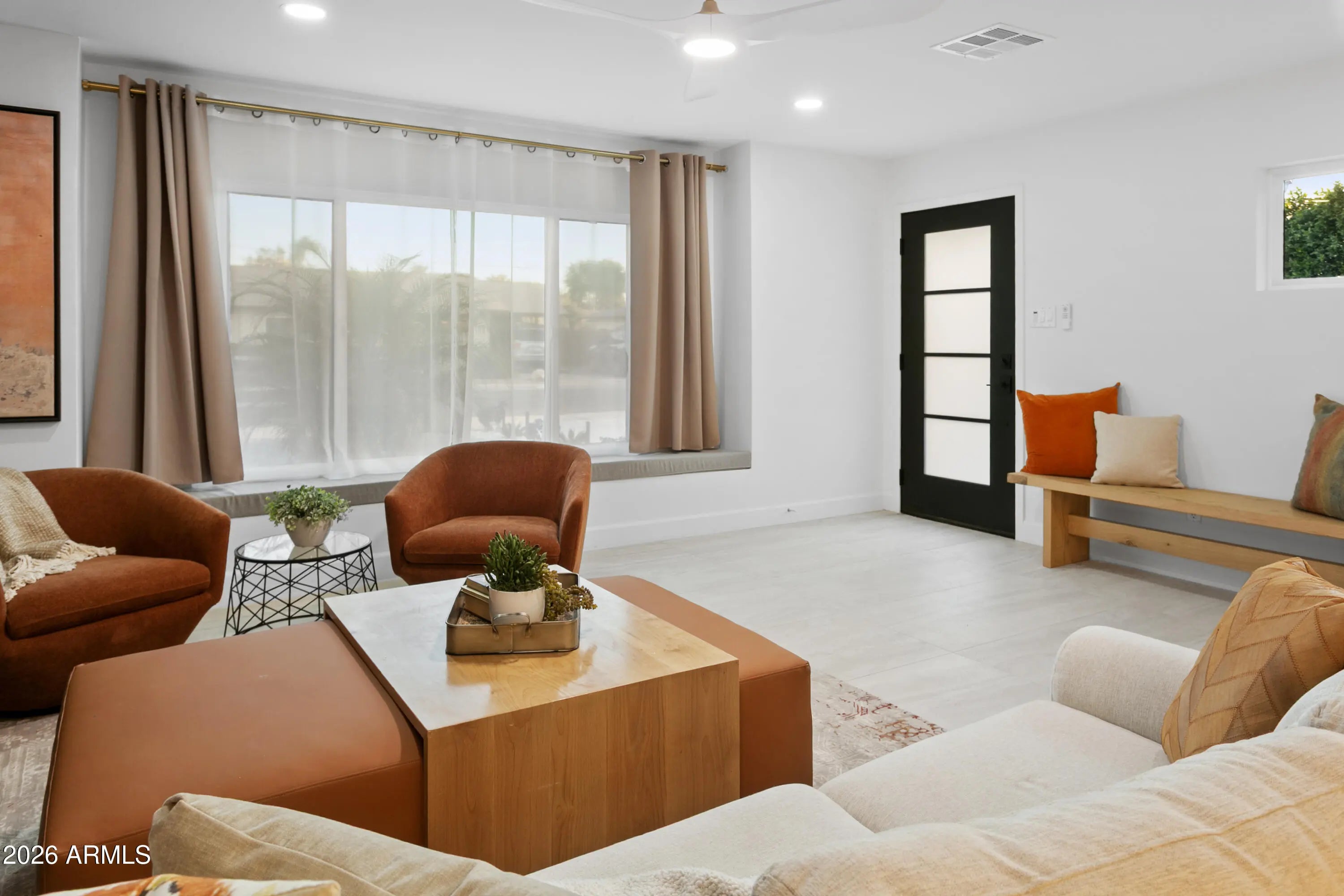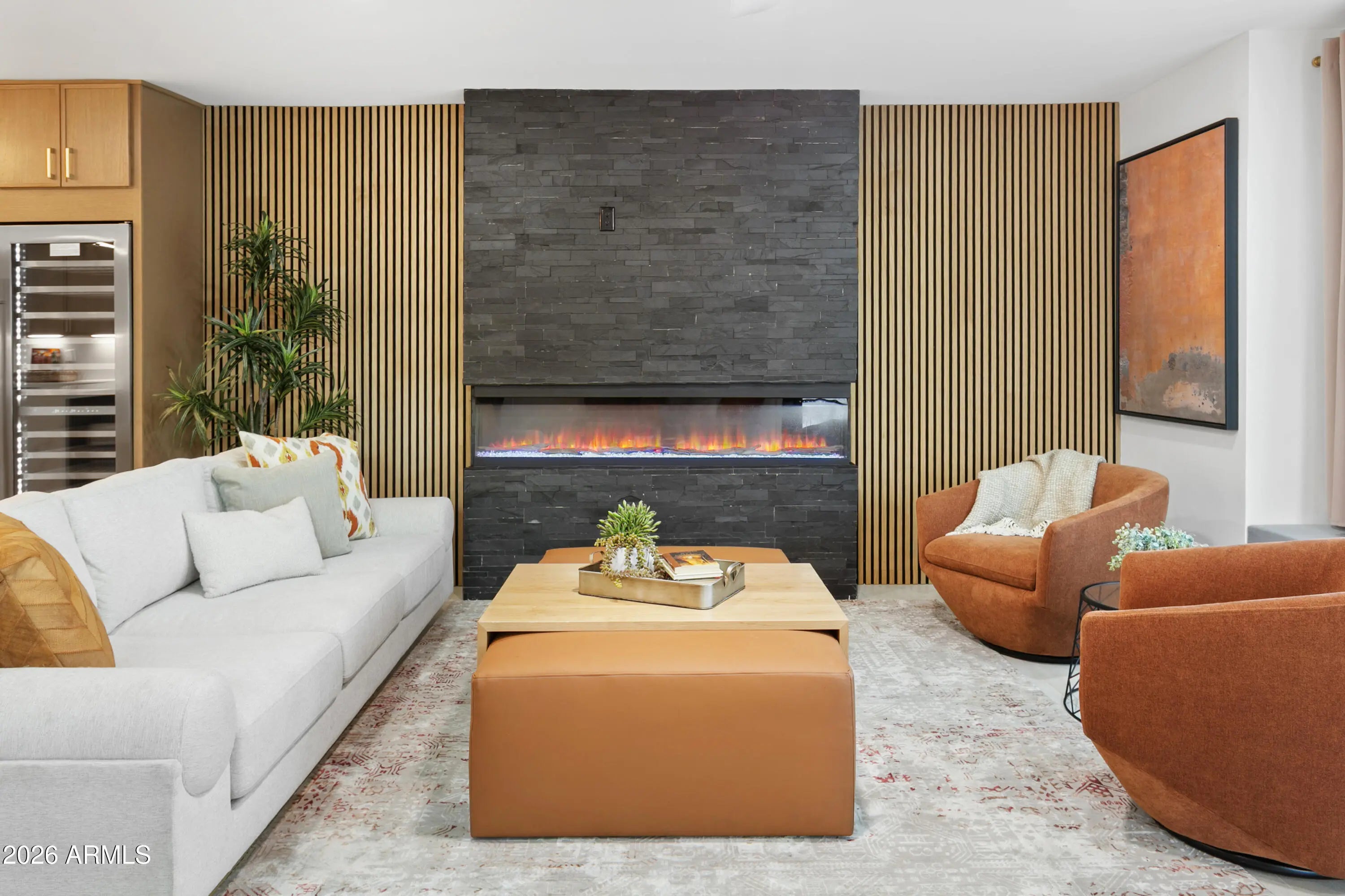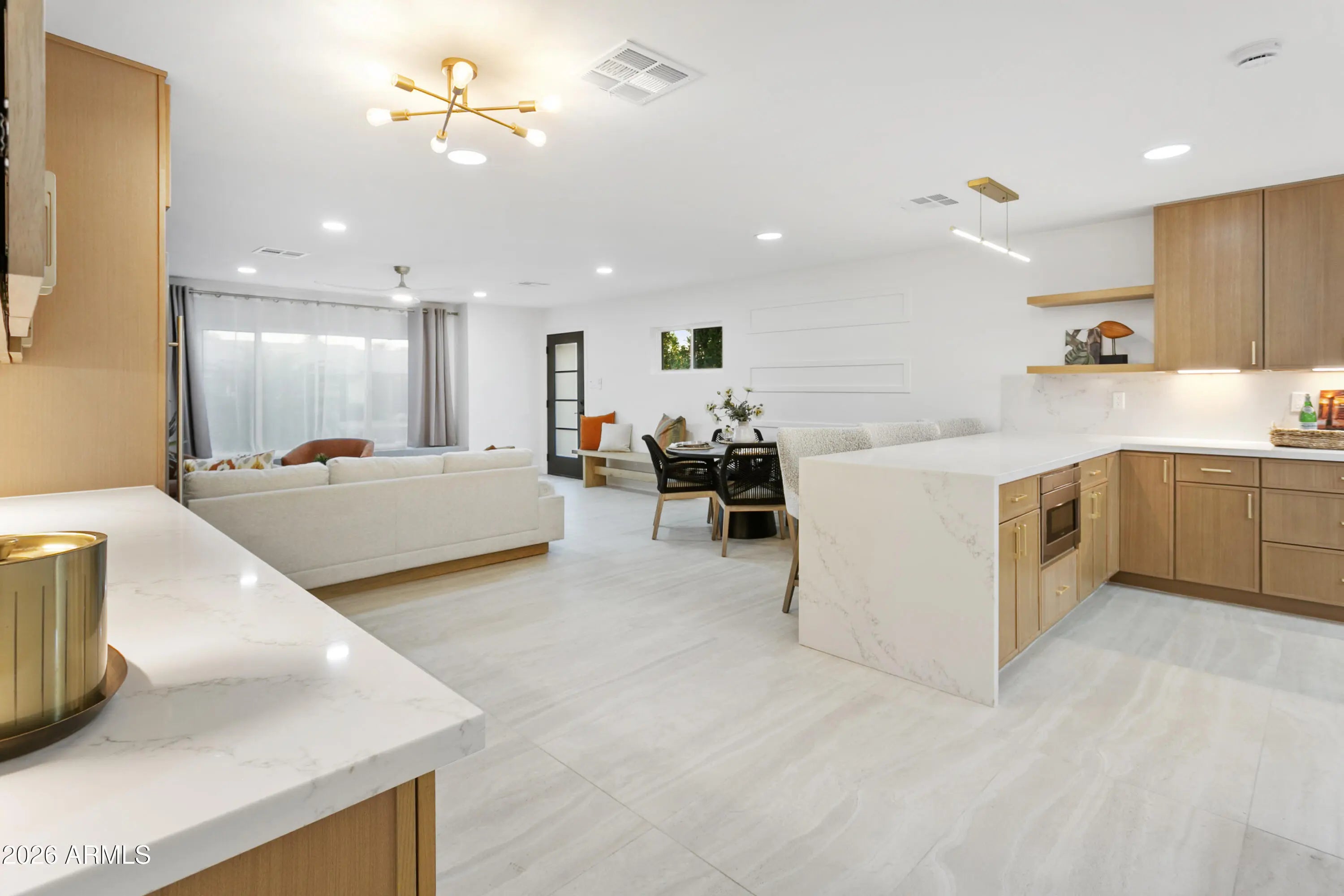 Reimagined, Replumbed, Rewired full scale designer Modern 2026 Remodel interior & exterior nothing left untouched. Designed for seamless flow throughout, this open spacious Great Room home has 3 bedrooms + office plus a 400sf indoor-outdoor feel Arizona Room including a TV-fireplace lounge area, dining or game area & built-in BBQ seated bar open to the resort backyard. Private & Quiet backyard has a heated pool & waterfall spa with multi color lights, in floor cleaning & lounge baja step, firepit and a putt-putt golf extended travertine patio backyard. Inside features a spacious Gourmet Frigidaire Kitchen including double ovens, drawer microwave, 36'' gas cooktop with built-in overhead vent, pot filler, apron sink, Quartz waterfall peninsula island and Quartz backsplash. Built-In Beverage center includes a full-size wine refrigerator and a counter height beverage cooler. Large Fireplace Great Room includes floor to ceiling ledgestone tile and acoustic wall paneling. Oversized Primary Suite also includes a Fireplace with floor to ceiling tile, walk-in closet, double sliders to pool/spa and a spacious sitting area. Step into the primary bath comprised of a dual rain shower & dual handheld faucet shower, a handheld faucet soaking tub, a multi color LED mirror, and a Bluetooth speaker remote heating with multi color exhaust fan. Two spacious secondary bedrooms share the guest bath containing rain & handheld shower faucets, a double vanity, a LED multi color mirror and a Bluetooth speaker heated exhaust fan. Off the kitchen is an office - pantry - laundry room. Luxury fans, dimmer switches, custom wall trim decor and custom tile throughout - no carpet. Epoxy garage includes a modern glass garage door with a side mount smart opener, a multi color wall design light fixture, a tankless water heater, a dedicated 220V for EV or workshop and extends to a new driveway finish & pavers. New landscape, irrigation and lighting. Top to bottom side to side inside and out everything has been updated and nothing left untouched. All new PEX plumbing & entire home rewire. Private & Quiet internal location not close to any high traffic streets - no two stories in the area with rear alley access. See MLS Documents for full detailed list of improvements and floorplan.