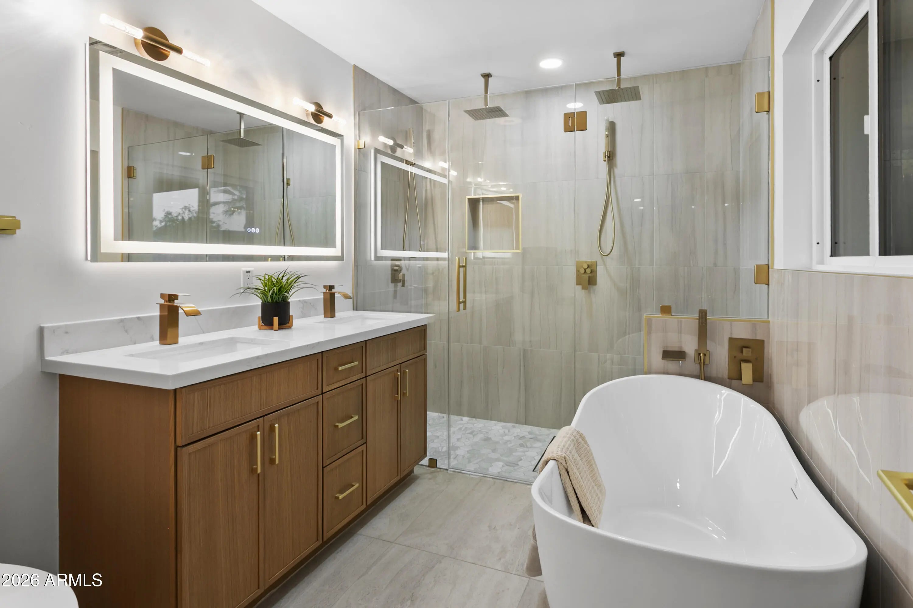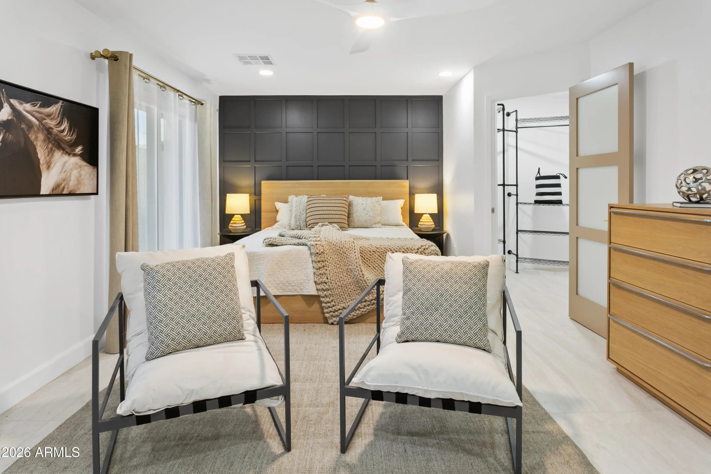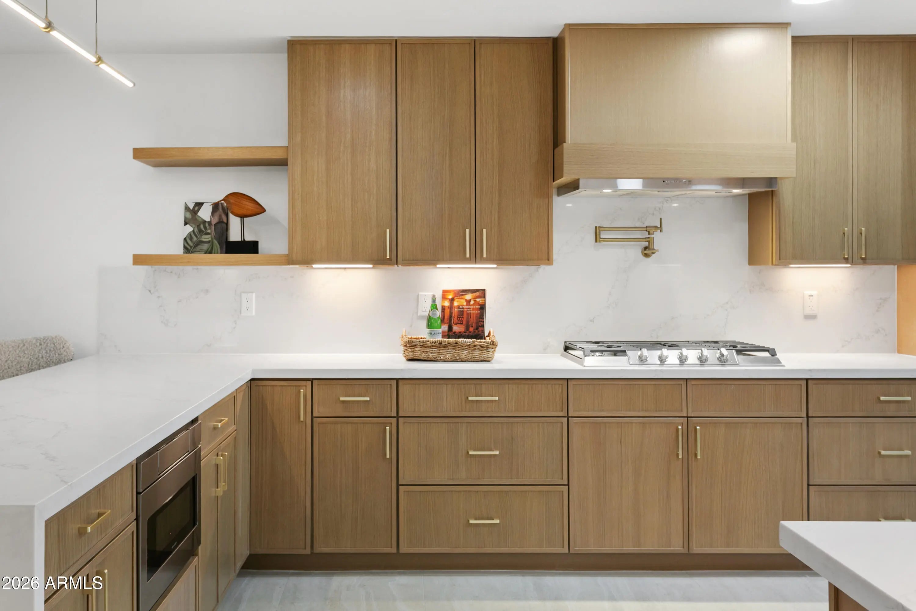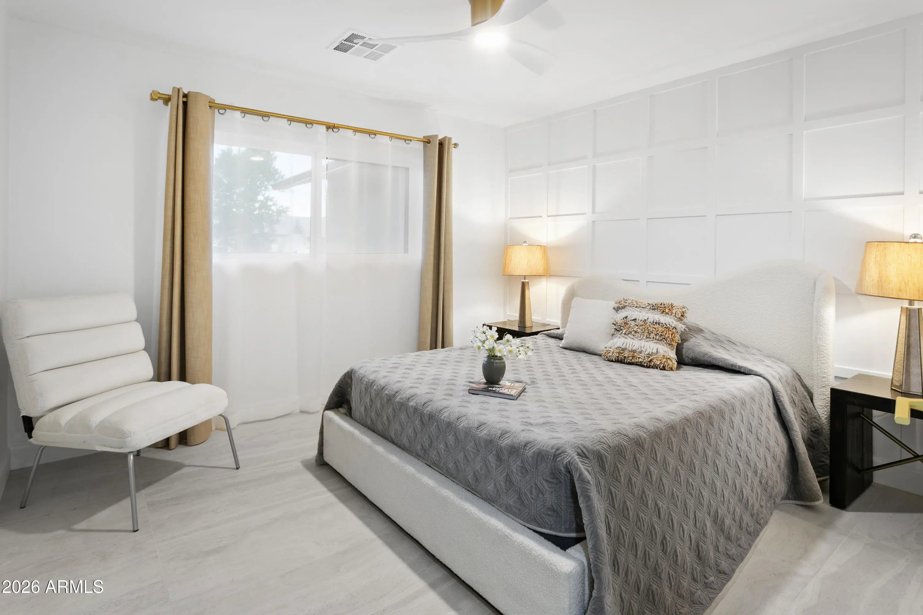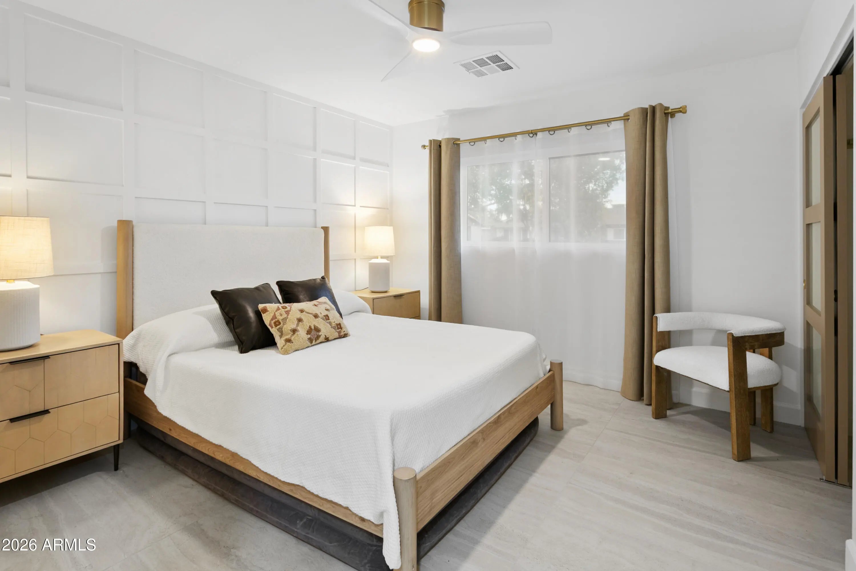 Reimagined, Replumbed, Rewired full scale designer Modern 2026 Remodel interior & exterior nothing left untouched. Designed for seamless flow throughout, this open spacious Great Room home has 3 bedrooms + office plus a 400sf indoor-outdoor feel Arizona Room including a TV-fireplace lounge area, dining or game area & built-in BBQ seated bar open to the resort backyard. Private & Quiet backyard has a heated pool & waterfall spa with multi color lights, in floor cleaning & lounge baja step, firepit and a putt-putt golf extended travertine patio backyard. Inside features a spacious Gourmet Frigidaire Kitchen including double ovens, drawer microwave, 36'' gas cooktop with built-in overhead vent, pot filler, apron sink, Quartz waterfall peninsula island and Quartz backsplash. Built-In Beverage center includes a full-size wine refrigerator and a counter height beverage cooler. Large Fireplace Great Room includes floor to ceiling ledgestone tile and acoustic wall paneling. Oversized Primary Suite also includes a Fireplace with floor to ceiling tile, walk-in closet, double sliders to pool/spa and a spacious sitting area. Step into the primary bath comprised of a dual rain shower & dual handheld faucet shower, a handheld faucet soaking tub, a multi color LED mirror, and a Bluetooth speaker remote heating with multi color exhaust fan. Two spacious secondary bedrooms share the guest bath containing rain & handheld shower faucets, a double vanity, a LED multi color mirror and a Bluetooth speaker heated exhaust fan. Off the kitchen is an office - pantry - laundry room. Luxury fans, dimmer switches, custom wall trim decor and custom tile throughout - no carpet. Epoxy garage includes a modern glass garage door with a side mount smart opener, a multi color wall design light fixture, a tankless water heater, a dedicated 220V for EV or workshop and extends to a new driveway finish & pavers. New landscape, irrigation and lighting. Top to bottom side to side inside and out everything has been updated and nothing left untouched. All new PEX plumbing & entire home rewire. Private & Quiet internal location not close to any high traffic streets - no two stories in the area with rear alley access. See MLS Documents for full detailed list of improvements and floorplan.