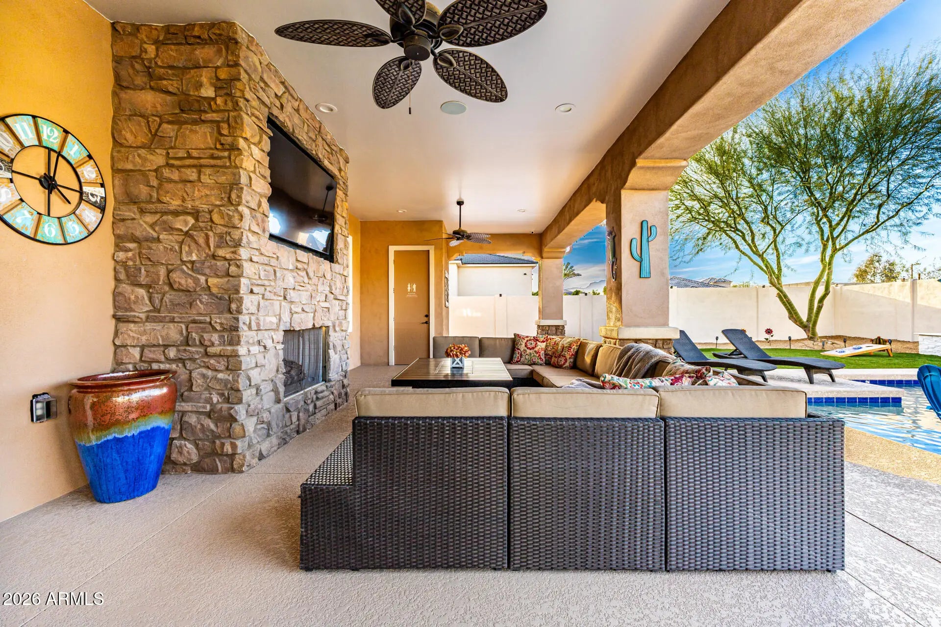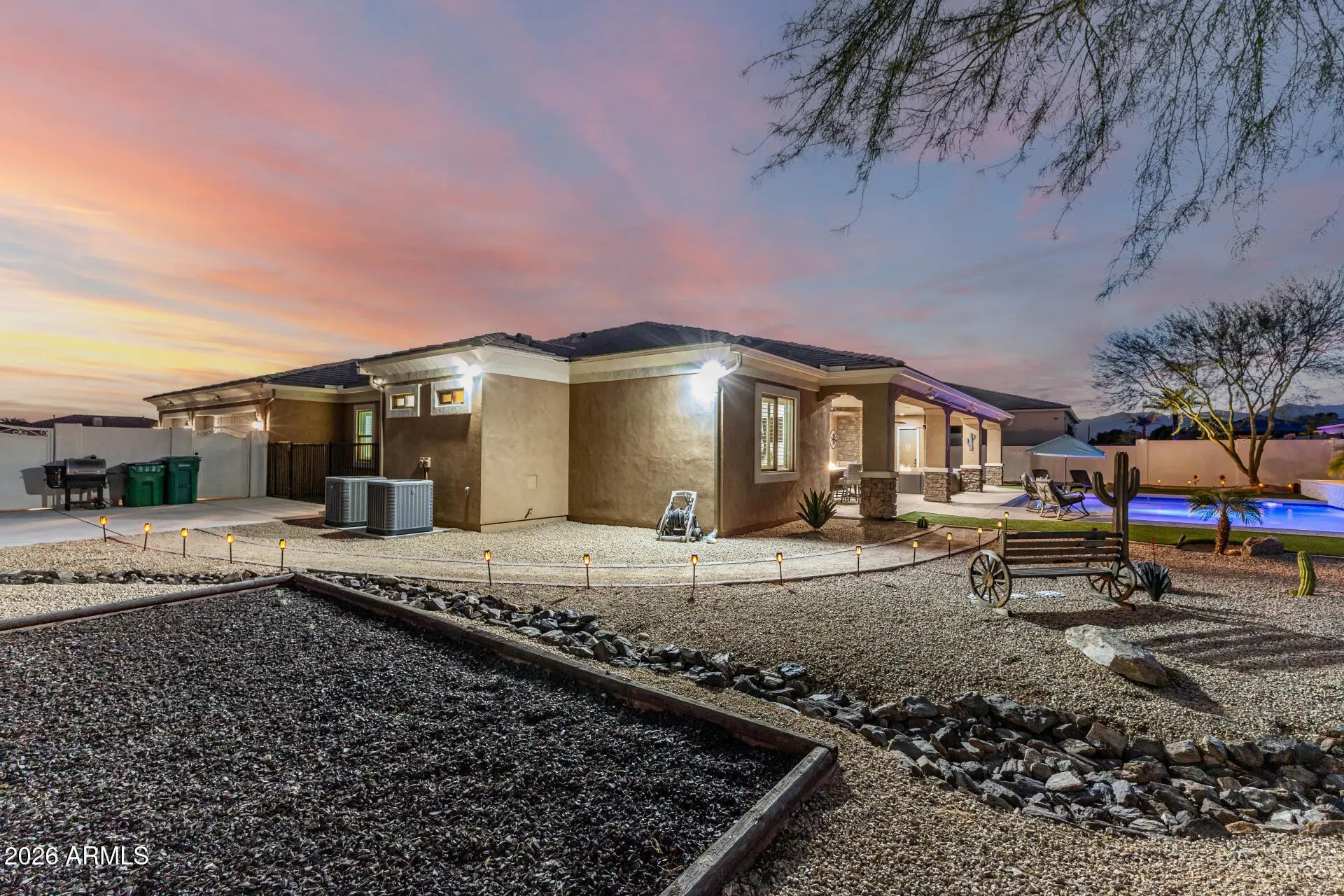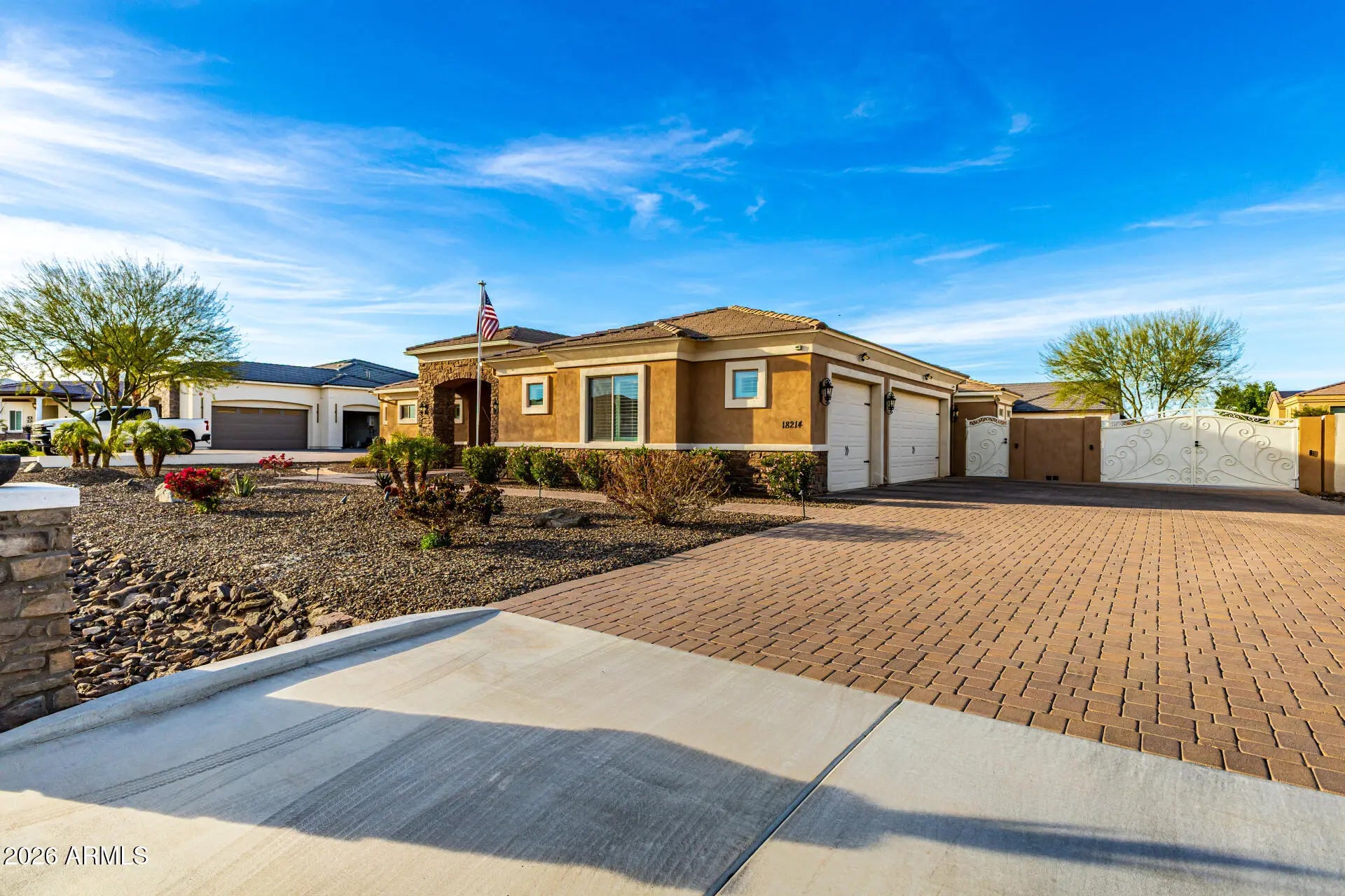 Welcome to LUXURY LIVING in this stunning home located within an exclusive gated community, designed for those who appreciate both comfort and exceptional entertaining*This beautifully appointed 4 bedroom home features a spacious open concept perfect for gatherings or every day living*At the heart of the home is a chef's kitchen w/custom cabinetry and a striking double island design, offering abundant prep space, seating and storage*Whether hosting friends or enjoying family dinners this kitchen is truly the centerpiece of the home*The expansive great room with corner bar (wine fridge, icemaker and sink)flows effortlessly to the outdoor living space, creating the ULTIMATE indoor-outdoor Arizona lifestyle. Step outside to your private resort style backyard featuring a sparkling 25000-gallon pool, outdoor kitchen and bath, all under an expansive 890 sq ft covered patio creating the perfect setting for entertaining year round* The thoughtful layout of the home includes 4 spacious bedrooms providing flexibility for guests, familiy or a dedicated office/fitness space. Generous living areas and high end finishes throughout complete the homes refined yet comfortable atmosphere. RV parking is allowed here to bring your rig! 14' gate on one side, pavered driveway and extended garage complete this home along with a 350 sq ft entry and glass iron door! This home is a STUNNER!