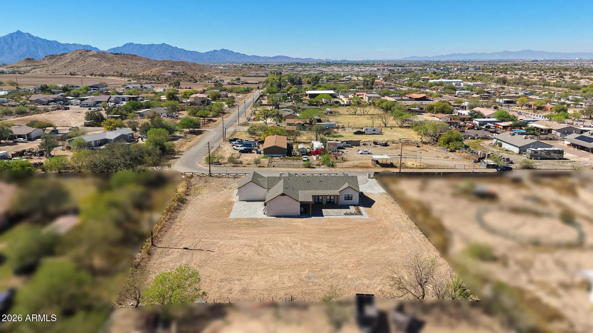 2024 custom 4 bed, 2.5 bath home on nearly 1 acre in Laveen with a rare off-grid feel, shared well, SRP flood irrigation, septic, propane, & no HOA. Slightly elevated lot enjoys mountain & valley views. Inside, soaring 10+ ft ceilings, open floor plan, fresh interior paint, vinyl flooring throughout, flush-mounted Sonance/Sonos speakers, & designer finishes throughout. The kitchen features upgraded custom cabinetry, quartz countertops, Wolf range, & a huge island w/ breakfast bar seating. Spa-like primary bath features a freestanding soaking tub & glass-enclosed walk-in shower with floor-to-ceiling tile. 3-car garage offers epoxy flake floors, extensive built-in cabinetry, & an extra-long multi-station workbench with drawers. Custom front/back paver design & plenty of room for horses. Since the prior sale, the home has been significantly upgraded with new quartz kitchen countertops, new kitchen cabinets, new bathroom shower fixtures, epoxy garage flooring, added garage cabinetry, a new water softener, a new Wolf stove, flush-mounted living room speakers, and new landscaping with custom paver design work. Additional improvements include exterior cameras, water filtration, a custom barn door at the primary bath, attic storage in the garage, and an extra-long multi-station workbench with drawers that creates exceptional storage and workspace. The nearly 1-acre horse property offers room for horses, toys, trailers, a pool, trampoline, and future additions such as a detached shop, horse barn, or stables. The slightly elevated setting enhances the sense of space and showcases beautiful valley and mountain views. The chef's kitchen is anchored by a huge island with breakfast bar seating and a Wolf stove. Seller states approximate costs are about $25/month for water, about $200/year for propane, and about $150/year for flood irrigation.