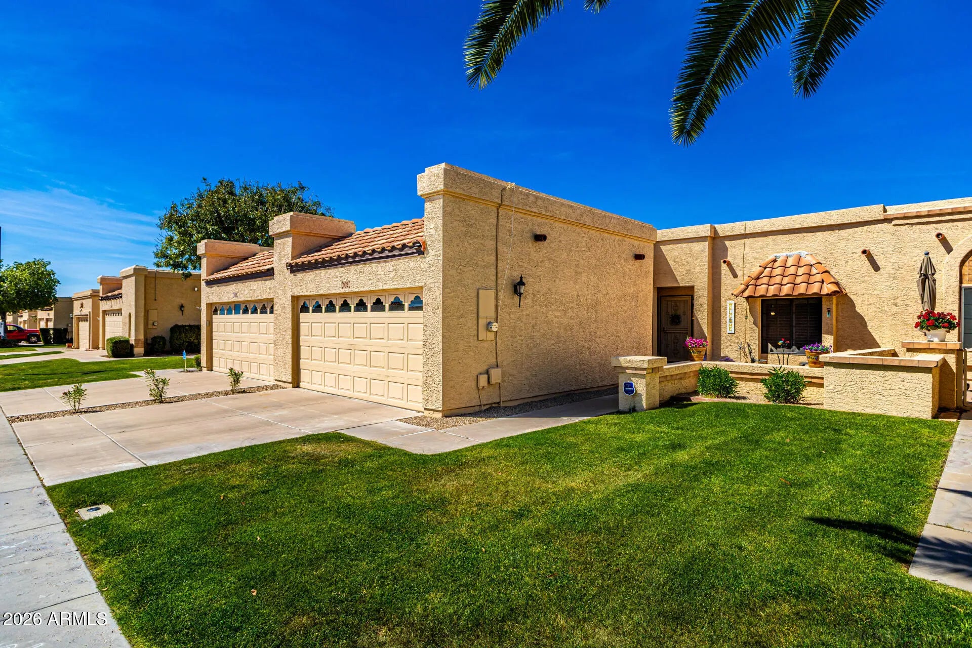 Welcome Home!! Everything is 2 years NEW in this fully remodeled 2 Bedroom, 2 bath,2 Car Garage Townhome. Stainless appliances, wide open floorplan with vaulted beamed ceiling with lots of natural light. The primary suite includes double doors to the patio. Covered patio and artificial turf easy maintenance back yard with view of community pool! Go out back gate to pool in just a few minutes! The garage has a ton of storage. ! Golf, shopping, excellent restaurants are right around the corner! Don't miss this barely lived in home! Professional photos coming Wed, March 18.