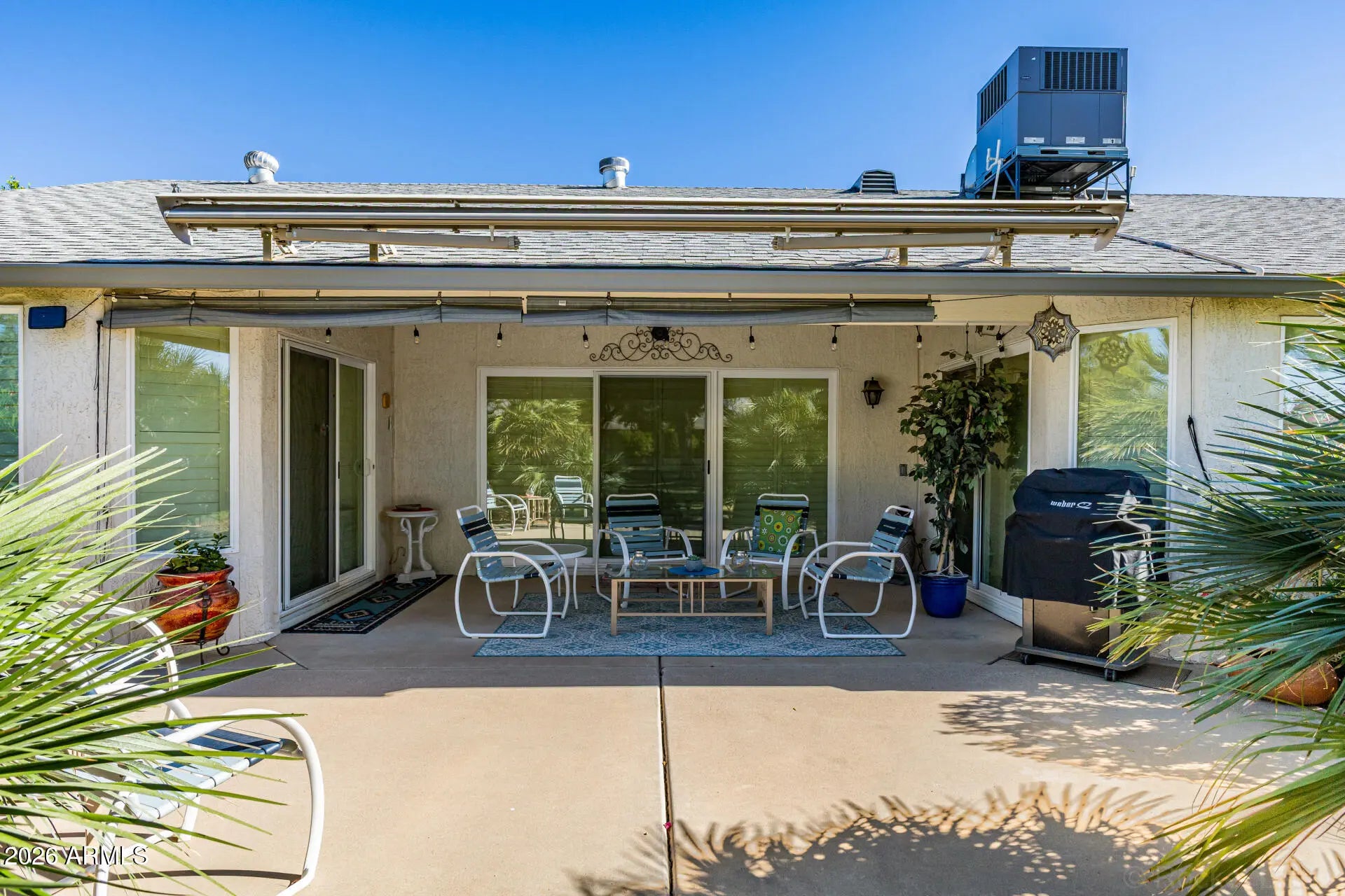 Large 1,866sf Gemini in Sun City West w/plantation shutters, updated lighting, 2023 HVAC & expansive patio w/retractable awning. Spacious 2BR + 1.75BA home w/2-car garage offering one of the larger Gemini floorplans in the community. Light & open layout w/kitchen flowing smoothly into the family room- ideal for entertaining. Kitchen features pull-out shelving, breakfast area & bar seating. Recent updates include recessed LED kitchen lighting, high-end ceiling fans throughout the home & patio, upgraded fireplace shelving/finishes & additional plantation shutters. Enjoy a large covered patio + open patio w/electric retractable awning that automatically adjusts to windy conditions. Welcoming front courtyard patio perfect for enjoying mornings. Primary bath features dual sinks & vanity area. The thoughtful layout offers generous room sizes and flexible living spaces, making the home comfortable for both everyday living and entertaining. The main living areas provide multiple gathering spaces that can easily accommodate guests, hobbies, or quiet relaxation. The kitchen is designed for practicality with convenient pull-out shelving and space for both casual meals and bar seating. Its location allows it to serve as the central hub of the home while maintaining easy connection to the surrounding living areas. The primary suite provides a comfortable retreat with dual sinks and a dedicated vanity area for added convenience. The secondary bedroom offers flexibility for visiting guests, a home office, or hobby space. Outdoor living is a standout feature of this property. The spacious rear patio offers multiple seating options, while the electric retractable awning allows homeowners to adjust shade and sun exposure throughout the day. A separate front courtyard patio creates another inviting space to enjoy the neighborhood setting. Residents of Sun City West enjoy access to golf courses, recreation centers, clubs, and a wide variety of community amenities that support an active and social lifestyle.